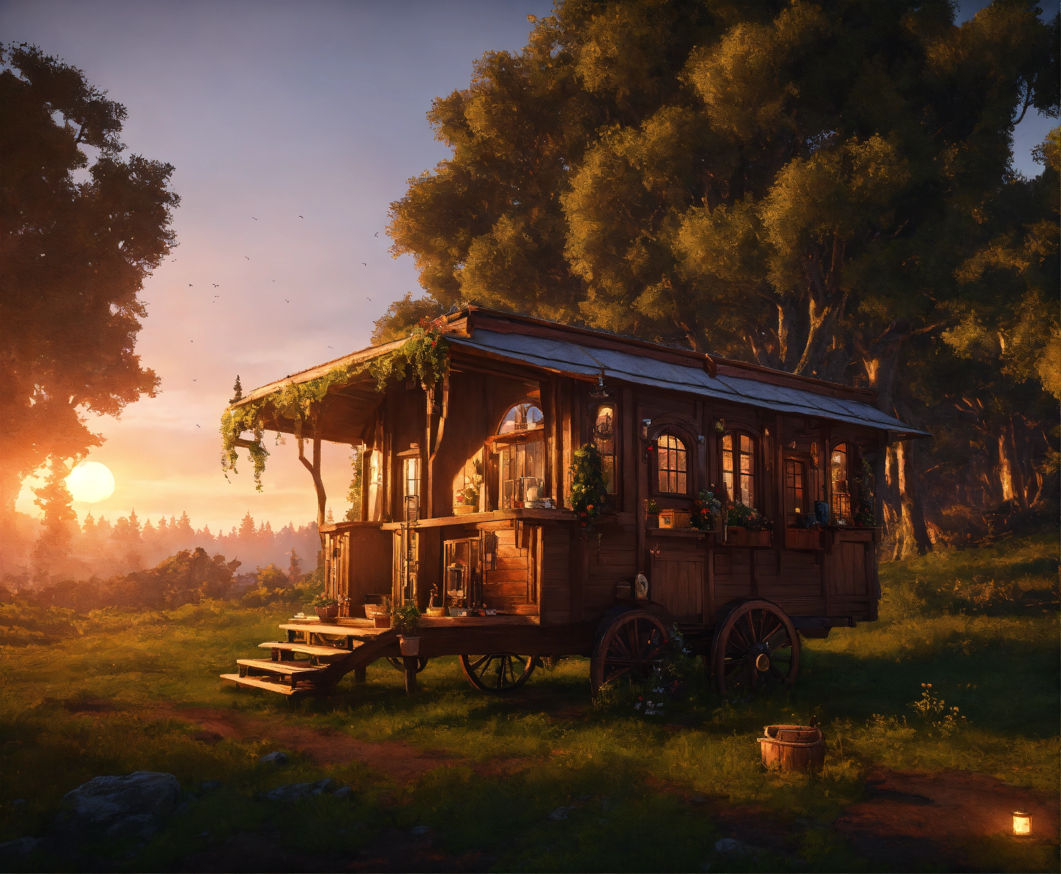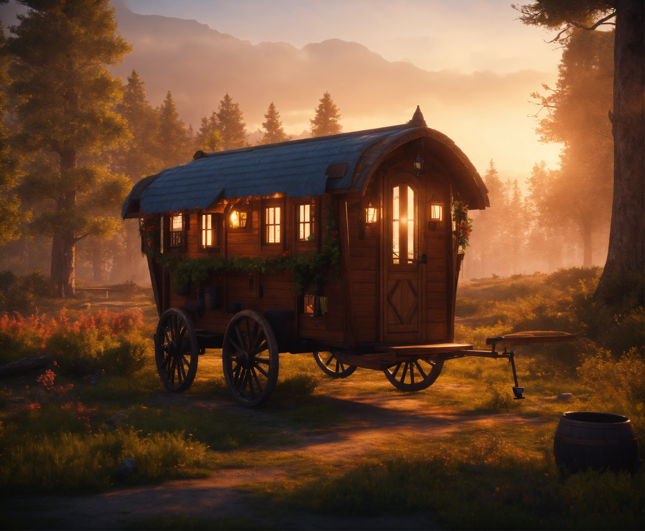 A fantasy horse-drawn traveller’s mobile home. full height picture with an old forest at sunset in the background. unreal engine render, 8k.