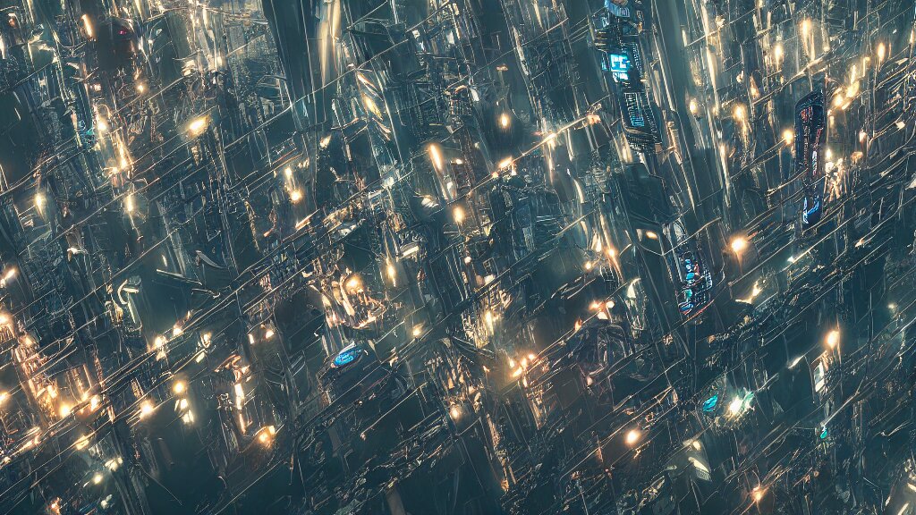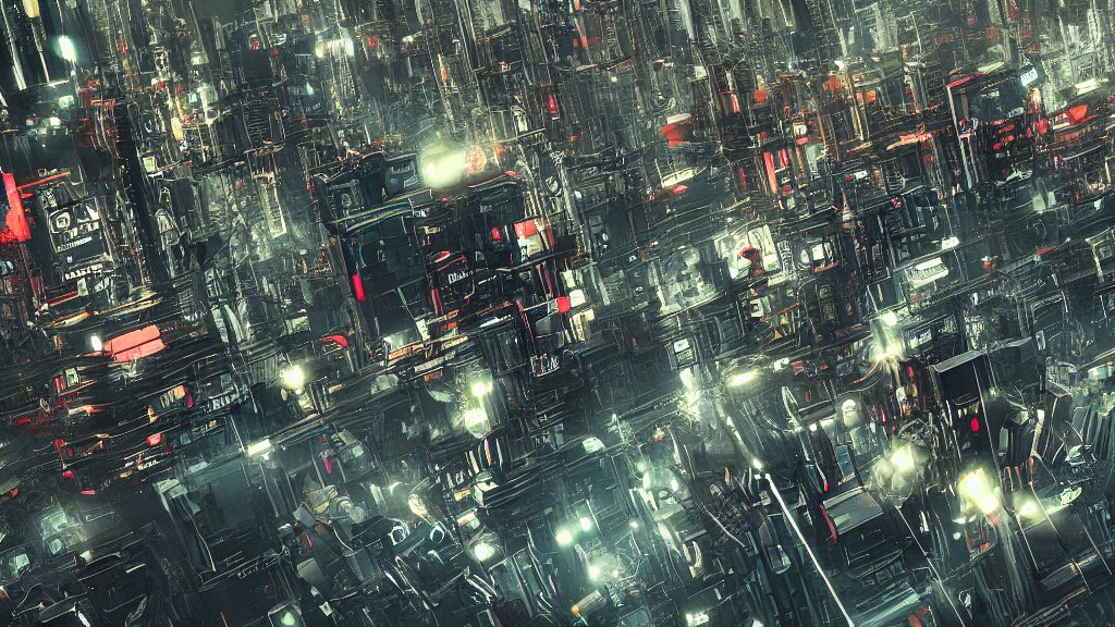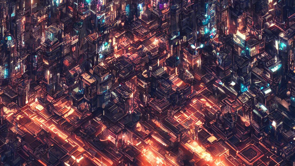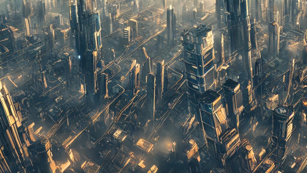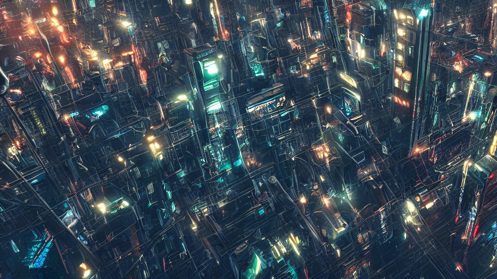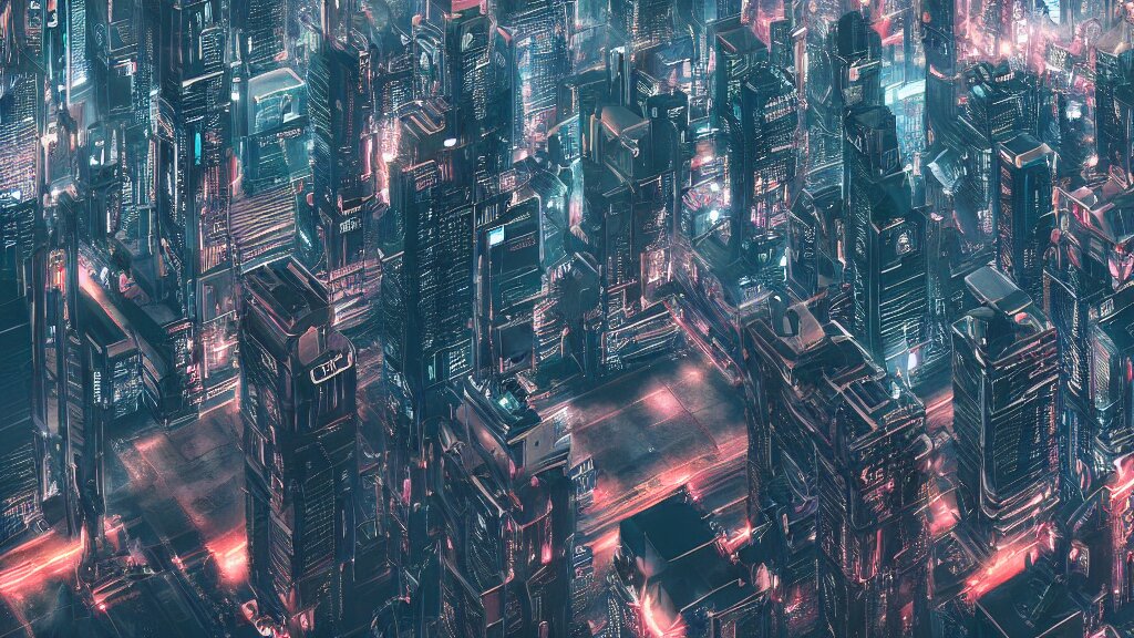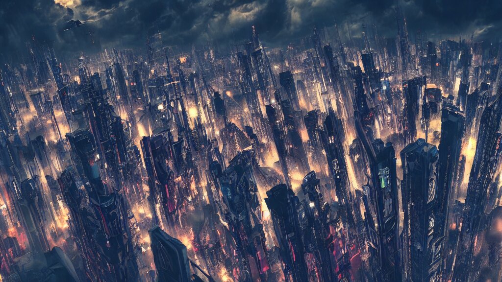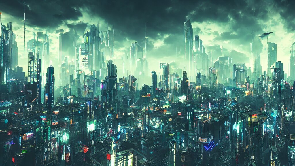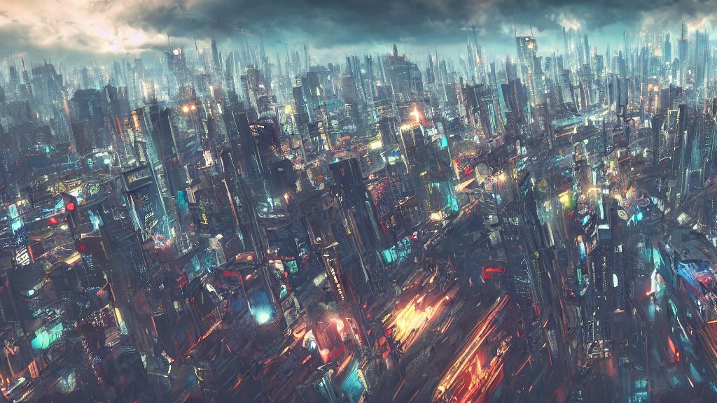 Cyberpunk style city from future, bird view, professional photo, ominous sky, ultra detailed, wallpaper, raytracing