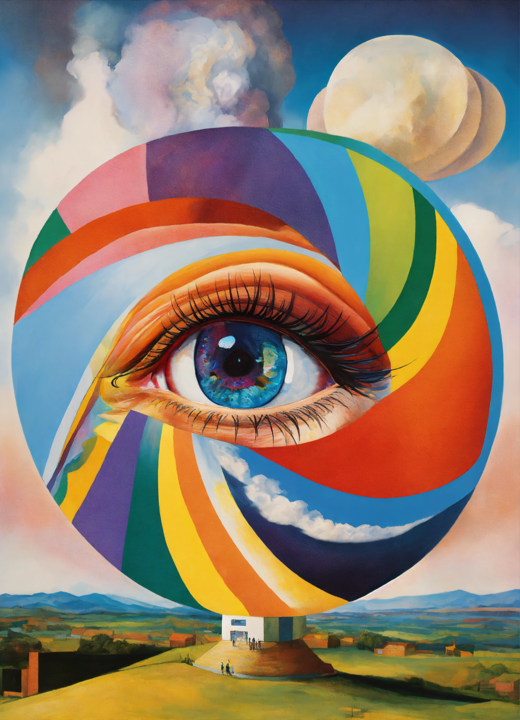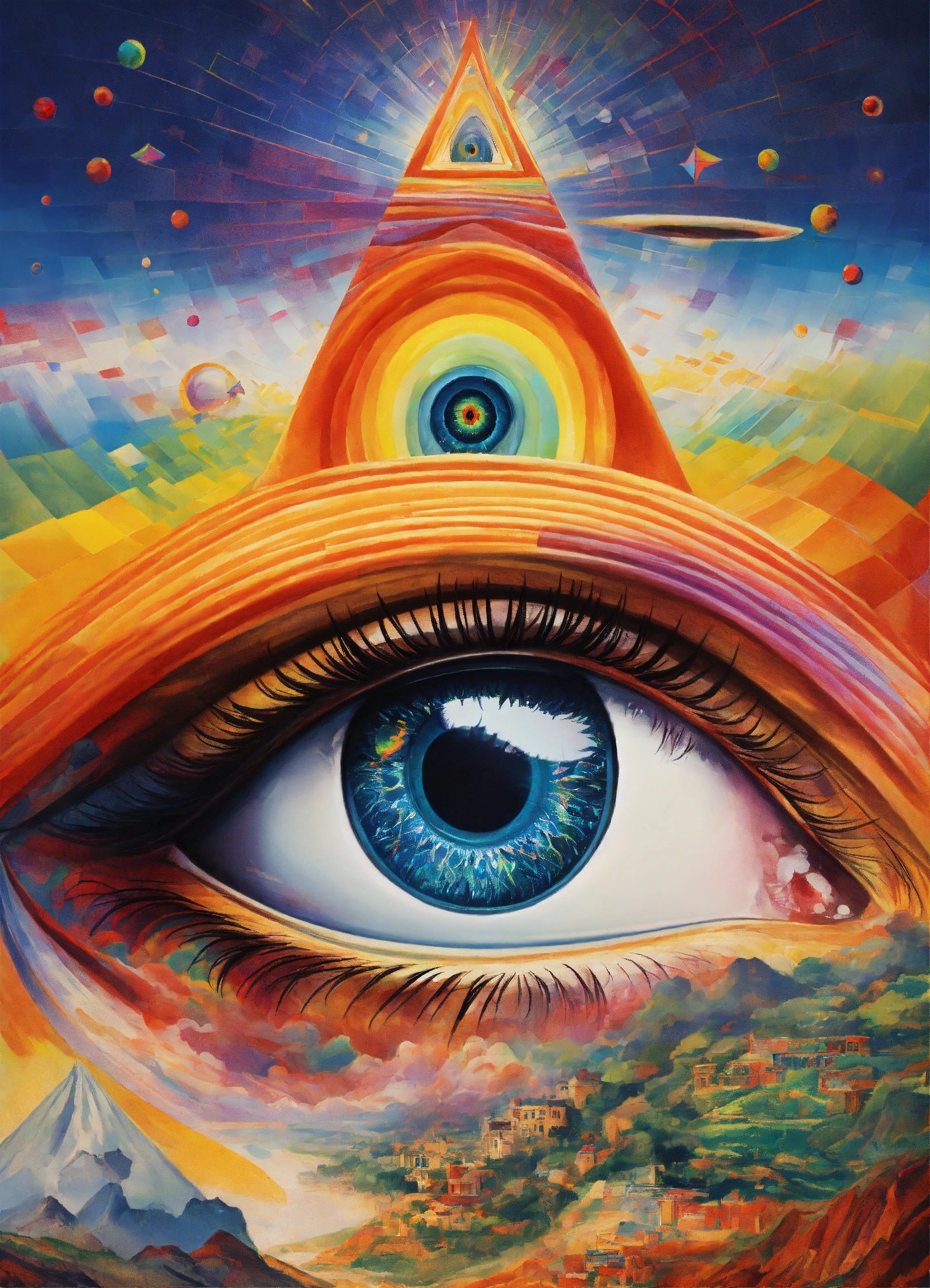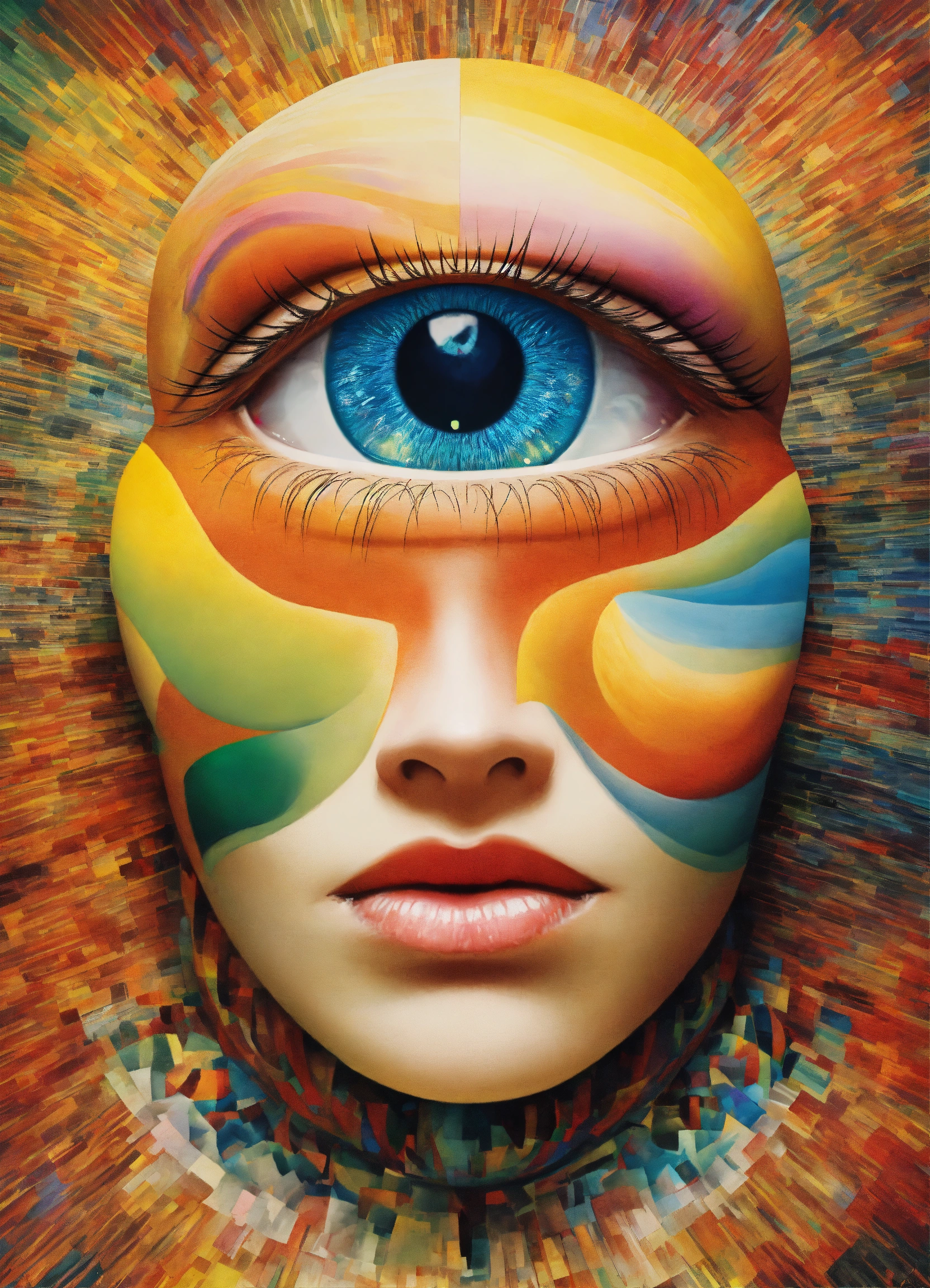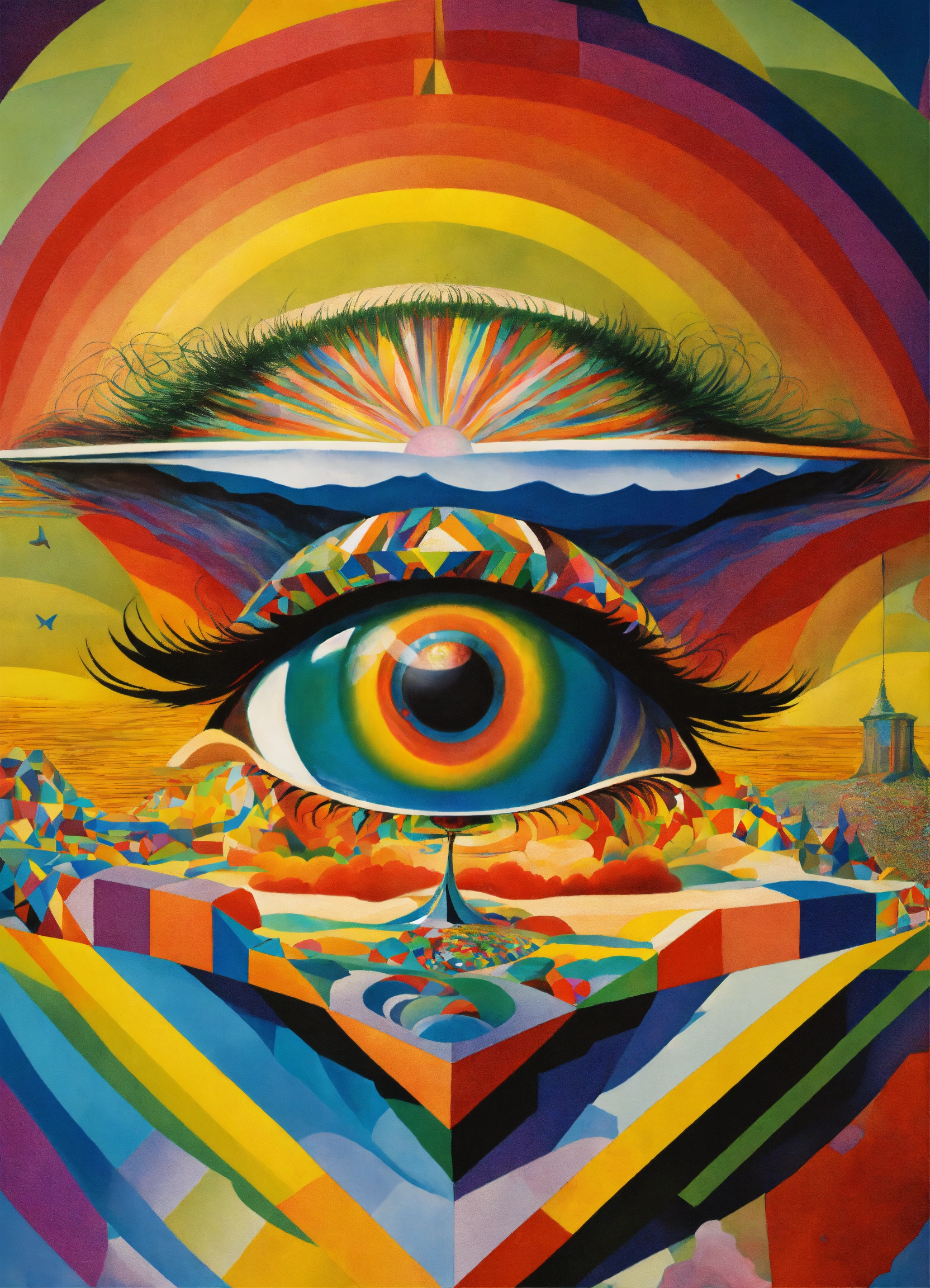 Massive eye emerging from top of human head containing abstract psychedelic dream dimension visuals, rainbow, the four corners of the universe by picasso