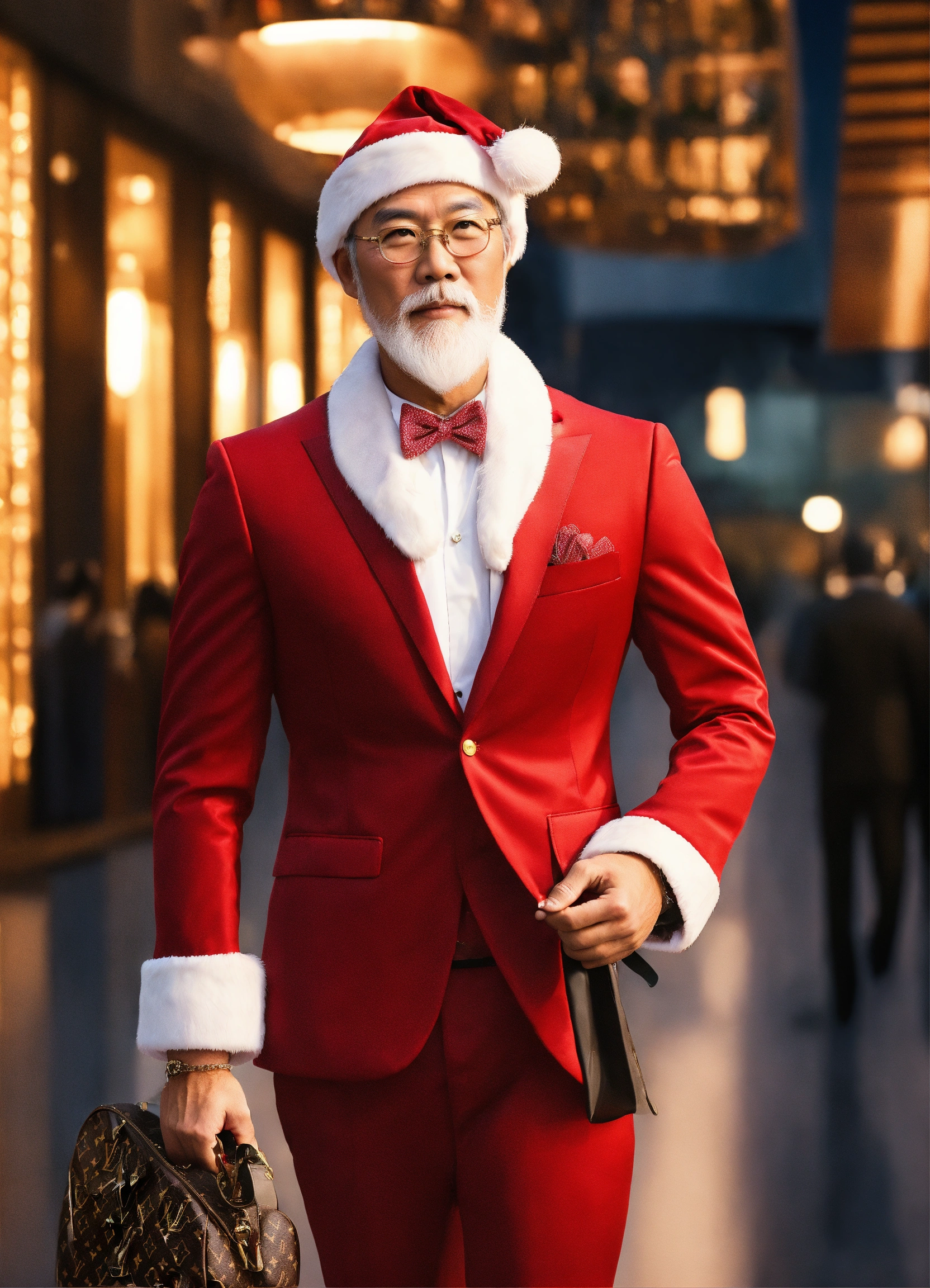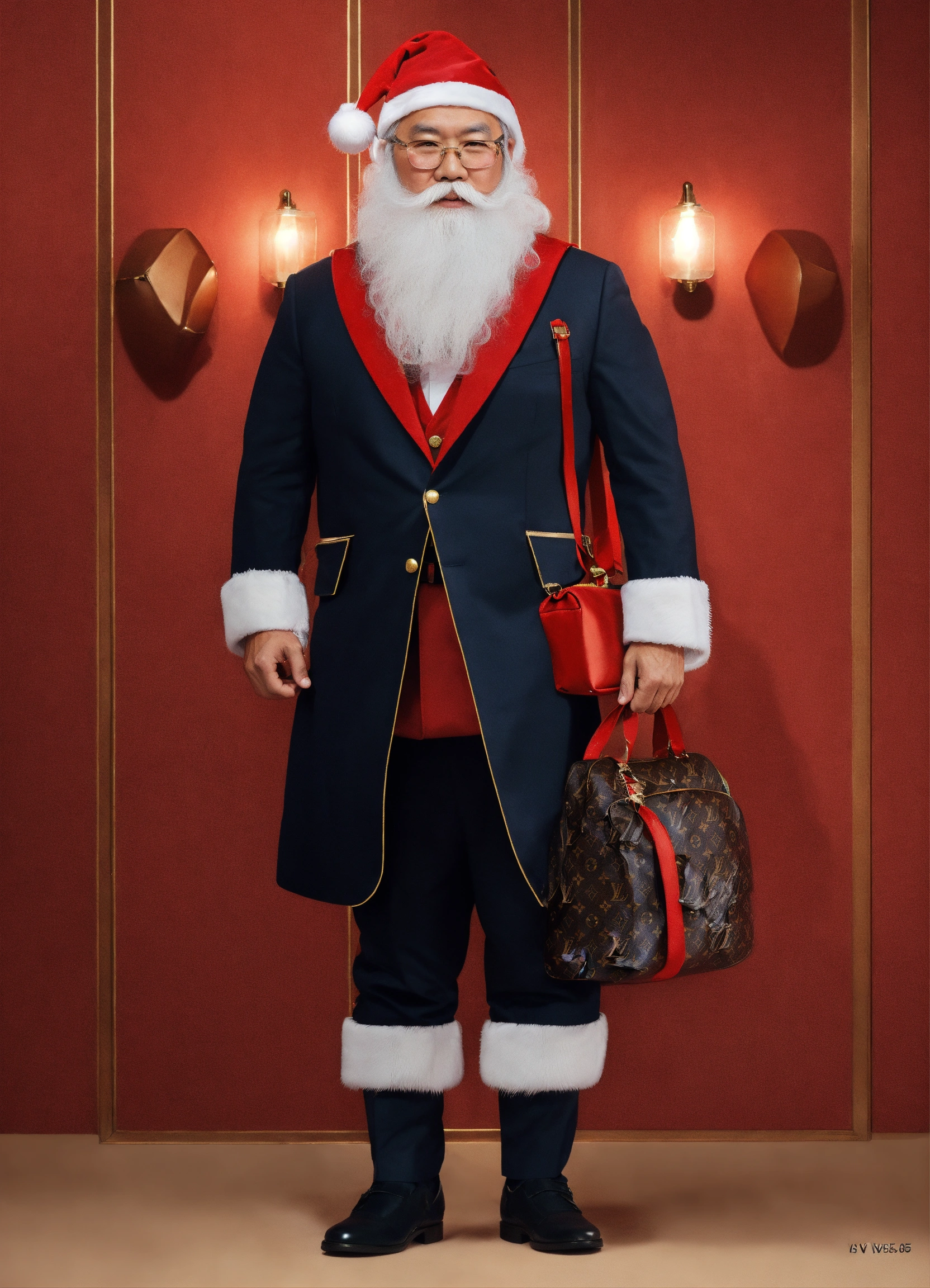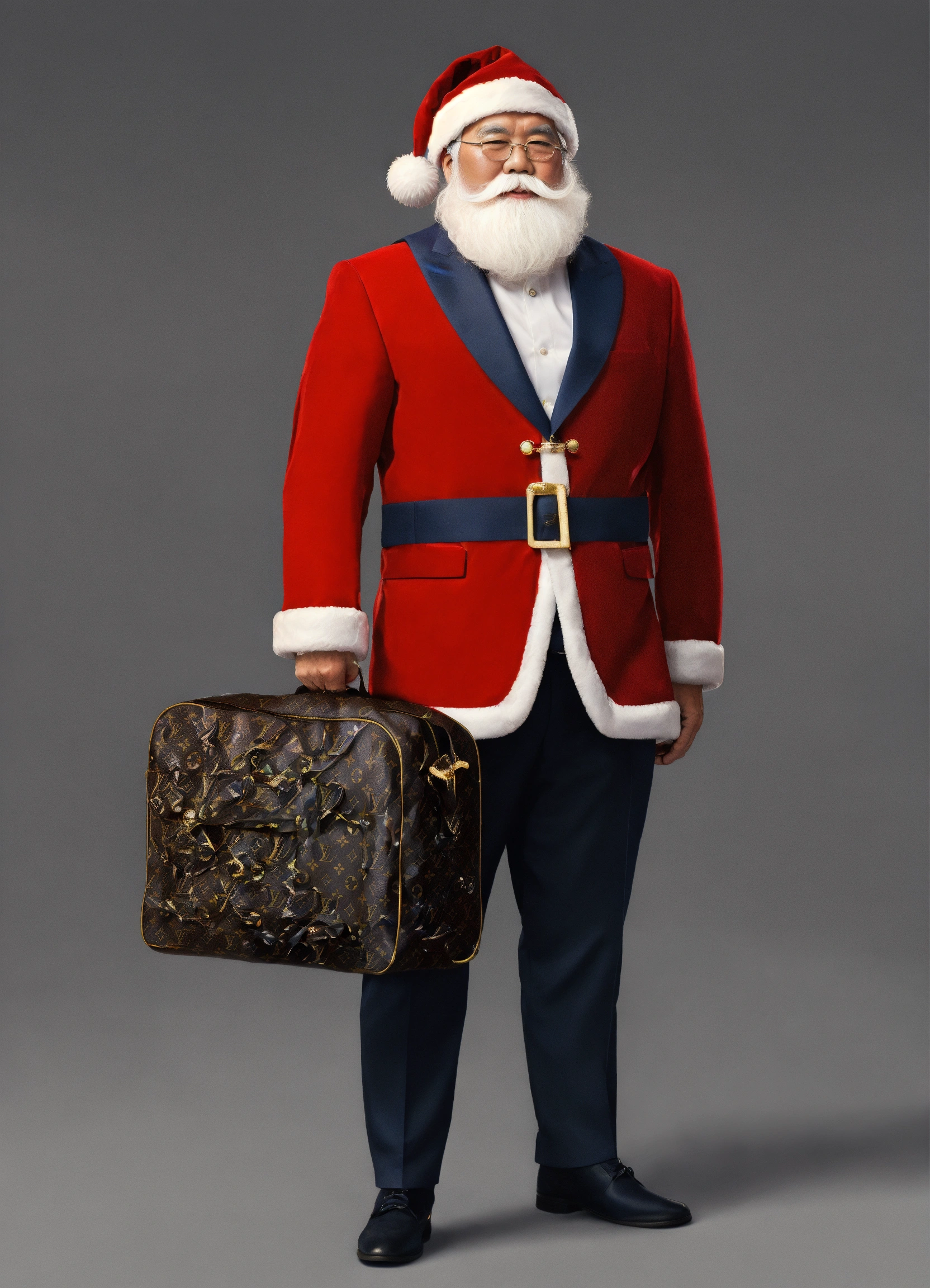 A extremely handsome modern asian santa claus, wearing a backpack and formal suit, inspired by louis vuitton. --v 5.0