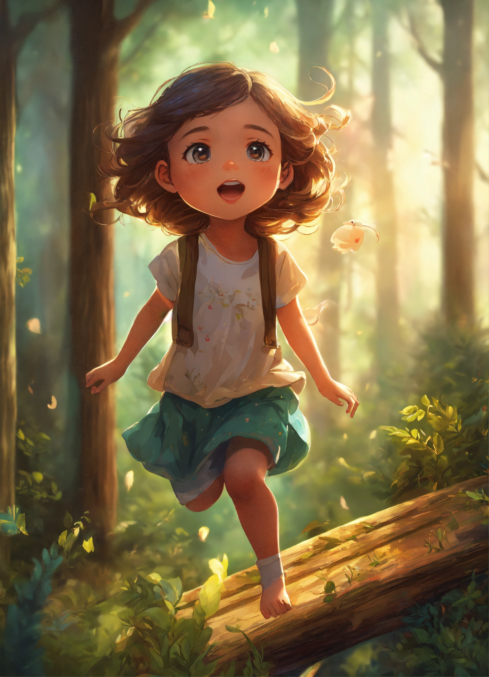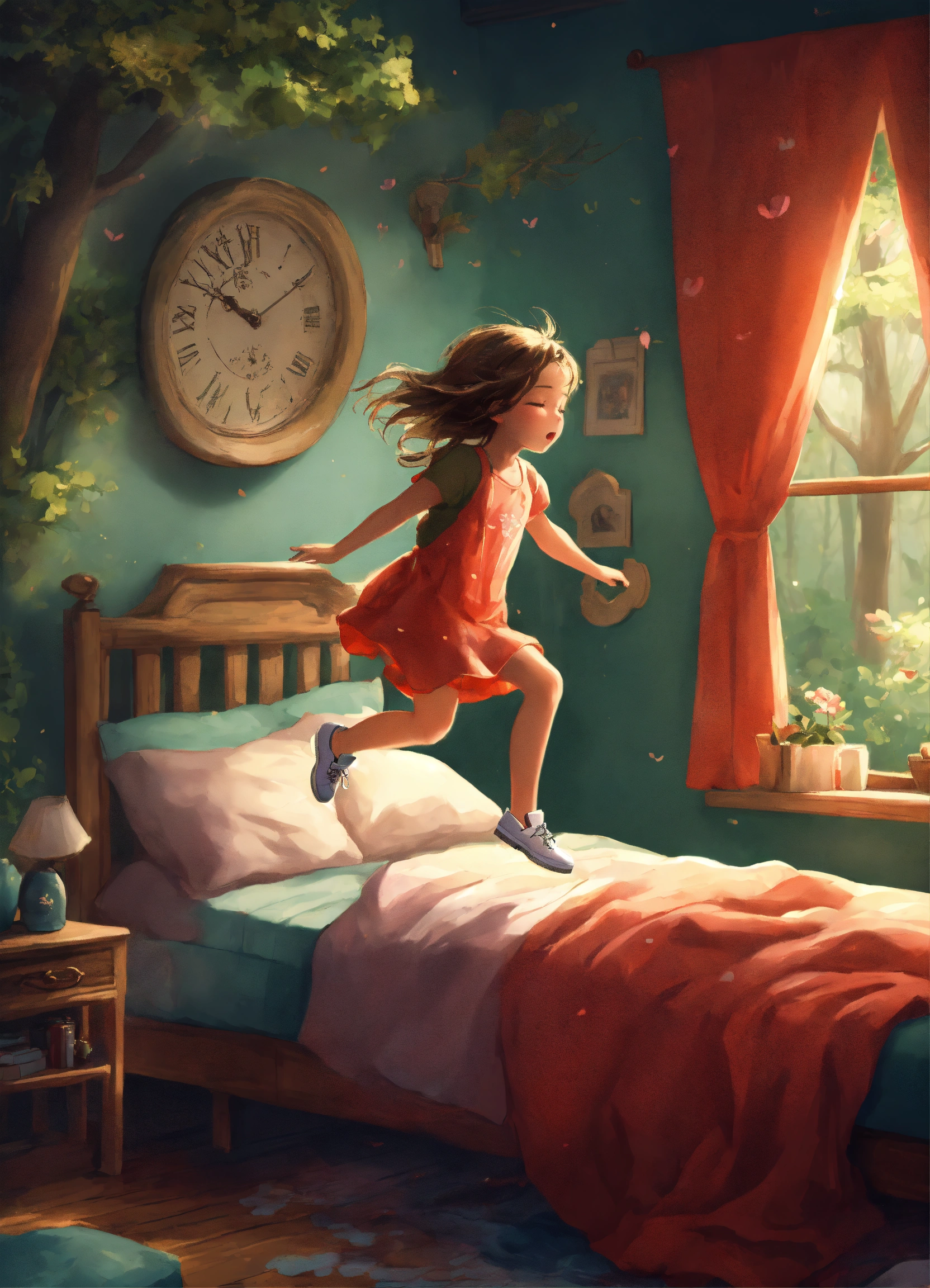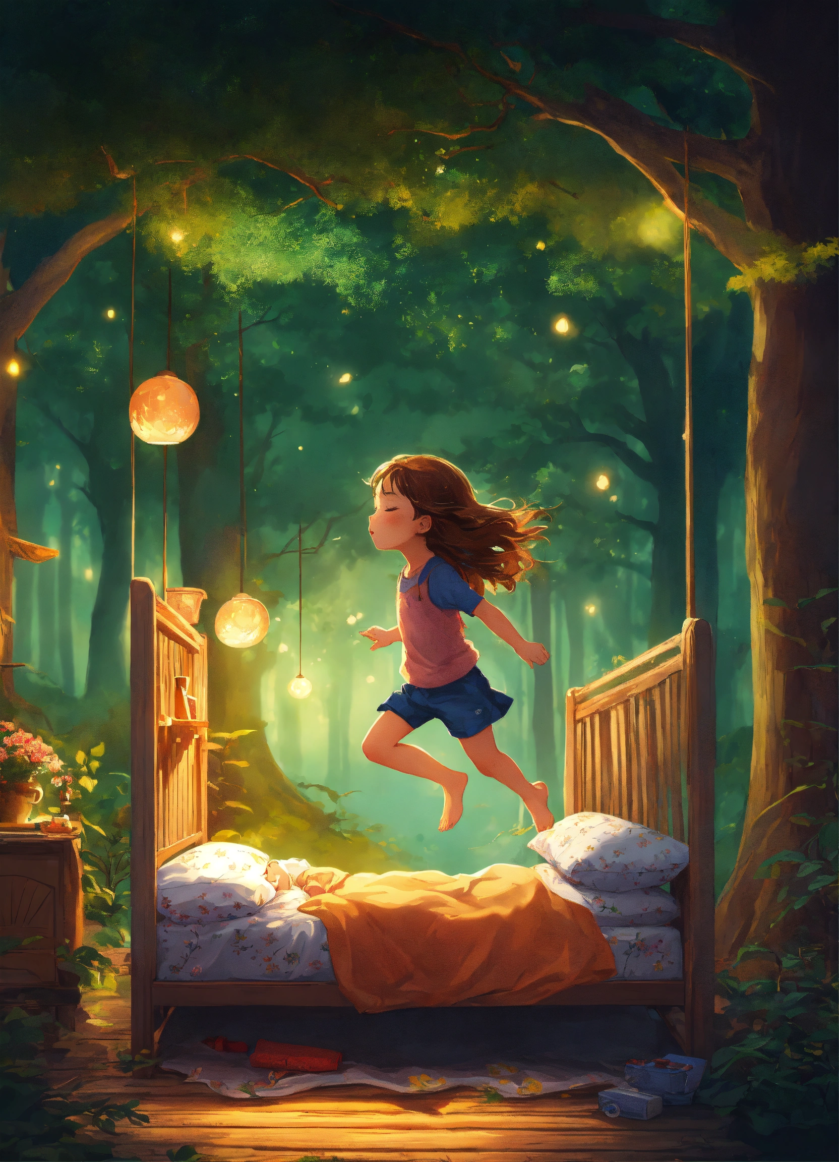 A beautiful illustration of a sleepy little cute girl jumping on his bed in a beautiful forest, highly detailed face, digital art