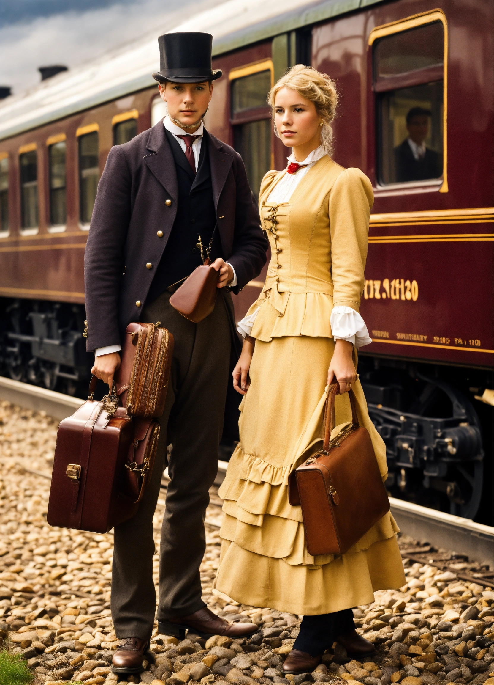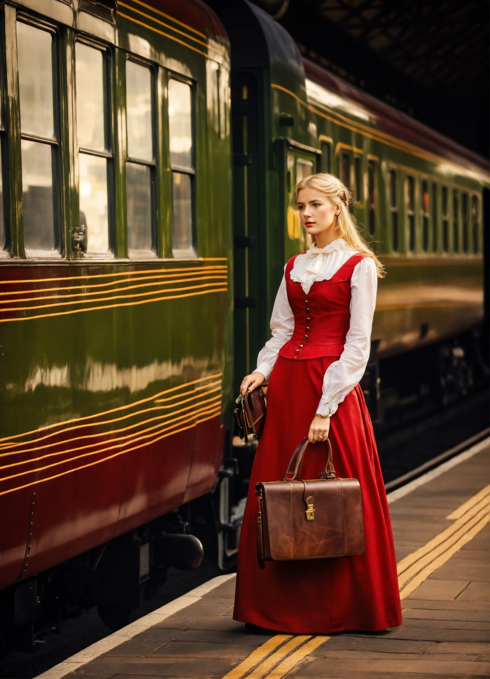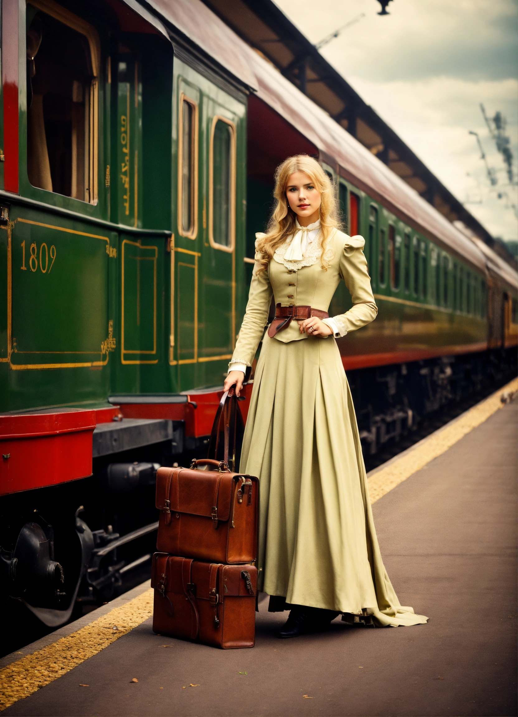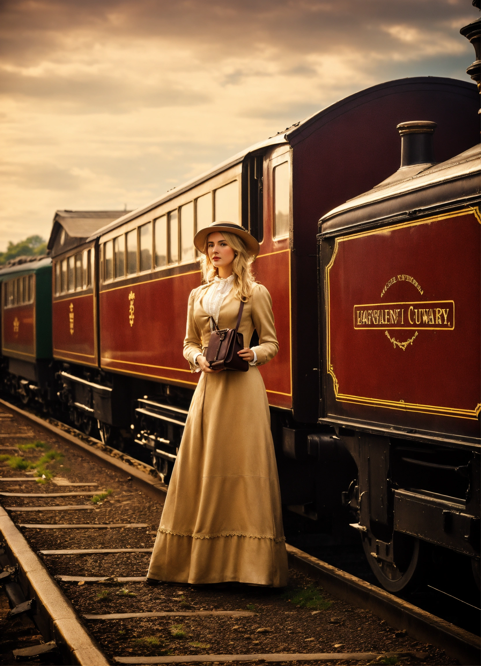 Year 1890, english country railway station, stopped train, passengers, elegant blonde girl, period dress, leather briefcase