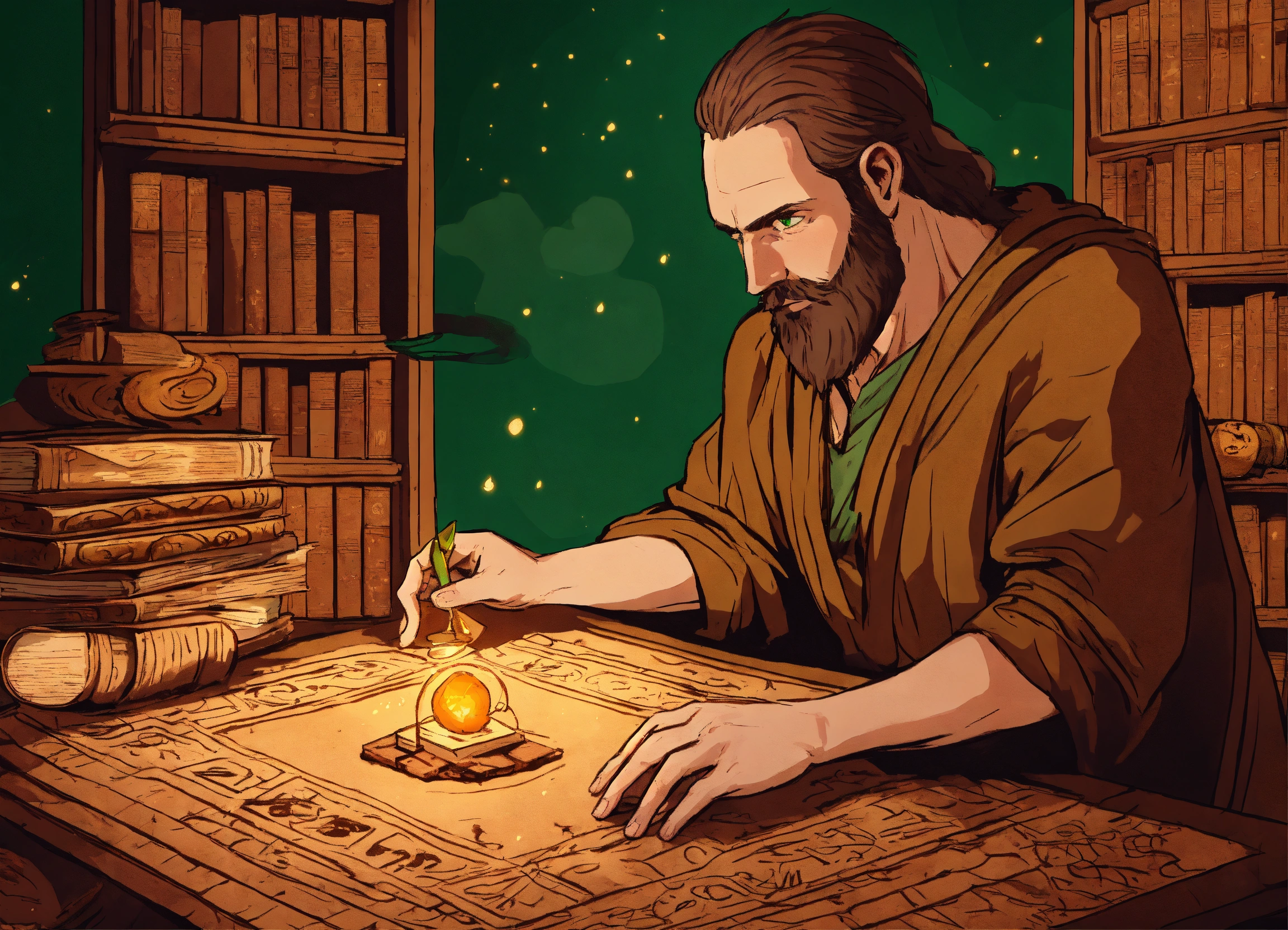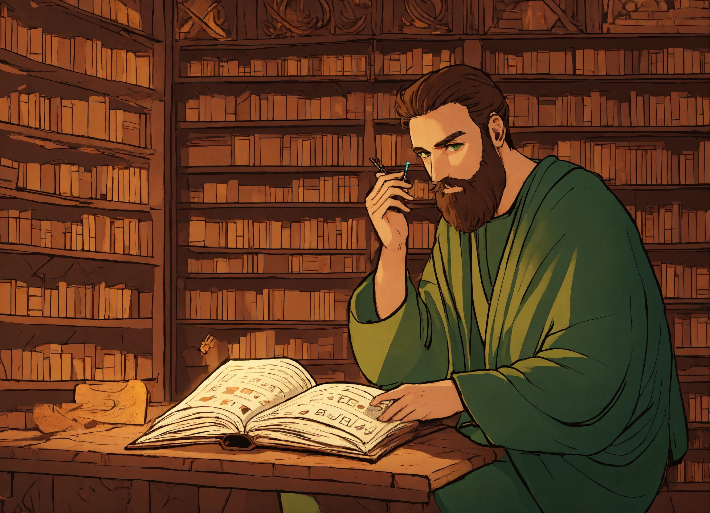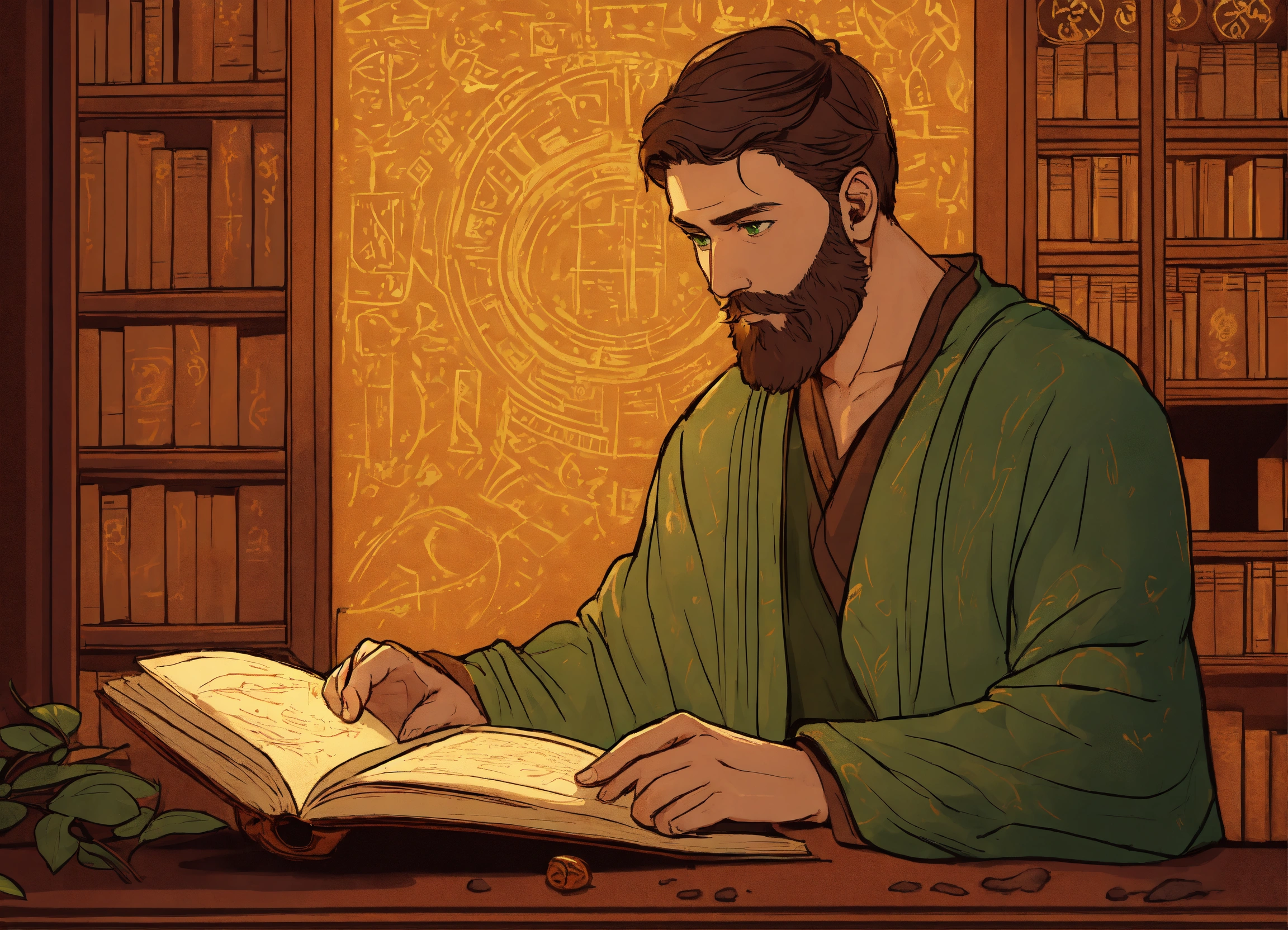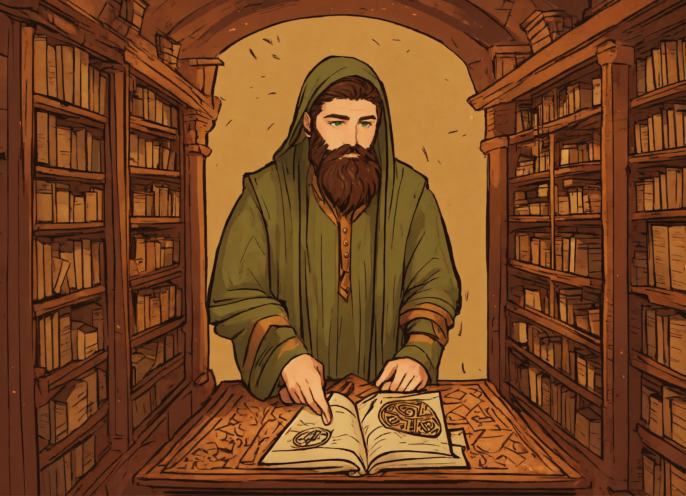 An illustration style where man with green eyes and sparse light thin brown beard is finding ancient symbols proves to be very difficult, show library in brown background