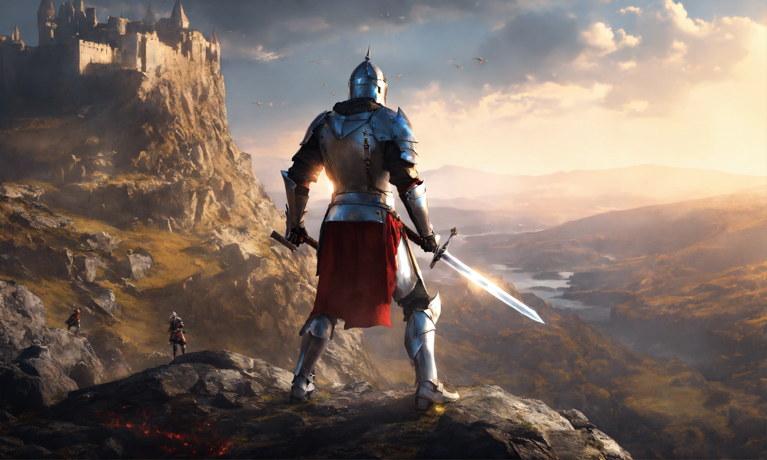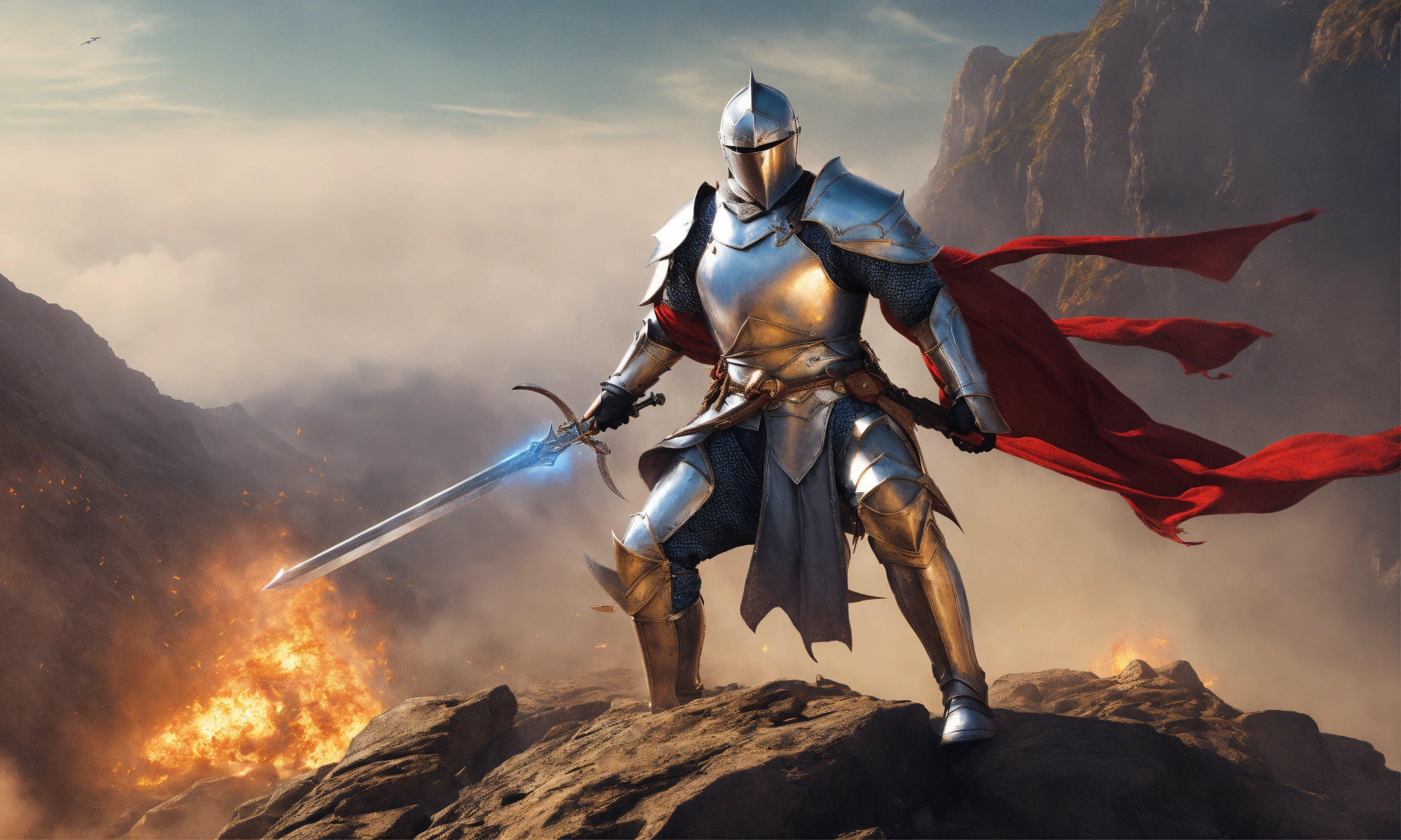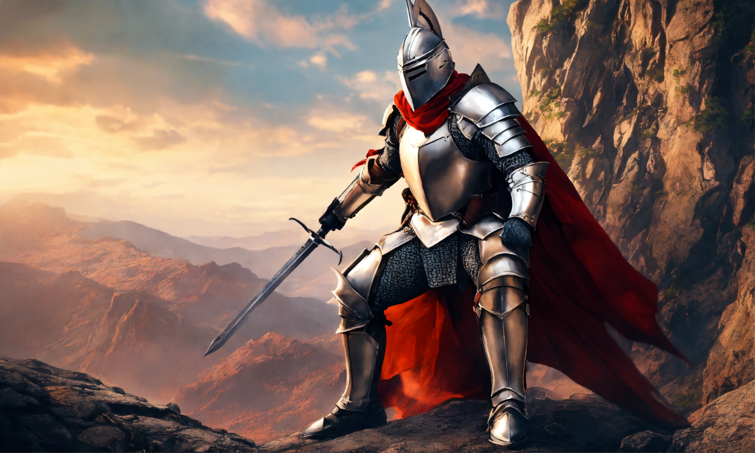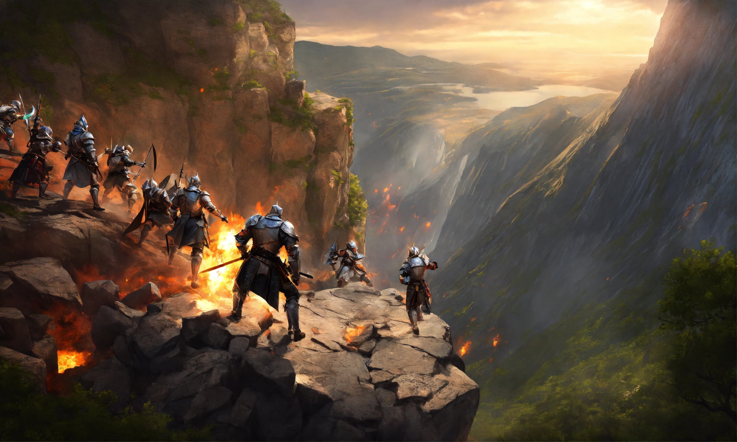 Desperate handsome male silver knight is forced off a cliff by many angry mercenaries