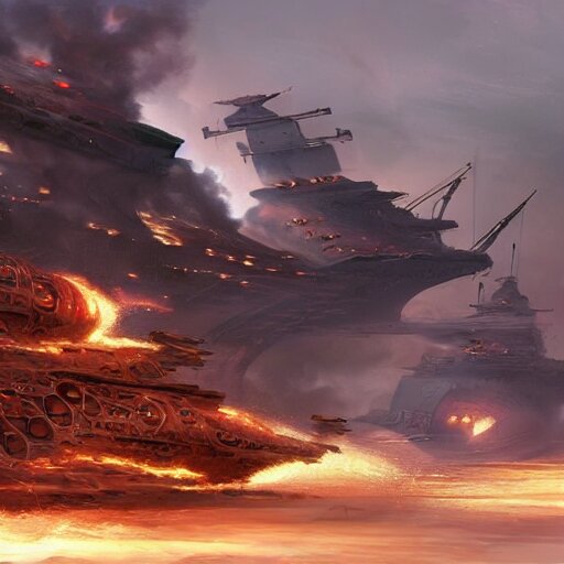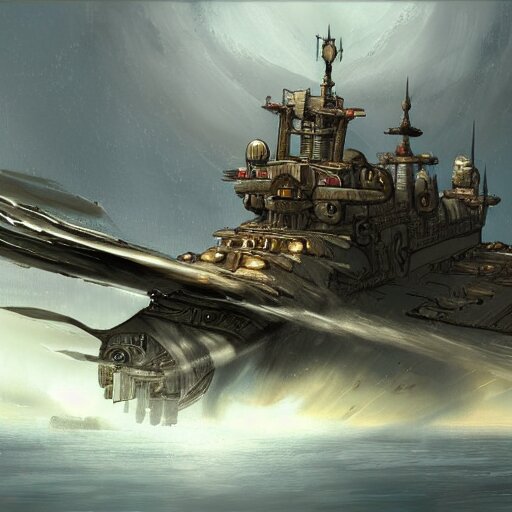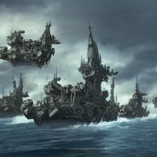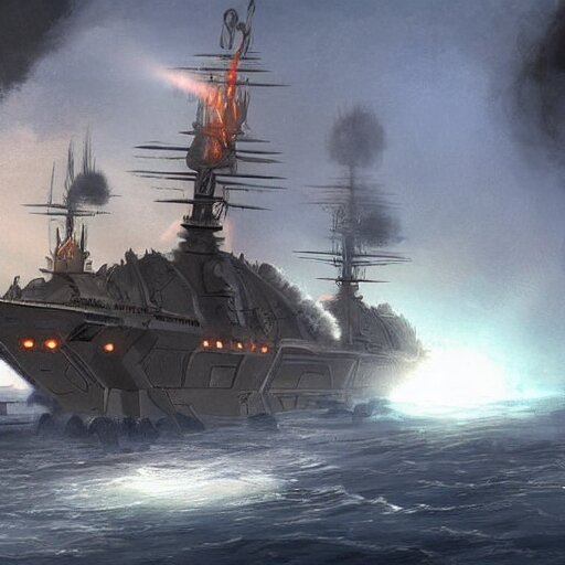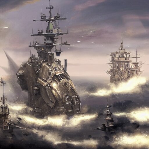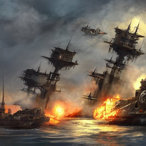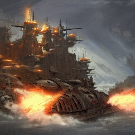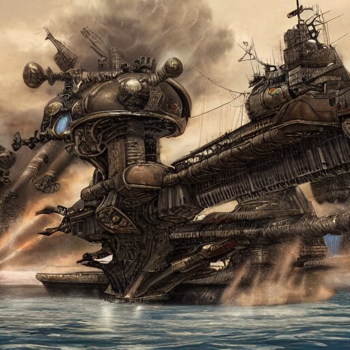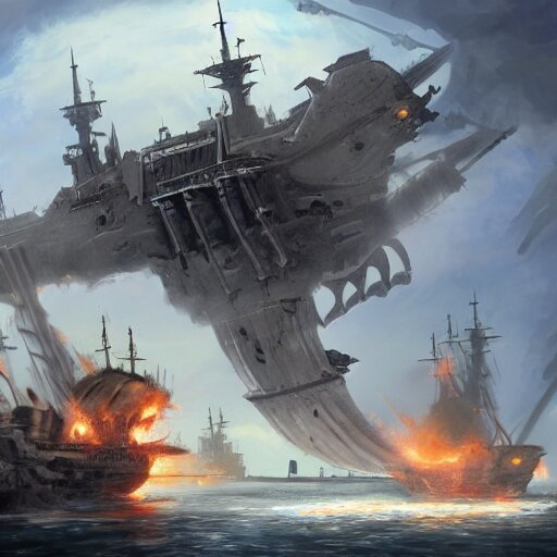 A concept art of an large fantasy steampunk mech bombing a fleet of naval ships