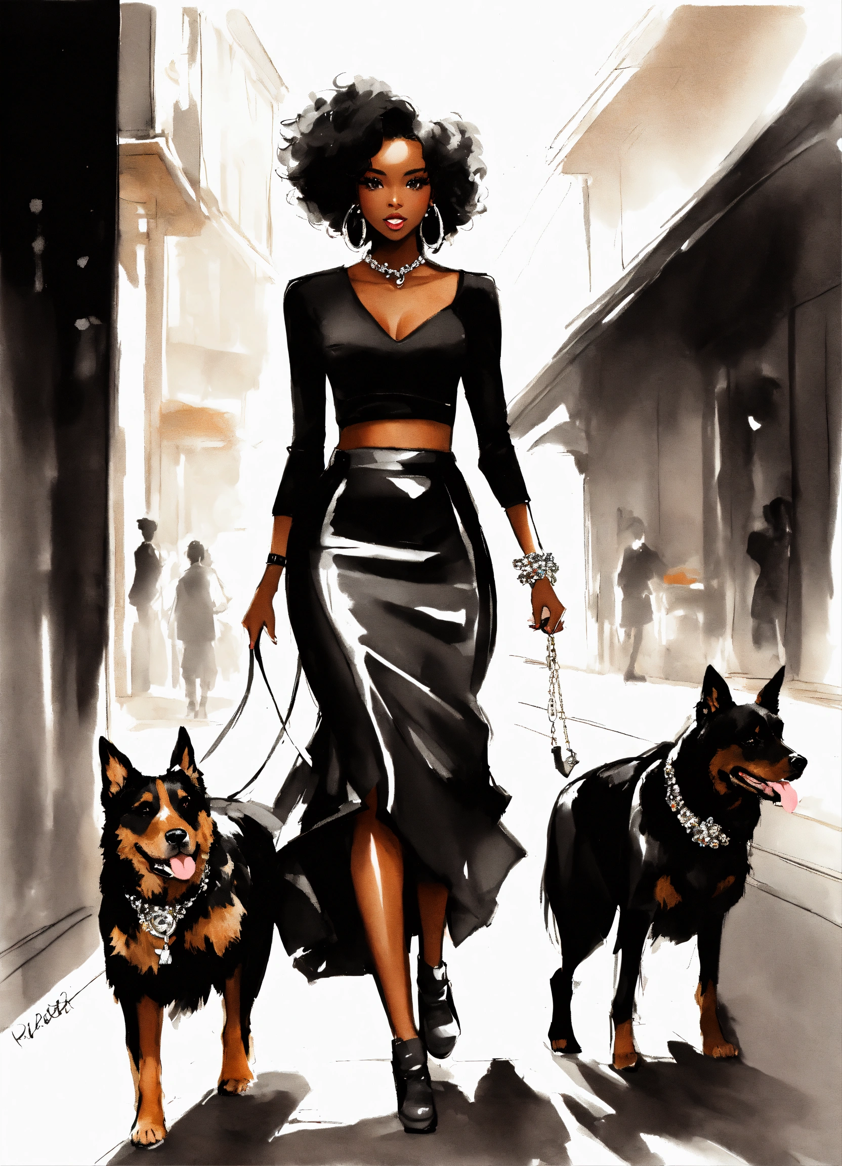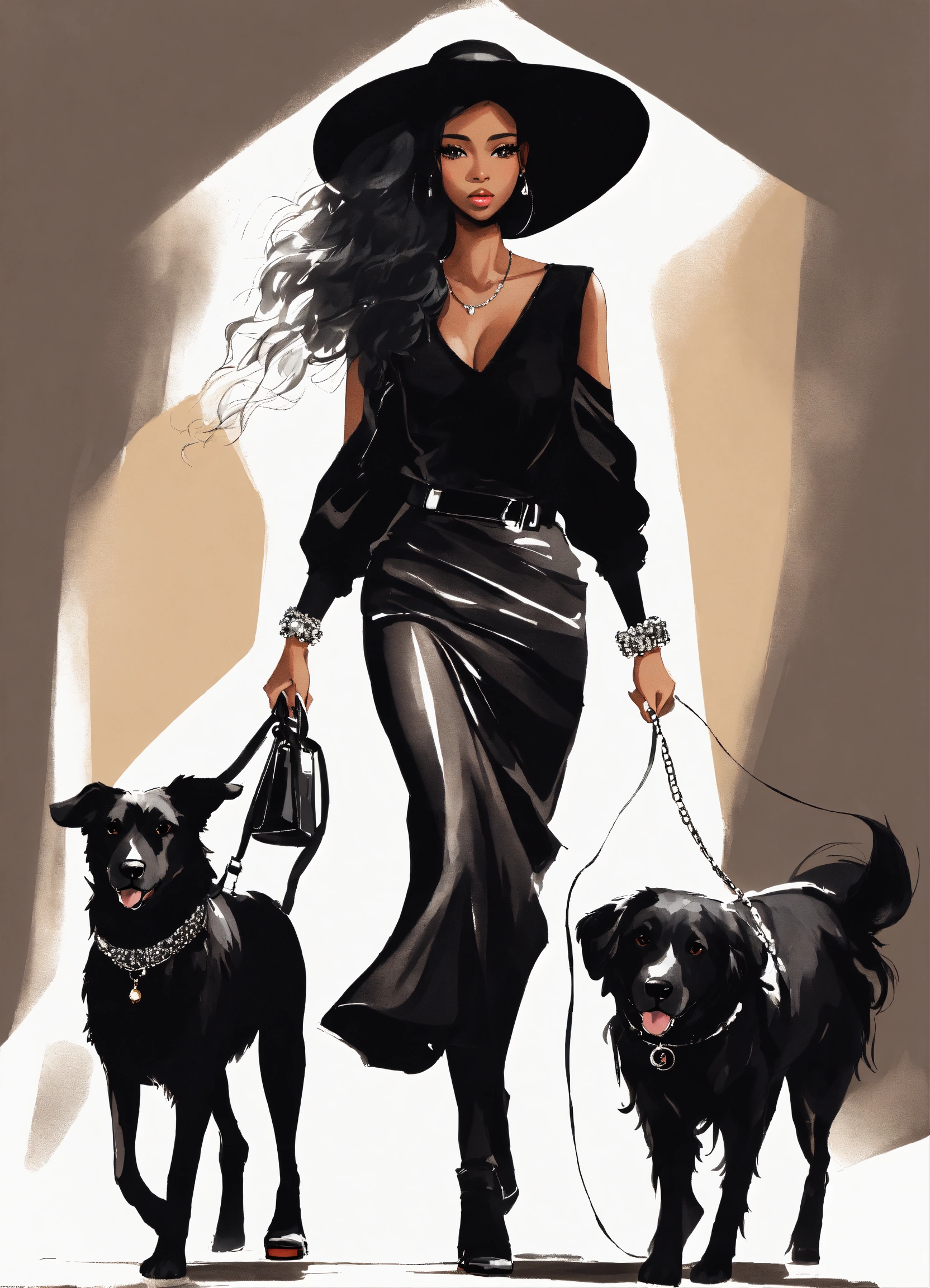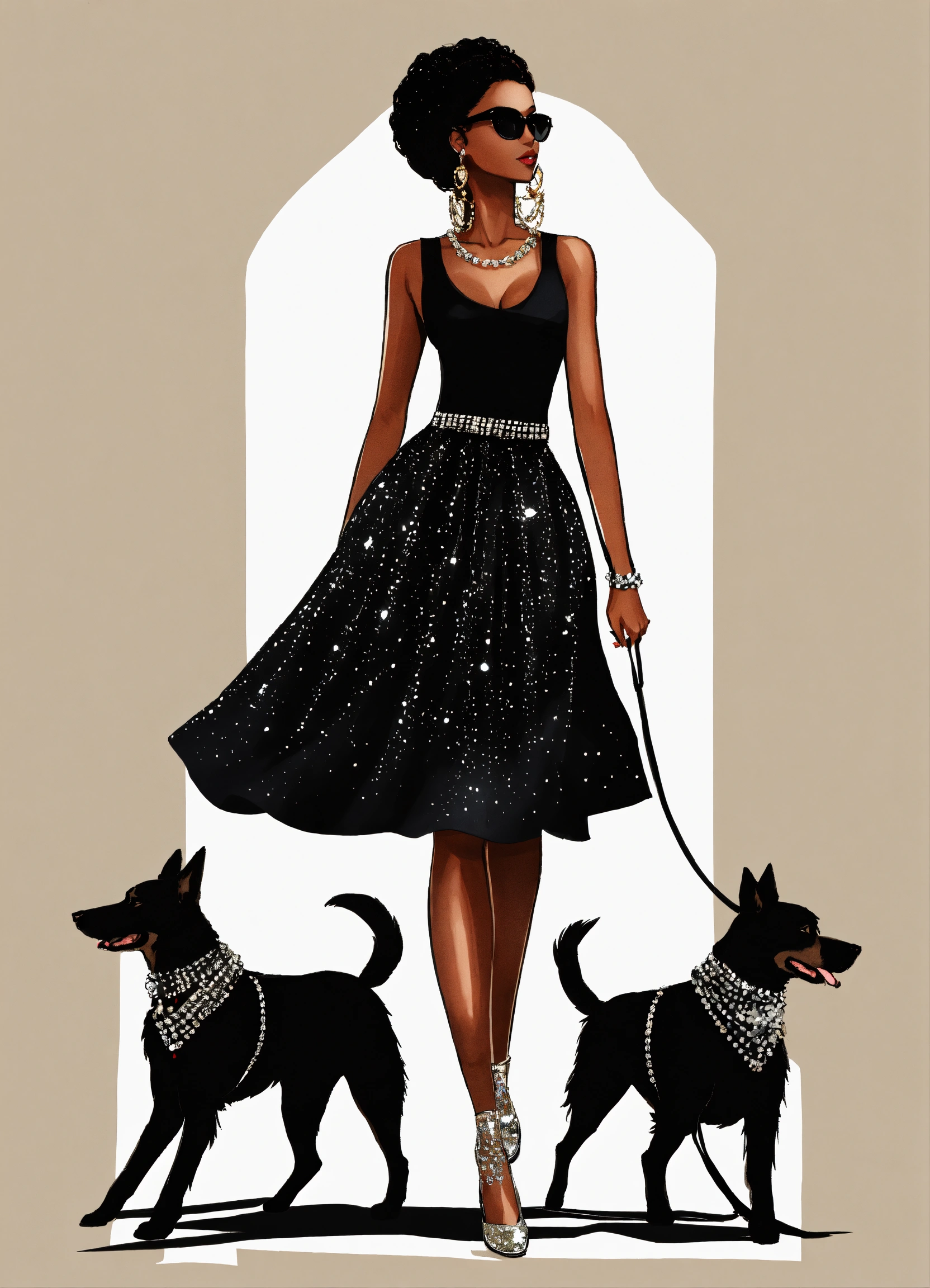 Pretty black stylish lady walking with her dogs, fashion sketch illustration, she's wearing pretty black top and full voluminous black skirt with sparkly crystals solid white background