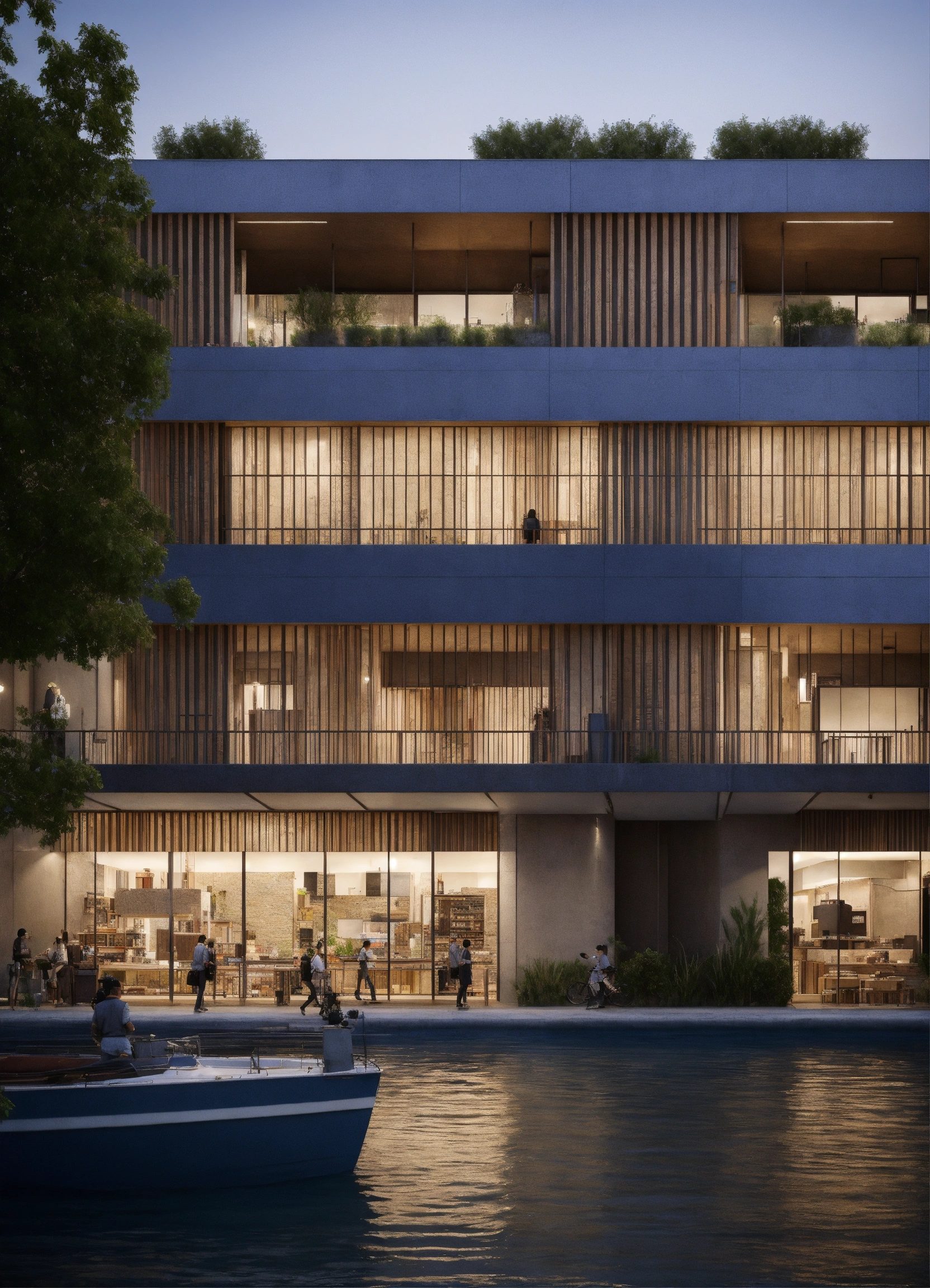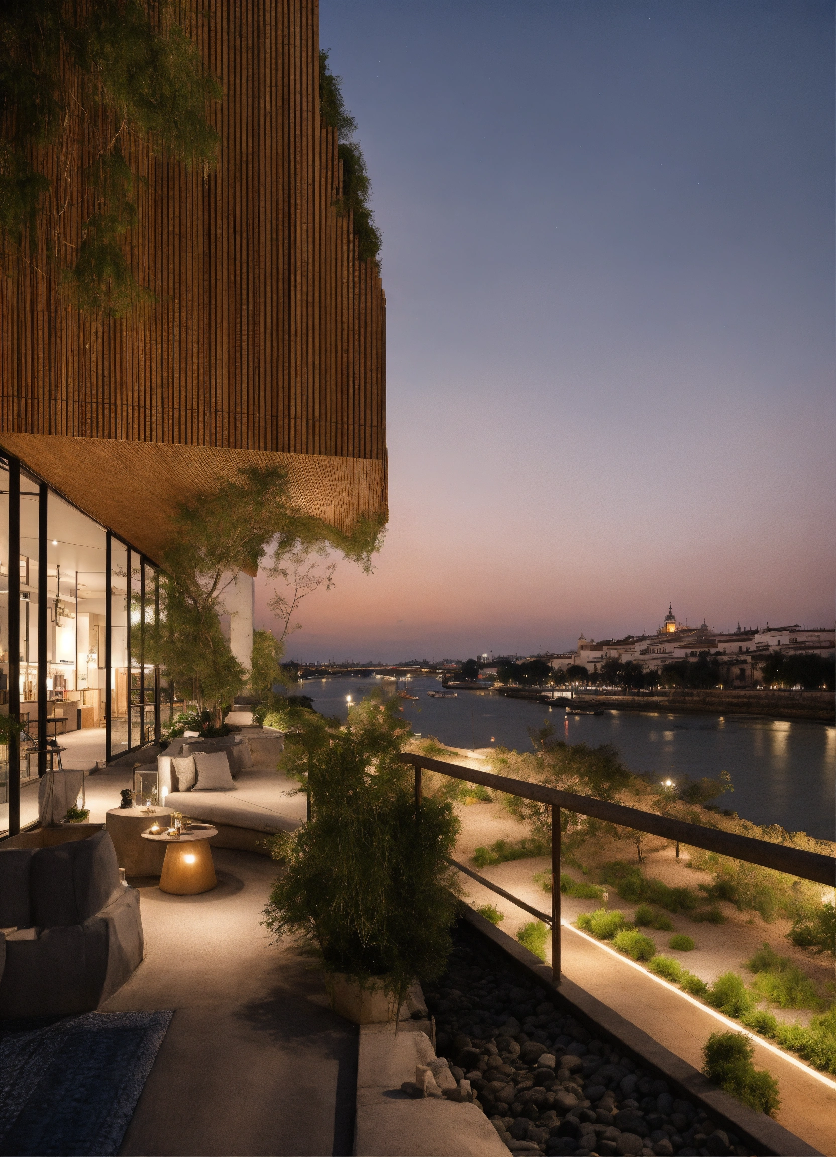 Diseñar una pasarela comercial repleta de oferta gastro arquitectónica y boutique con firmas de lujo colindando con el río guadalquivir de sevilla. un diseño atractivo, moderno y eco-arquitectonico, realizado con una producción de modulares industrializados, respetando las zonas verdes protegidas y el entorno, empleando materiales constructivos que emitan menor huella de carbono…poniendo estos servicios a disposición de los lujosos cruceros que actualmente llegan a sevilla, los que atraerán y tambien al propio ciudadano. vista noche aerea donde se muestre el rio