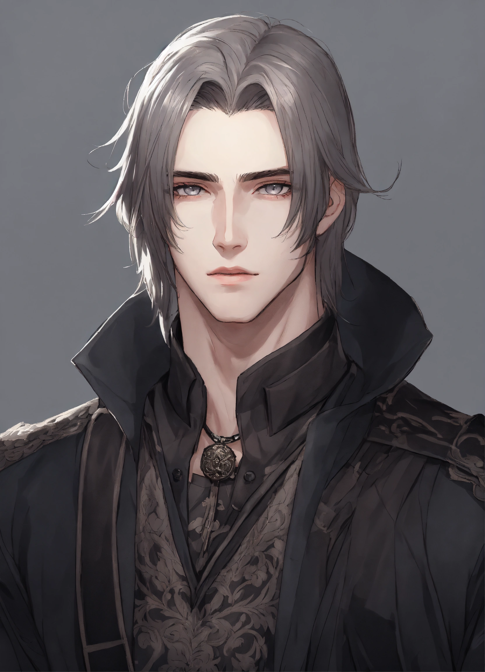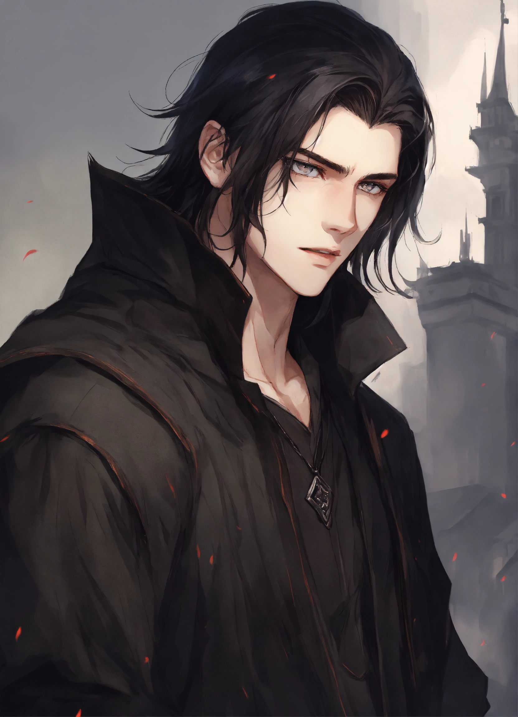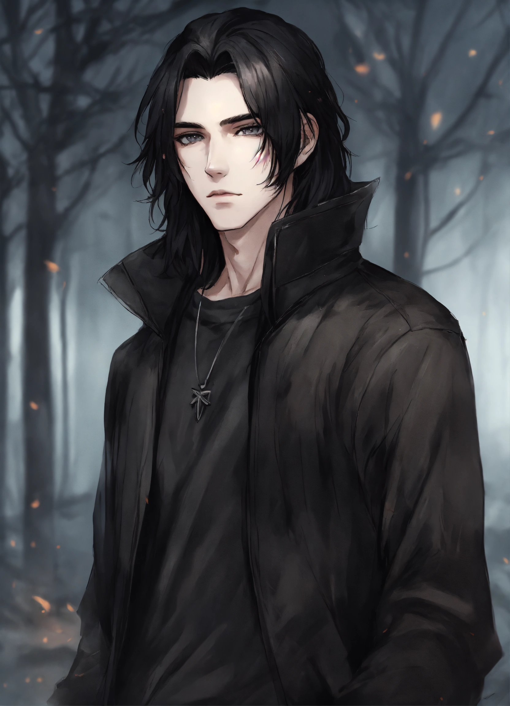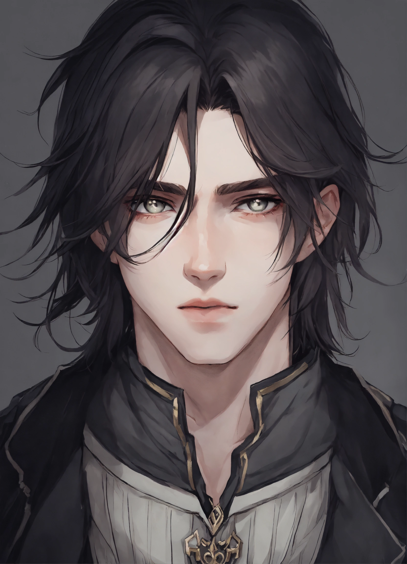 20-year-old slavic man, dark black straight shoulder length hair, grey eyes, deathly pale skin, slvic clothing, anime drawing