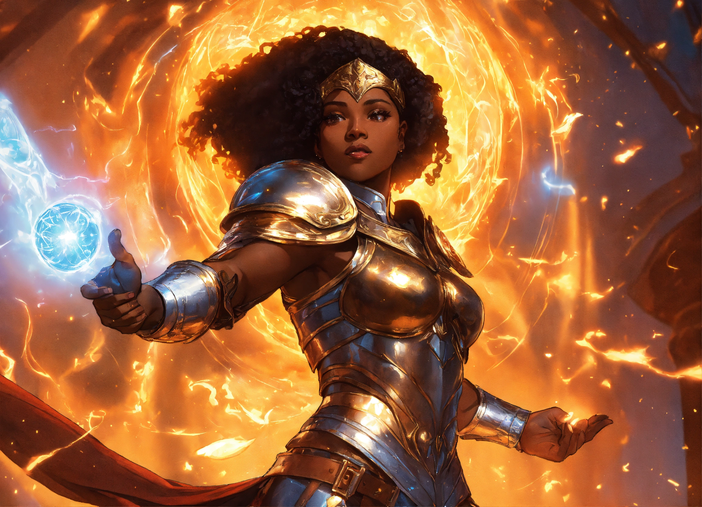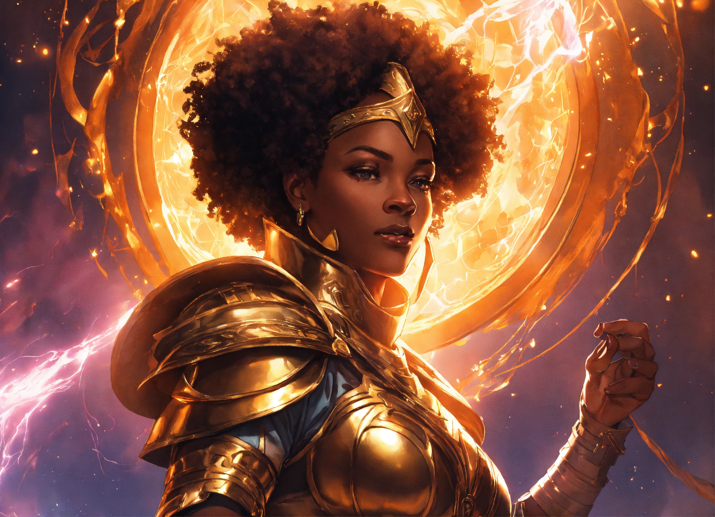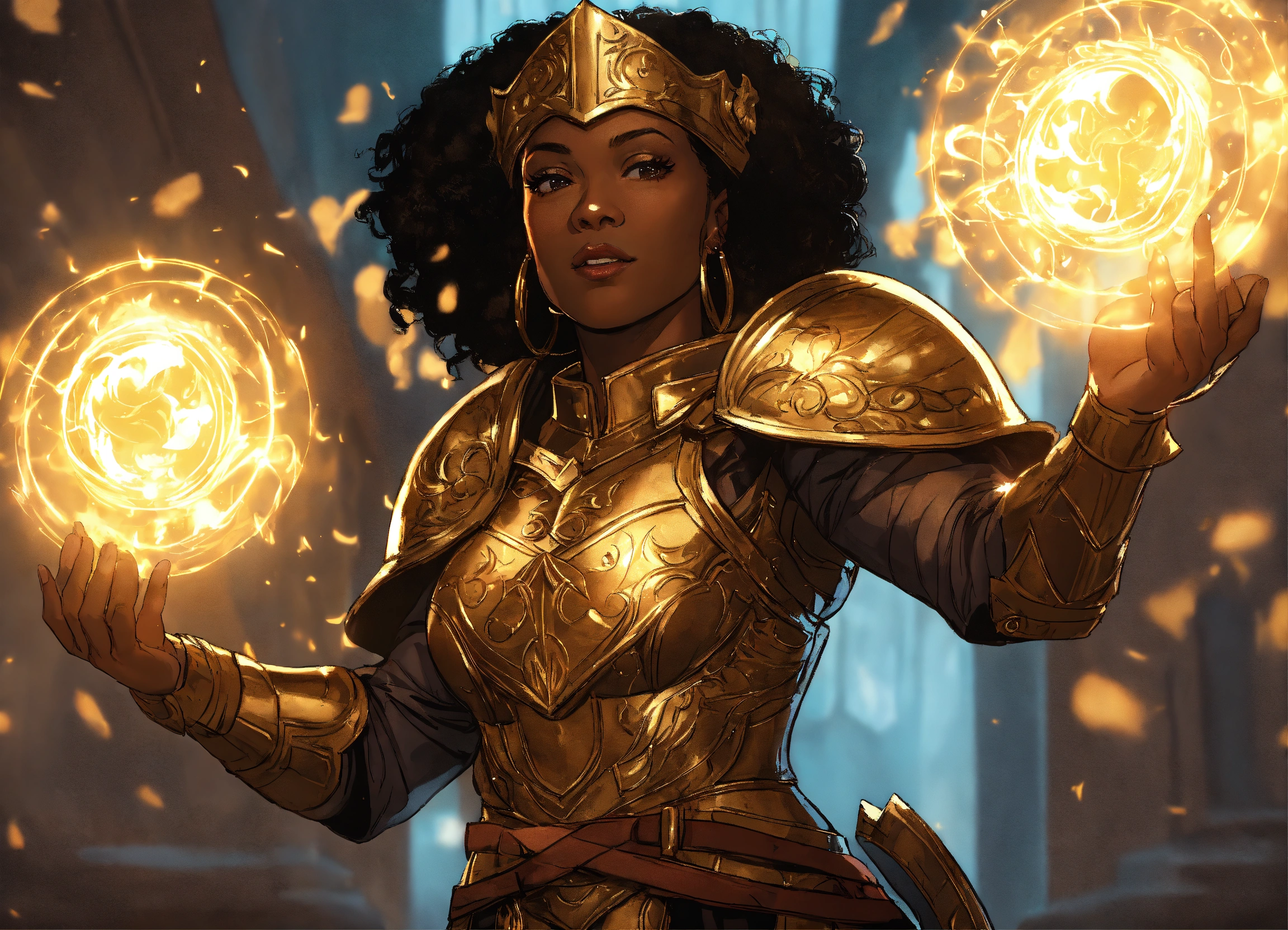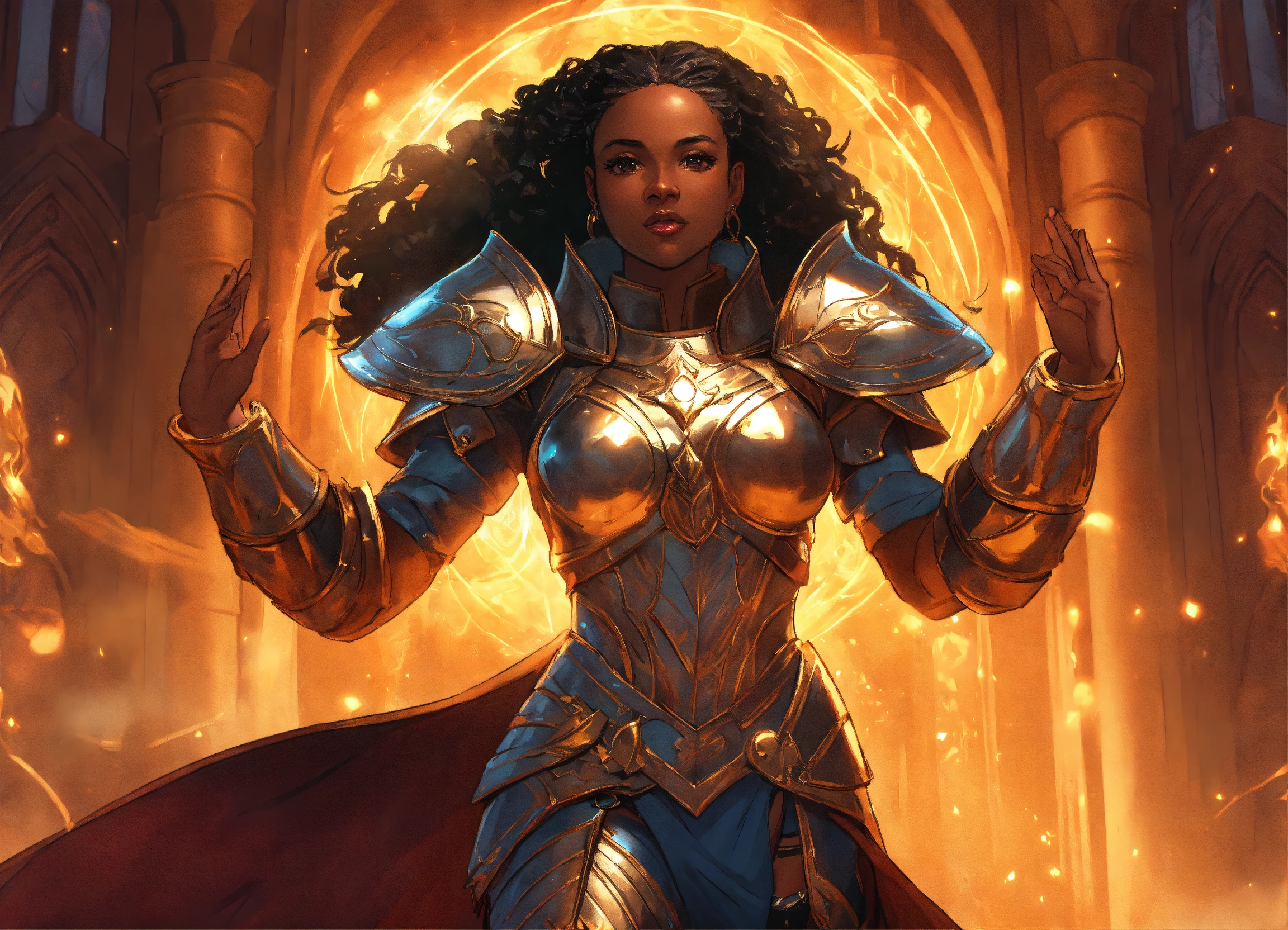 Body shot, a middle aged black female cleric in full bronze armor wearing a half-helmet casting divine magic radiance outward from her hands, emanating power, cinematic lighting, graphic novel art