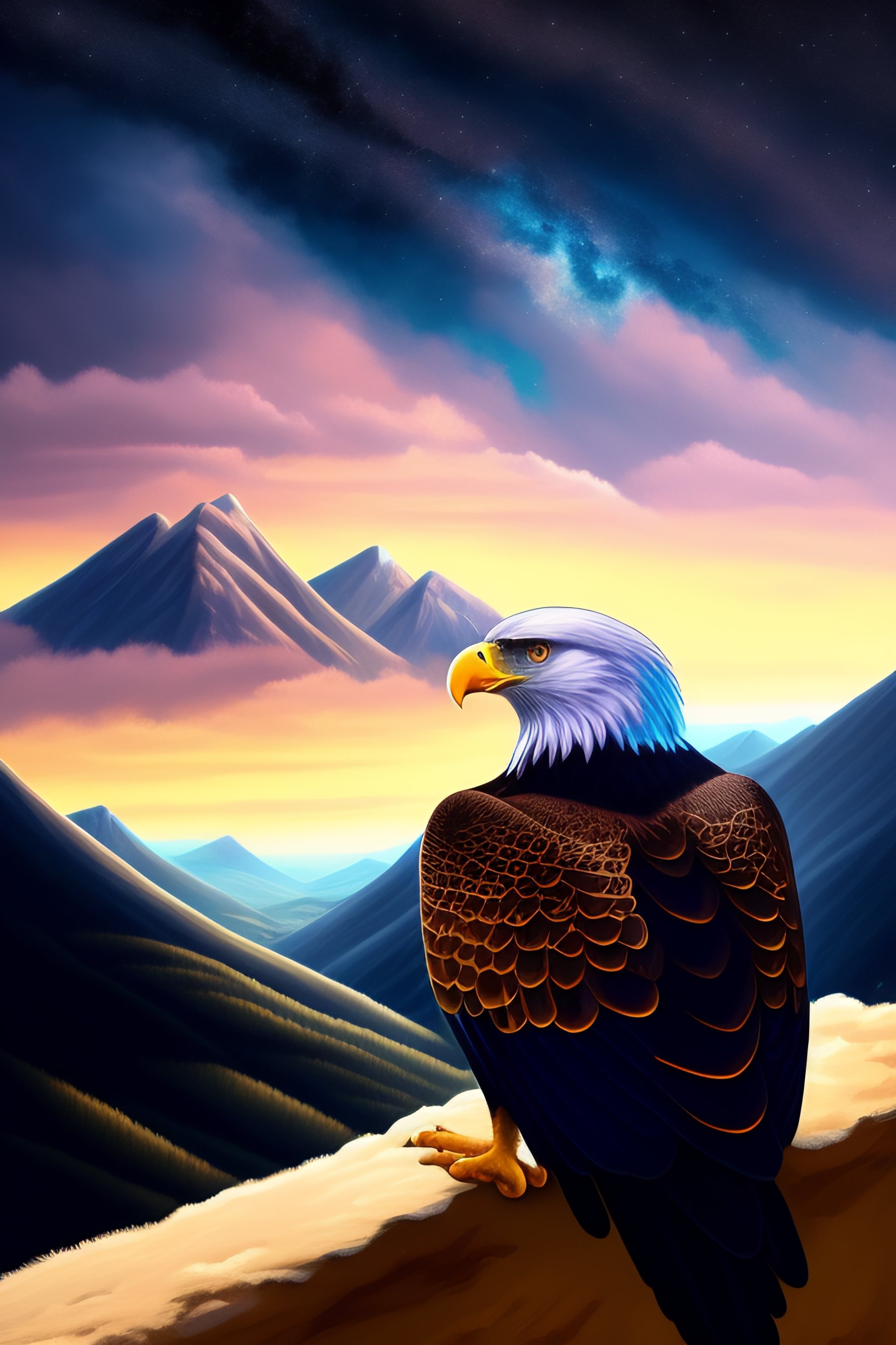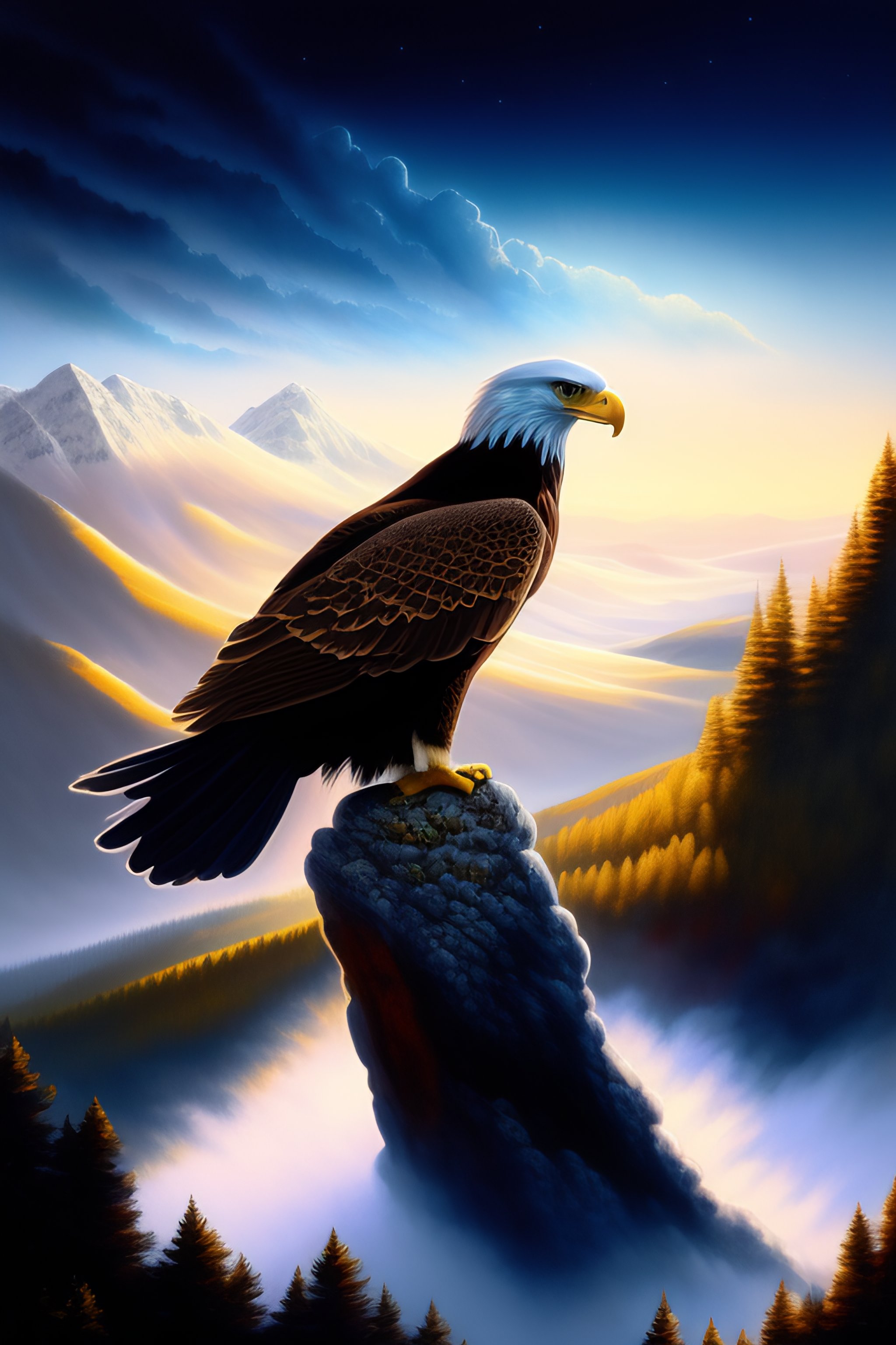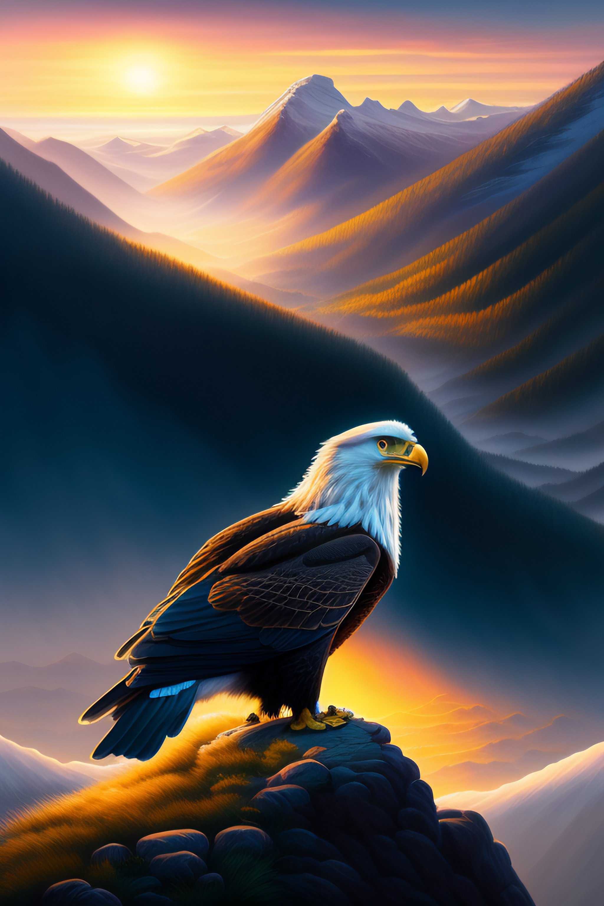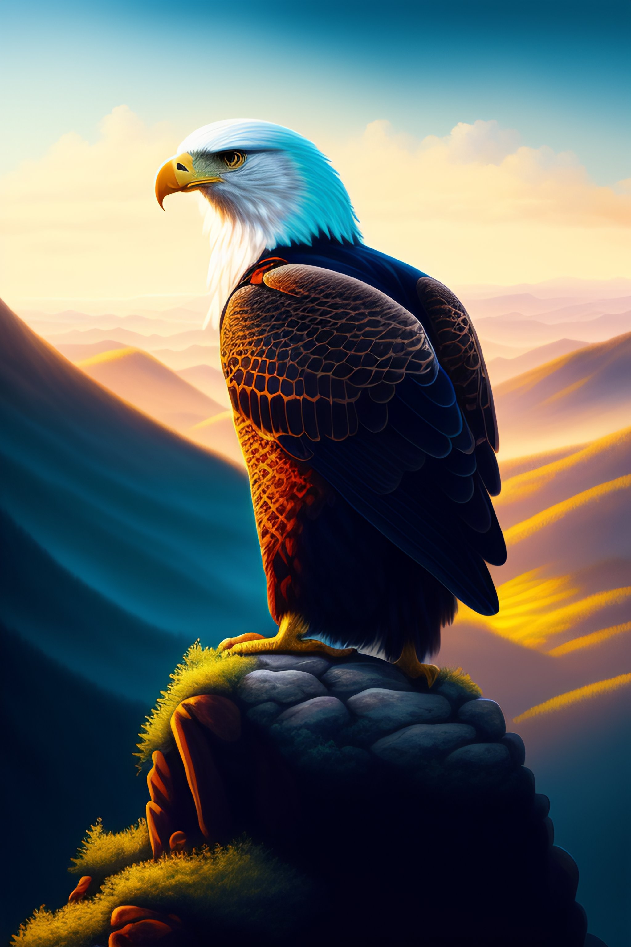 Drawing of an eagle sitting on top of a mountain overlooking a beautiful landscape, atmospheric lighting, professional, exceptional artist, perfect, beautiful detail, masterpiece, amazing composition, incredible skill