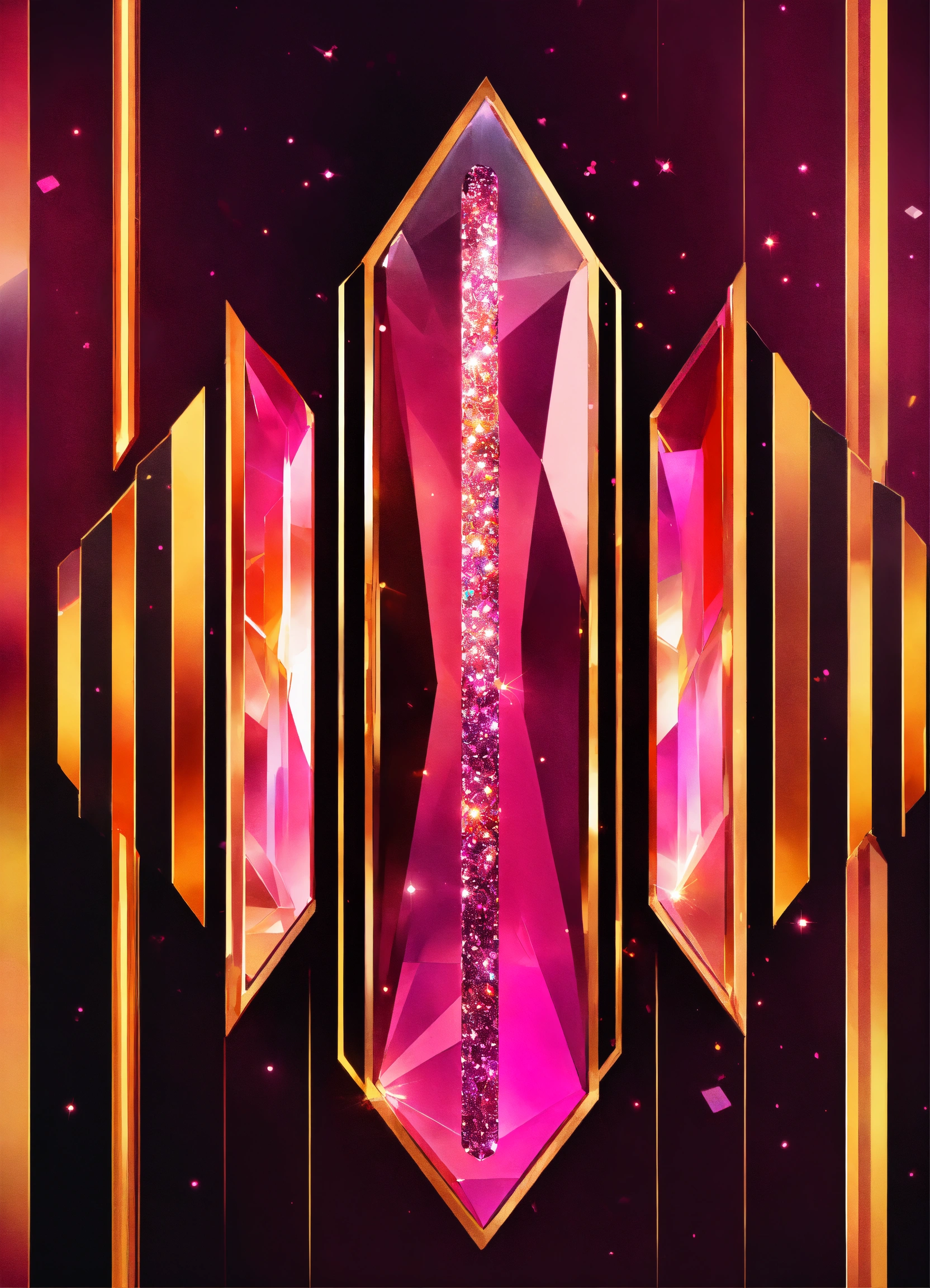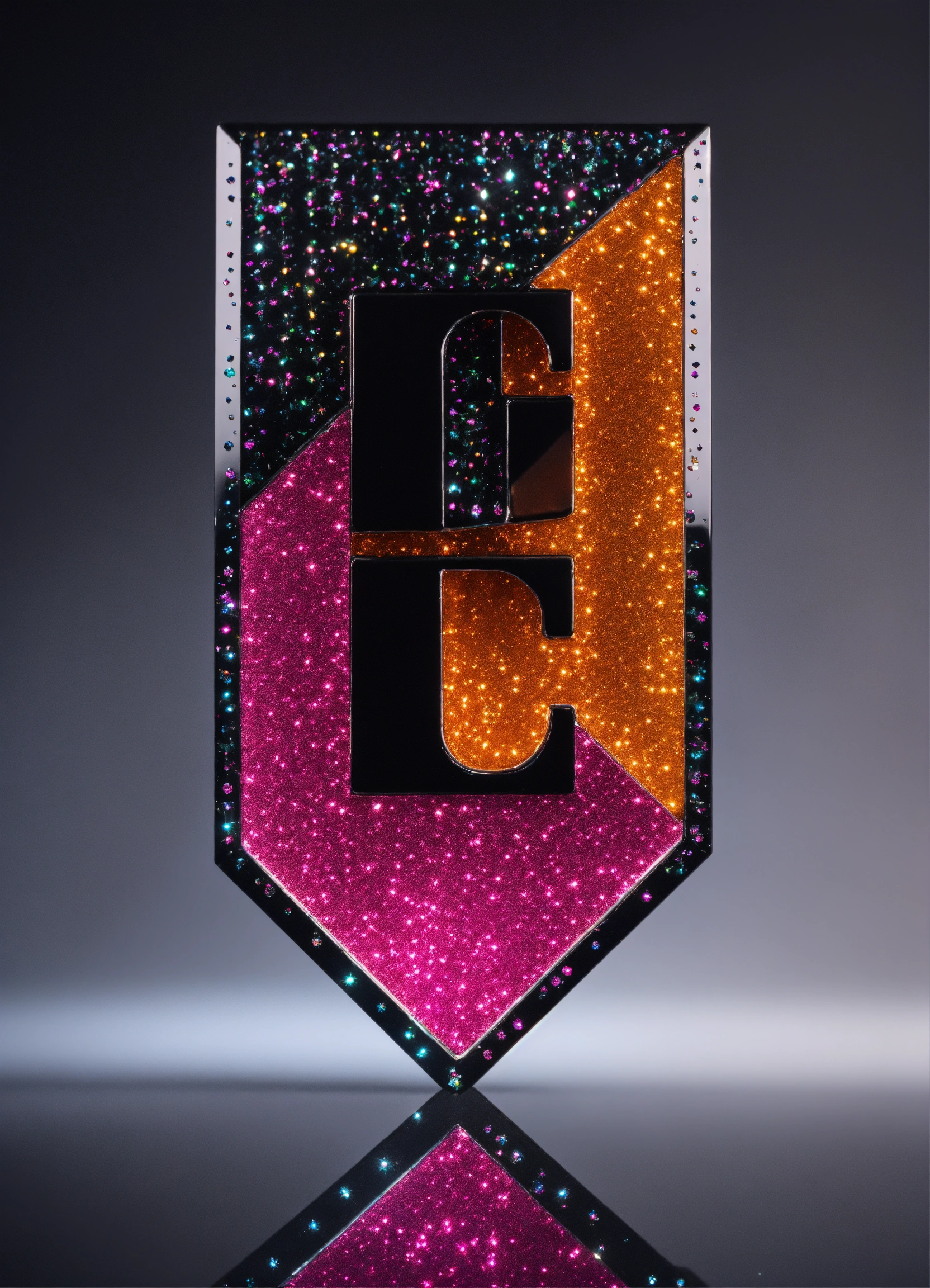 Business logo with a vertical letters rectangle shaped iconic symbolism . crystallized, rhinestonesshine glitter, sparkle, made with colors of fushia, bright orange, and electric grern, black, classy, modern, feminine 8k, hd, intricate