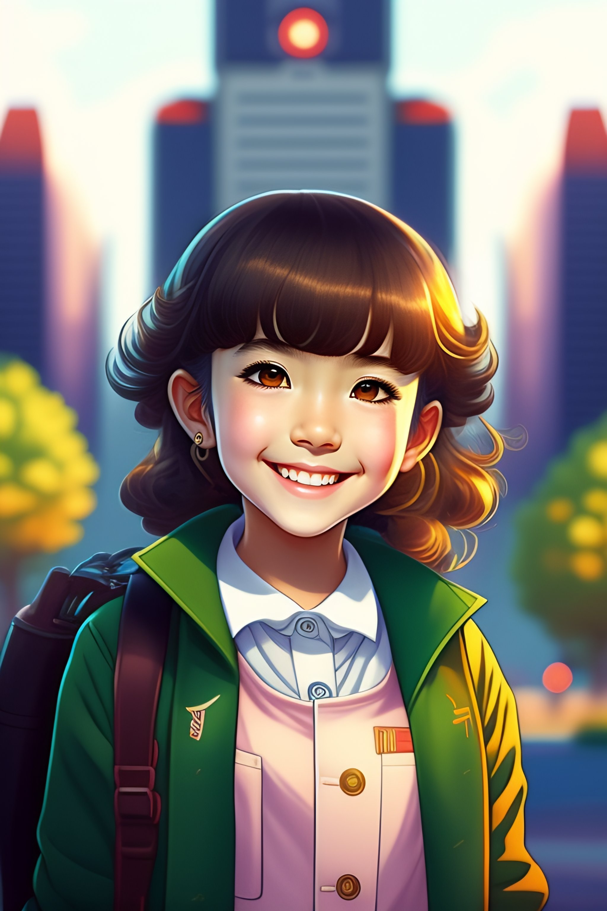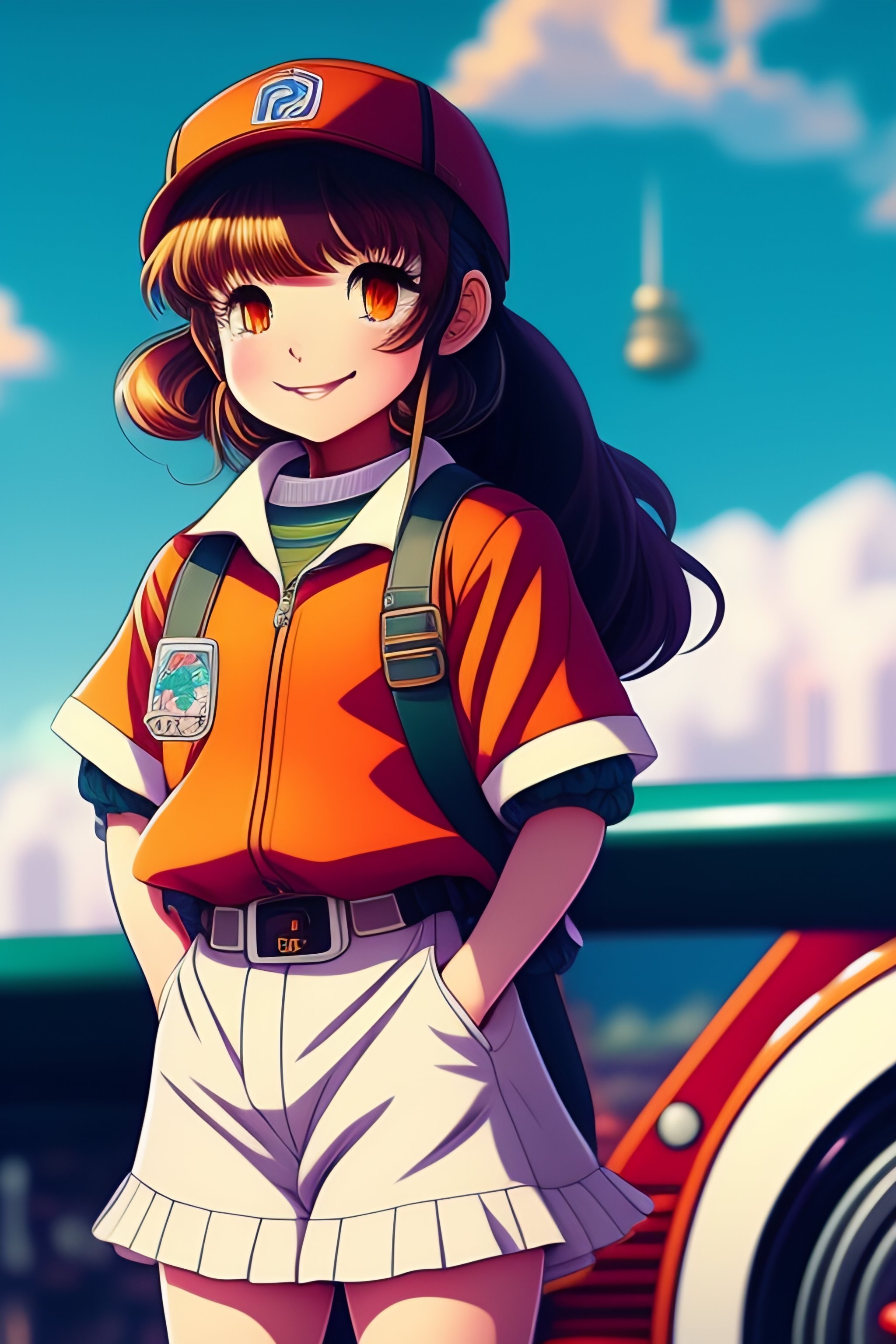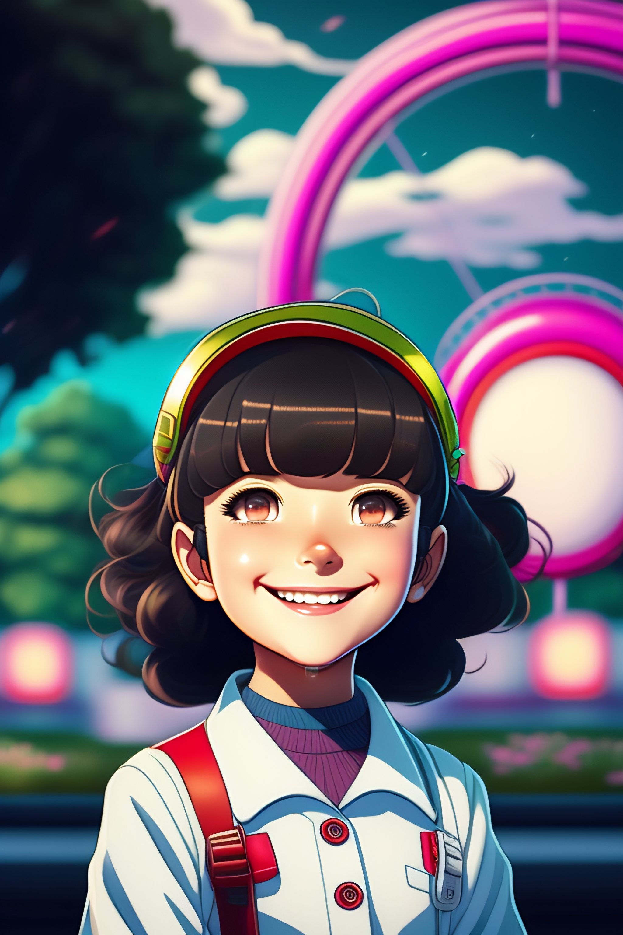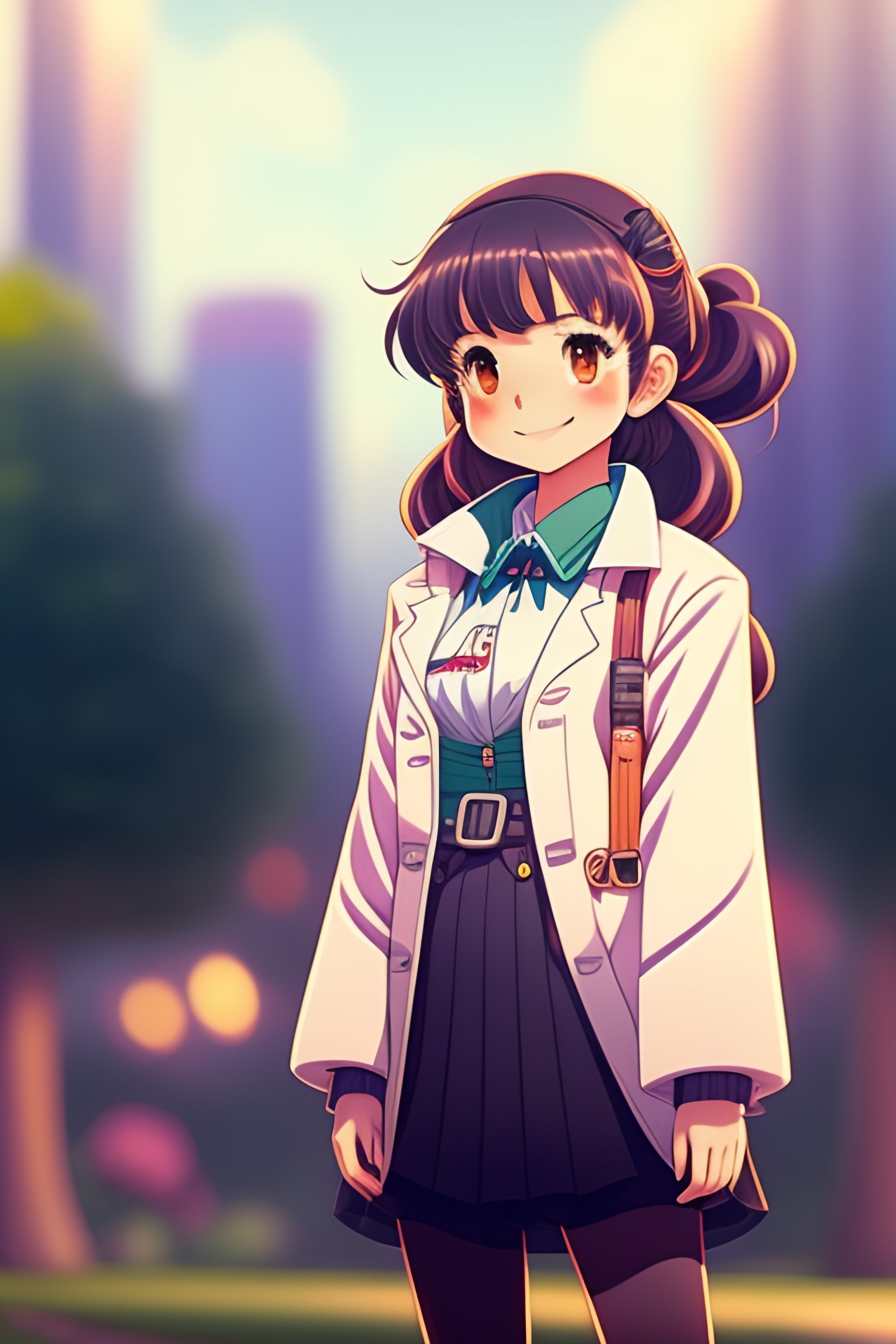 A 10 year old girl smiling playing in a park in the style of vintage 90s anime, wearing a scientist outfit, akira style. detailed line art. fine details