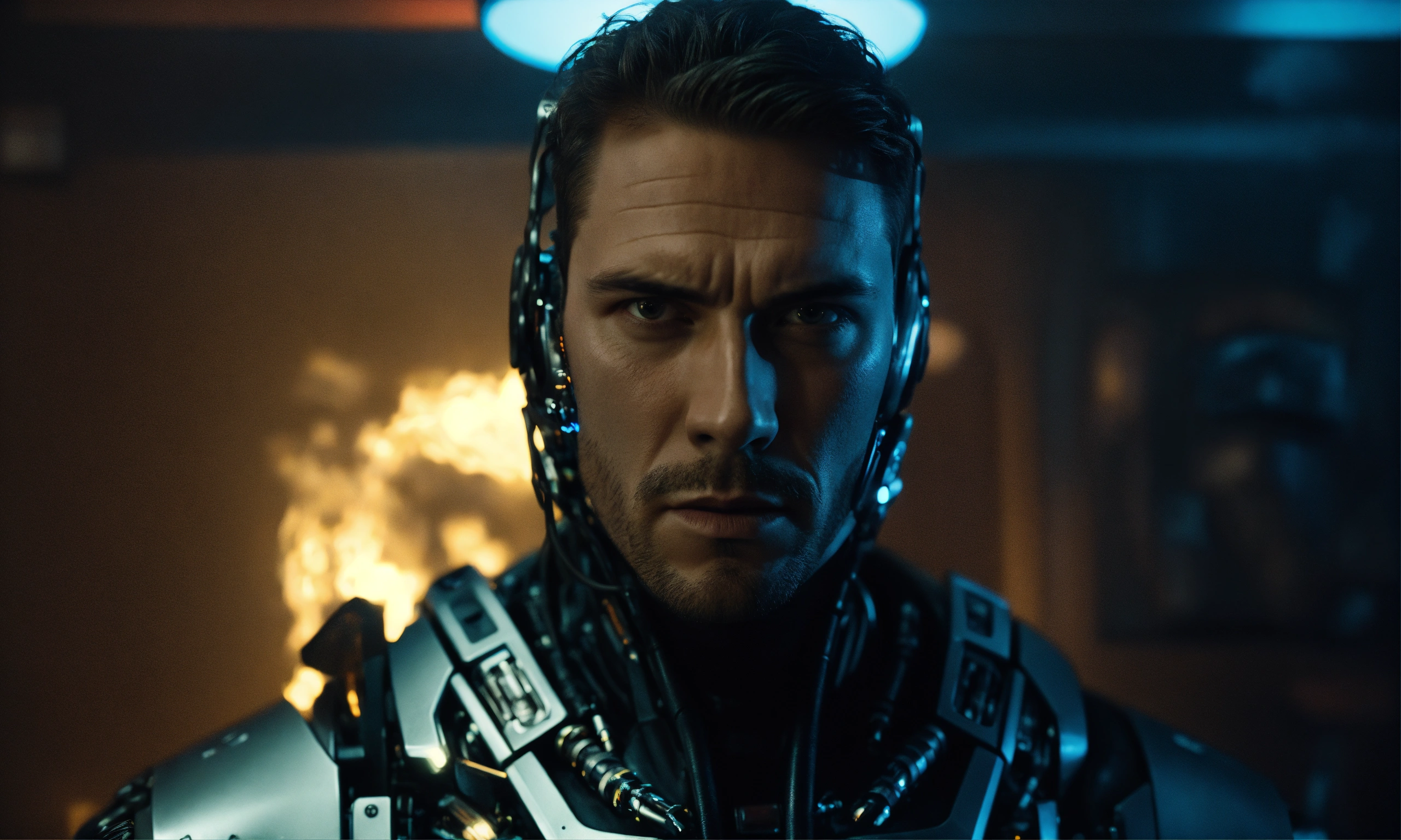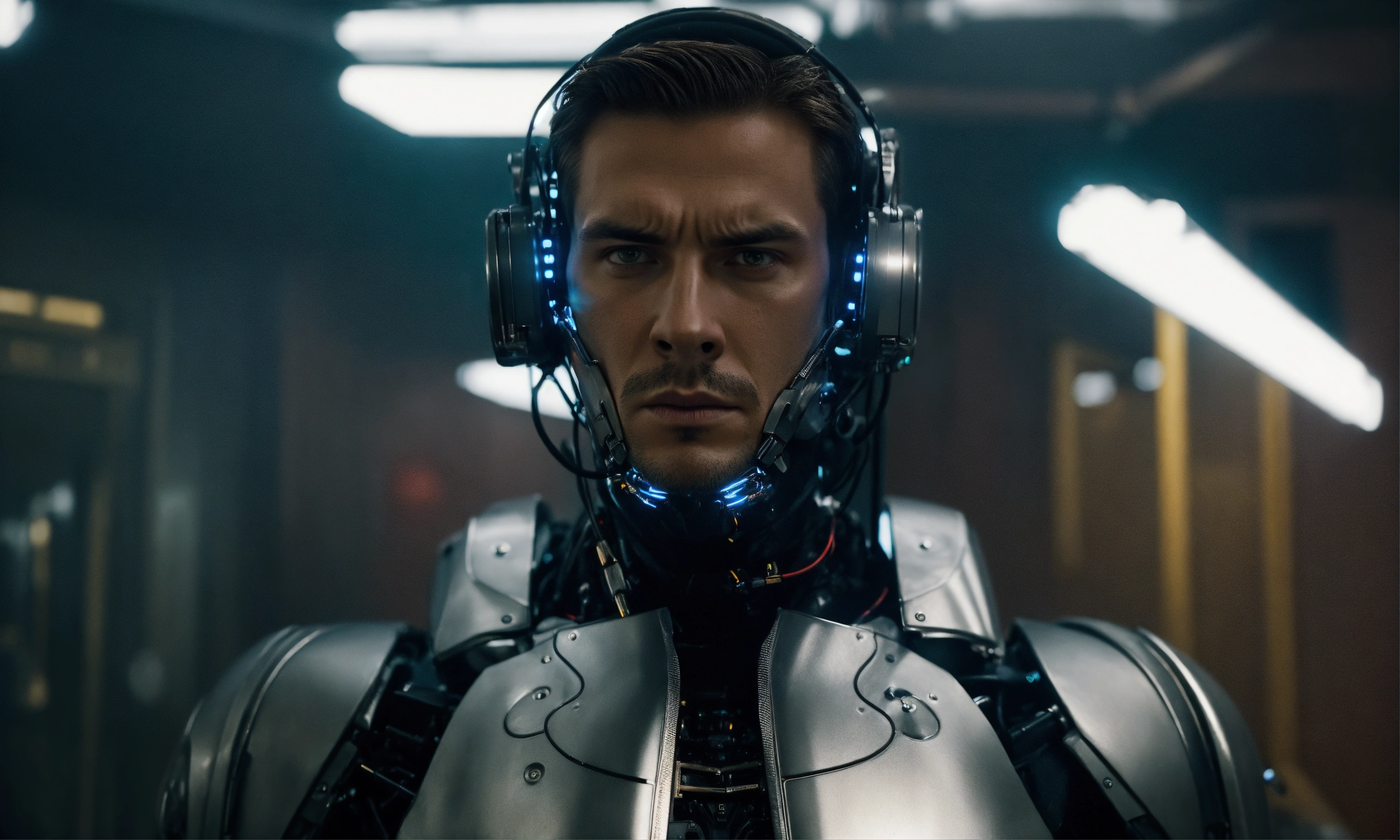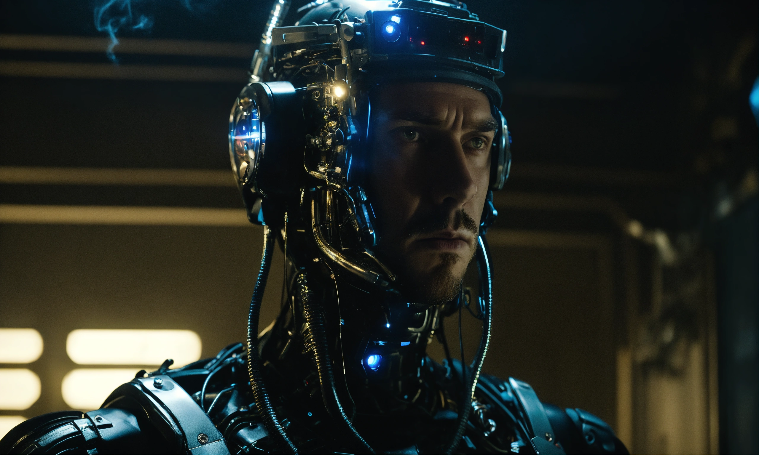 Head and torso portrait of an intimidating male cyborg, looking directly to camera, wearing black with silver lighted electronics. he is in the dark smoke-filled room, hyper-realistic. he is not happy. in a film by wes anderson.