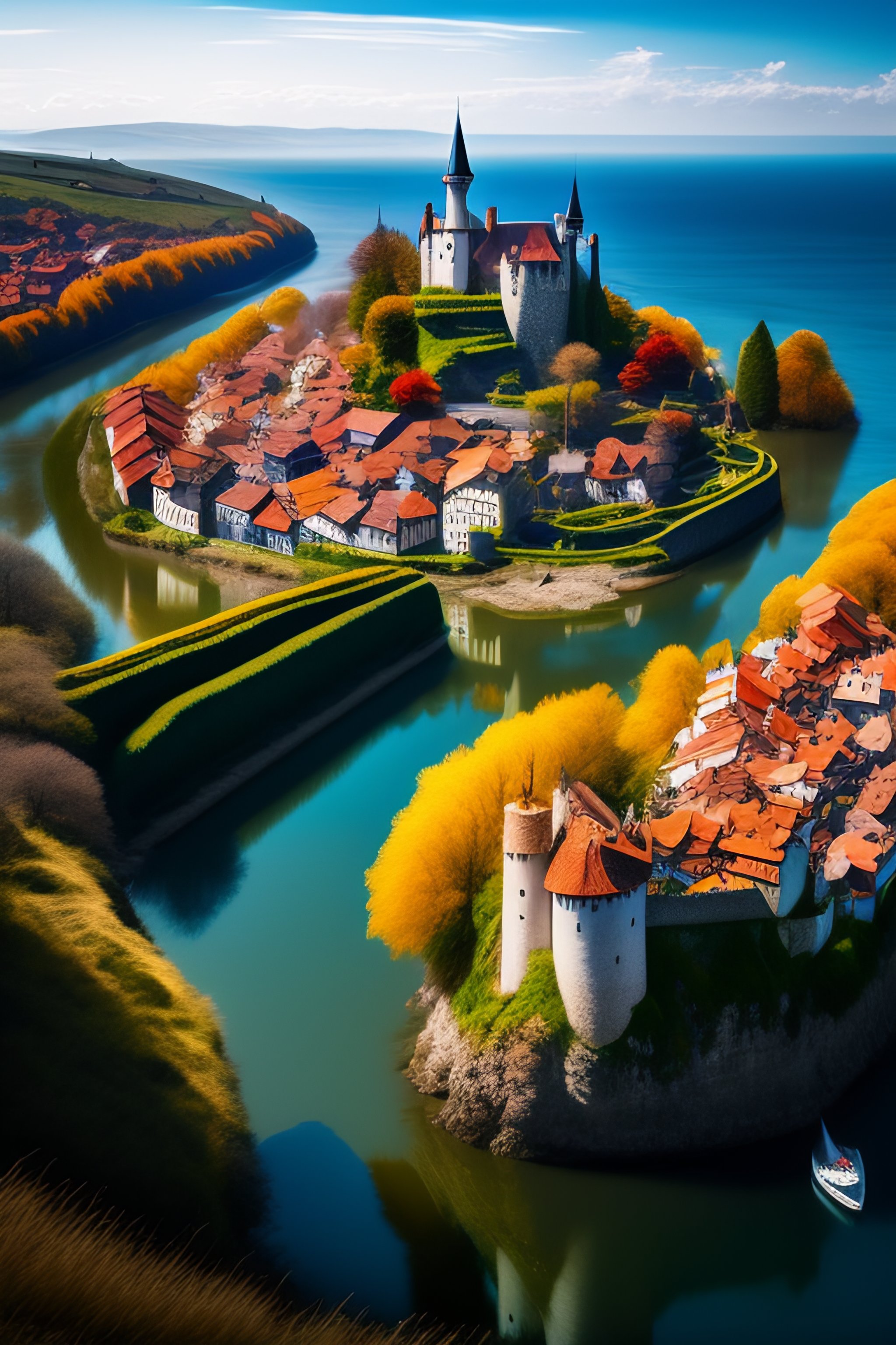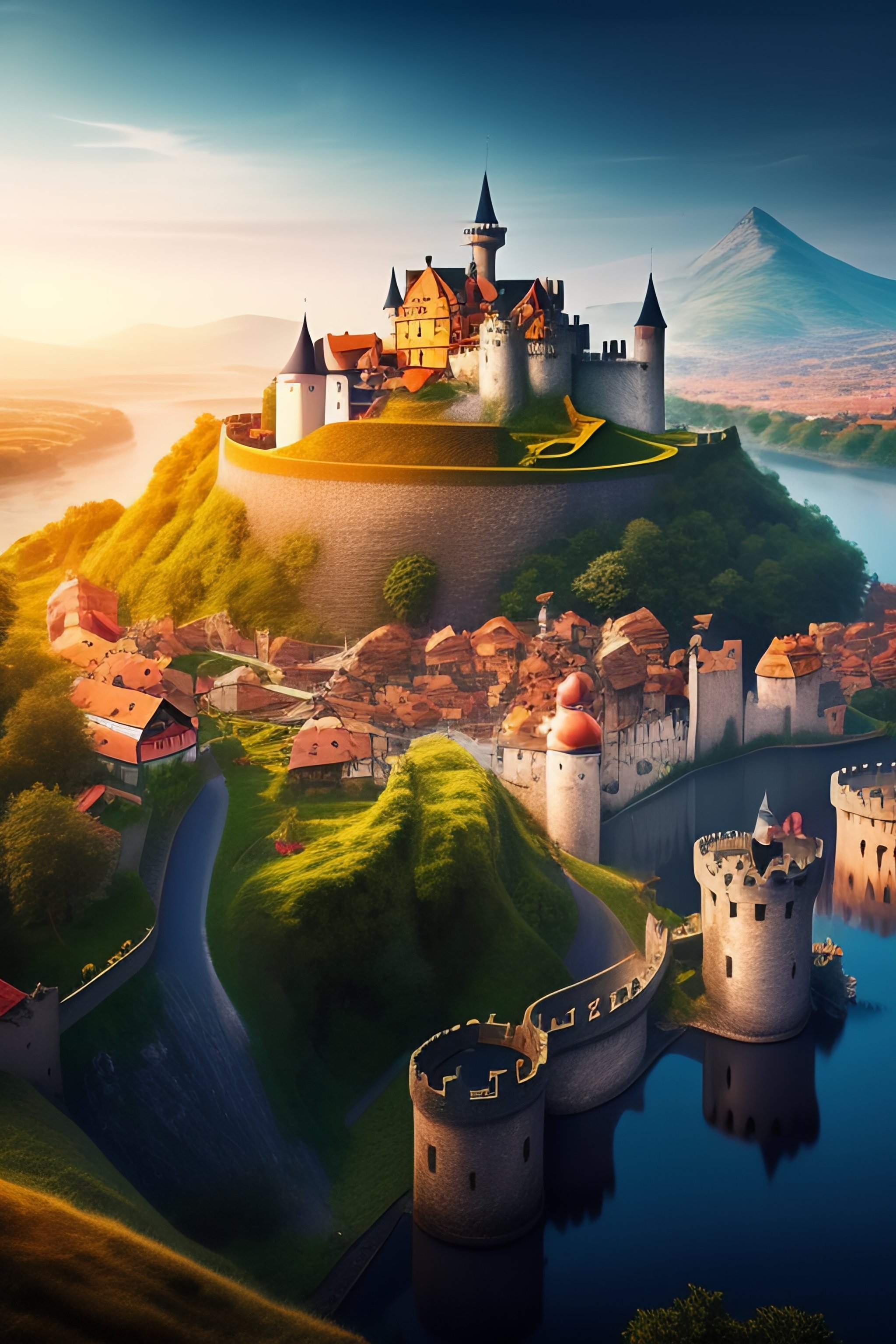 Fantasy walled medieval city on a hillside with winding main road and fortress on peak, bird's eye view, river bank, dense houses