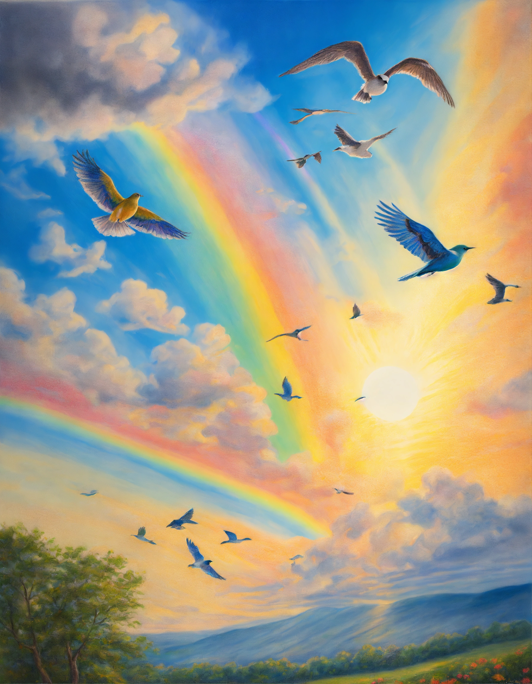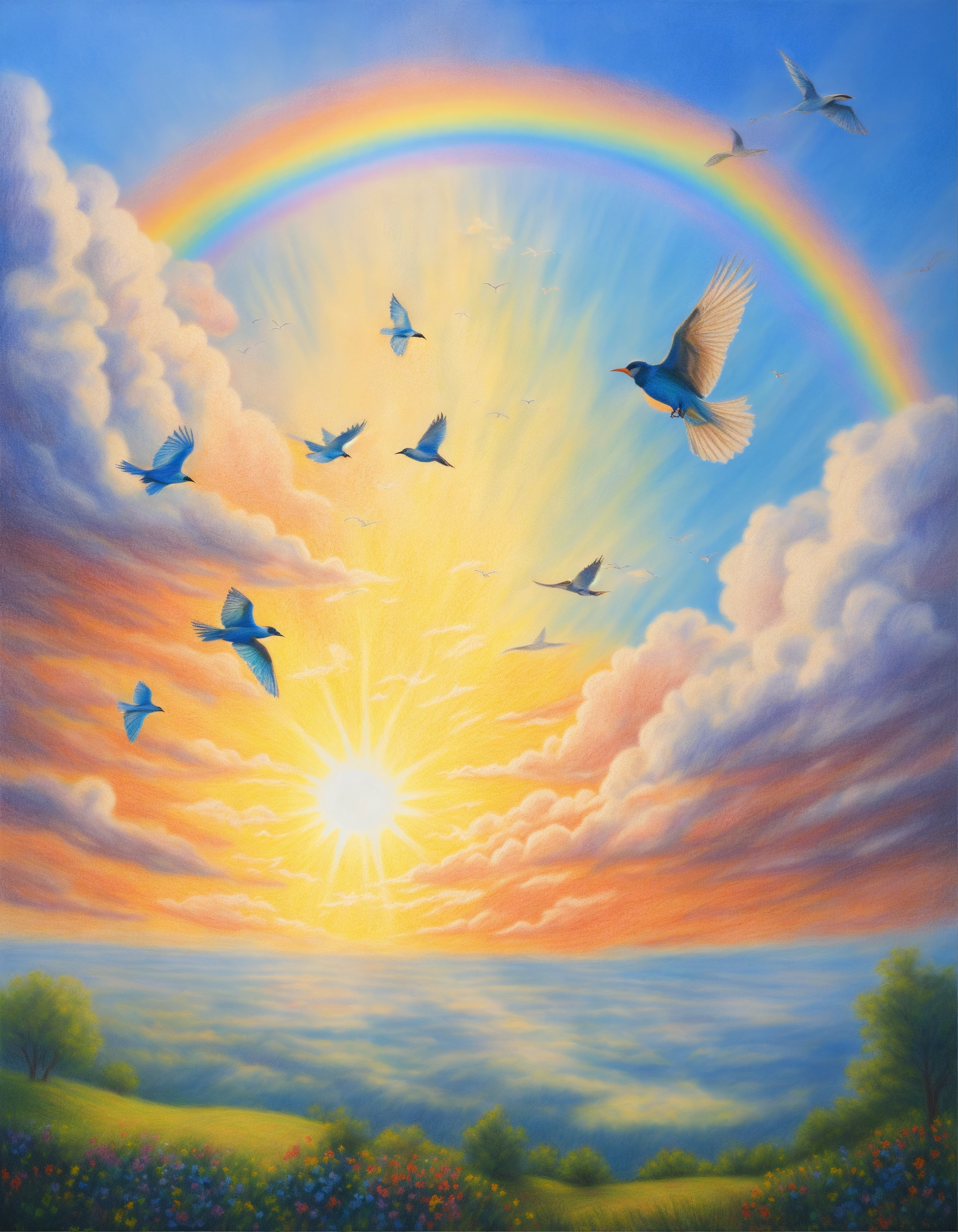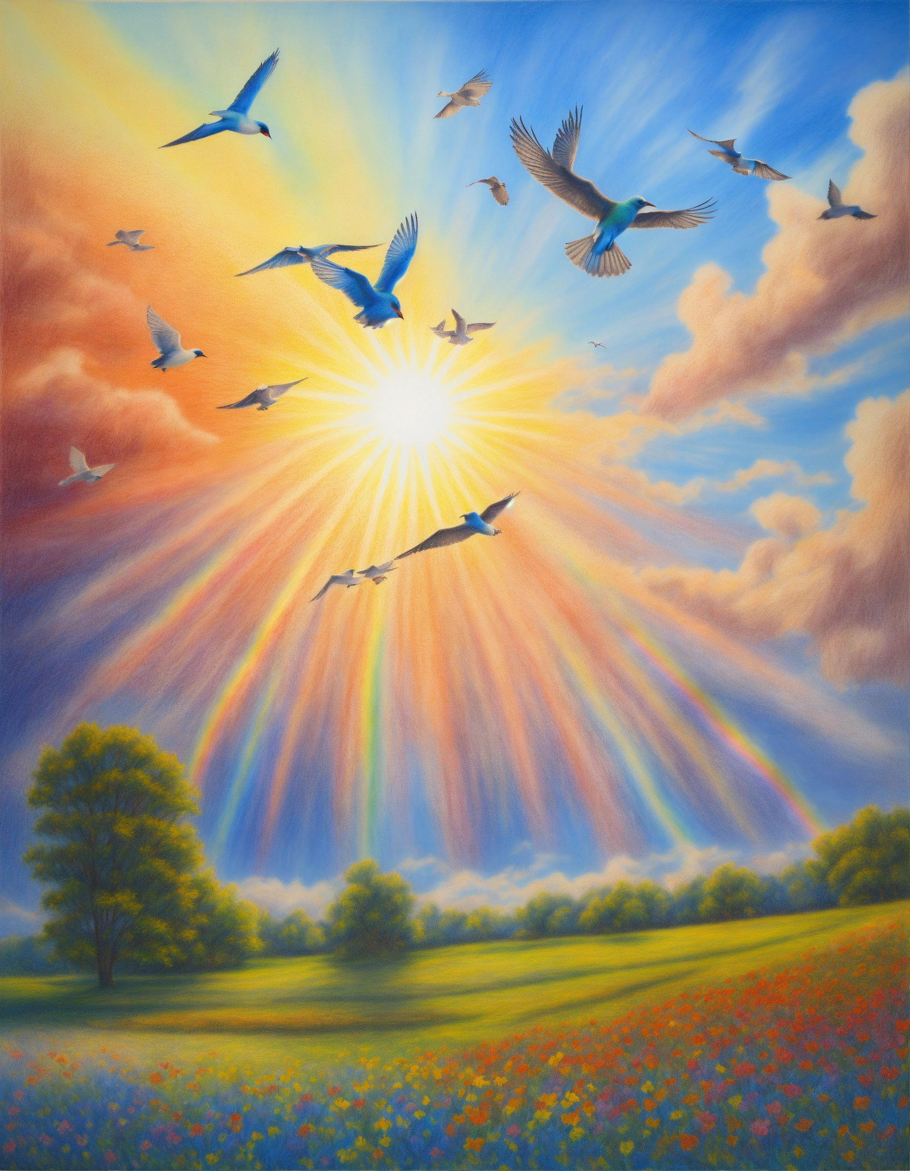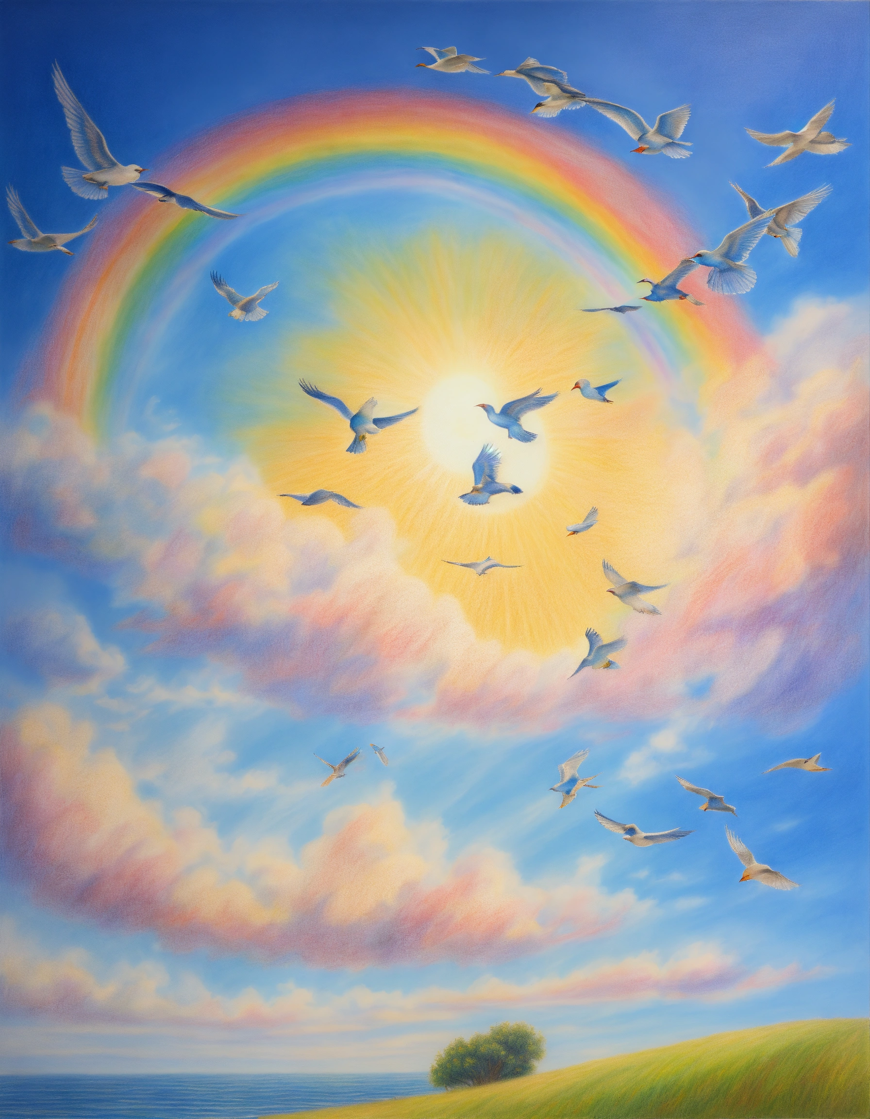 Realistic painted colored pencil drawing of a beautiful blue sky, with birds flying, a beautiful rainbow, bright sun. peace and light.