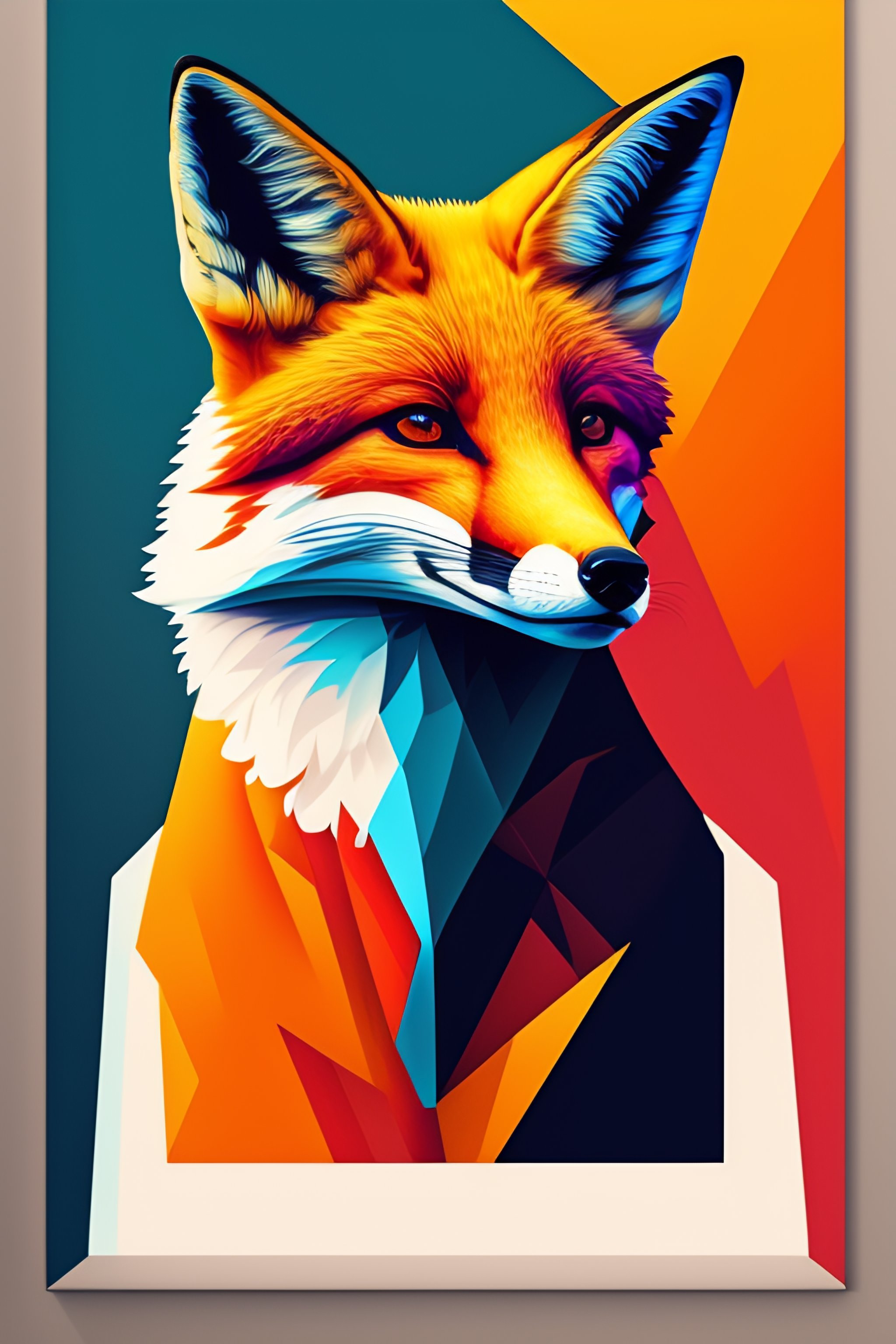 Portrait of a fox, splash colours, complementary colours, cubism, vector art, electric lighting, street level view, abstract expressionism