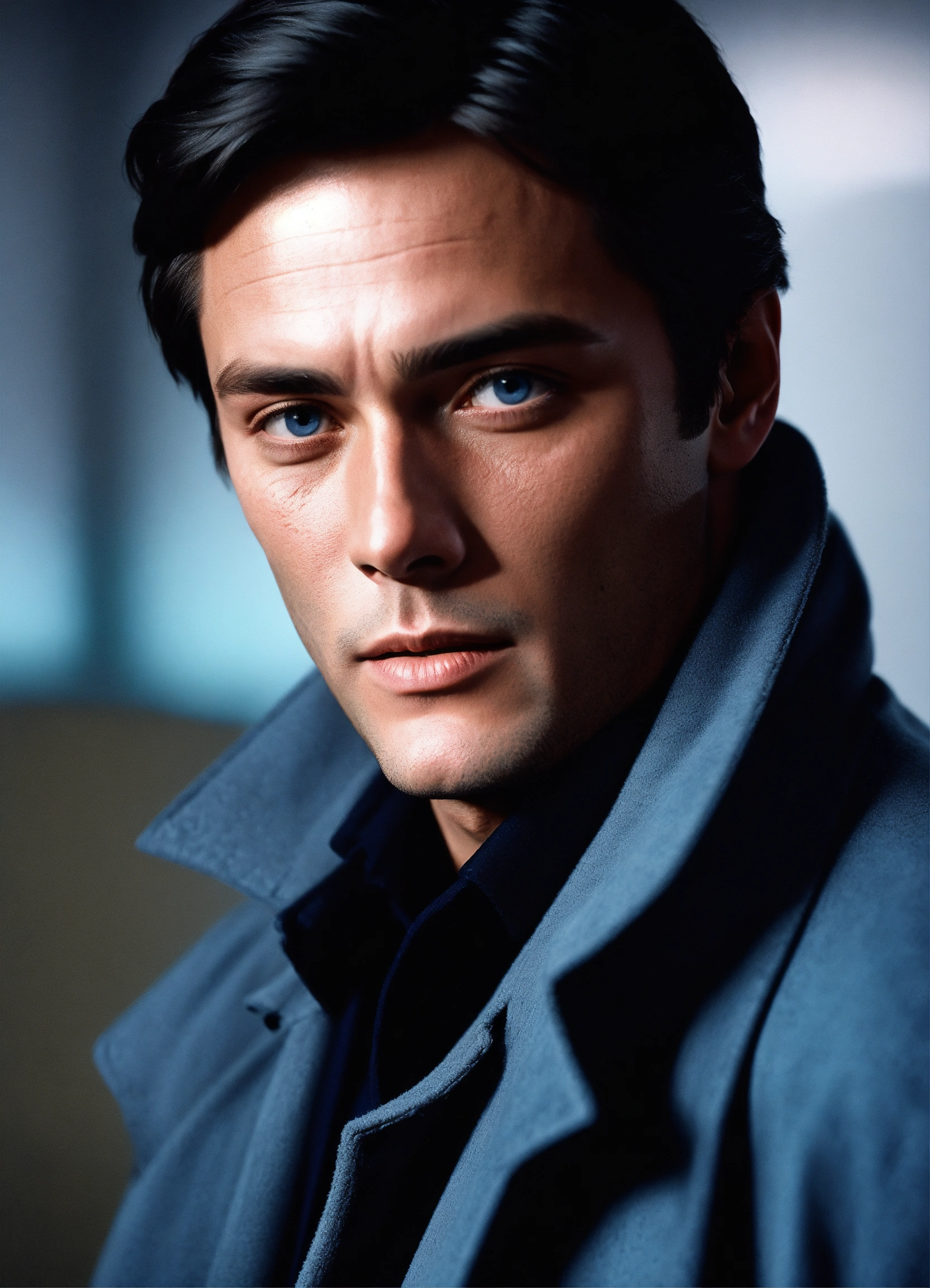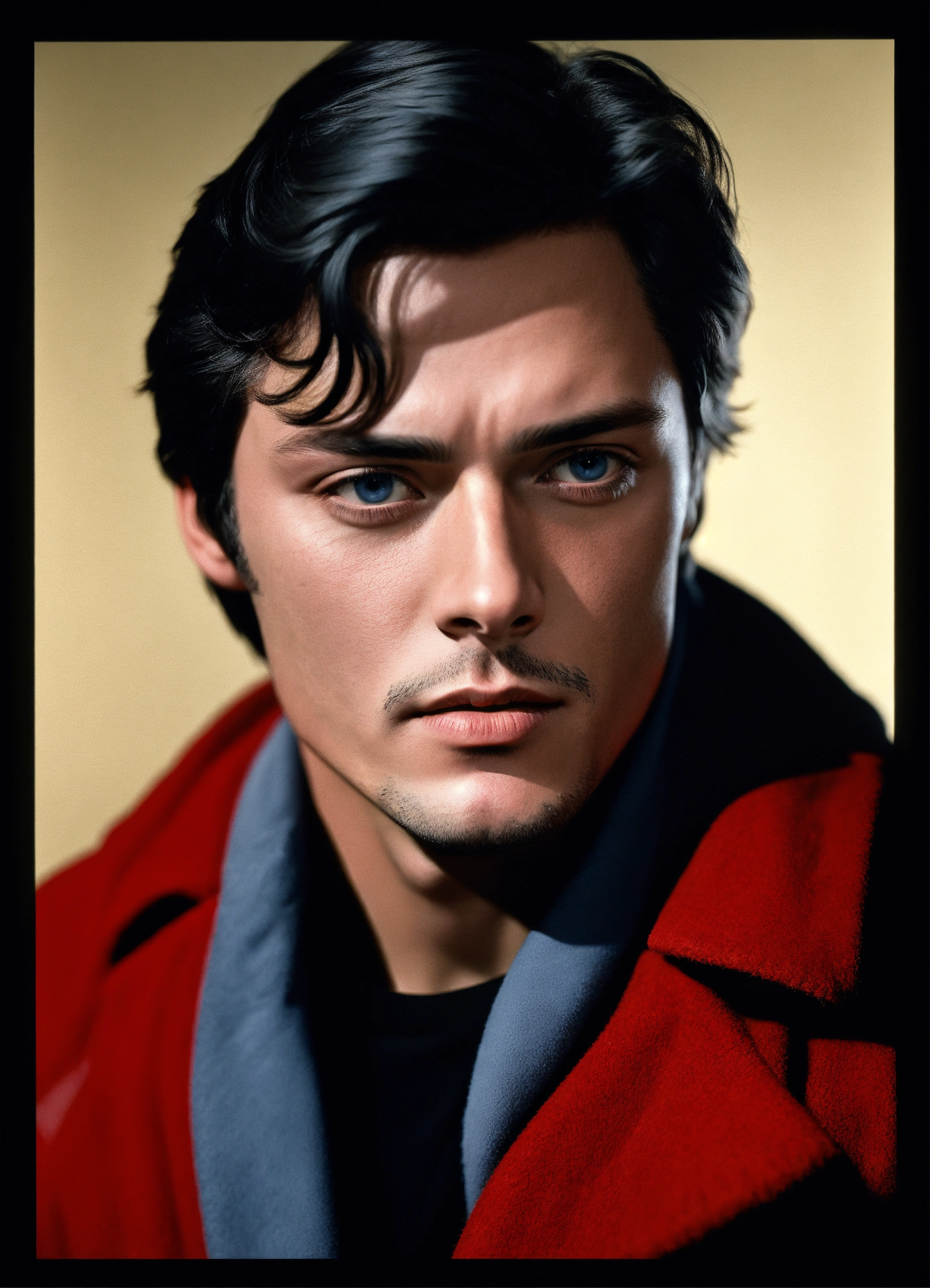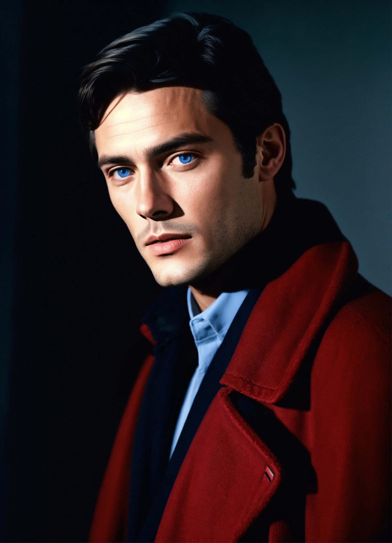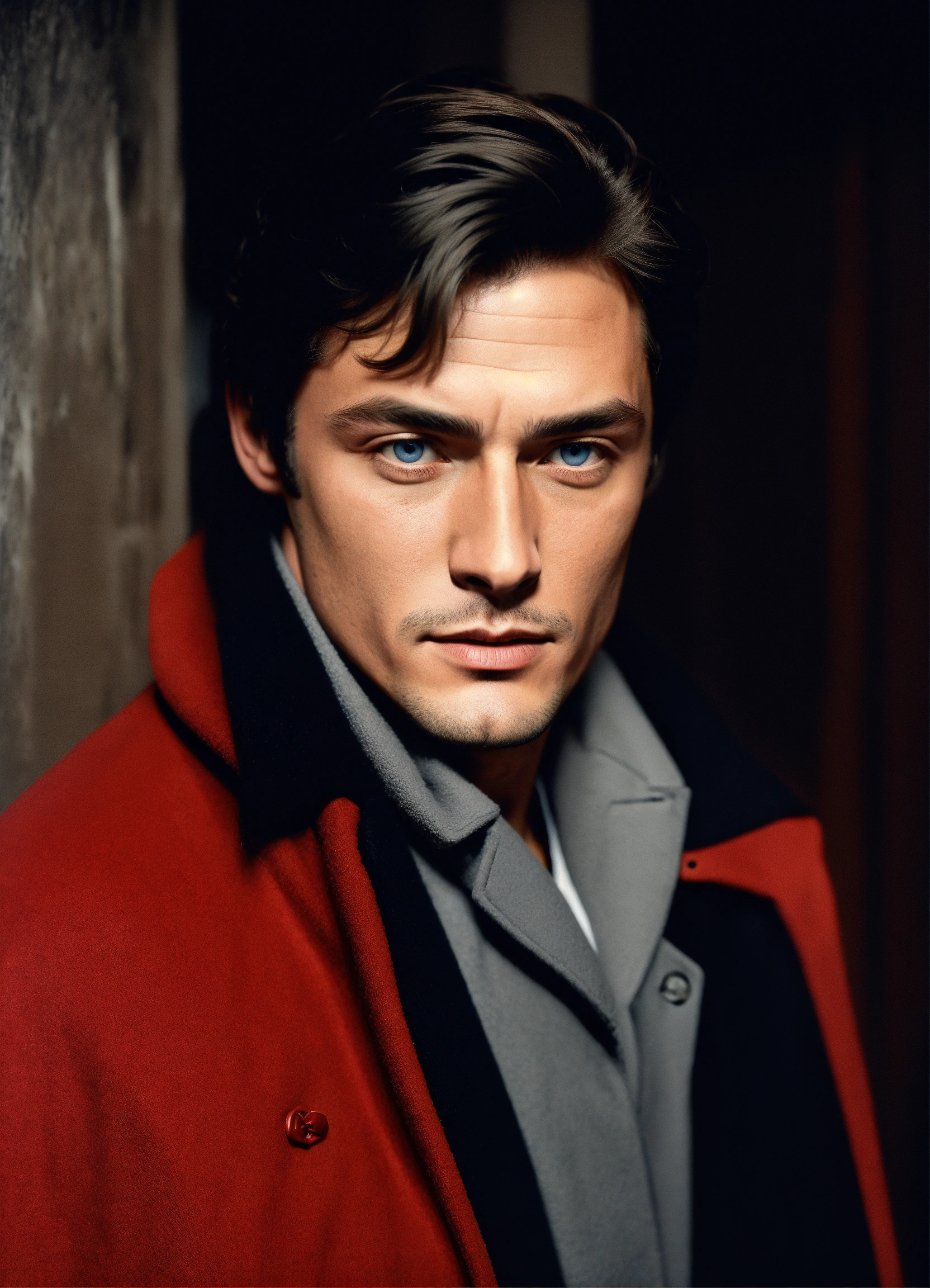Portrait of alain delon young, clean shaven, blue eyes, red clothing, grey coat, whit a black background, dark lighting, realistic, photo