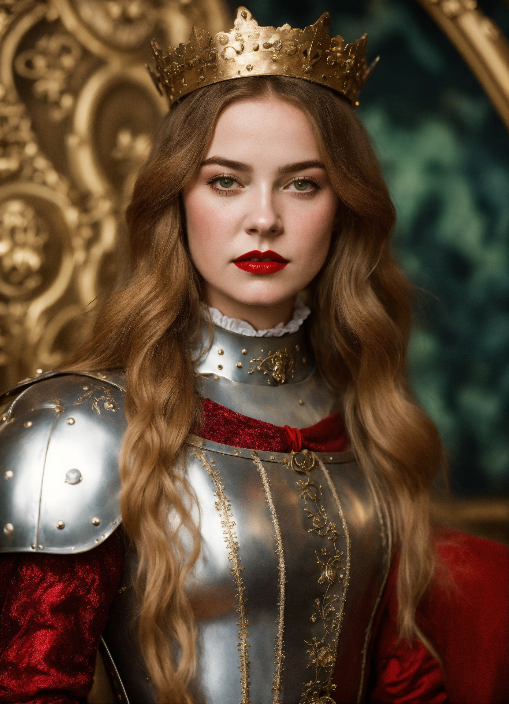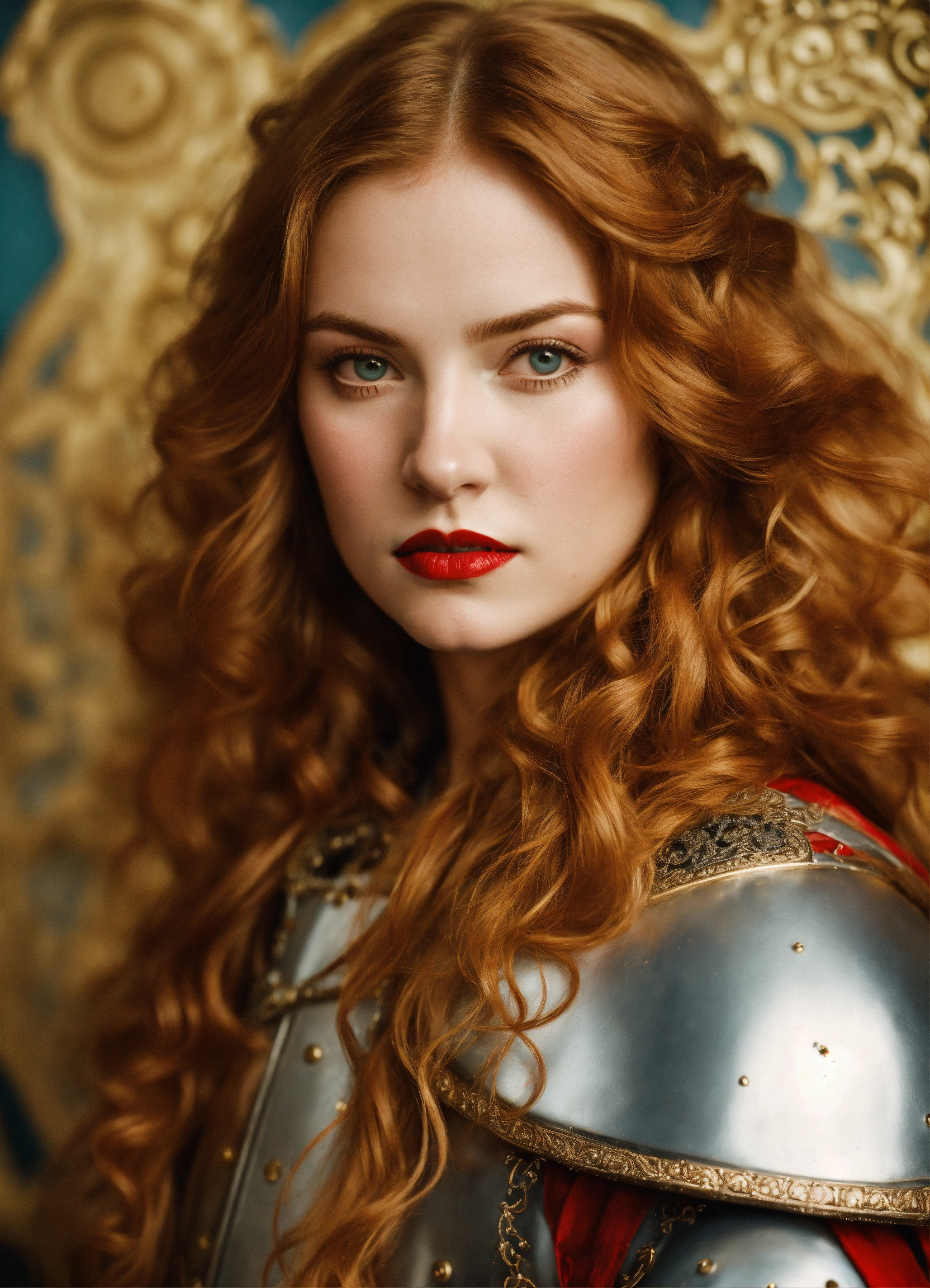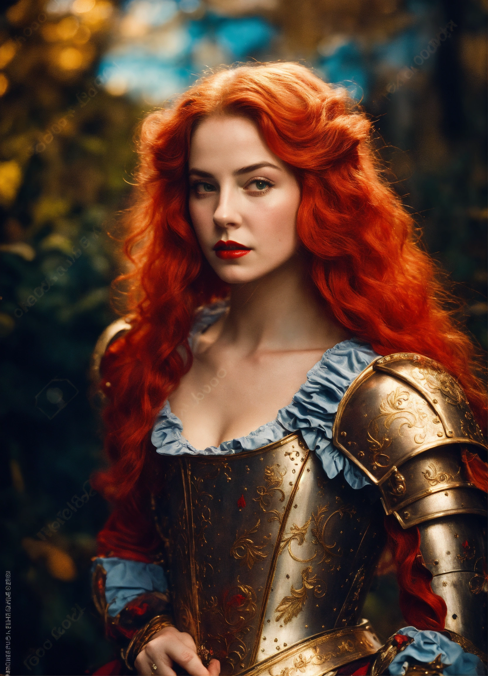 Photo quality portrait of alice in wonderland as a mediaeval knight in shining armor with flowing hair, red lips and a stern expression