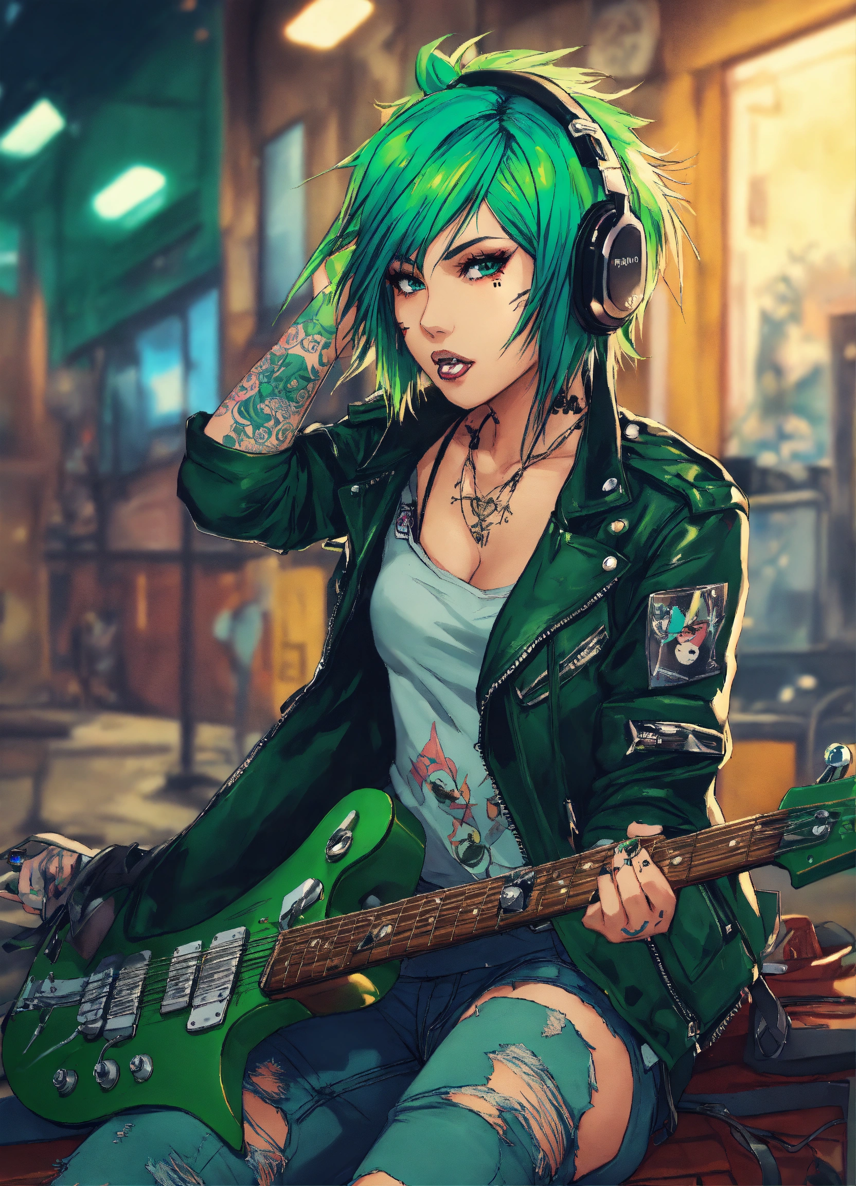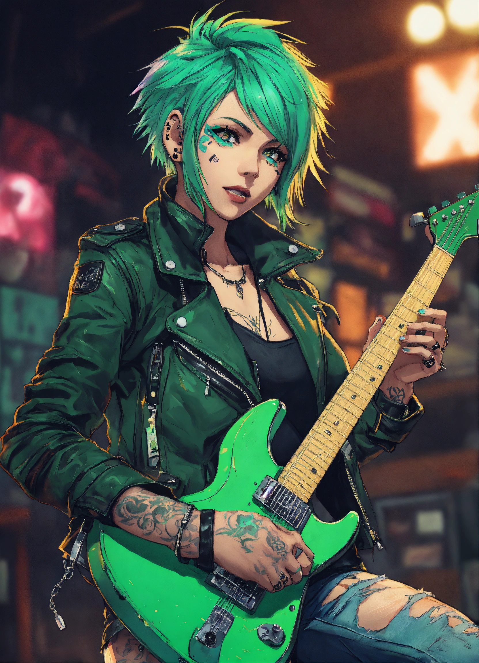 2d epic anime manga style, punk rock girl face tattoos, piercings, half-shaved green hair, leather jacket, ripped jeans, electric guitar, aqua tone