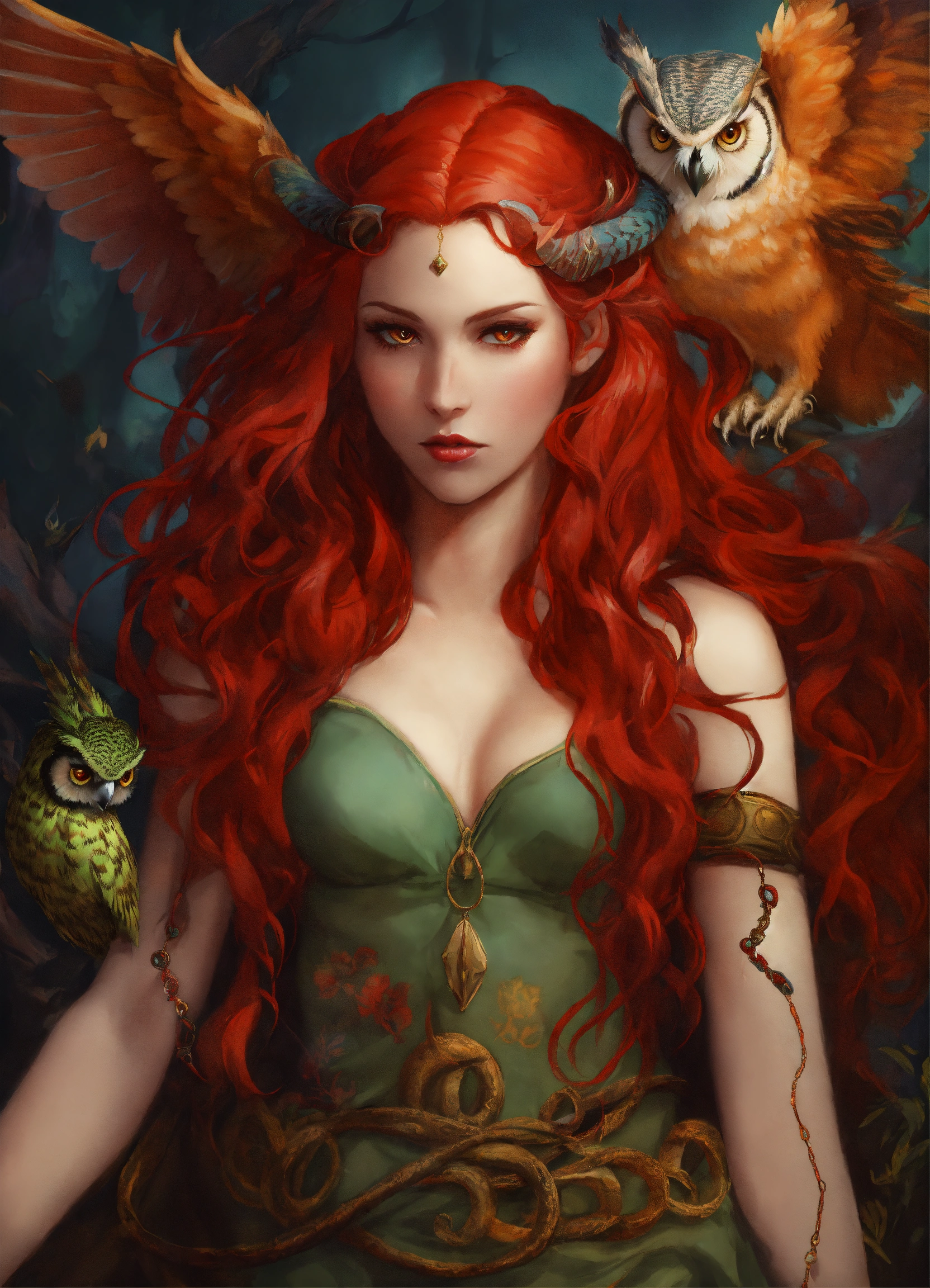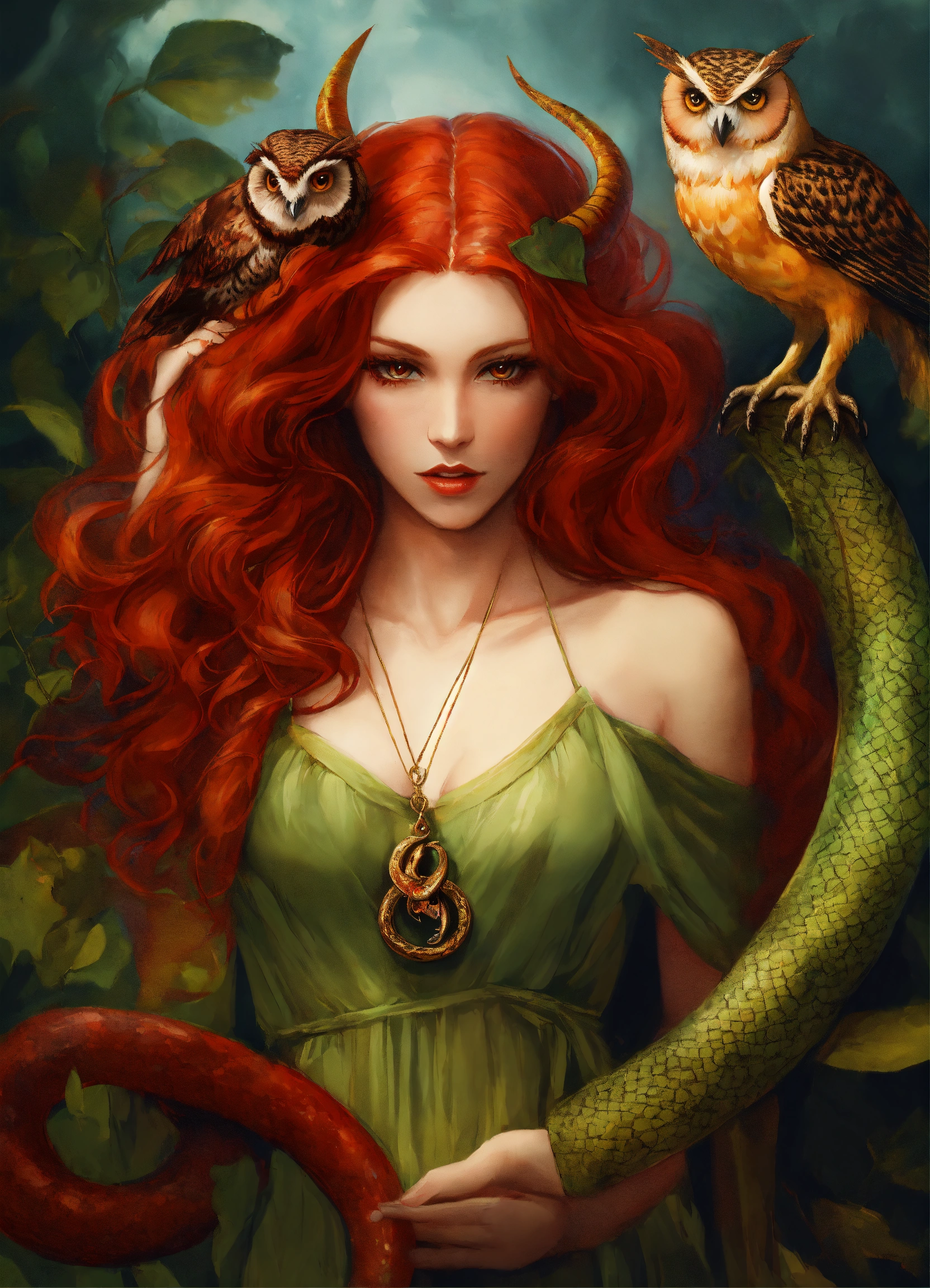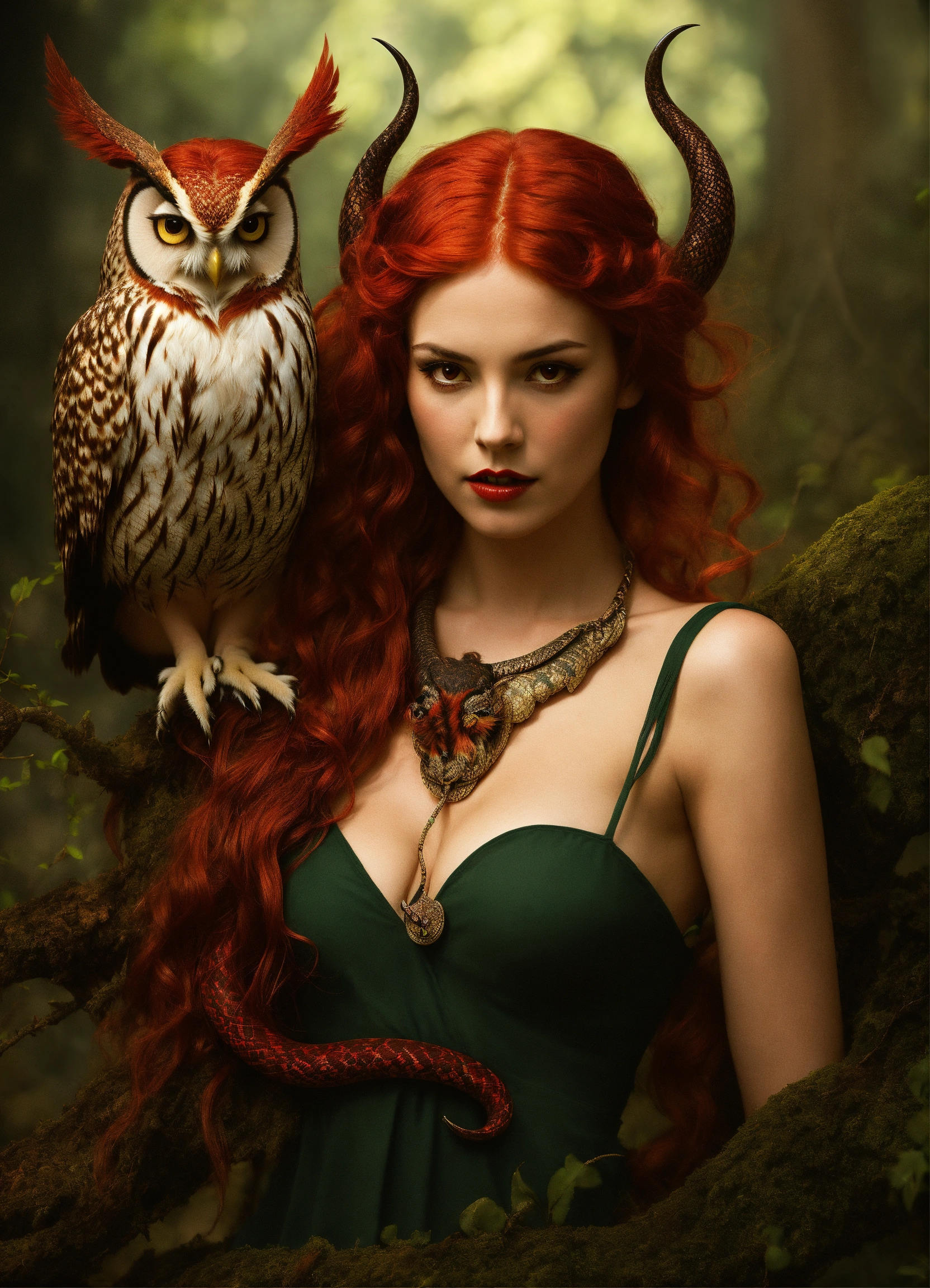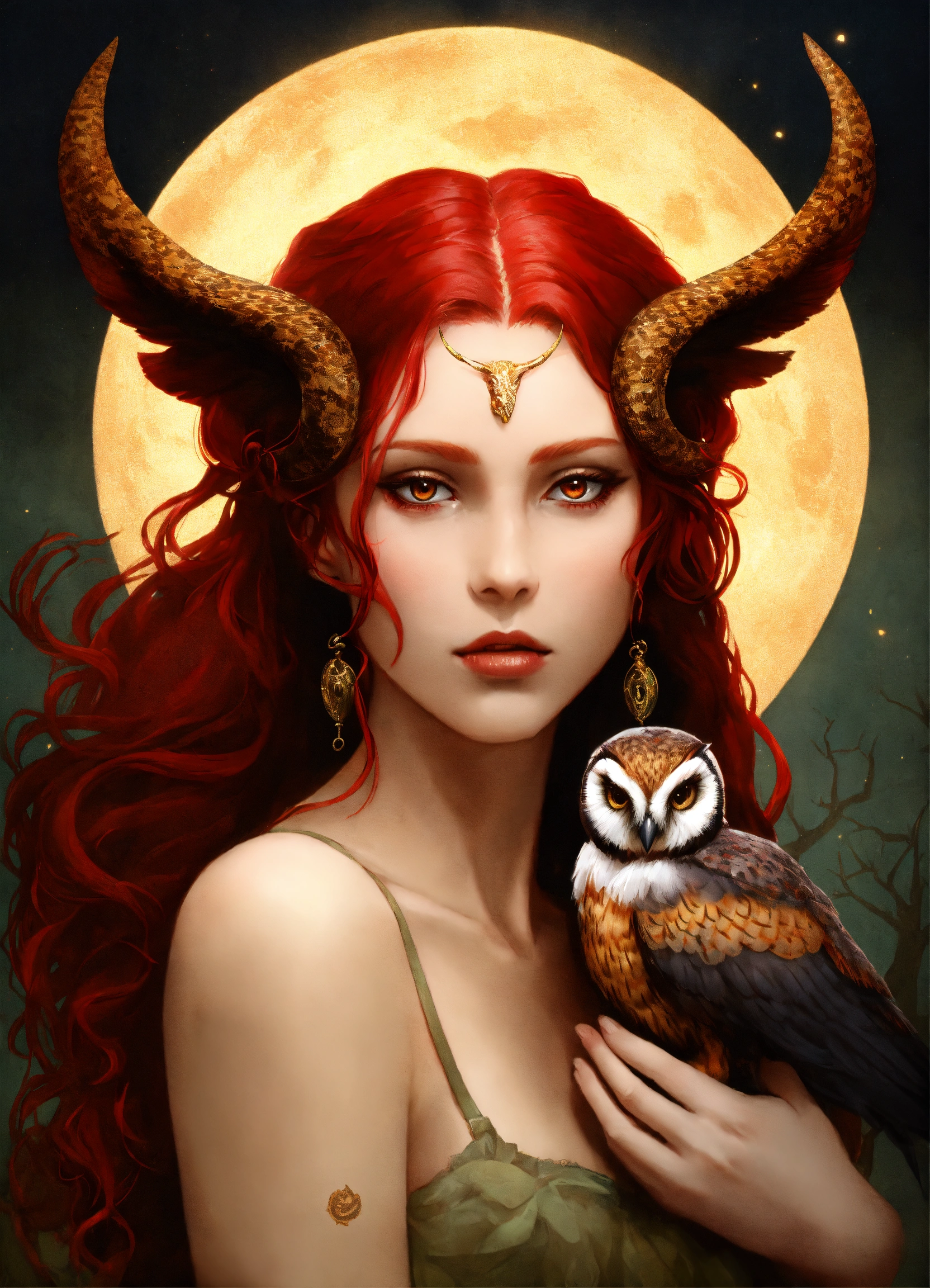 Lilith goddess with horns demon of seduction with red hair with an owl on her shoulder and a serpent