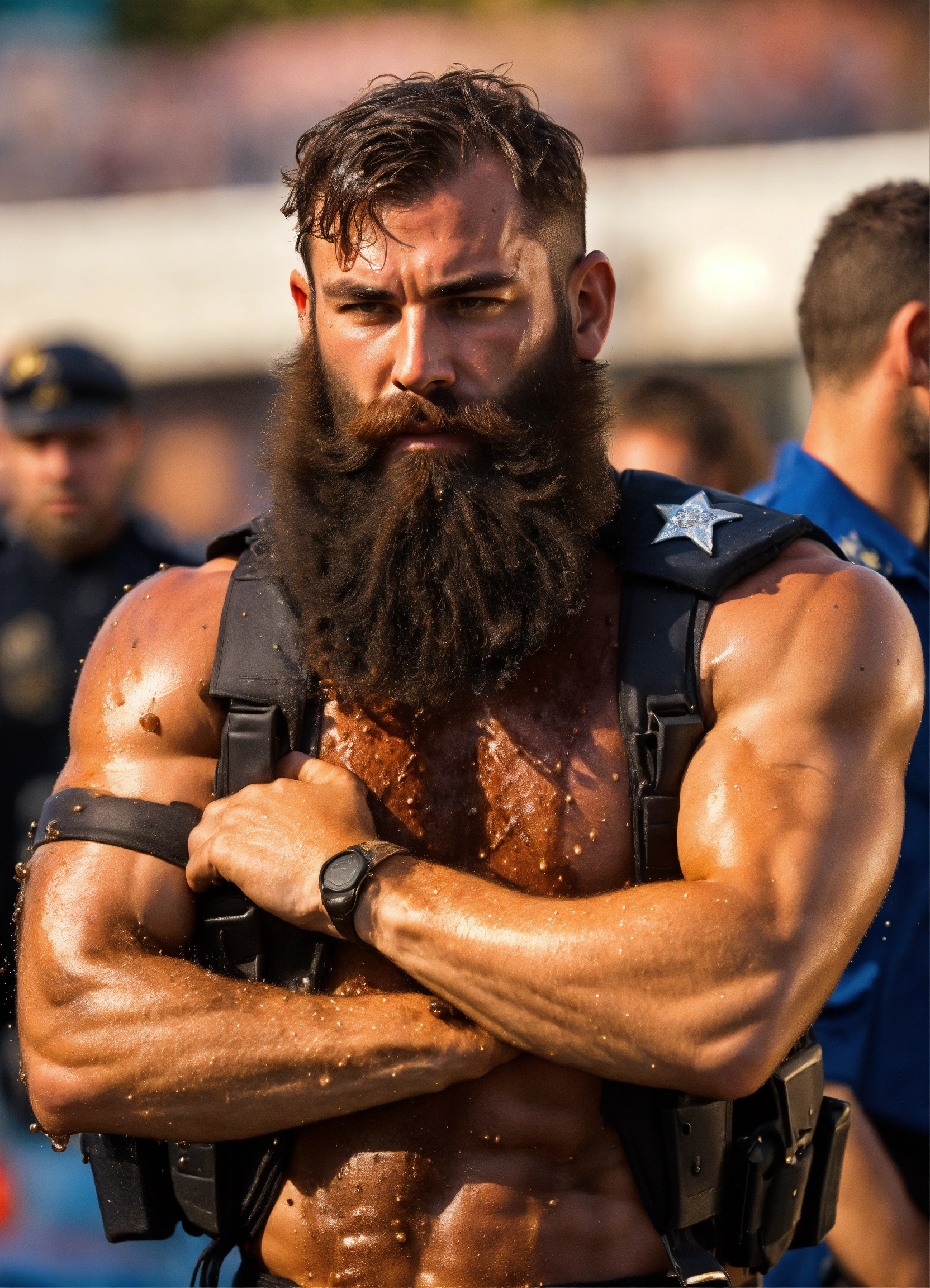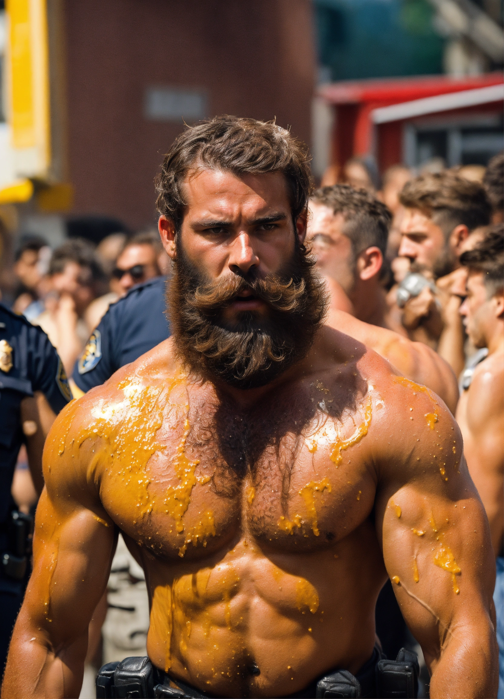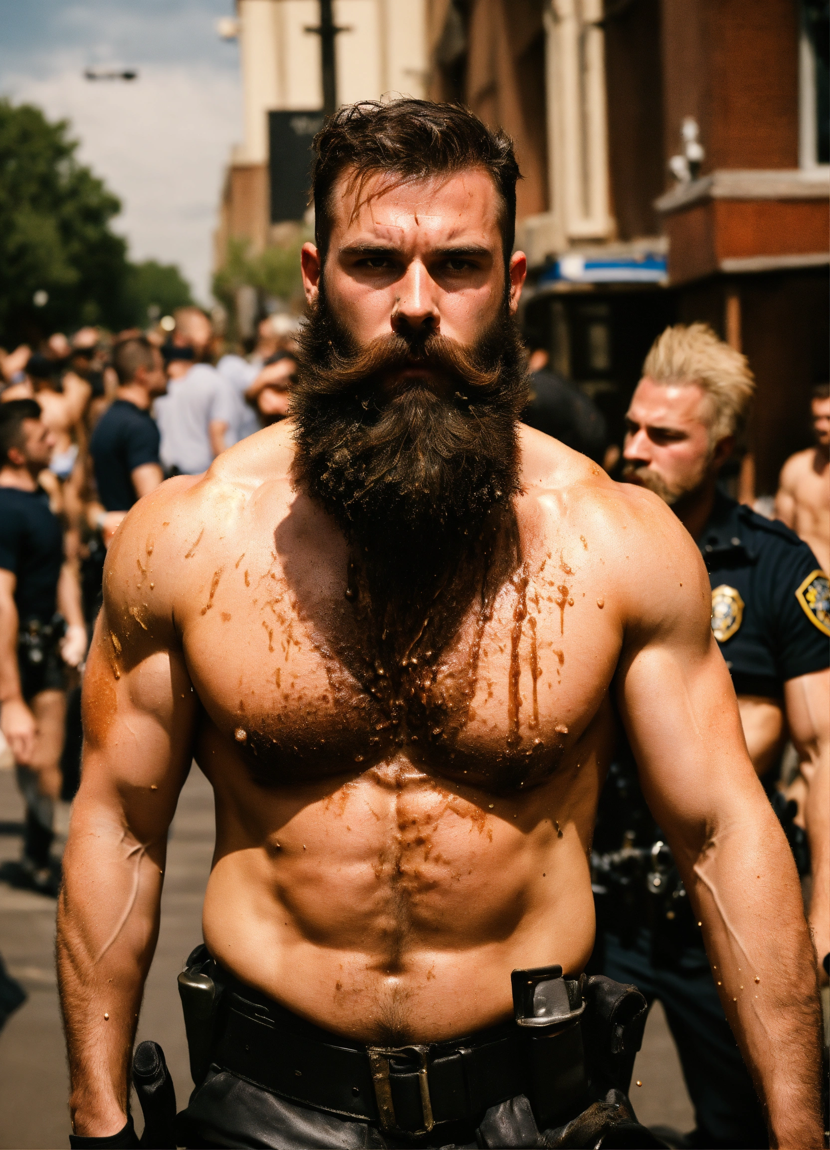 A handsome police officer covered in grease and sweat arresting a male streaker who has a long beard and muscles