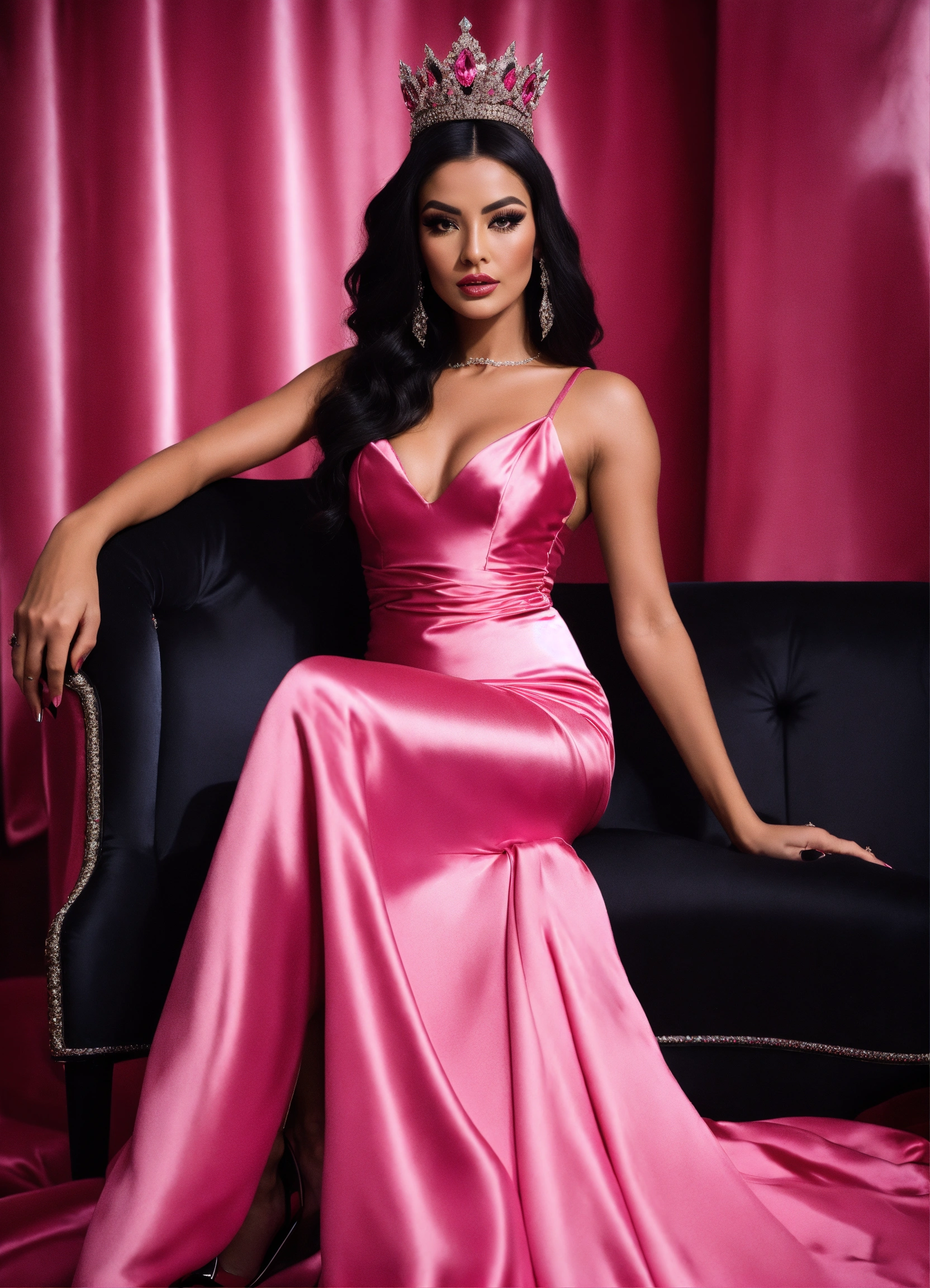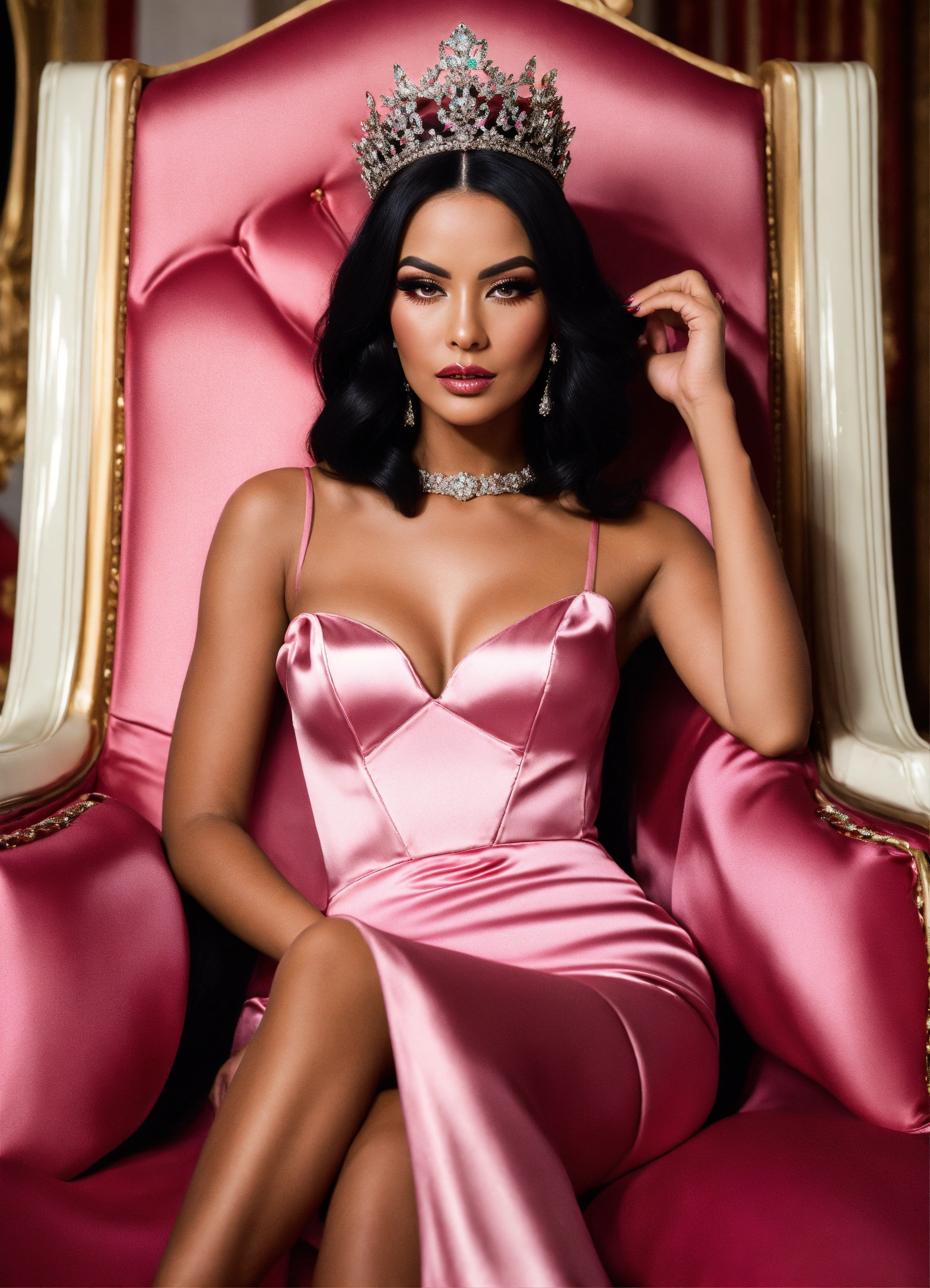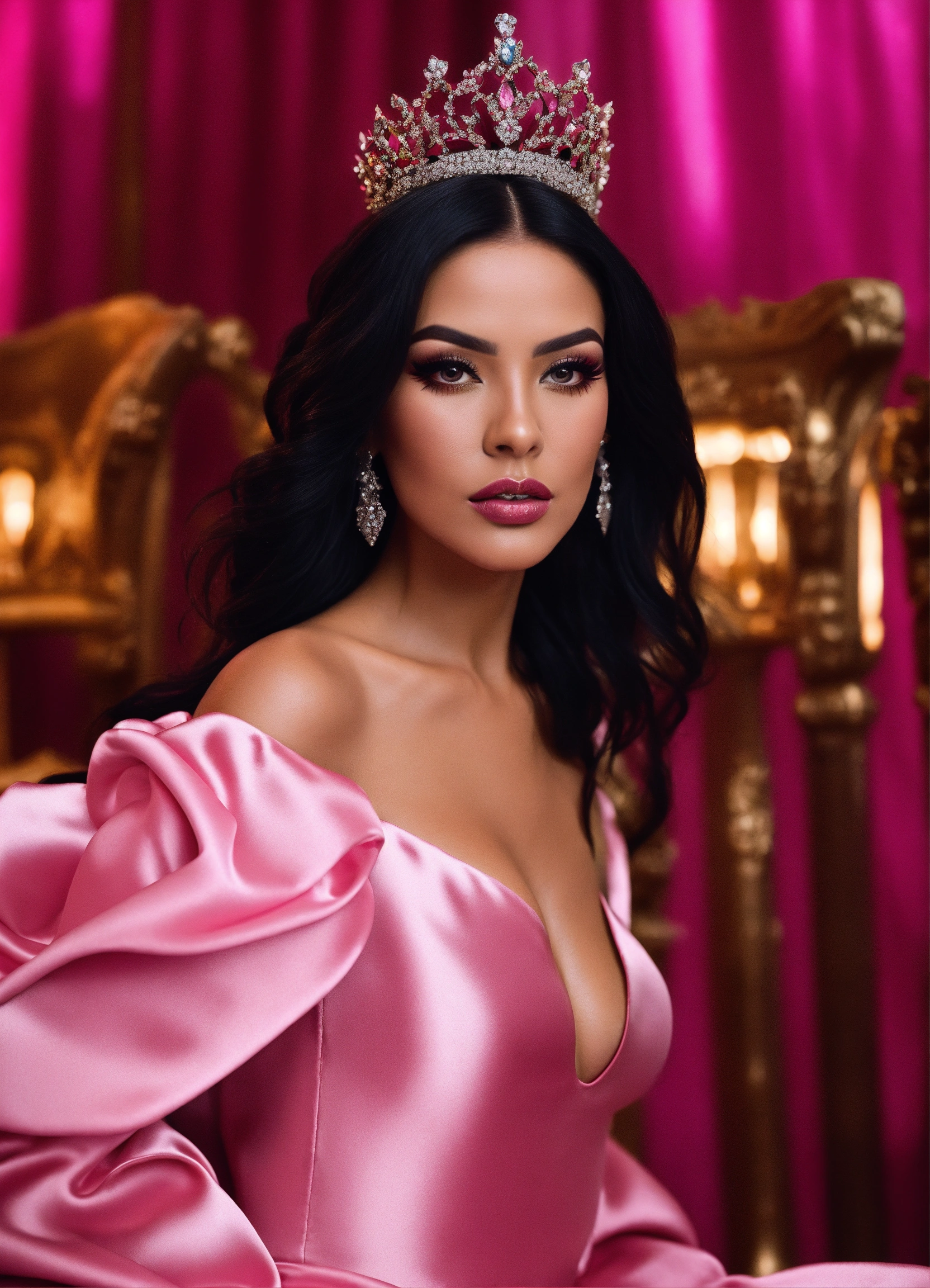 Low camera angle, beautiful olive skinned black haired woman in figure hugging shiny pink satin gown, wearing tiara, black patent louboutin stiletto heels, false lashes, contoured makeup, lip filler, being worshipped on throne. perfectly straight centre parted hair. haughty demeanour, staring down at camera.