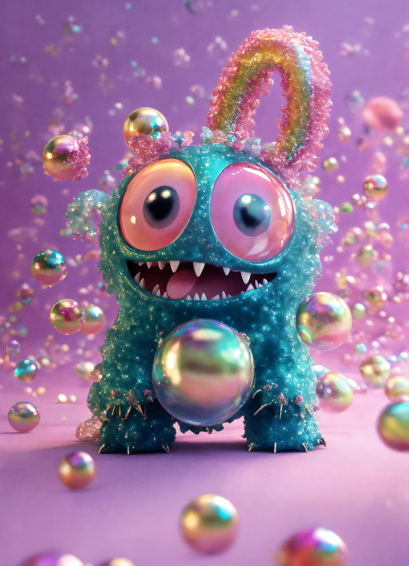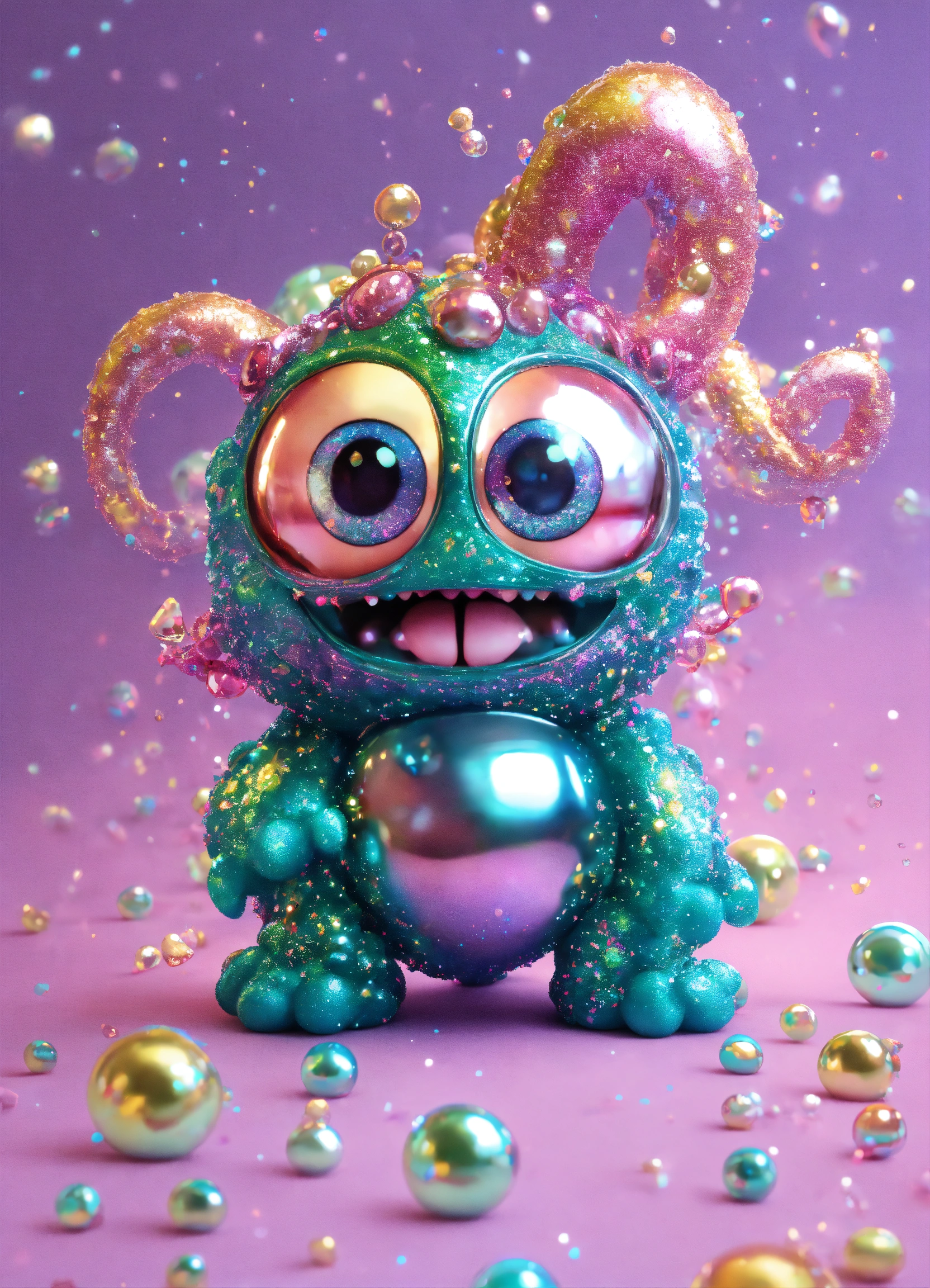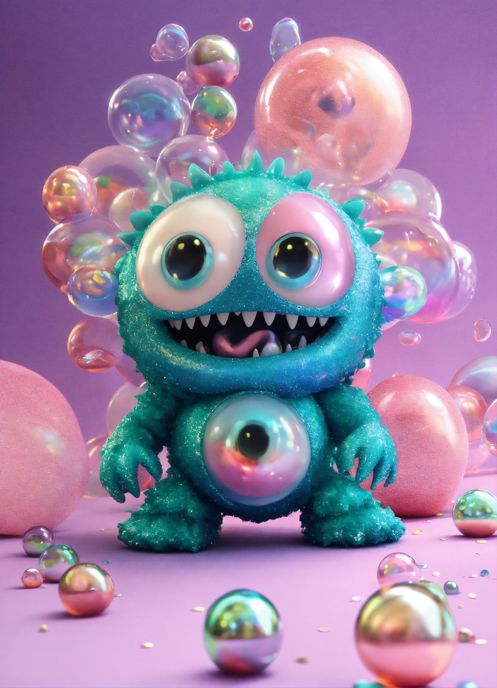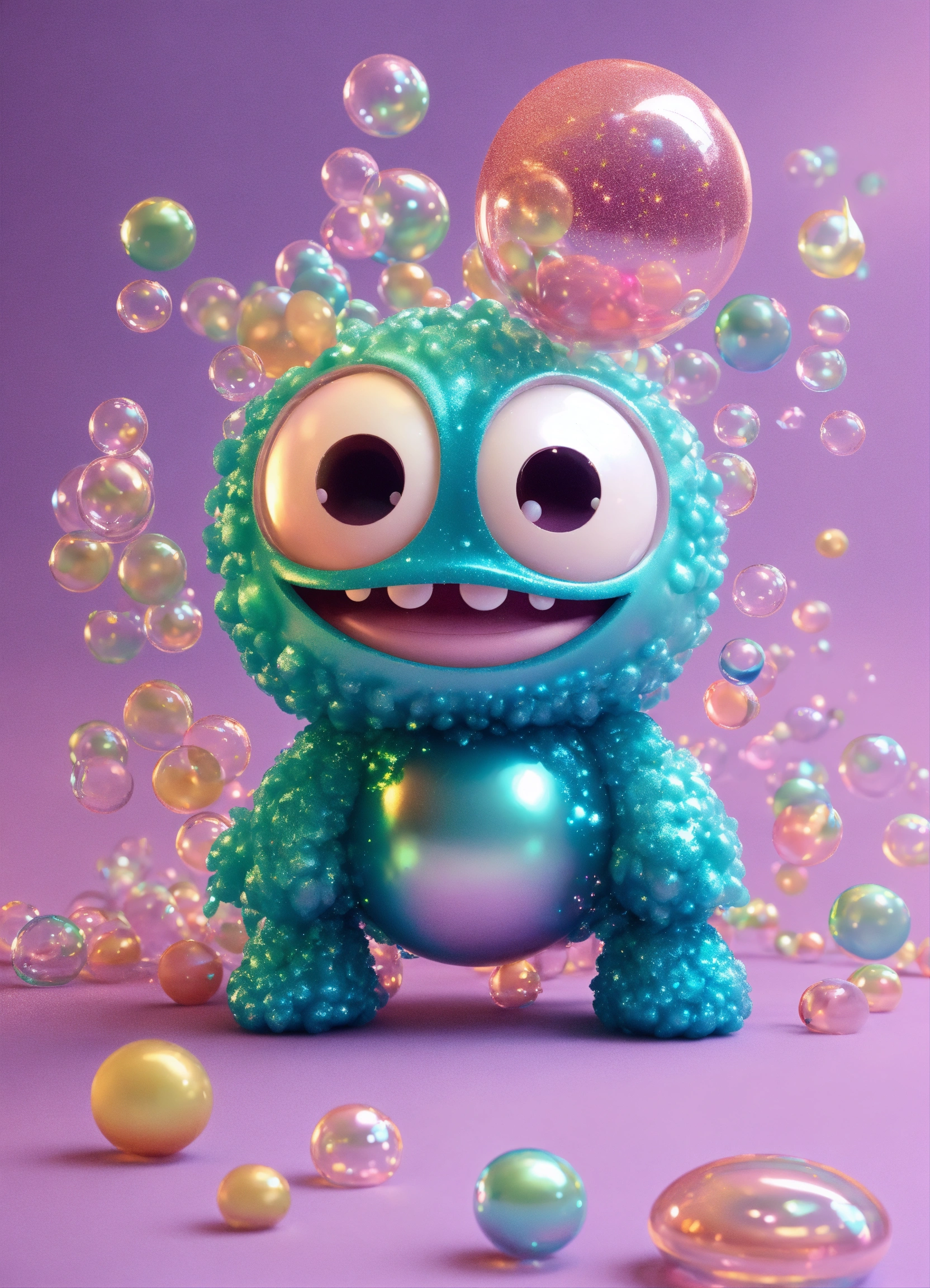 Cute 3d bubble monster, in pearly iridescent glittery colour, two arms, adorable, childlike, smooth shiny texture, happy, hyperrealistic, high-resolution