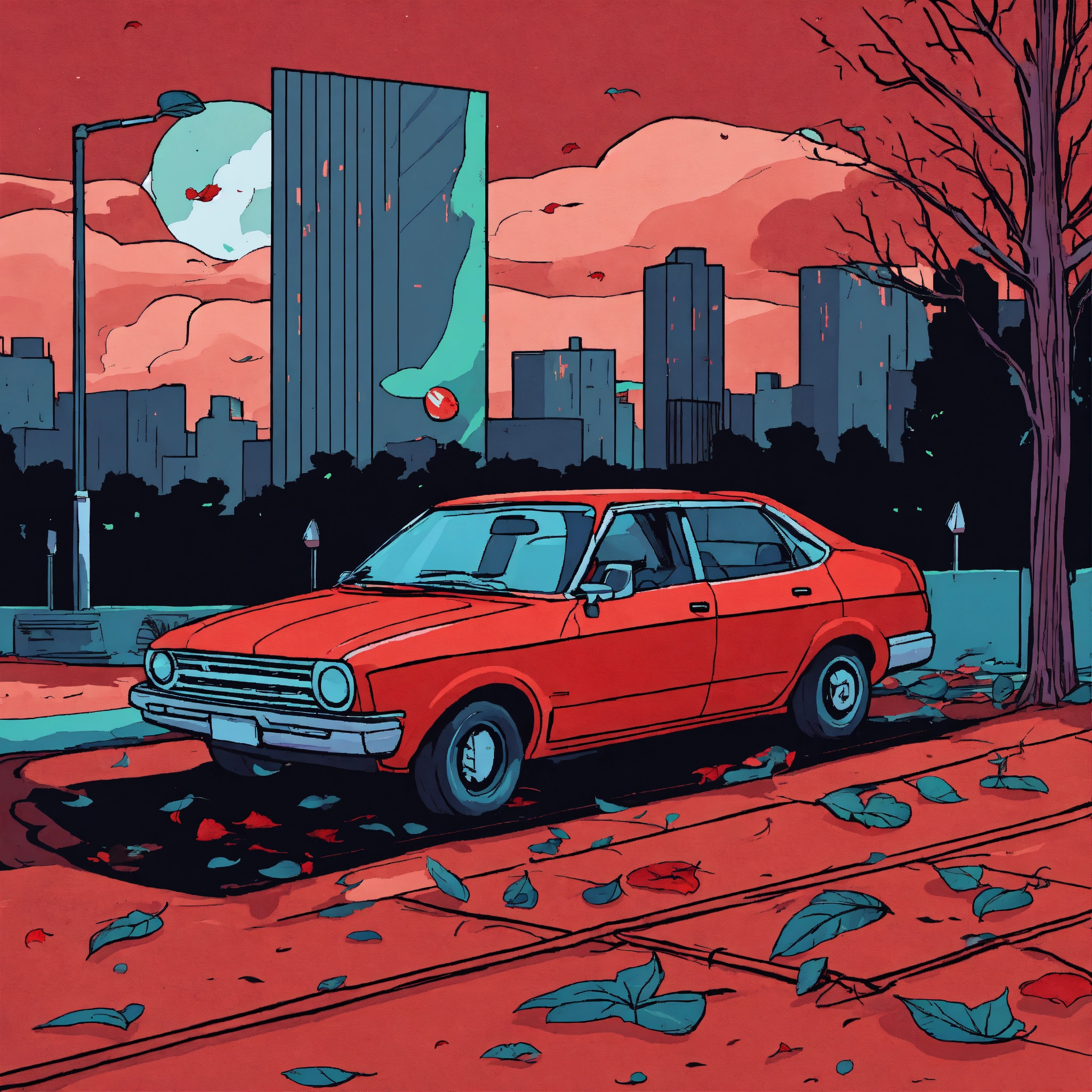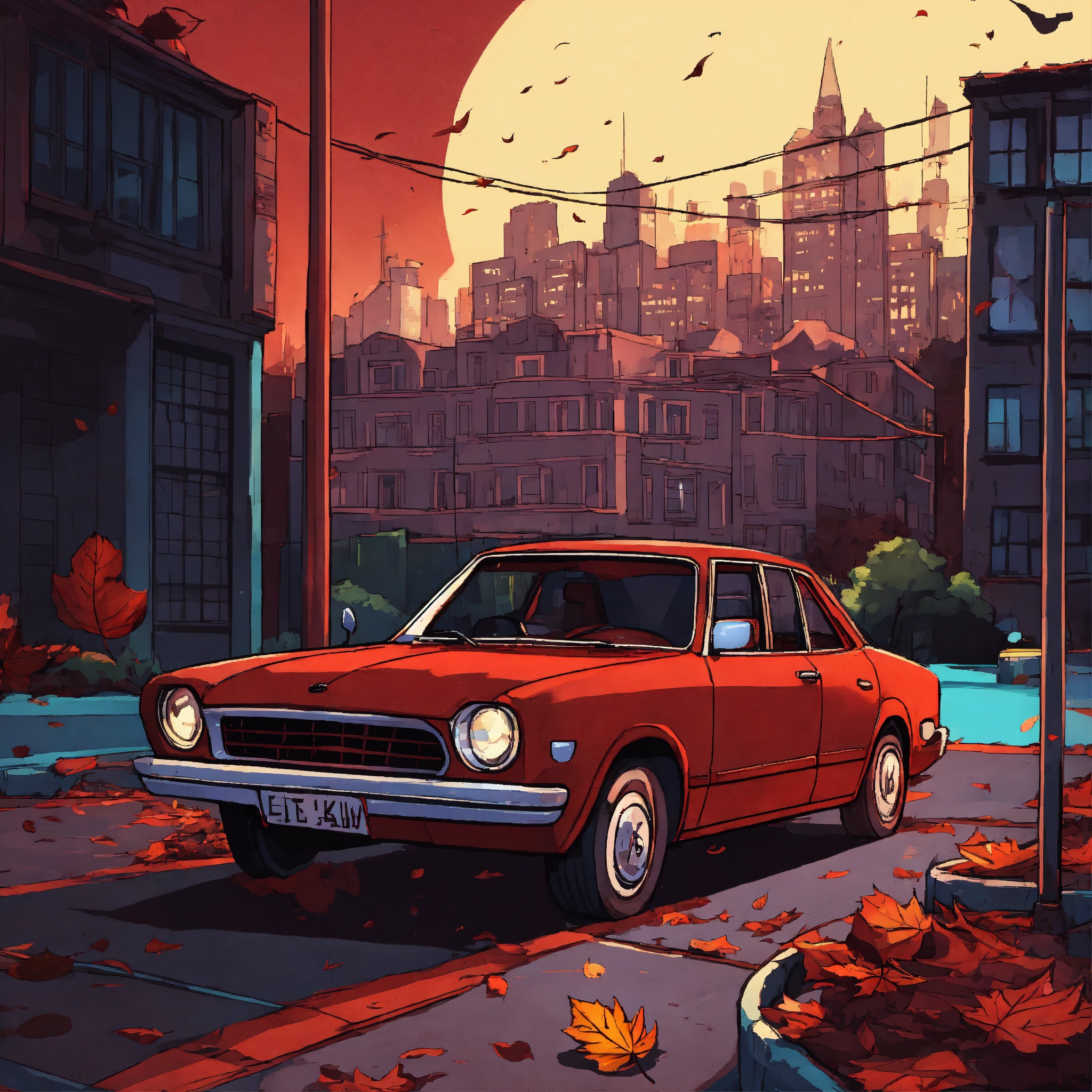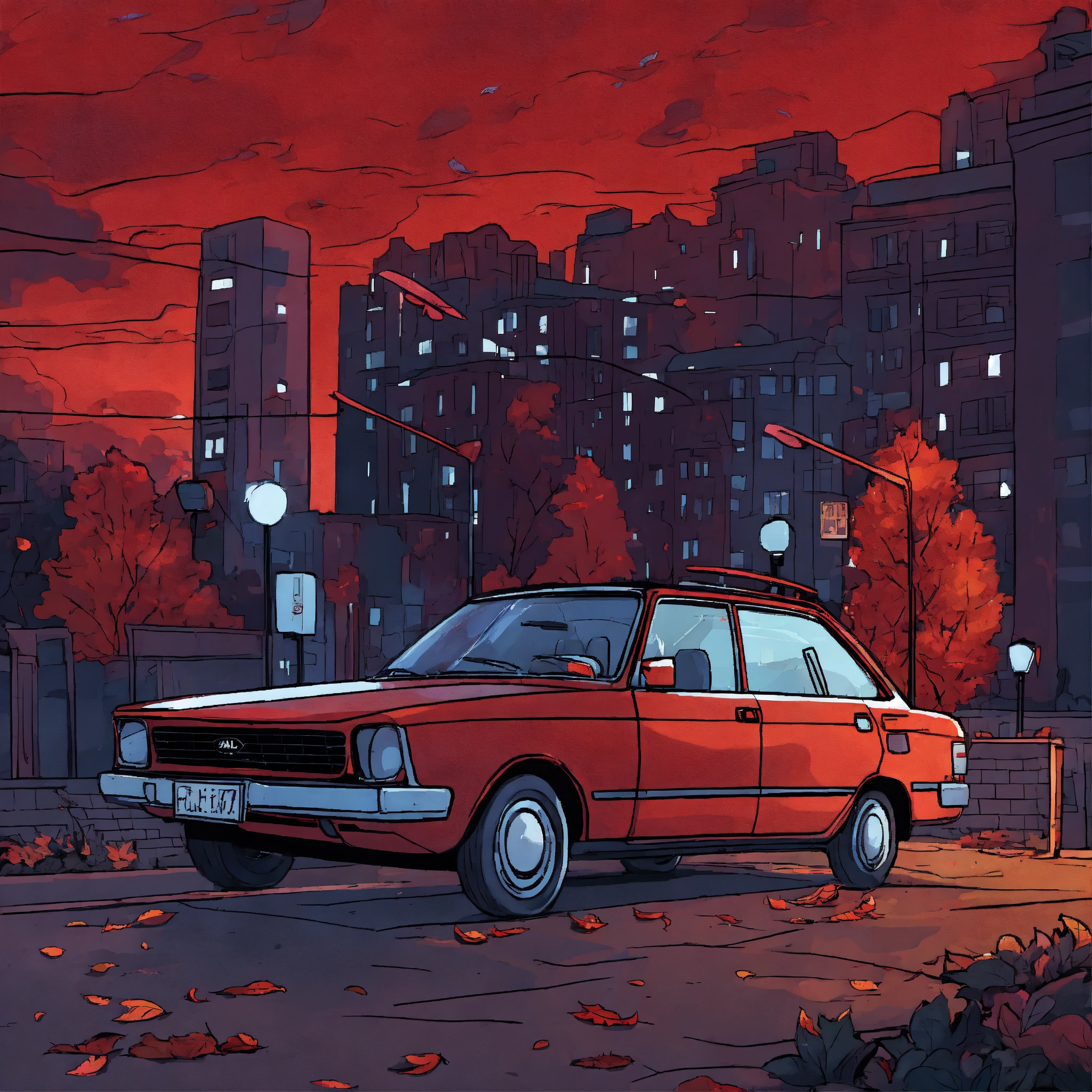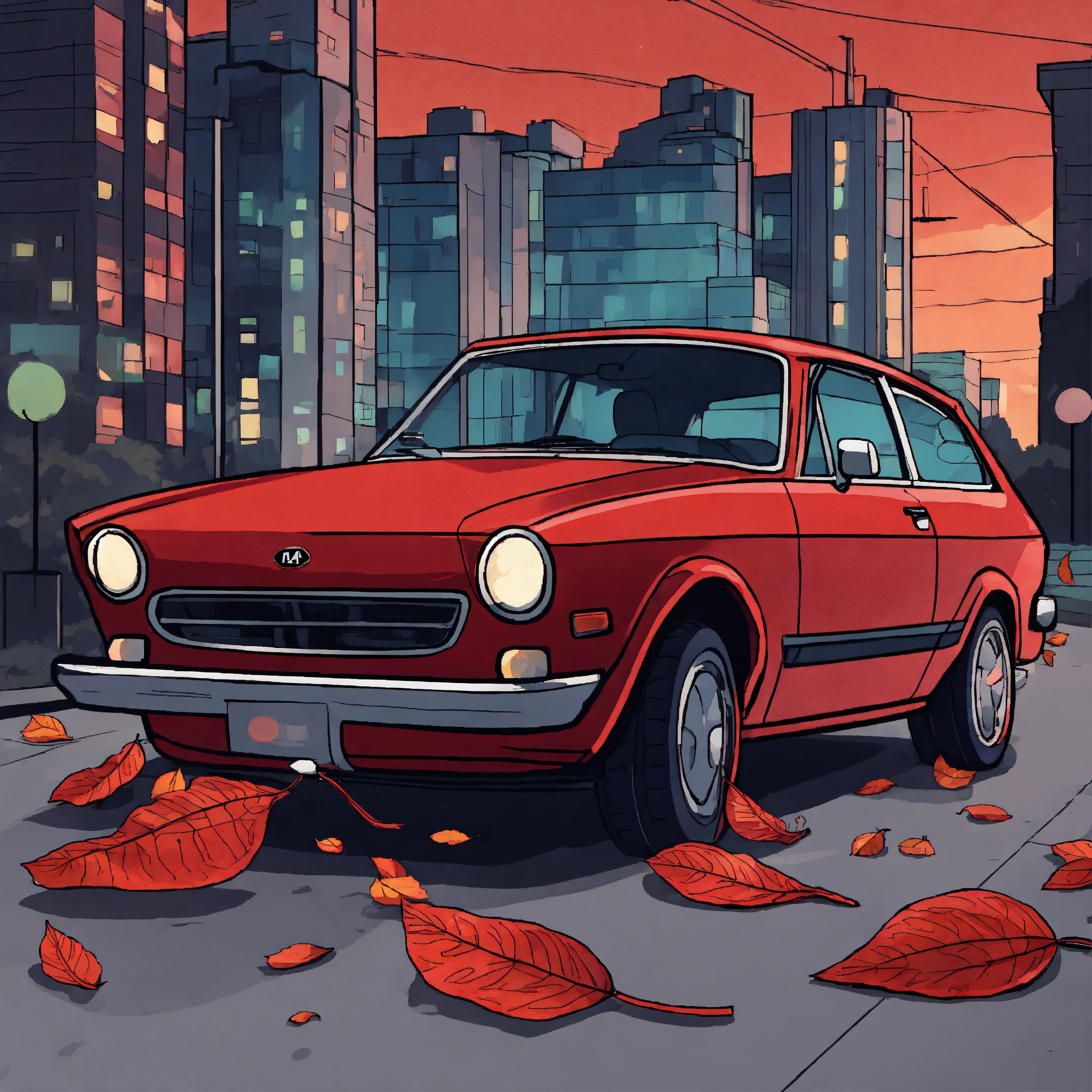 Dead leaf on a park red kia hood in city in the nightin cartoon style