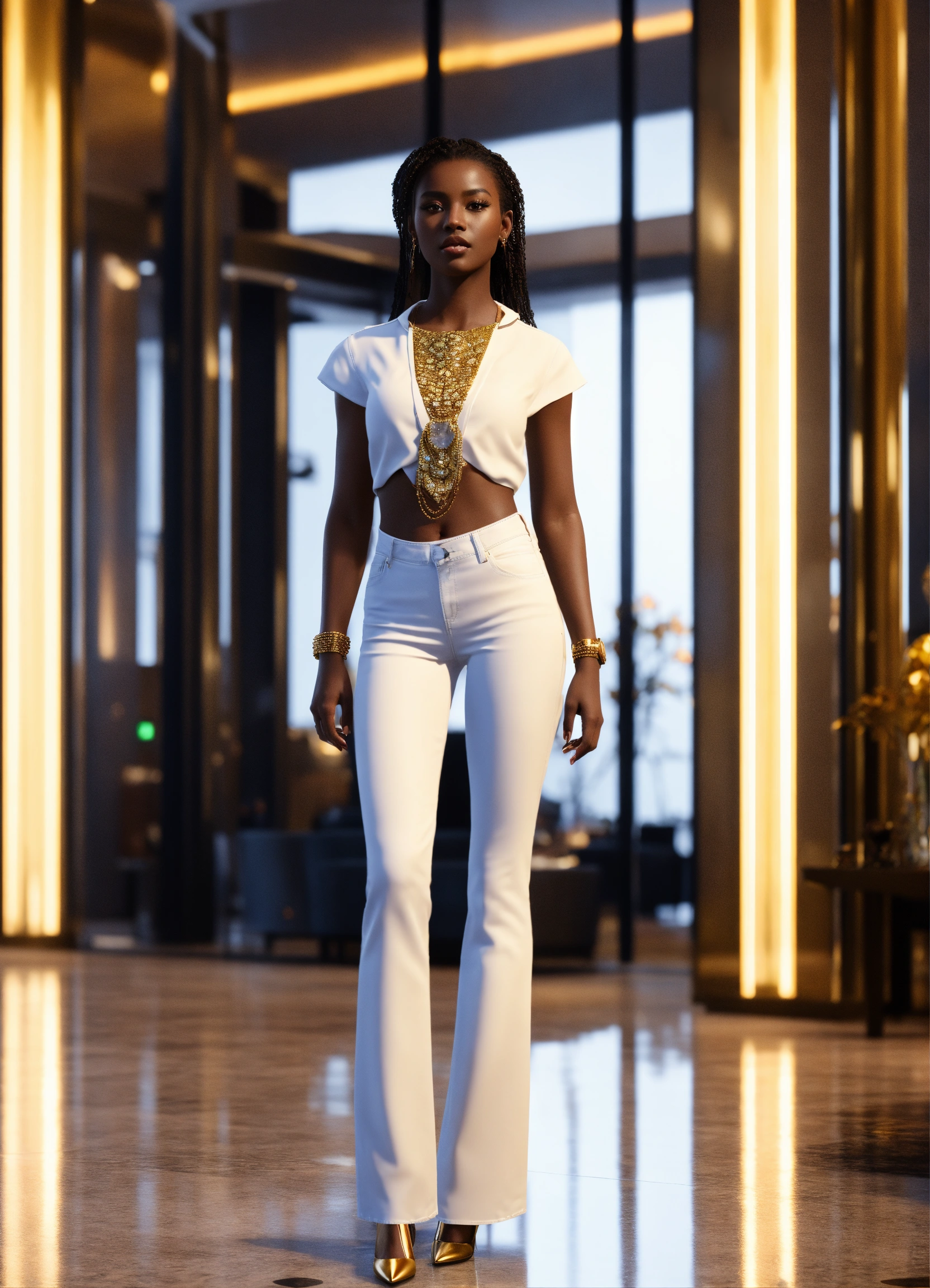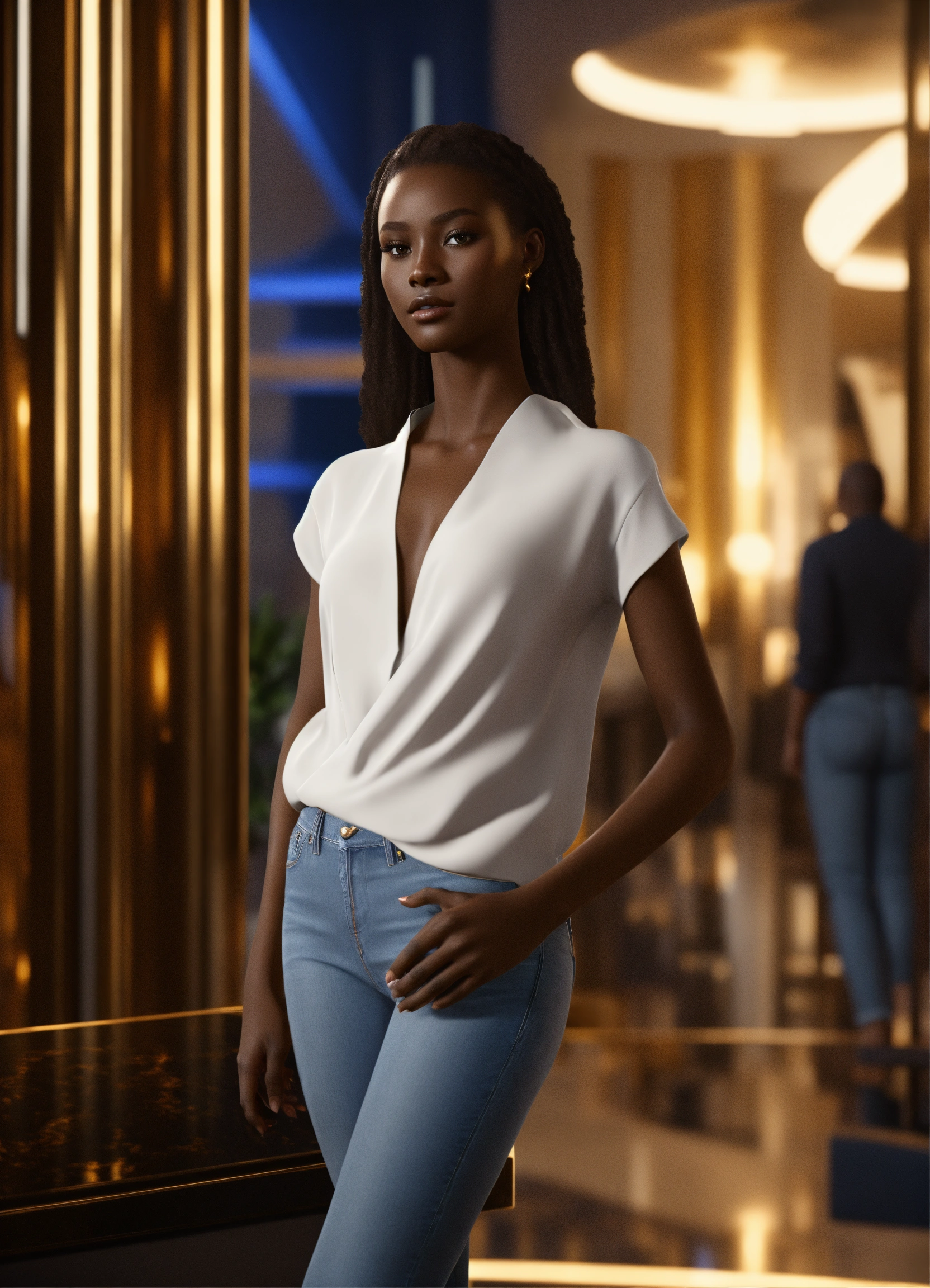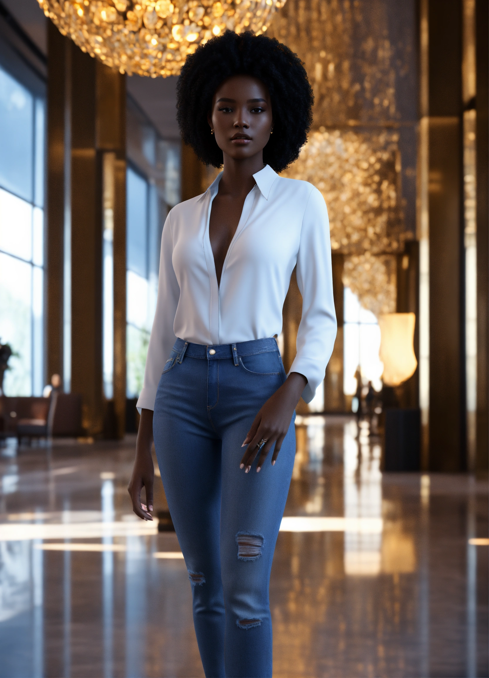 Pretty human looking alien, golden dark skin, african features, volumpious, in white blouse, blue jeans and heels, in upscale lobby, 8k, unreal engine.