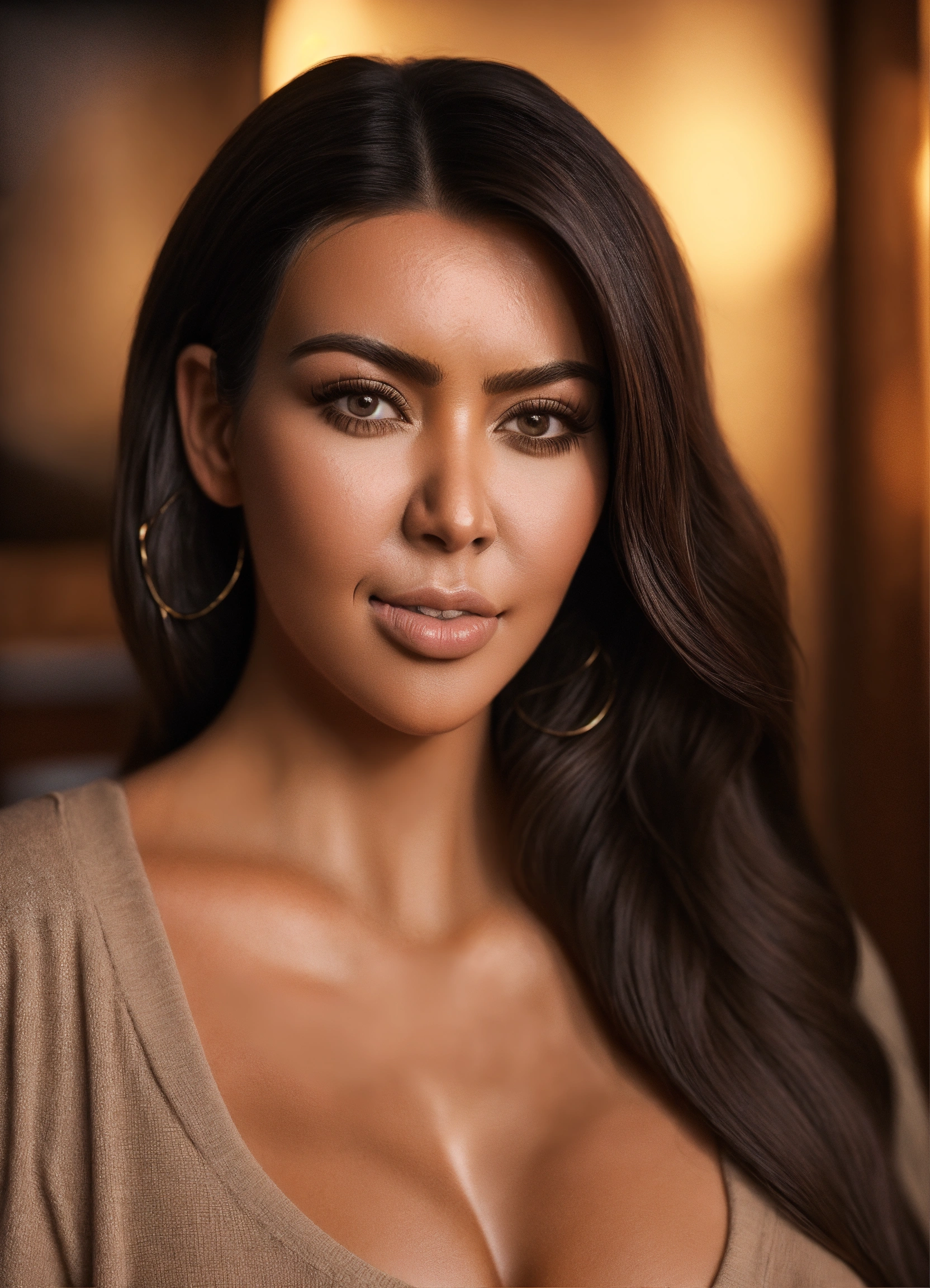 Realistic portrait of kim kardashian, in frame, very detailed, happy pose, studio lighting, 8k, realistic, smooth, having coffee
