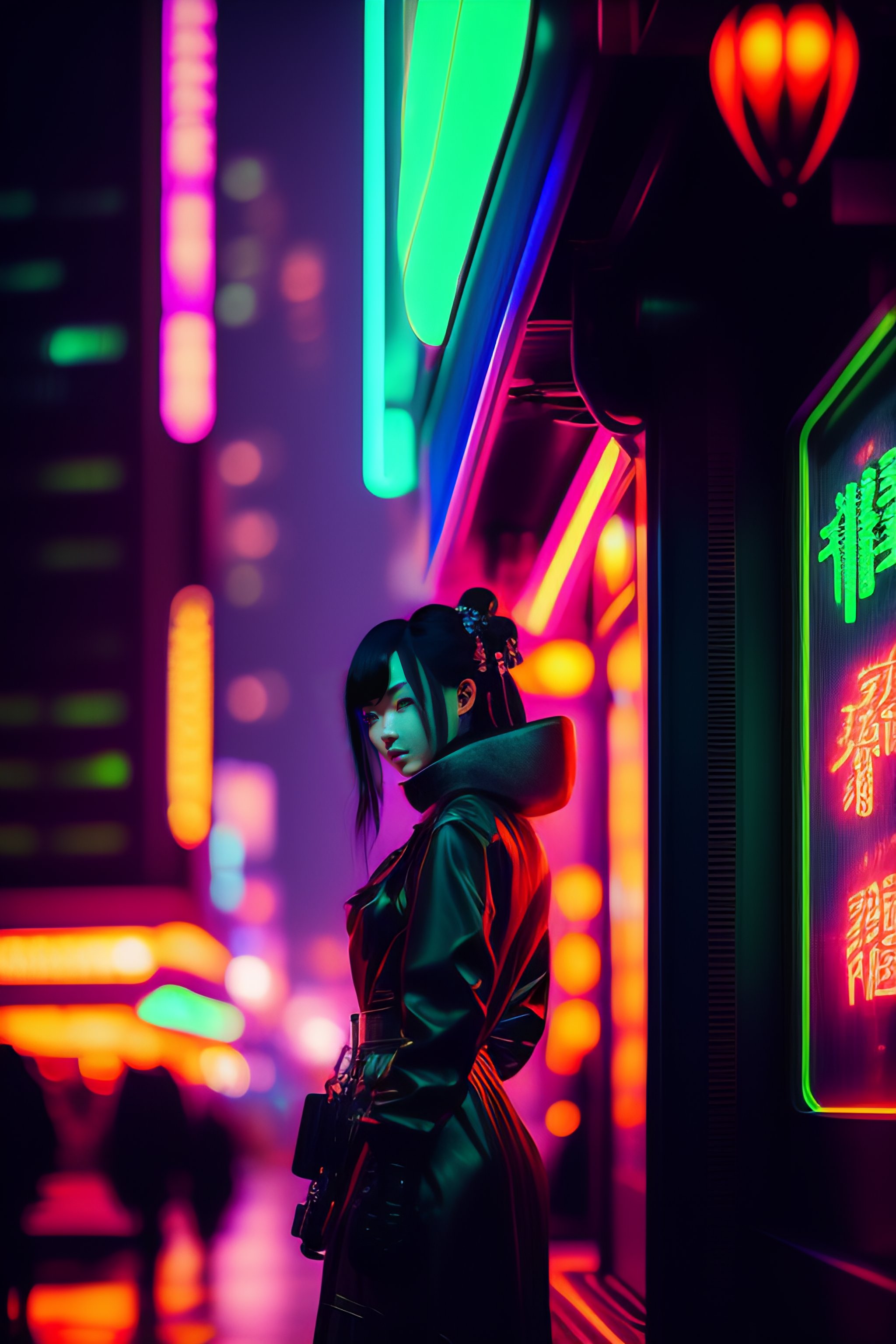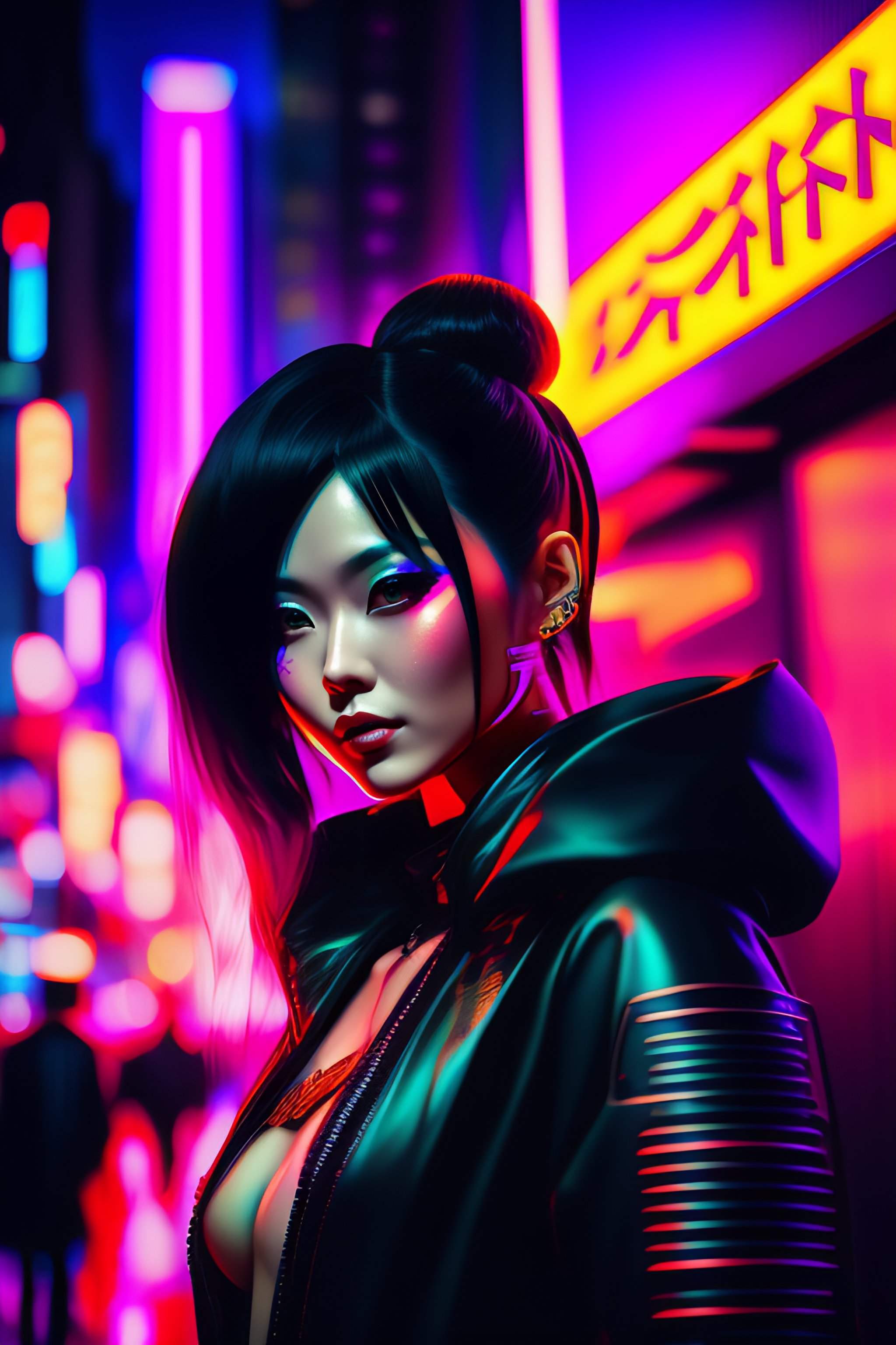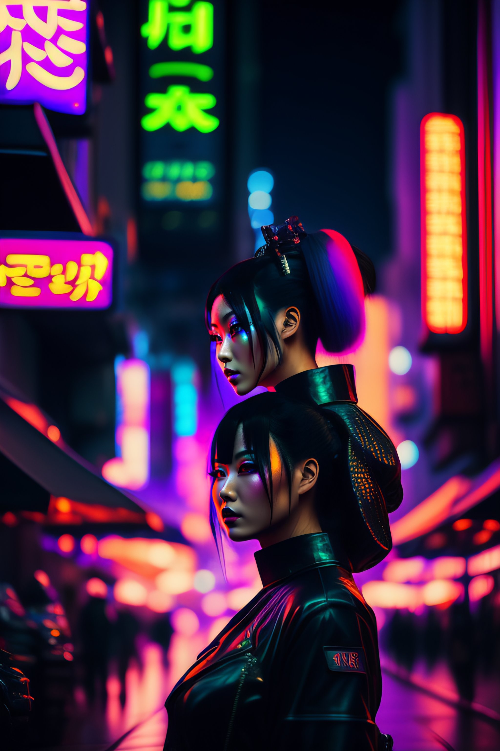 Cyber goth geisha in a tokyo street, pretty face, beautiful eyes, anime, portrait, dark aesthetic, neon sunset background, concept art, digital art, anime art, unreal engine, greg rutkowski, loish, rhads, beeple, makoto shinkai, haruyo morita and lois van baarle, ilya kuvshinov, cyberpunk black tokyo market, indoor in the style of blade runner, stands illuminated by greens neon lights, crowded with cyborgs photorealistic, 3 5 mm, grainy ruined film, dark color scheme, ray tracing, unreal engine, 4 k long shot