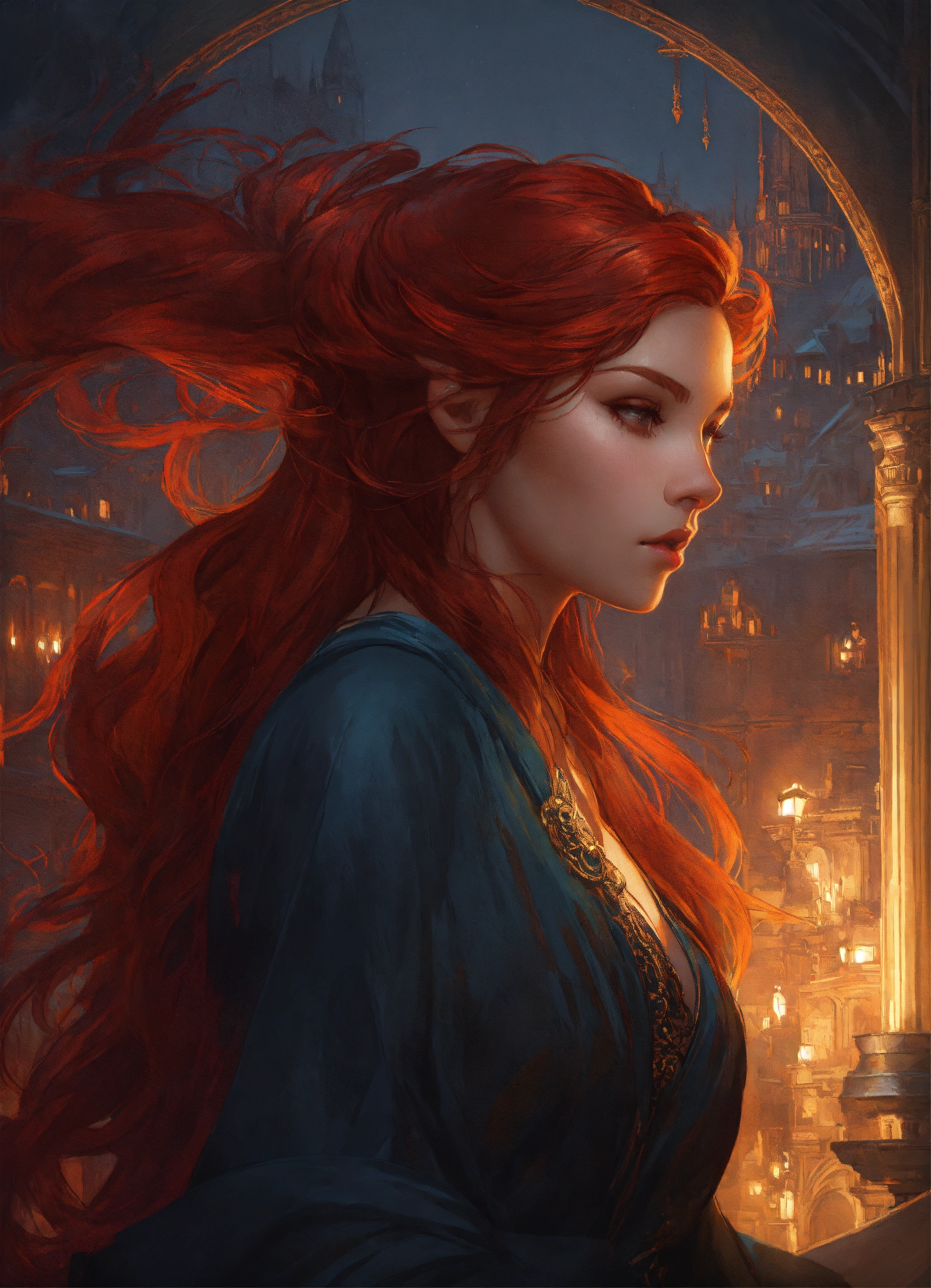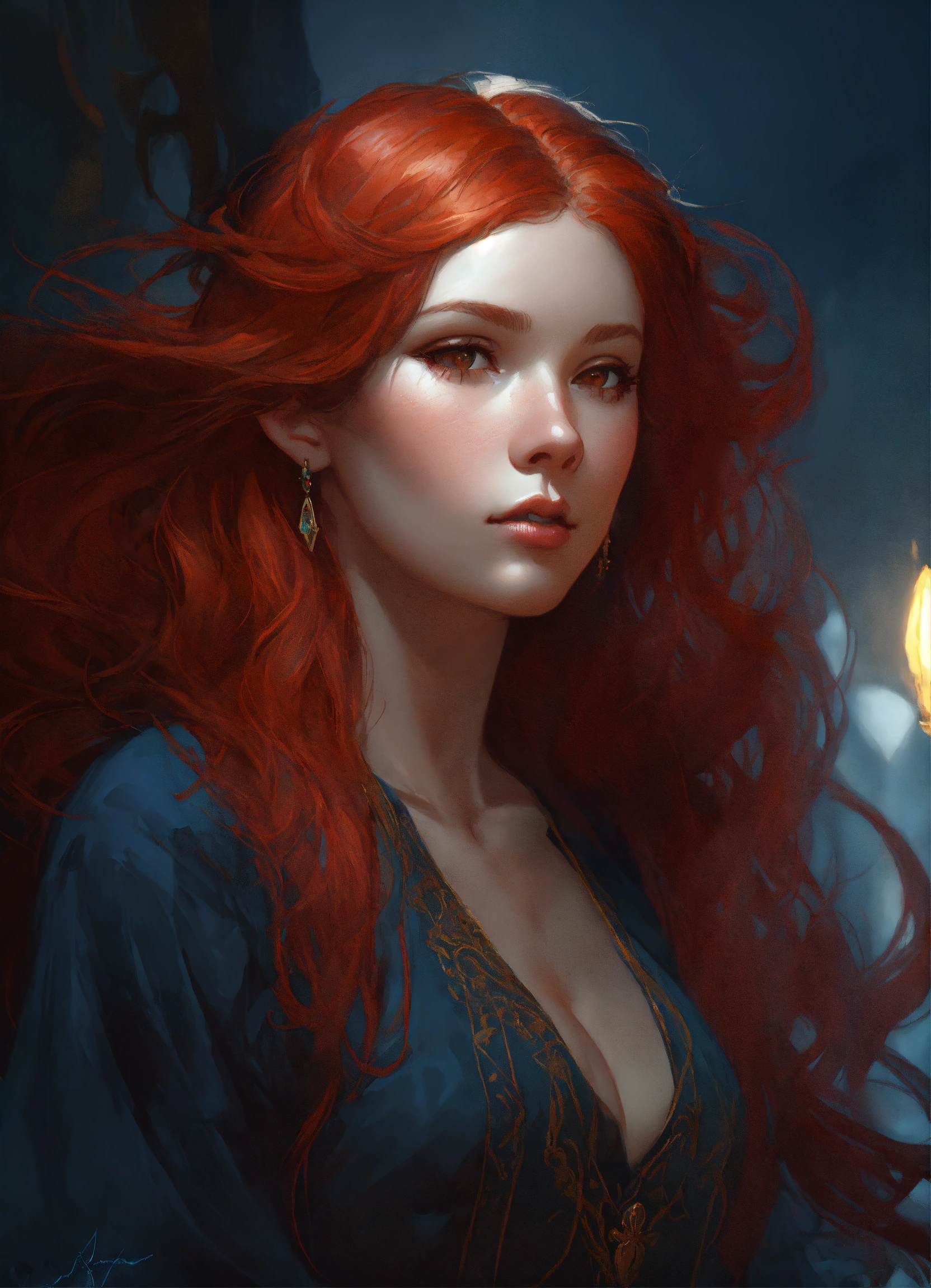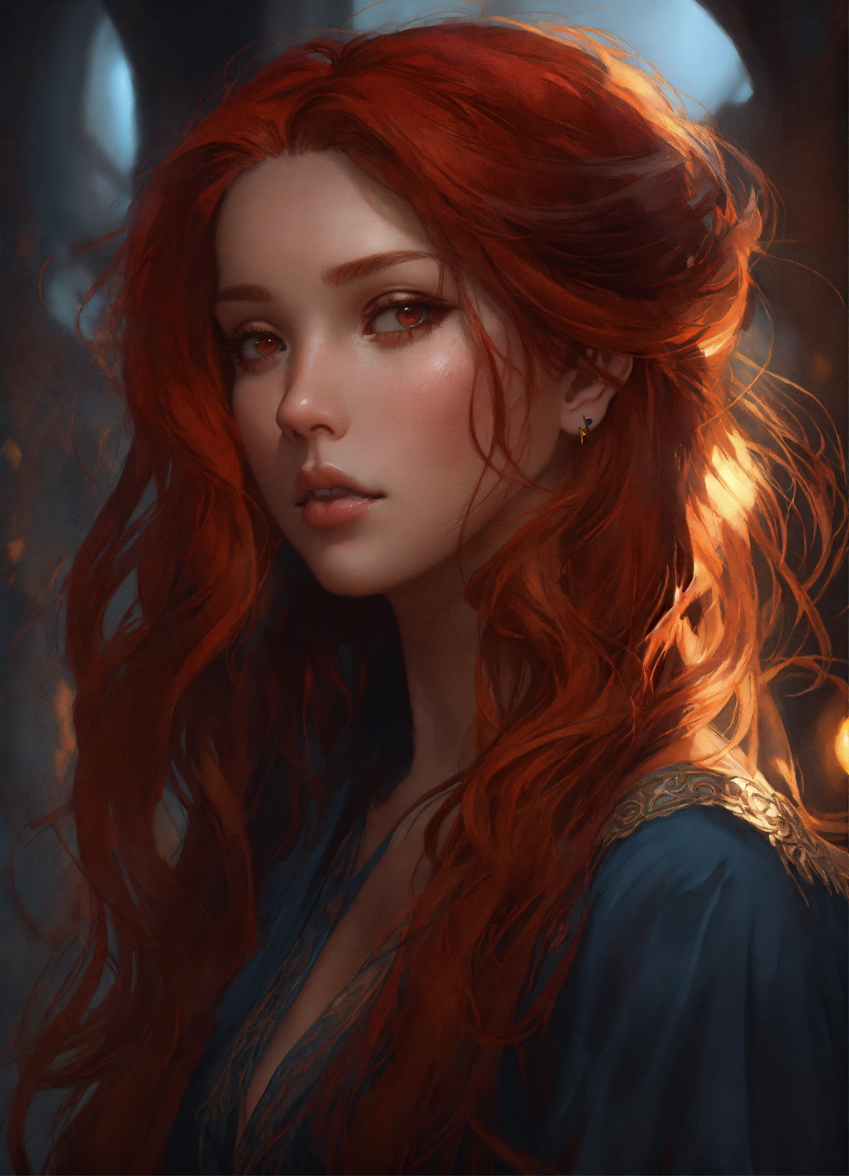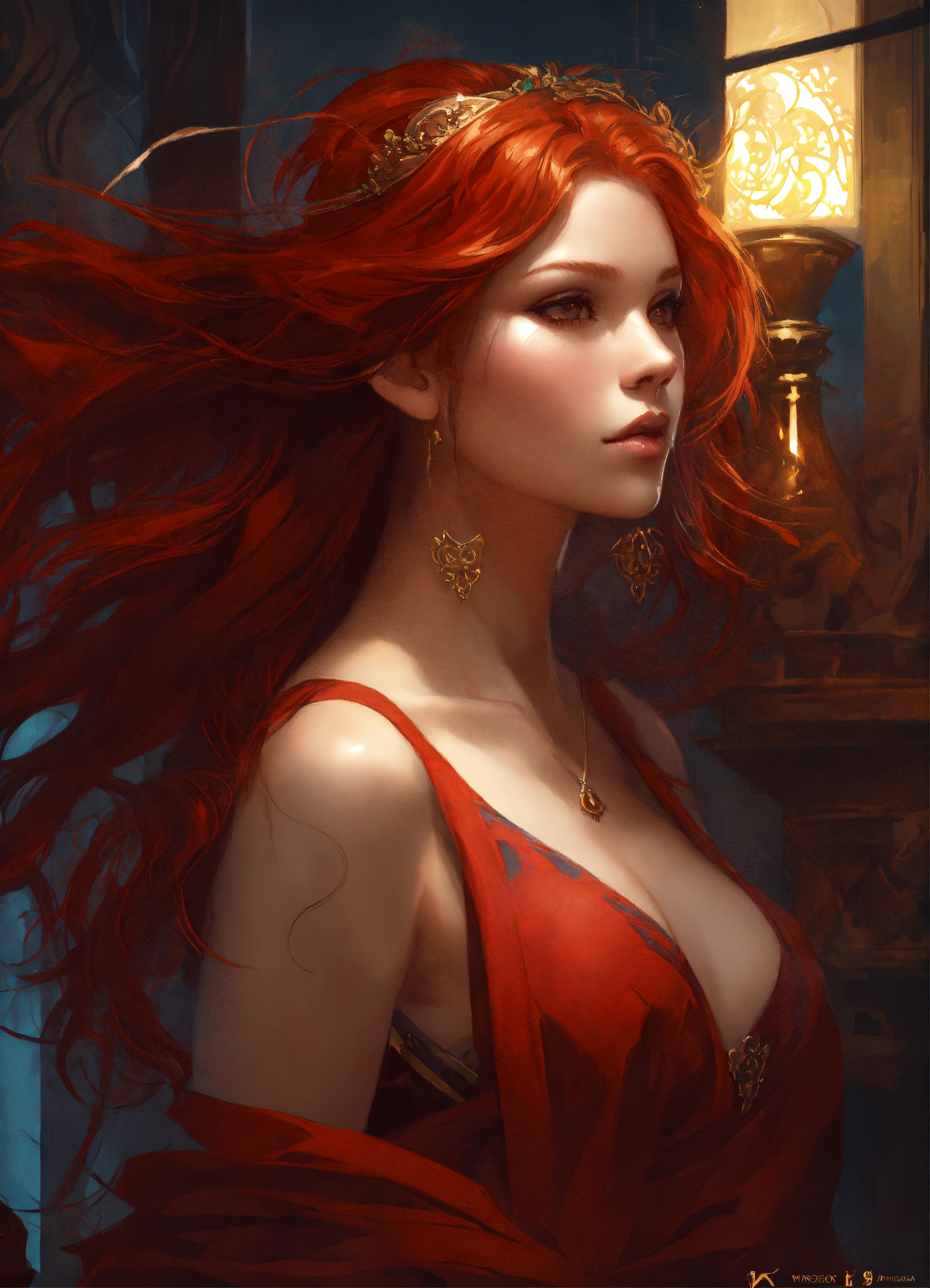 Beautiful, red hair, sorceress, long hair, dark pin-up style hair, dark light night, intricate, sharp focus, illustration, highly detailed, digital painting, concept art, matte, art by wlop and artgerm and greg rutkowski and alphonse mucha, masterpiece