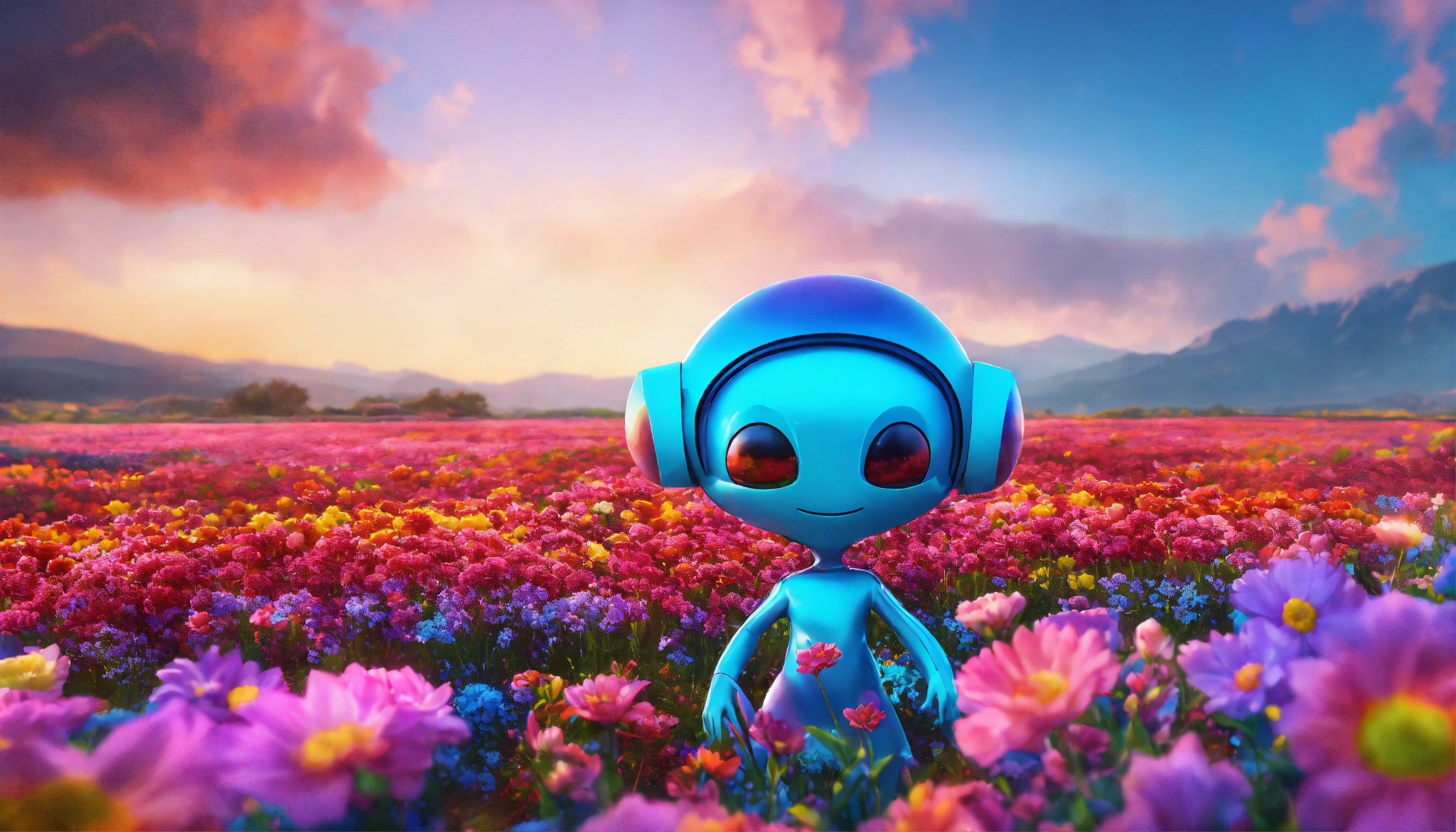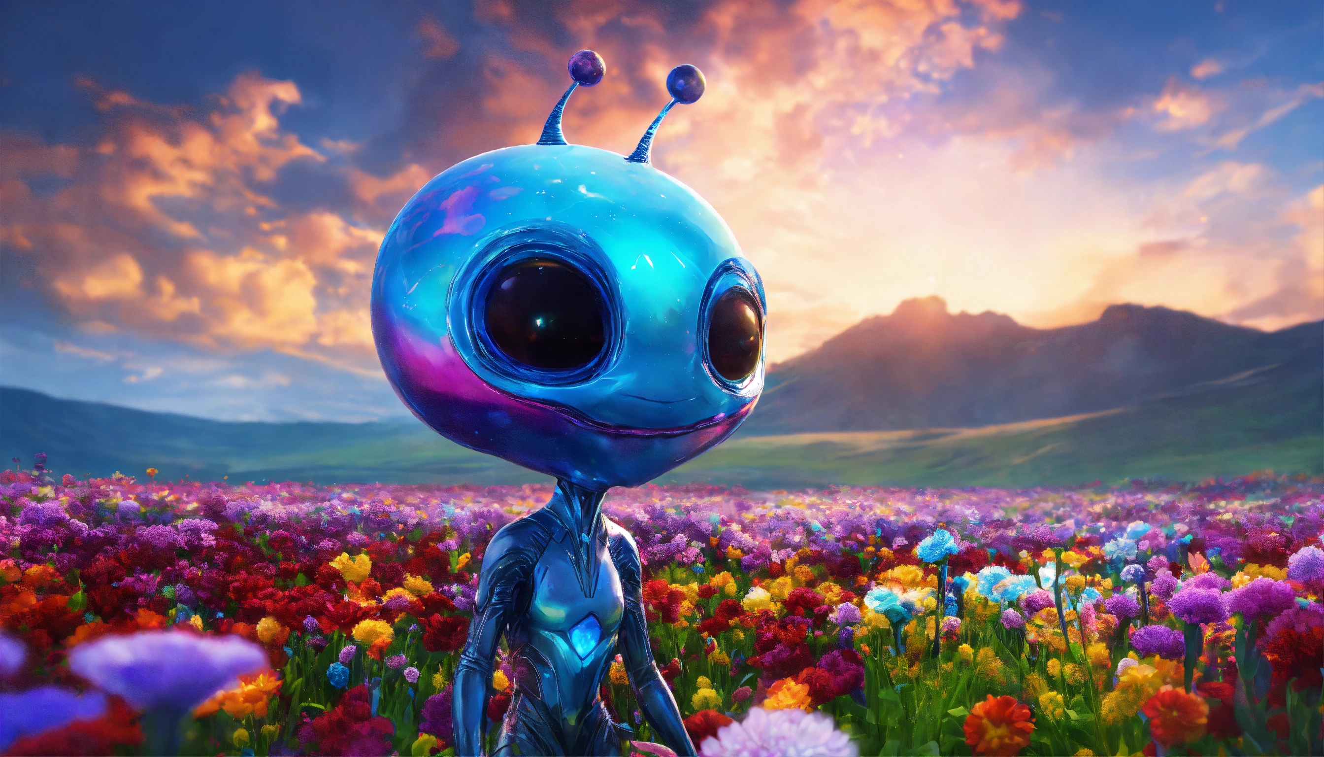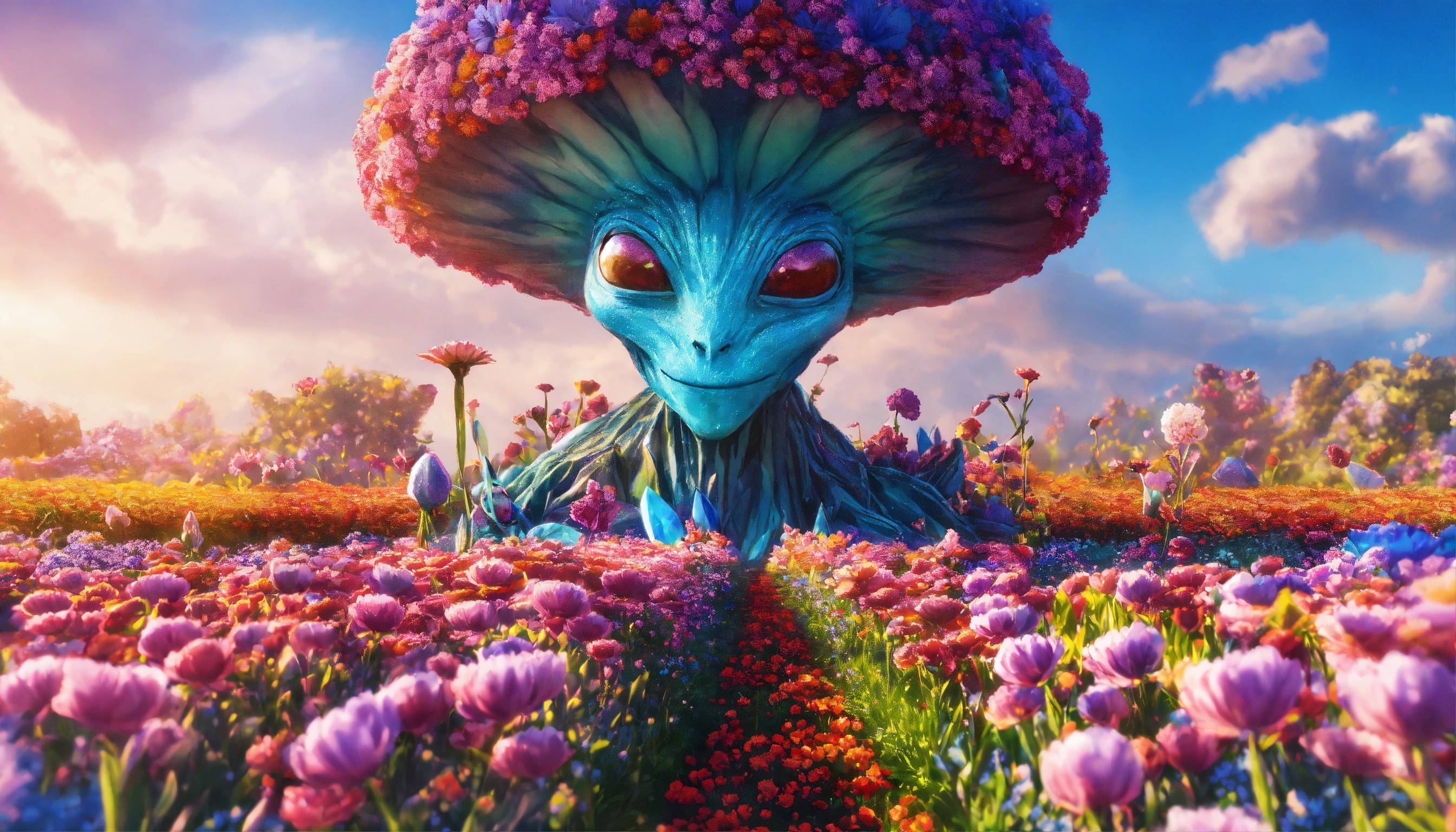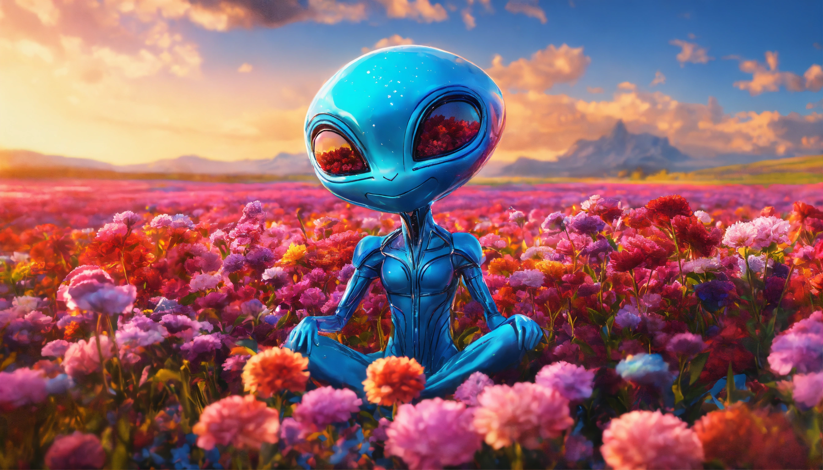 Happy crystaline alien, happy, surrounded by a colorful flowers in a massive flower field, beautiful blue sky, perfect lighting, moody hues, 8k, ultra hd