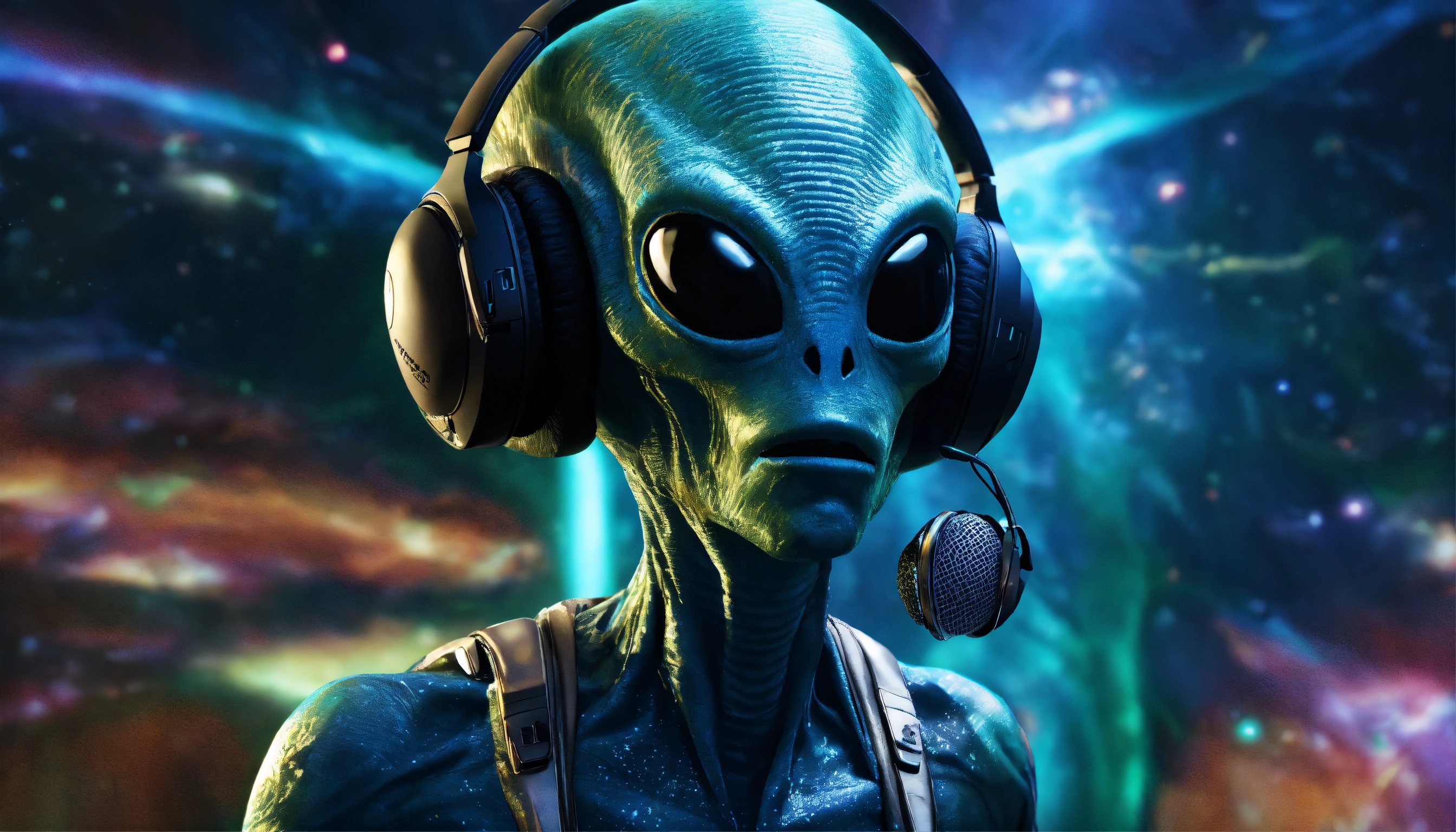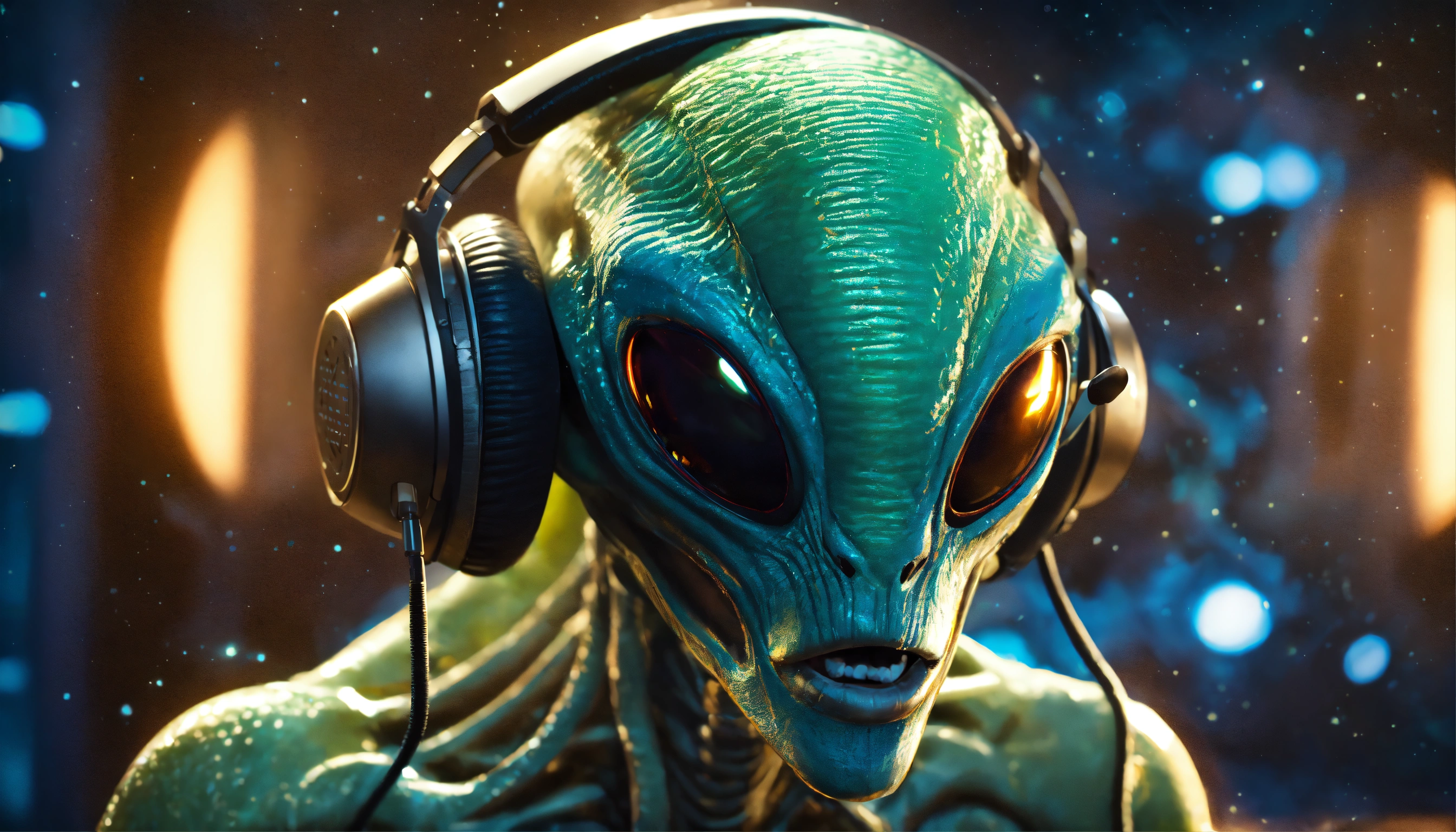 A alien extraterrestrial, singing rap with a headset in a deep space background, ultra detailed, high rendered, full resolution, hyper realistic, xf iq4, f/1.4, iso 200, 1/160s, raw, featured in artstation, illustrative, elegant, intricate, 8k