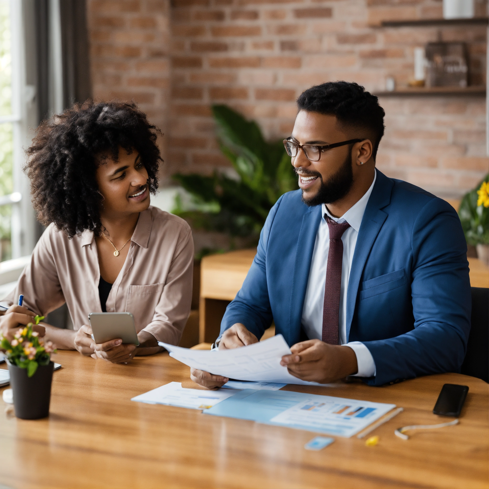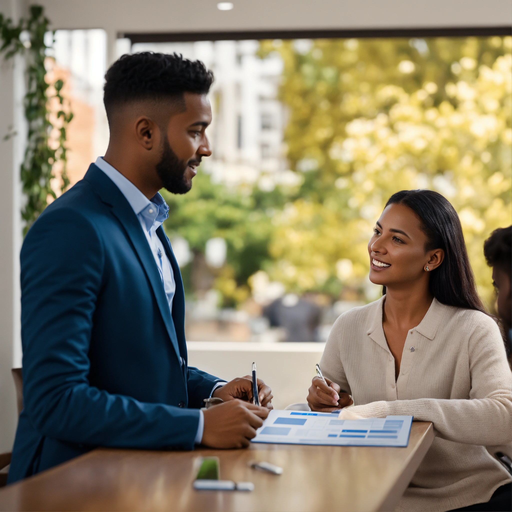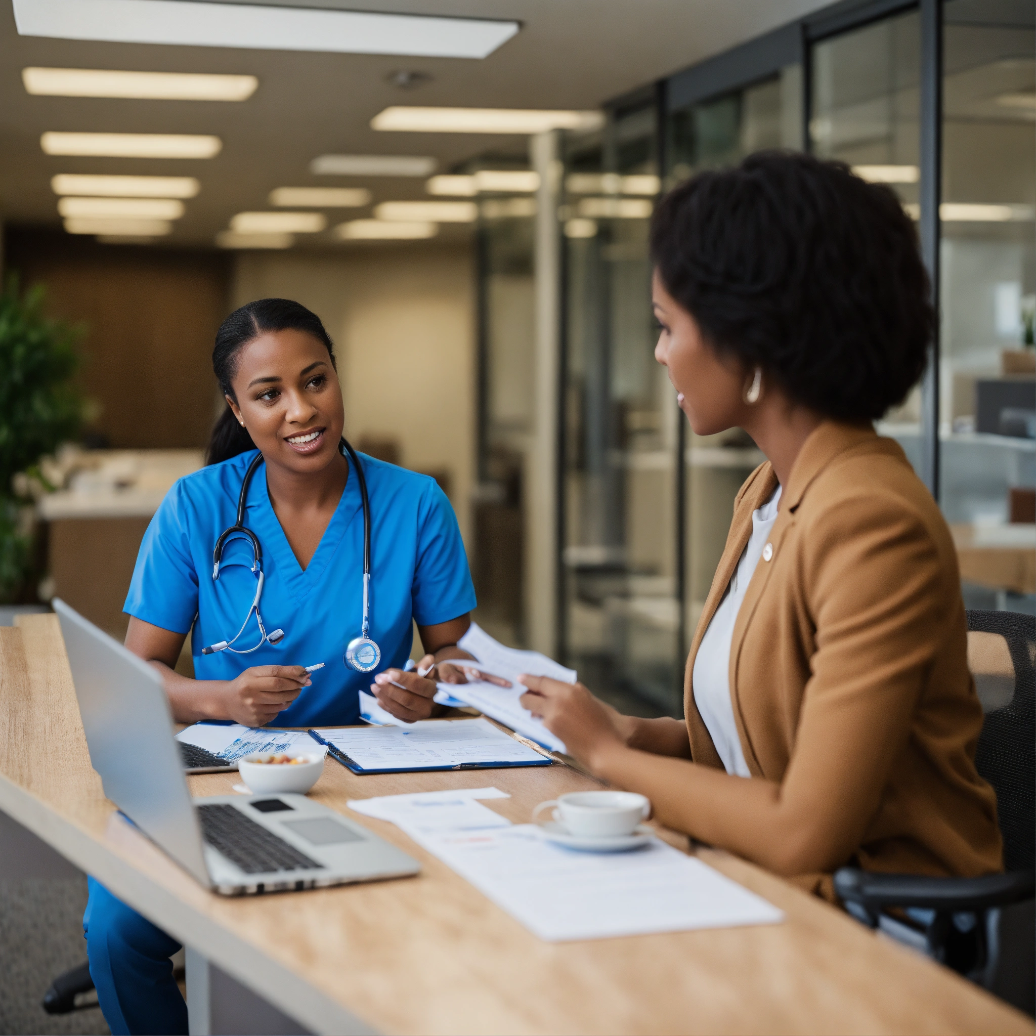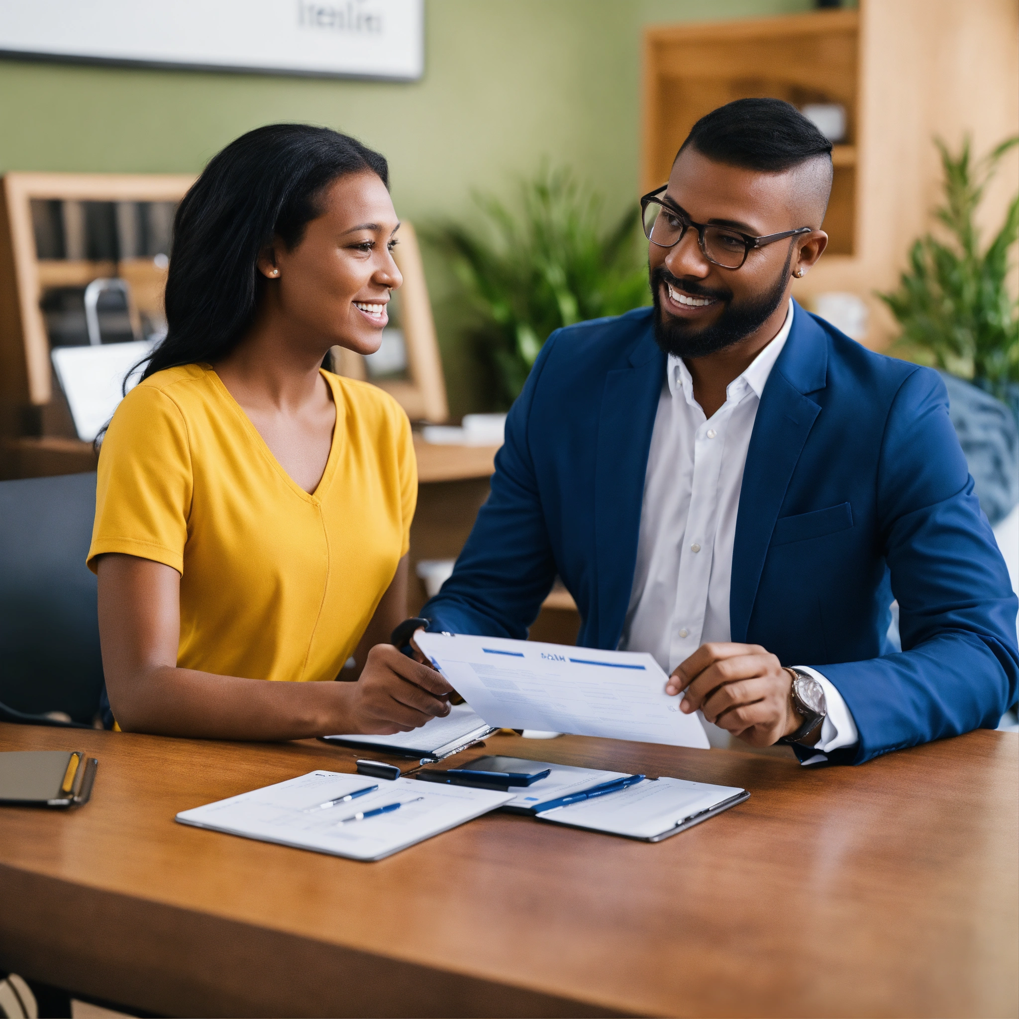 A photo of a health insurance agent talking to a customer, the agent is explaining the different health insurance plans available to the customer