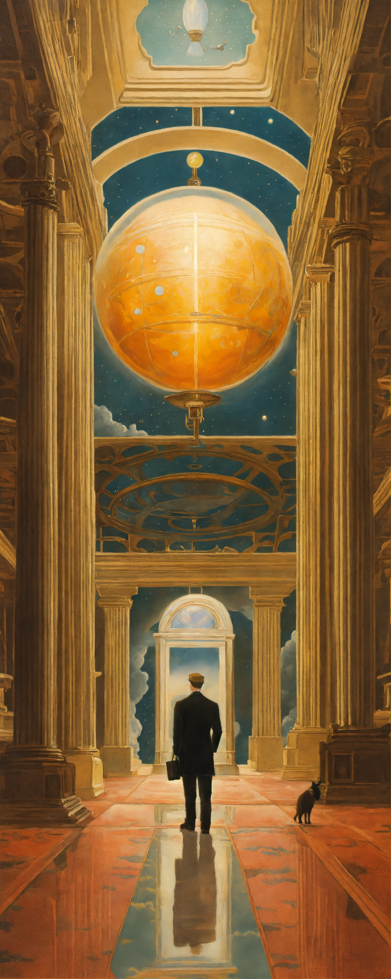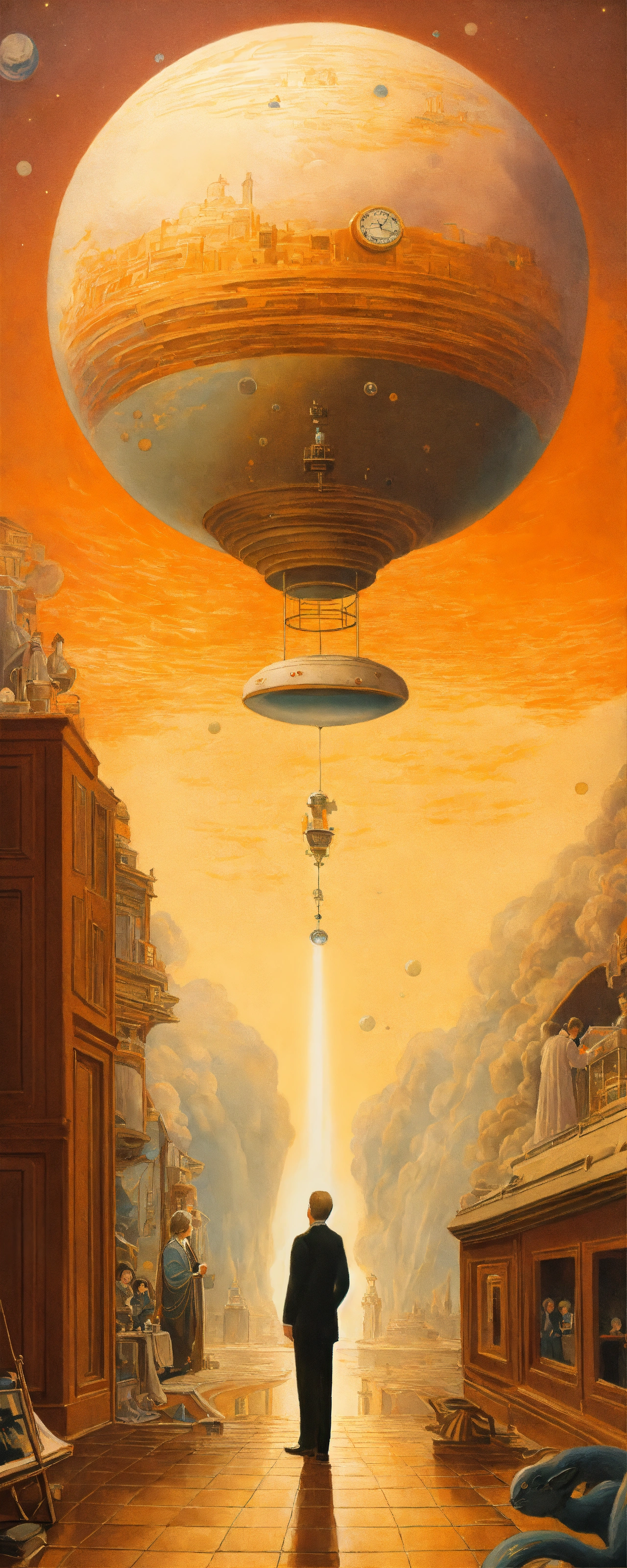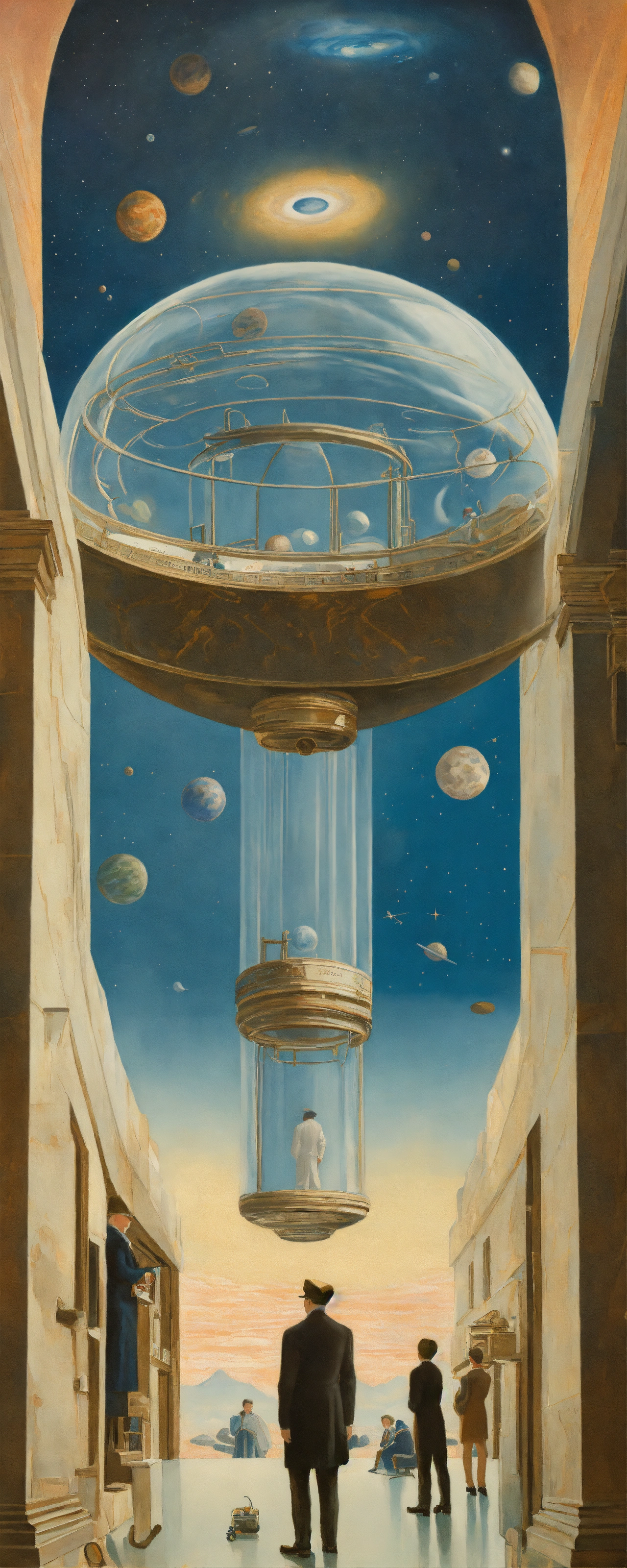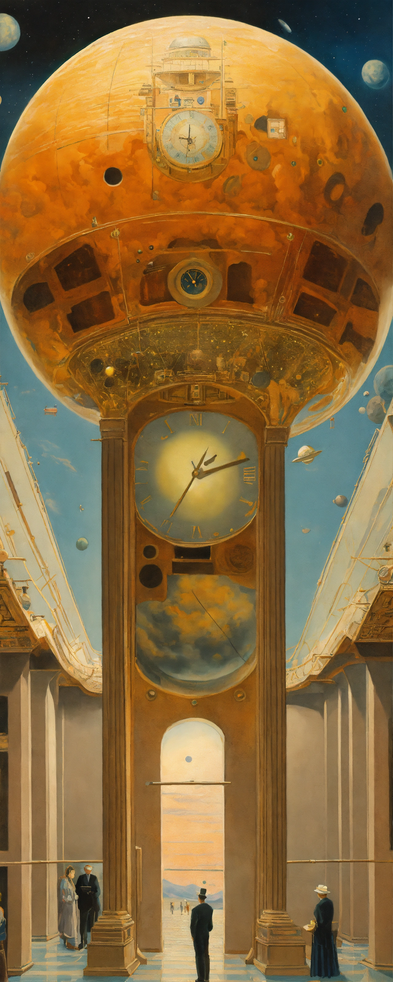 Ultra-detailed illustration of "the god with a time machine" in an intergalactic space station with people, in a painting by rene magritte, surrealistic.