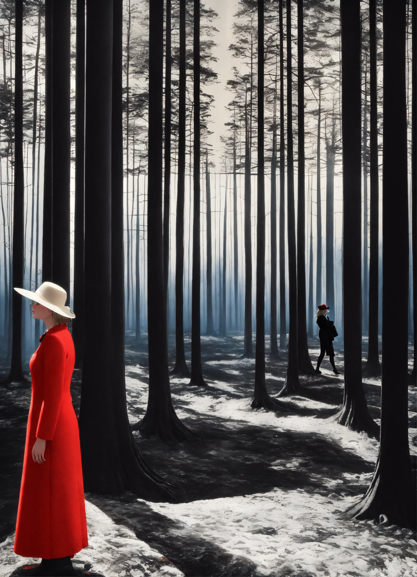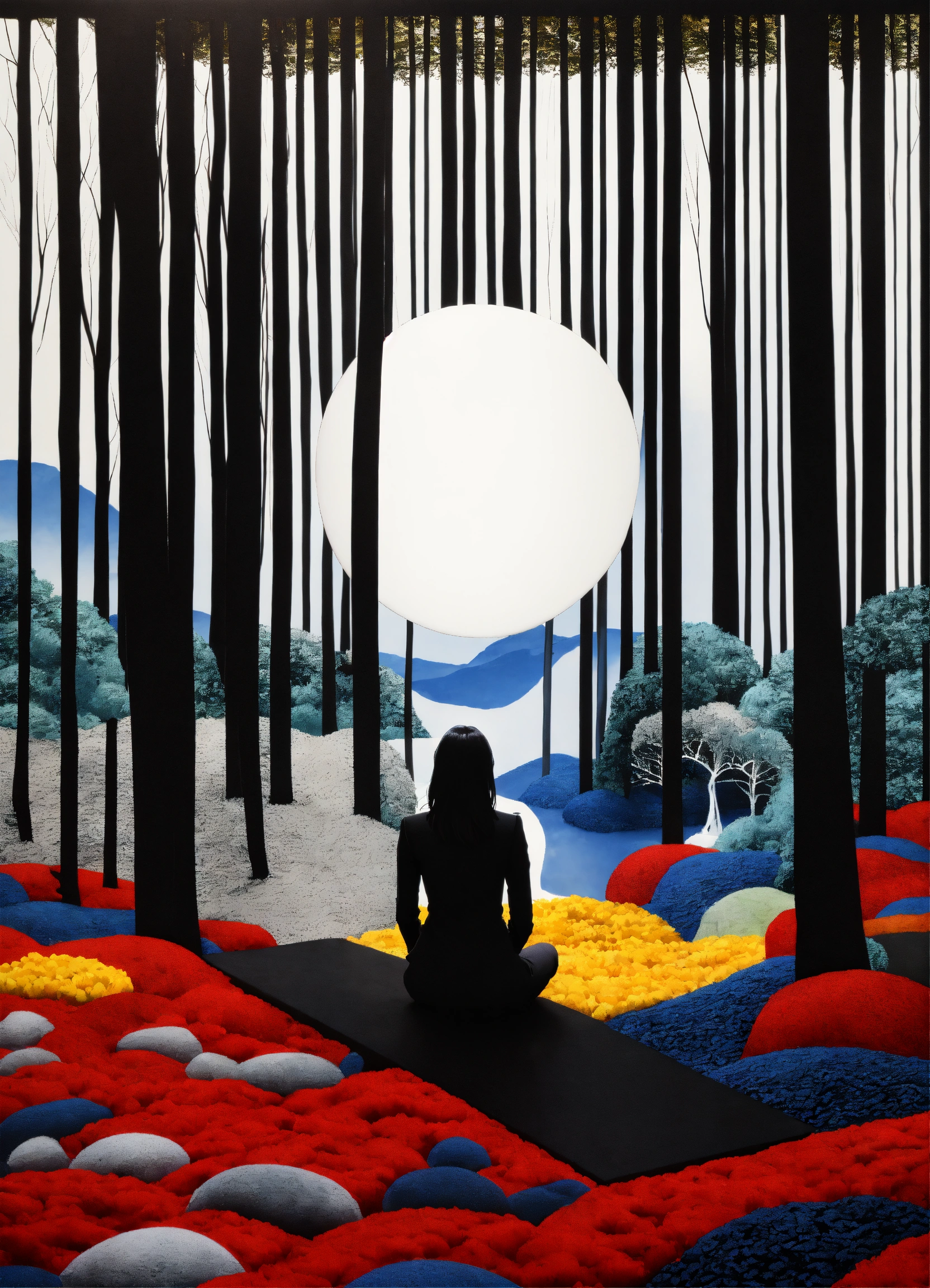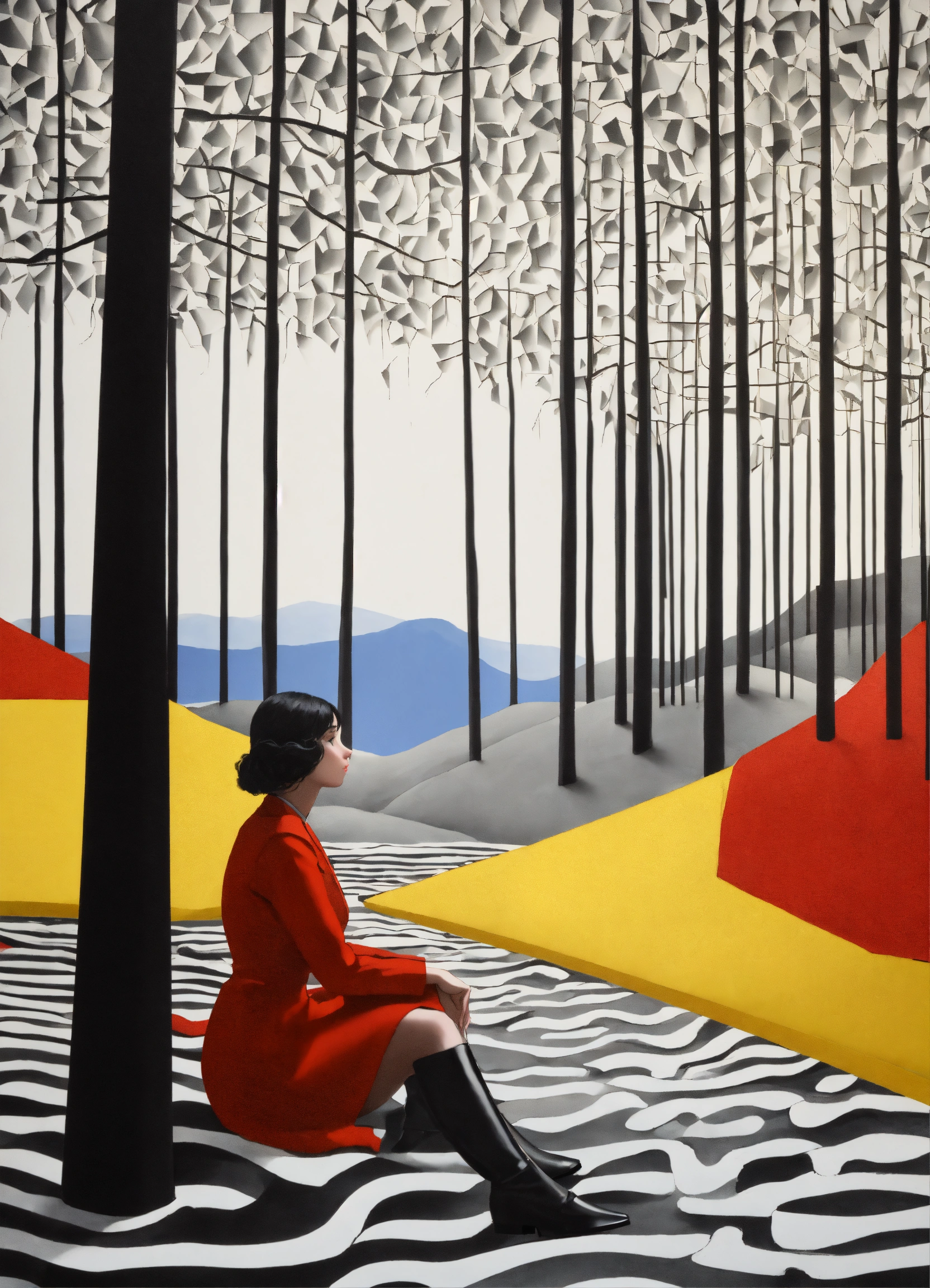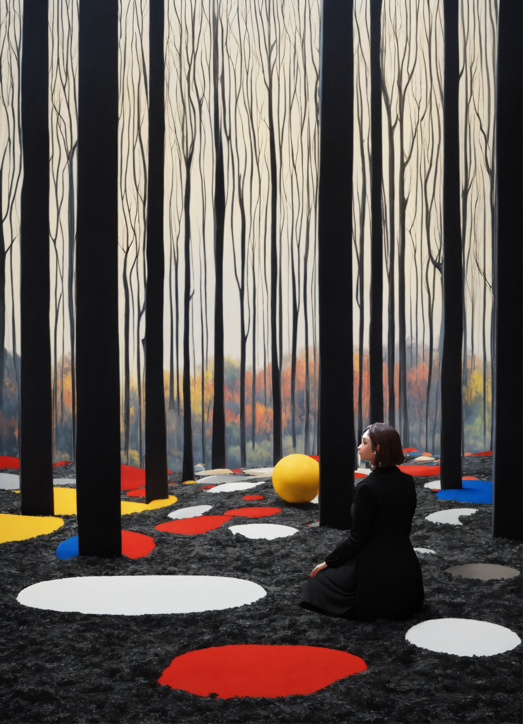 Black and white and primary colors, 3d abstract landscape, woman contemplating, immersive-inspired forest, inside and out landscape, rene magritte inspiration.