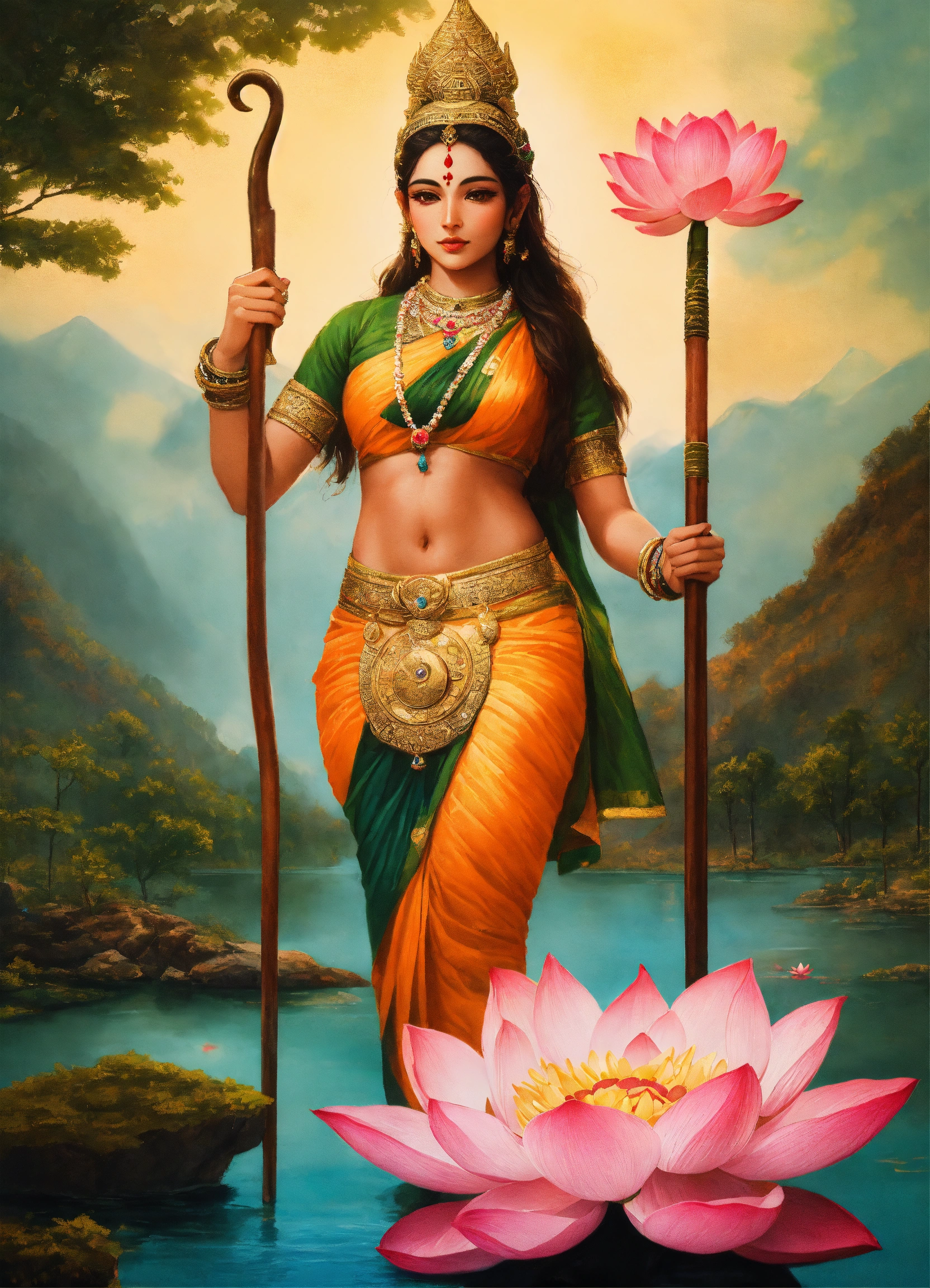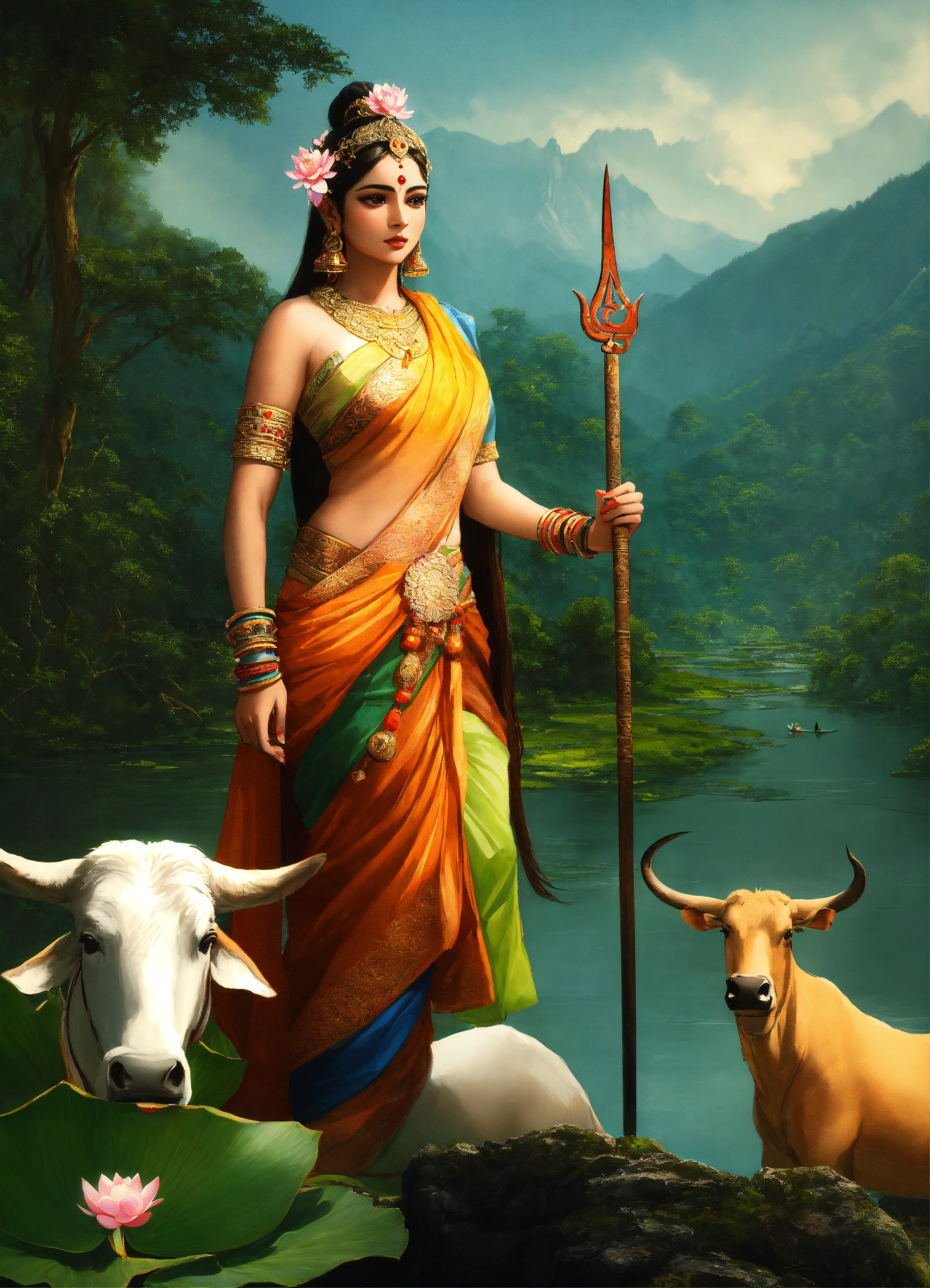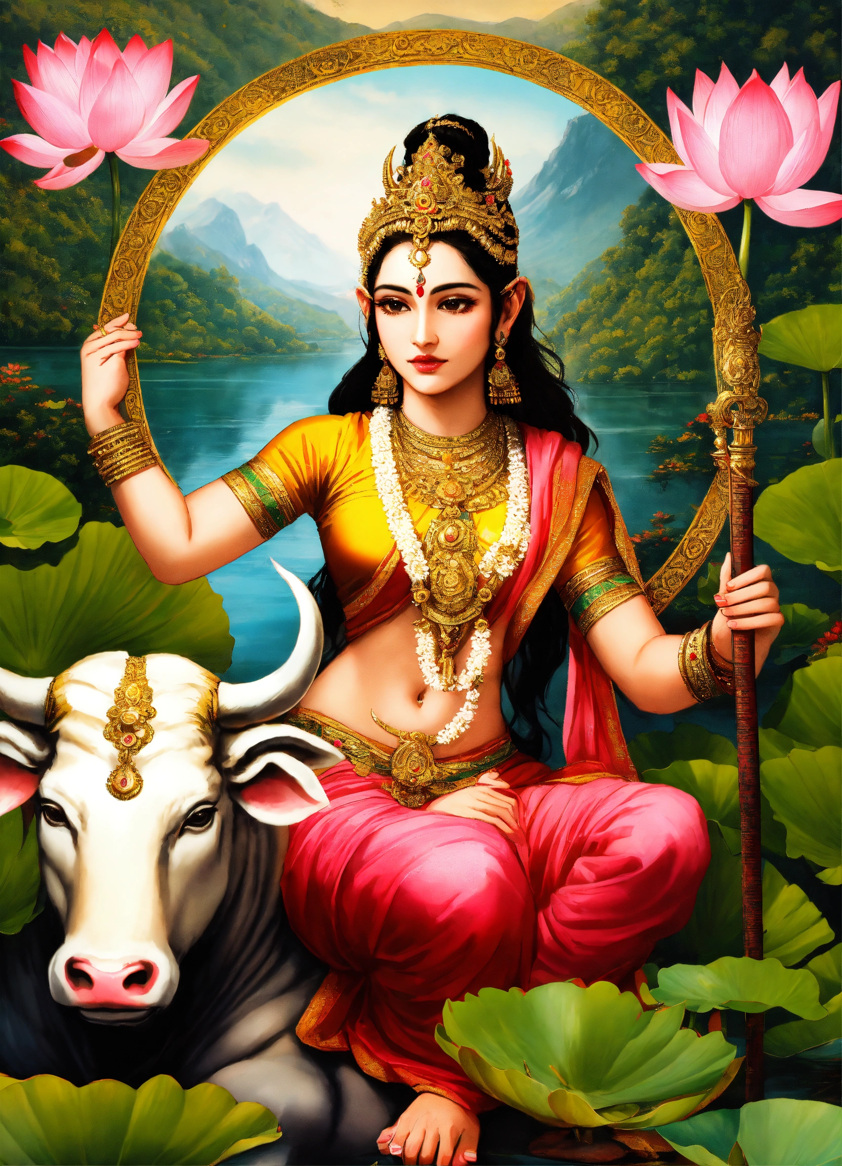 A hyper realistic photograph of parvati has a half moon on her forehead, you can also see a trident in her right hand and a lotus flower in her left hand, she rides on an ox the picture takes place in the mountains in front of a lake with lotud flowers in the lake