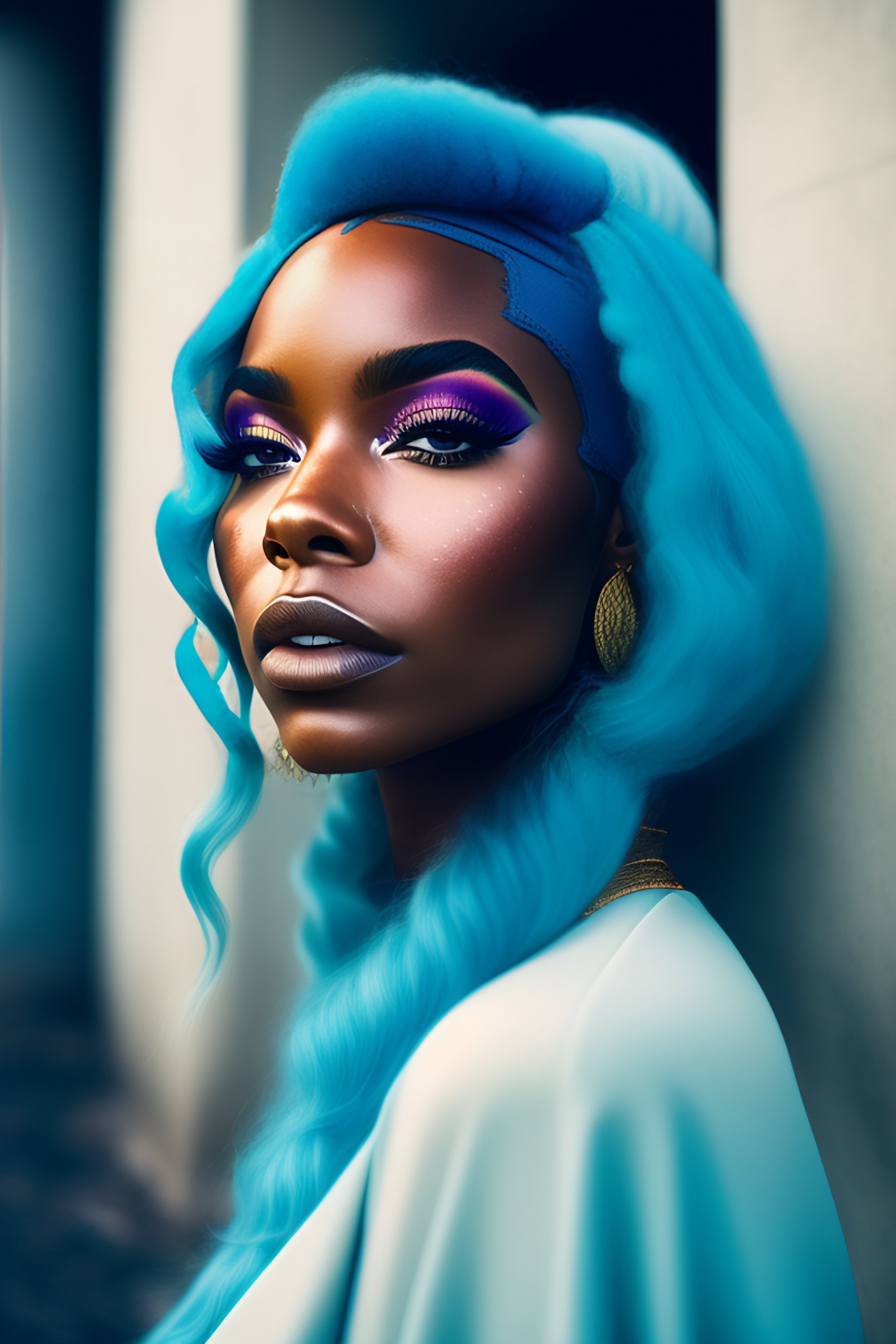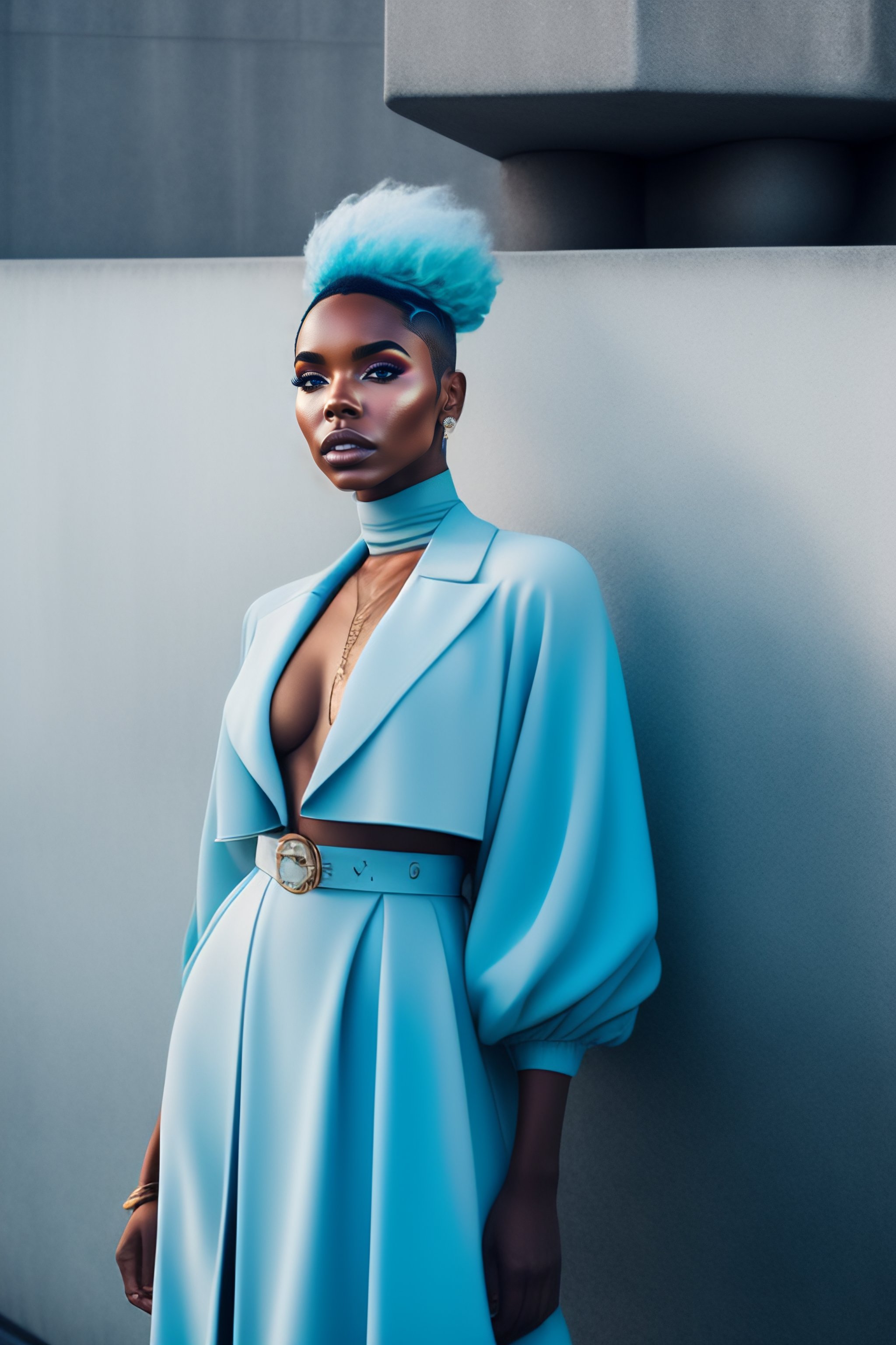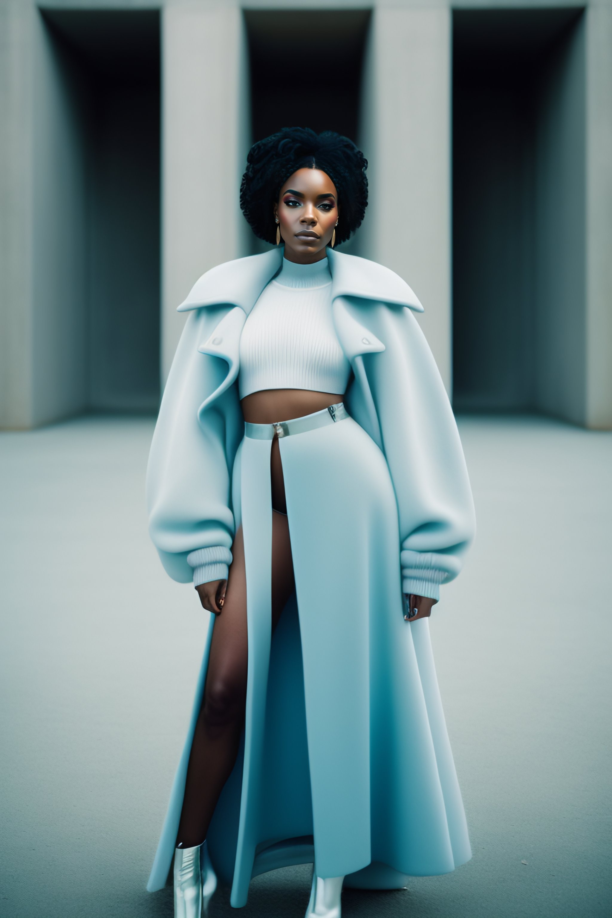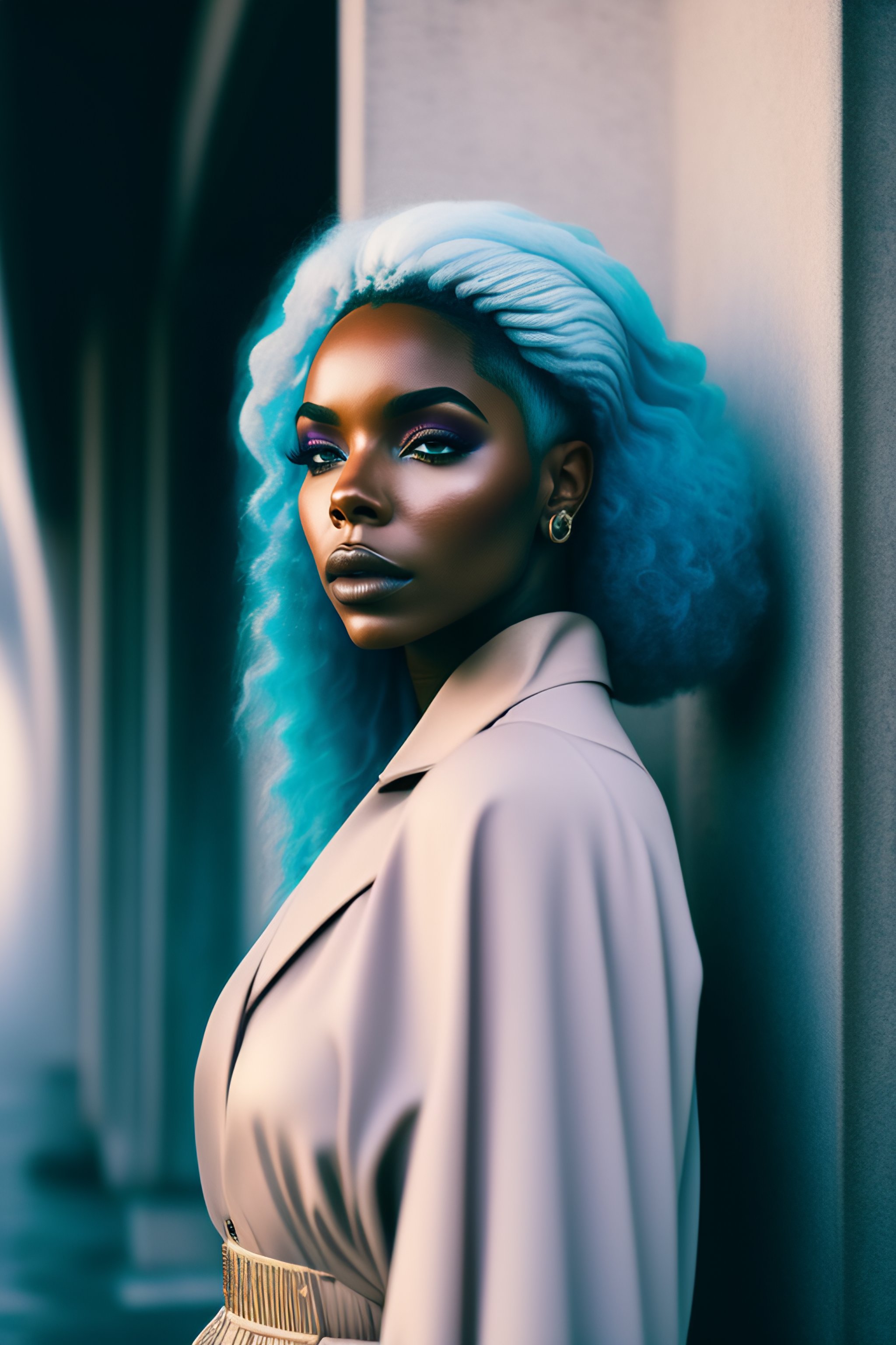 Portrait of ashanti douglas beautiful r&b music artist with pale blue hair, ethereal dreamy foggy, photoshoot by alessio albi, editorial fashion magazine photoshoot, fashion poses, in front of brutalist building architecture. kinfolk magazine. film grain.