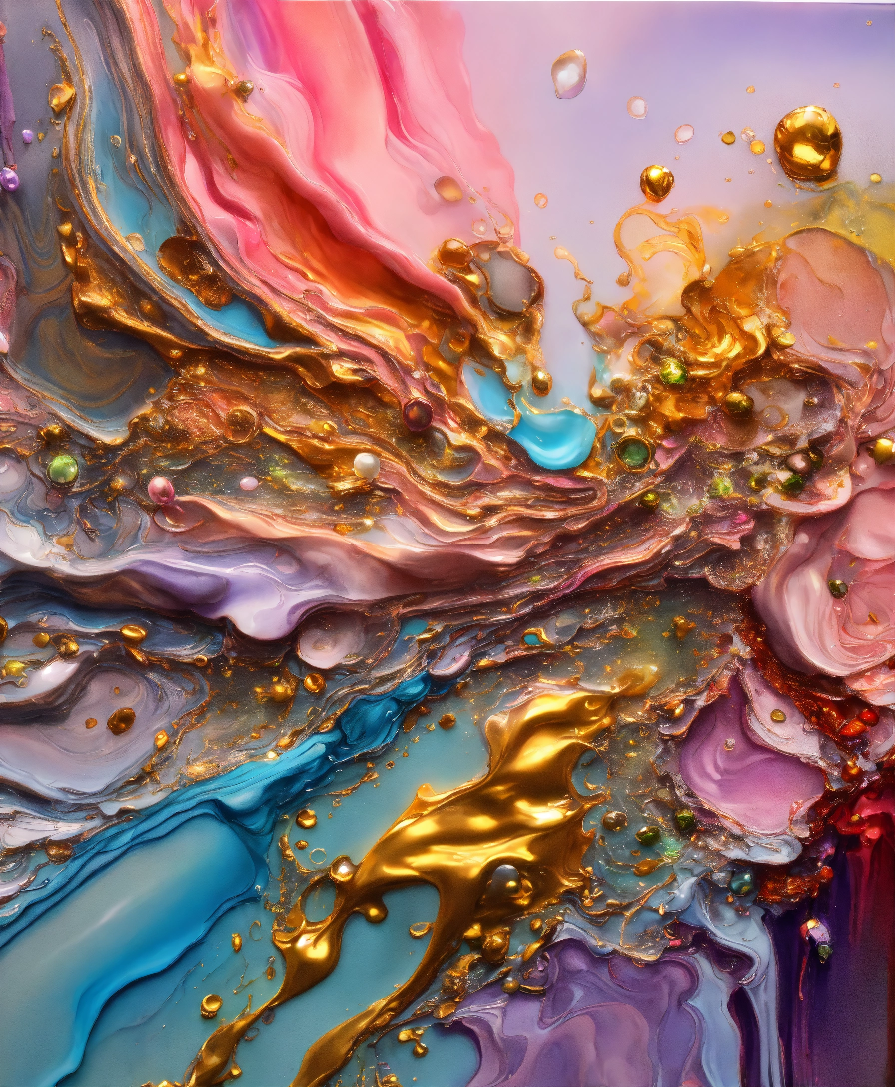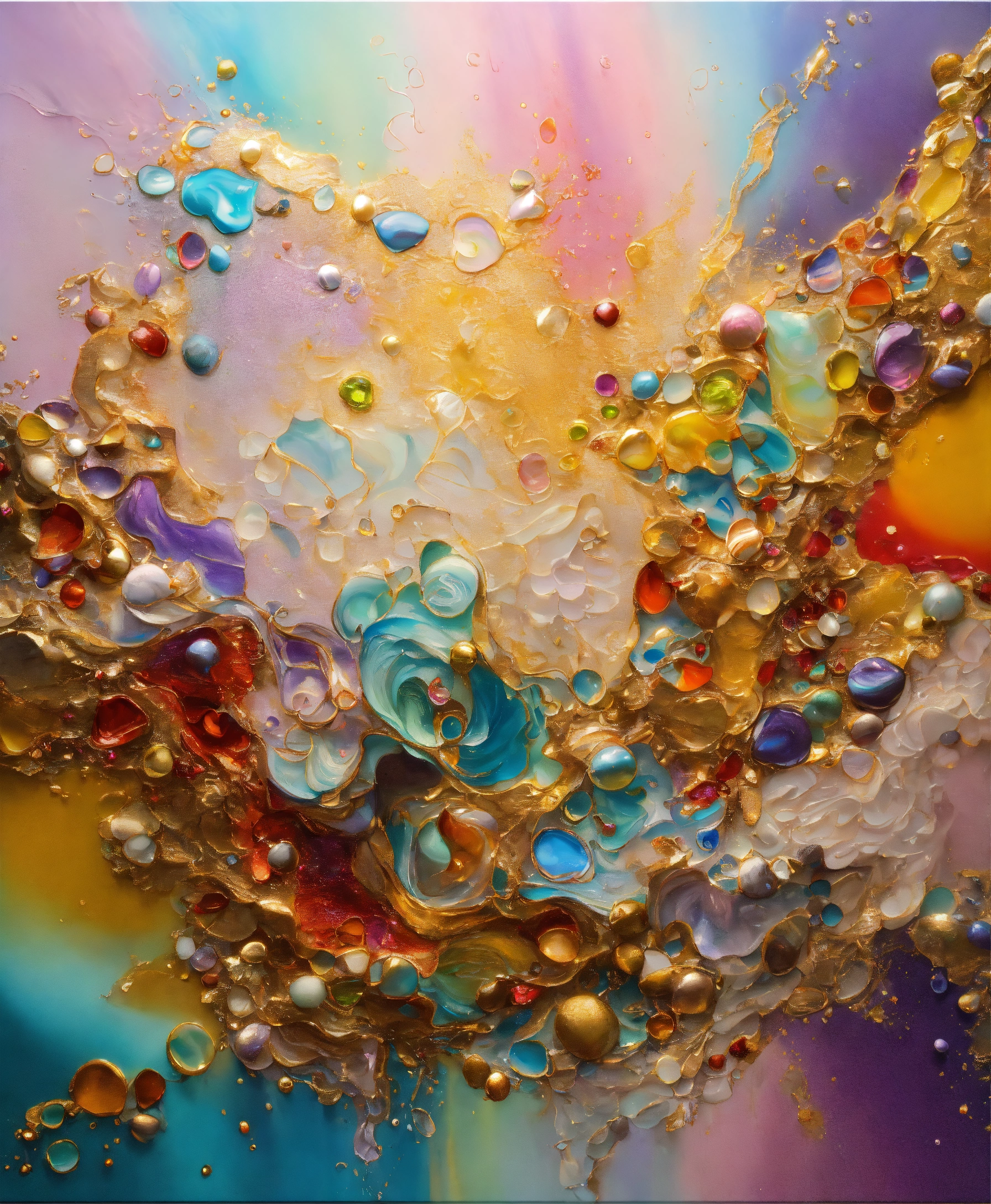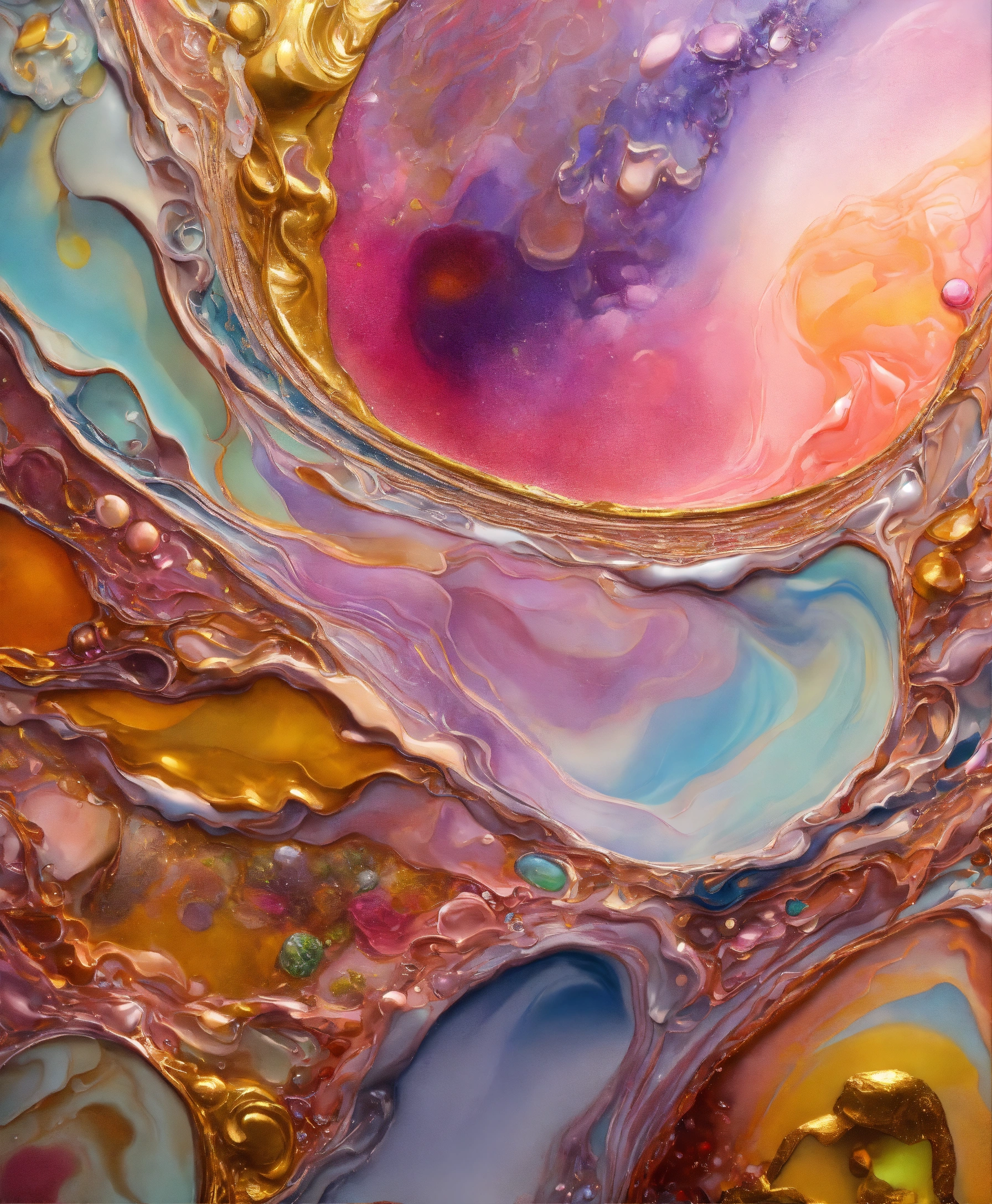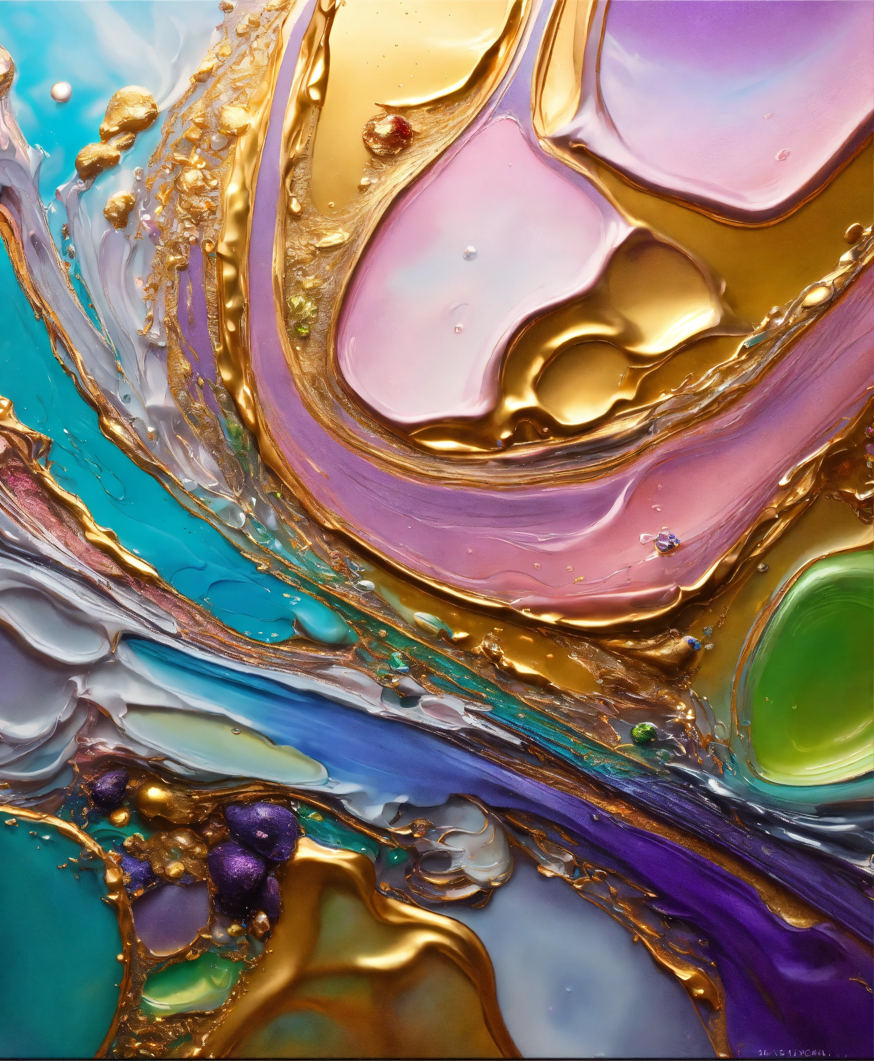 Colorful abstract painting oil and water complex complicated bright vivid colors beautiful opulent heavenly amazing wealthy intricate pink peridot sky blue gray lilac yellow violet green red blue sublime delicate hyperdetailed masterpiece metallic sheen mother of pearl elaborate inspiring ethereal amazing awesome 24k bright gold silver and copper trims throughout oil and water 8k extremely sharp image throughout 3d