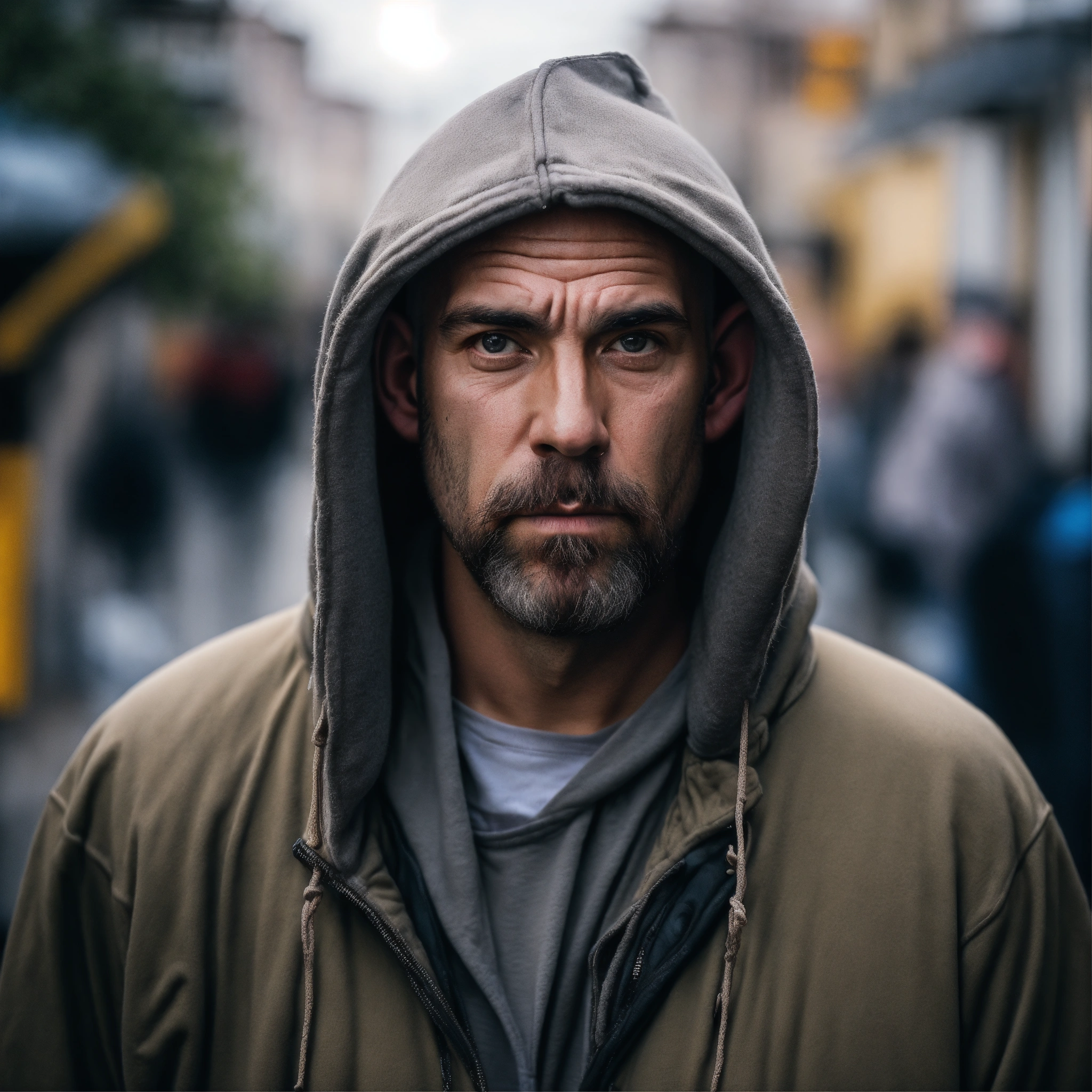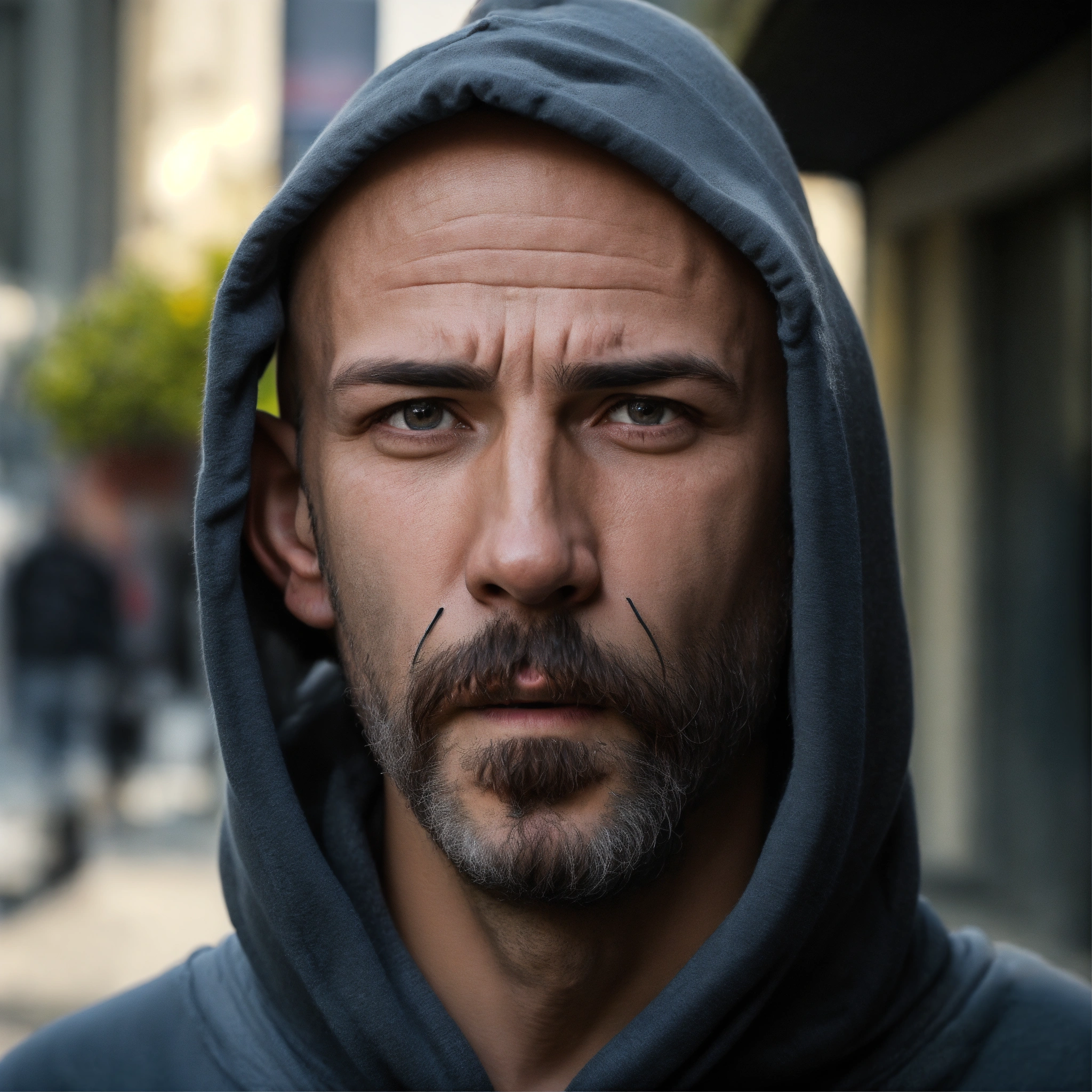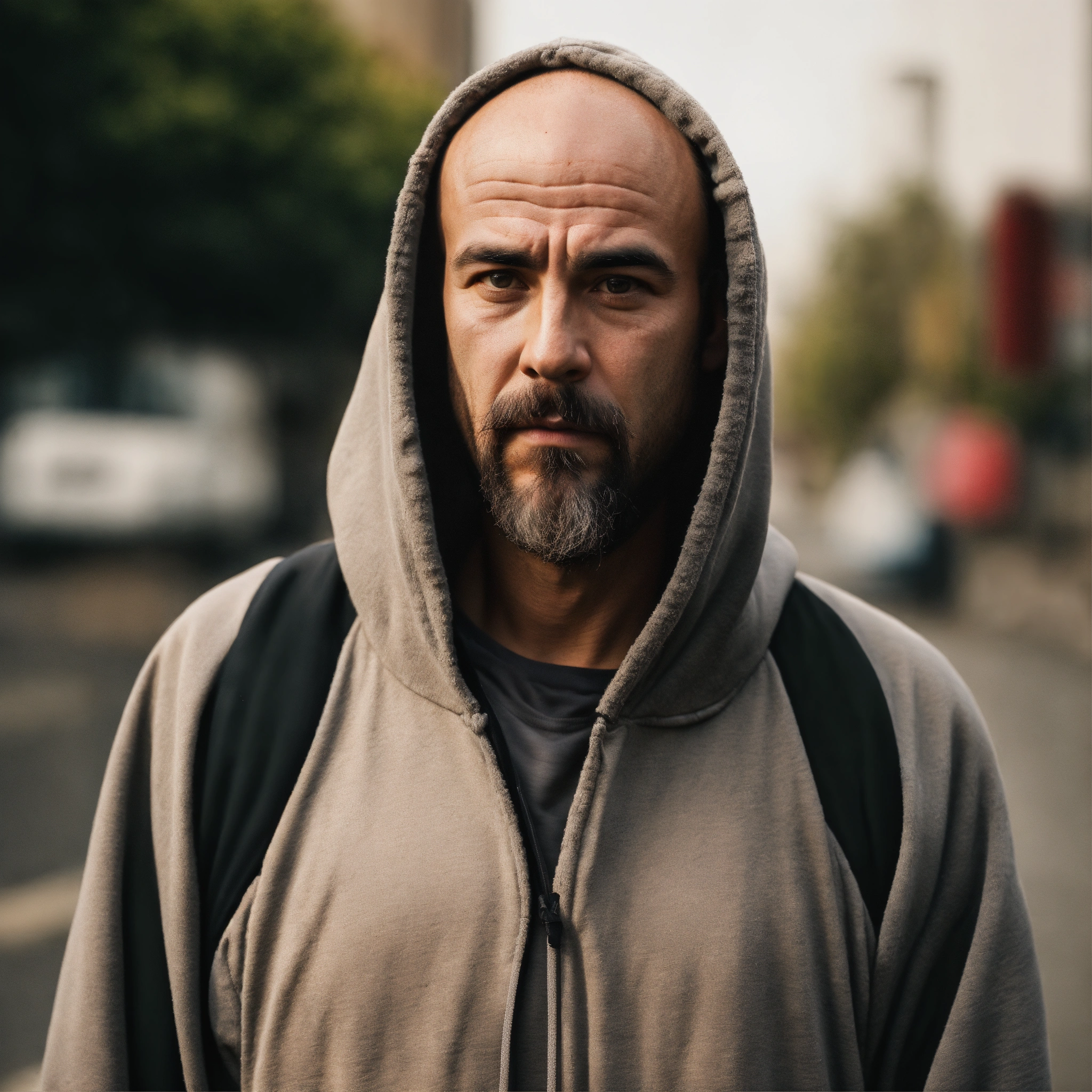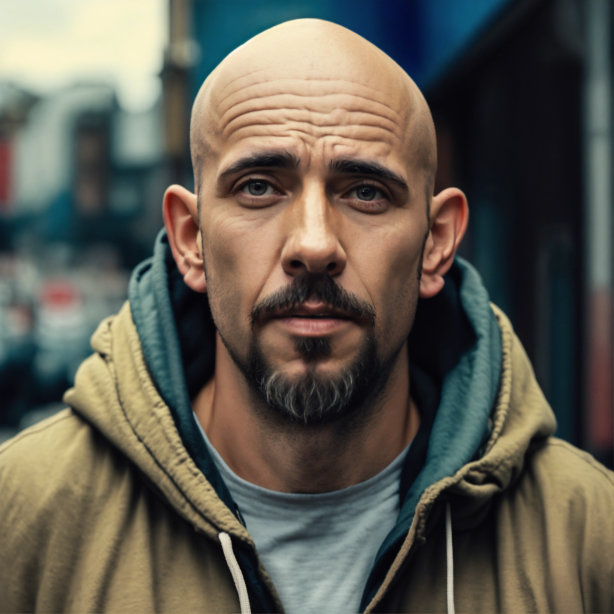 A huge bald strange looking homeless man with a little goatee and no mustache, extended protruding brow forehead, grey eyes, crooked mouth, large ears, wearing a hoodie up over his head, standing out in the street