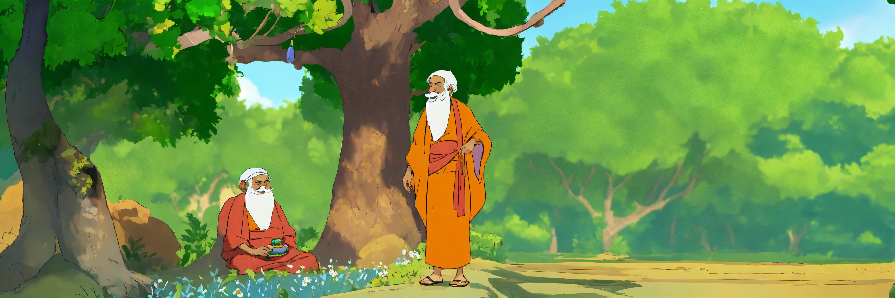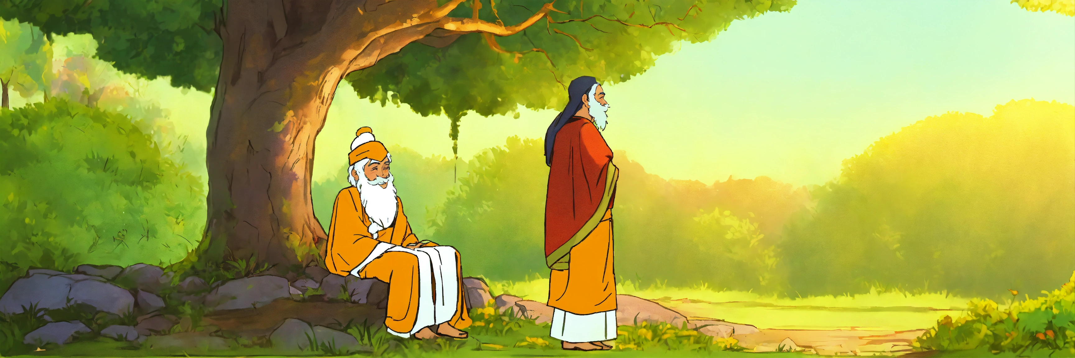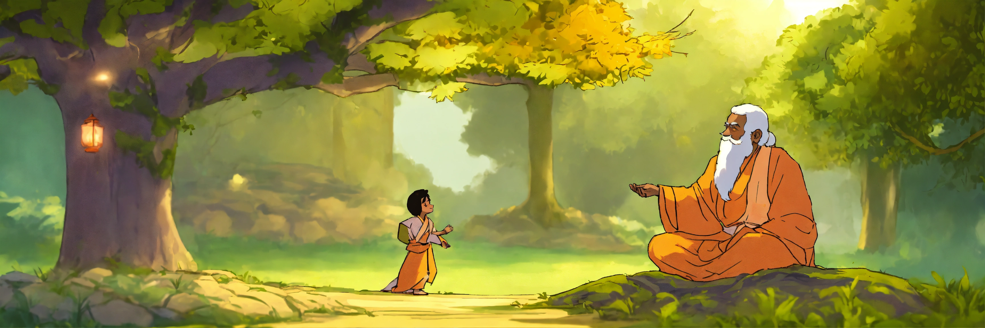 An image of ramu meeting a wise old sage dressed in saffron robes under a tree, with a bright smile on the sage's face.. in cartoon animated