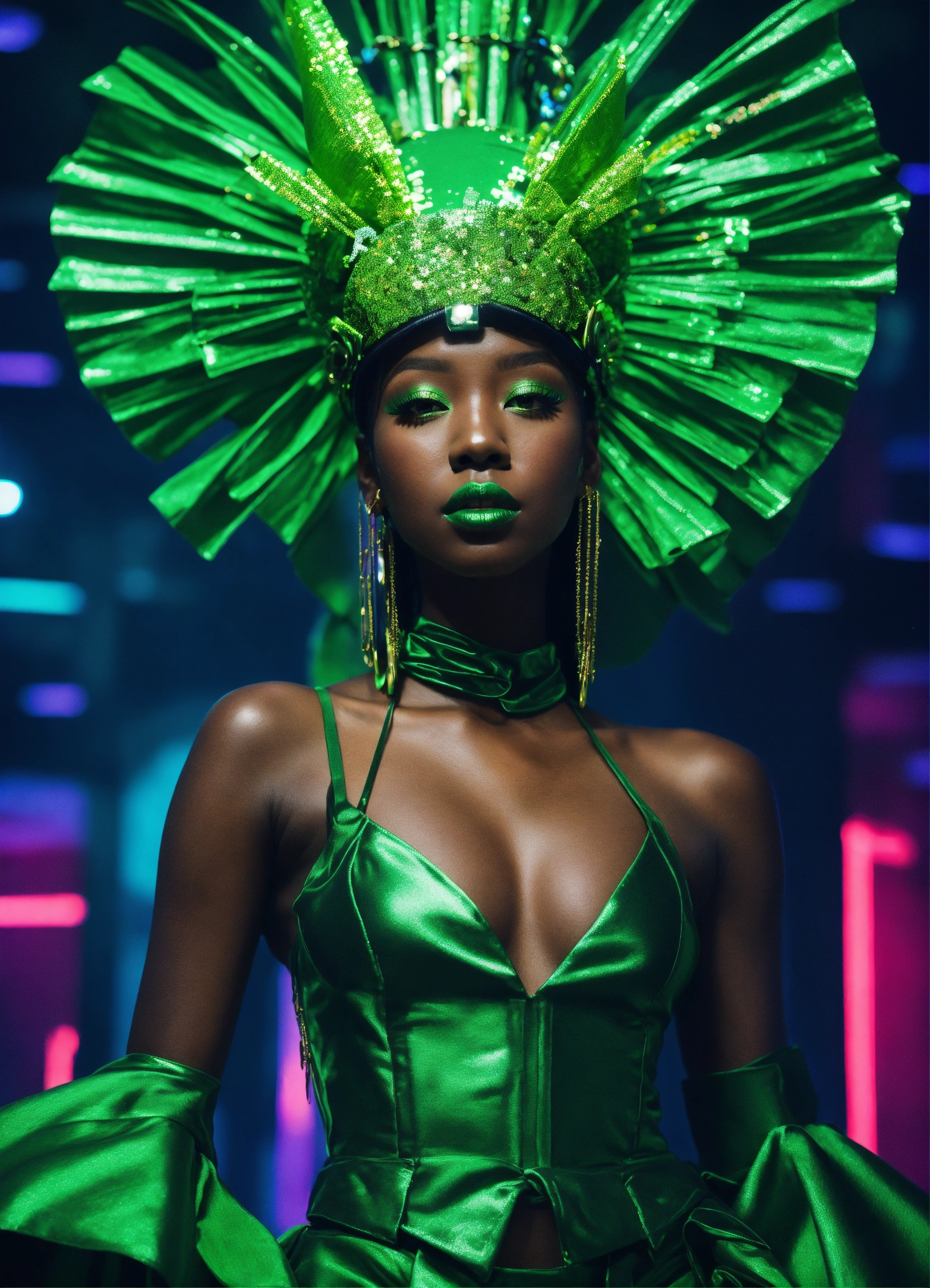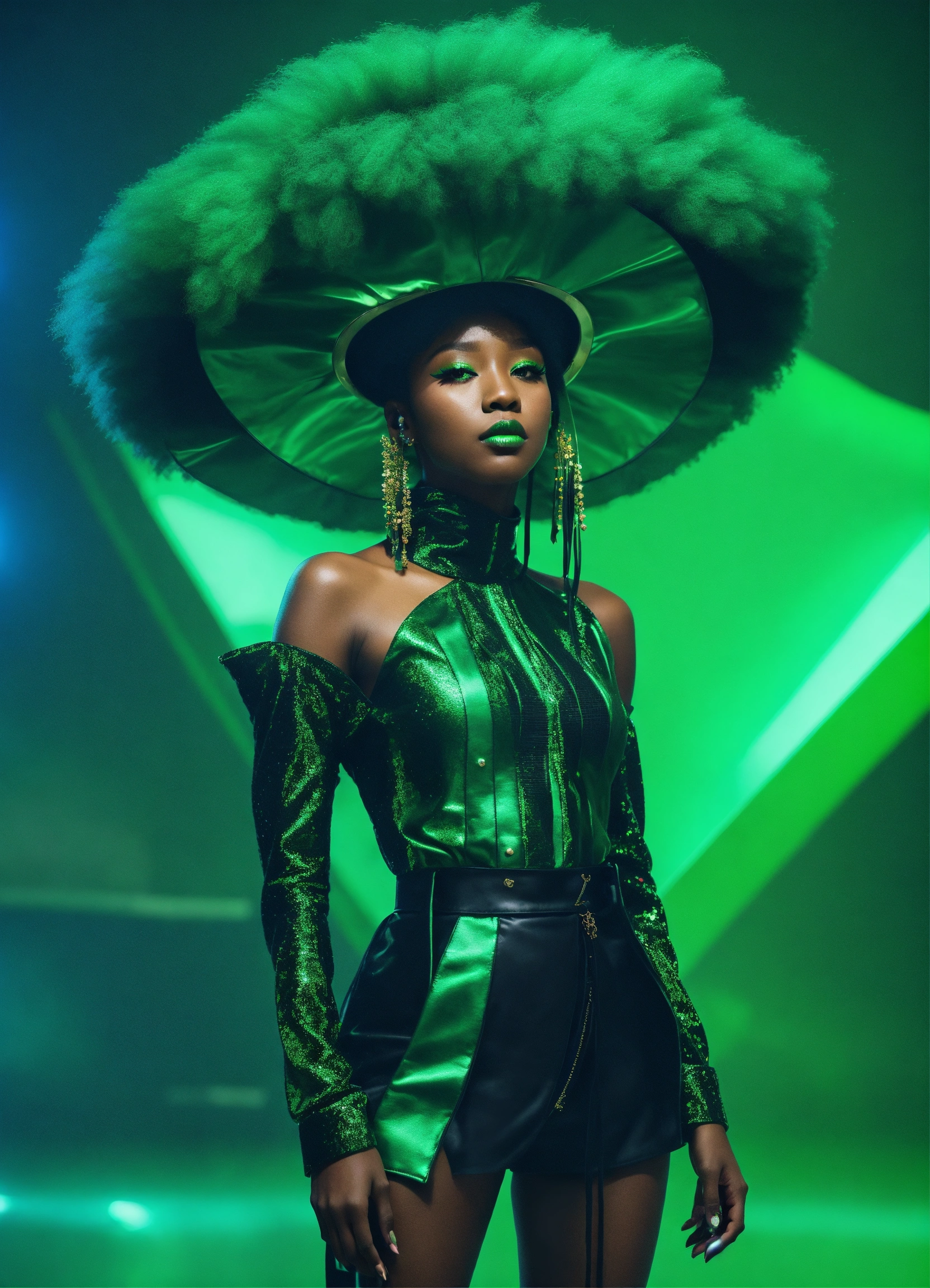 A dark skin black female kpop idol in a all green sleek futuristic outfit, with huge headpiece center piece, clean makeup with oversized green hair, with depth of field, fantastical edgy and regal themed outfit, captured in vivid colors, embodying the essence of fantasy, minimalist