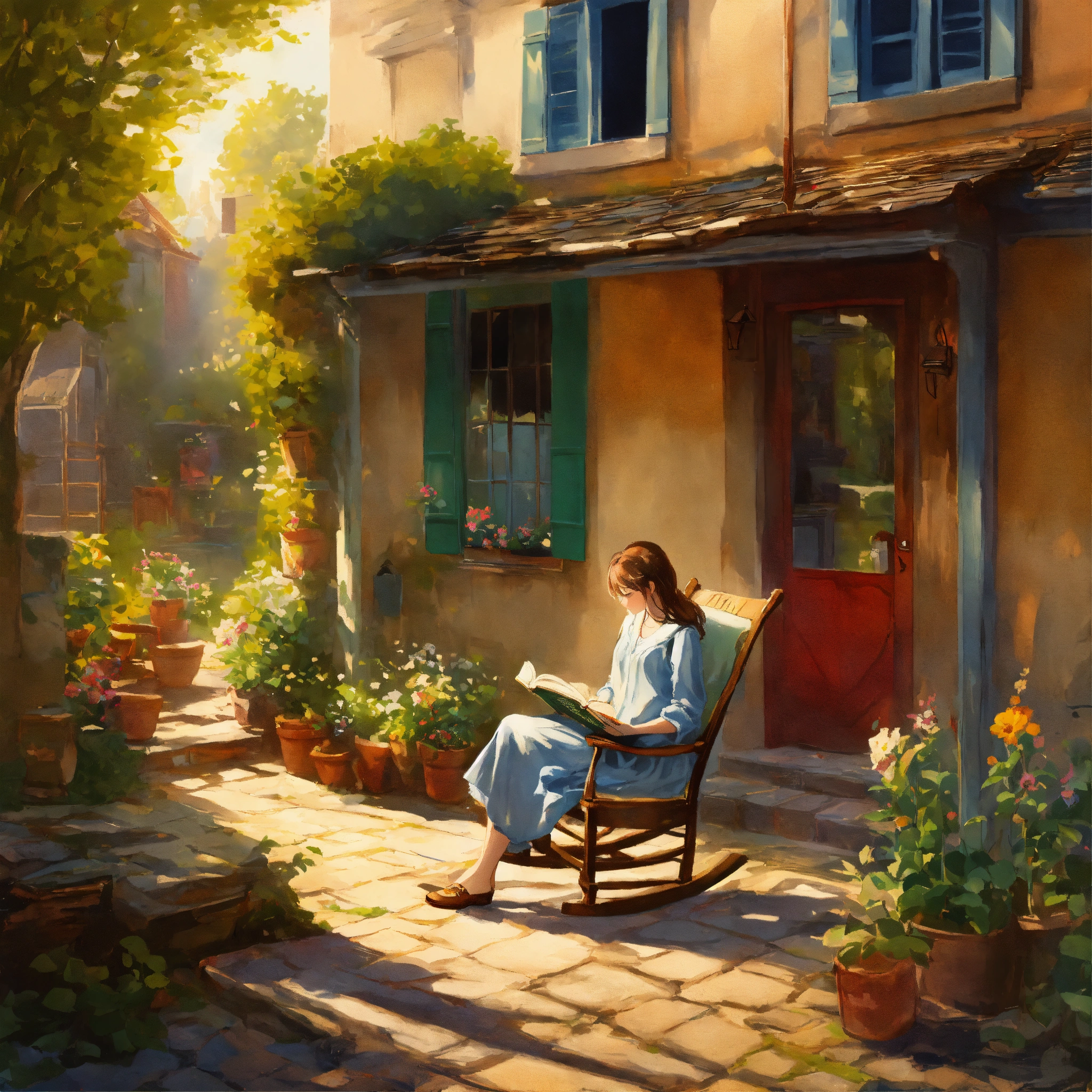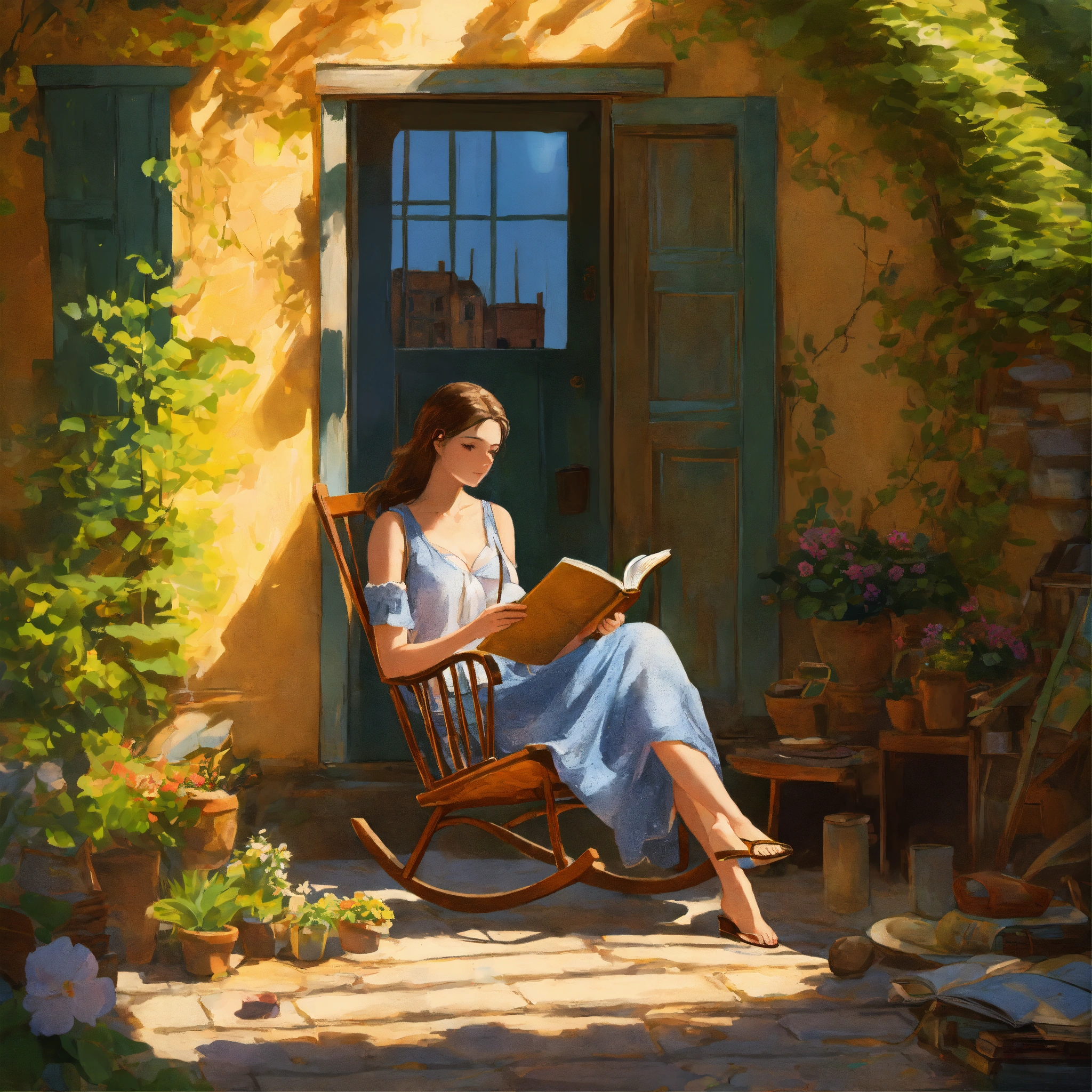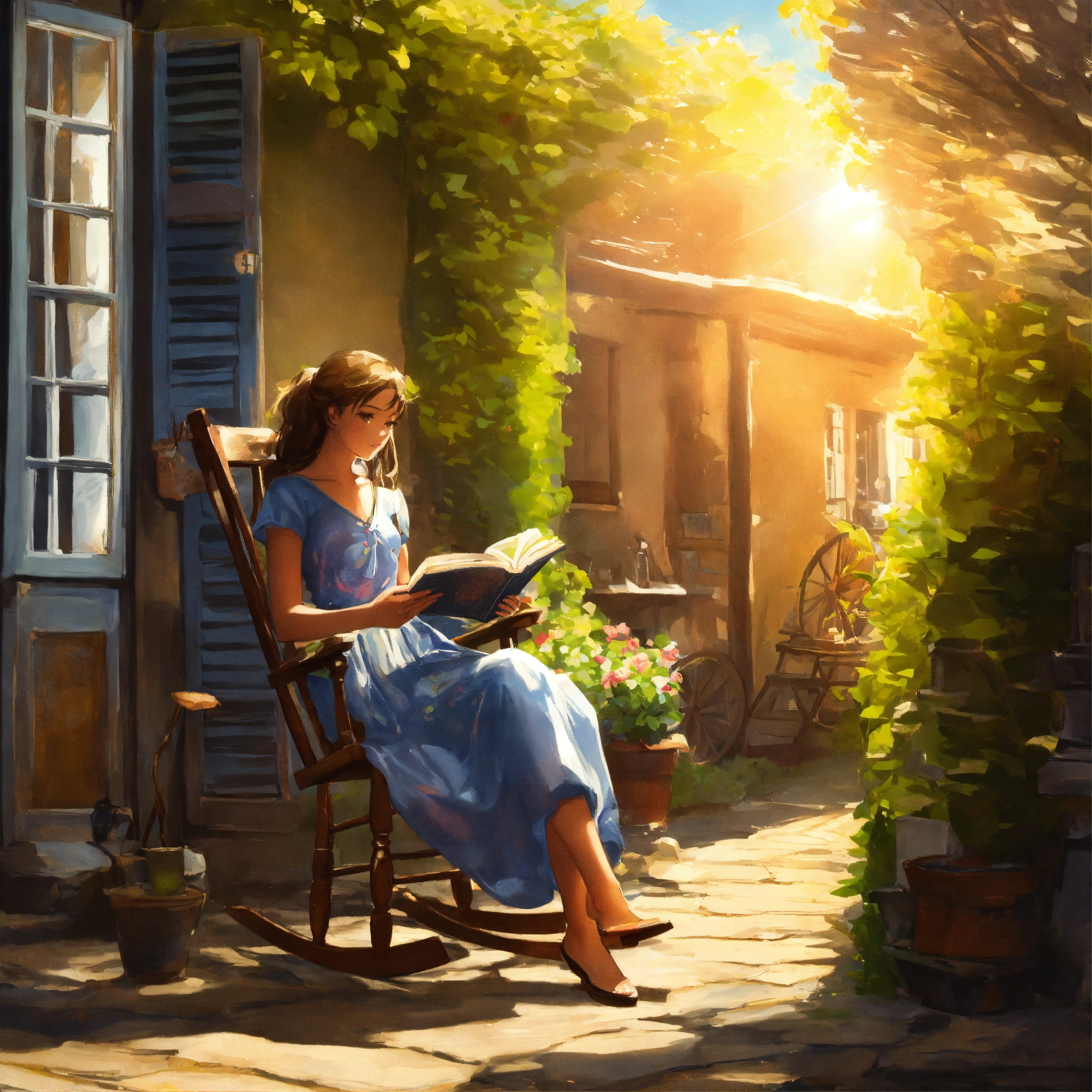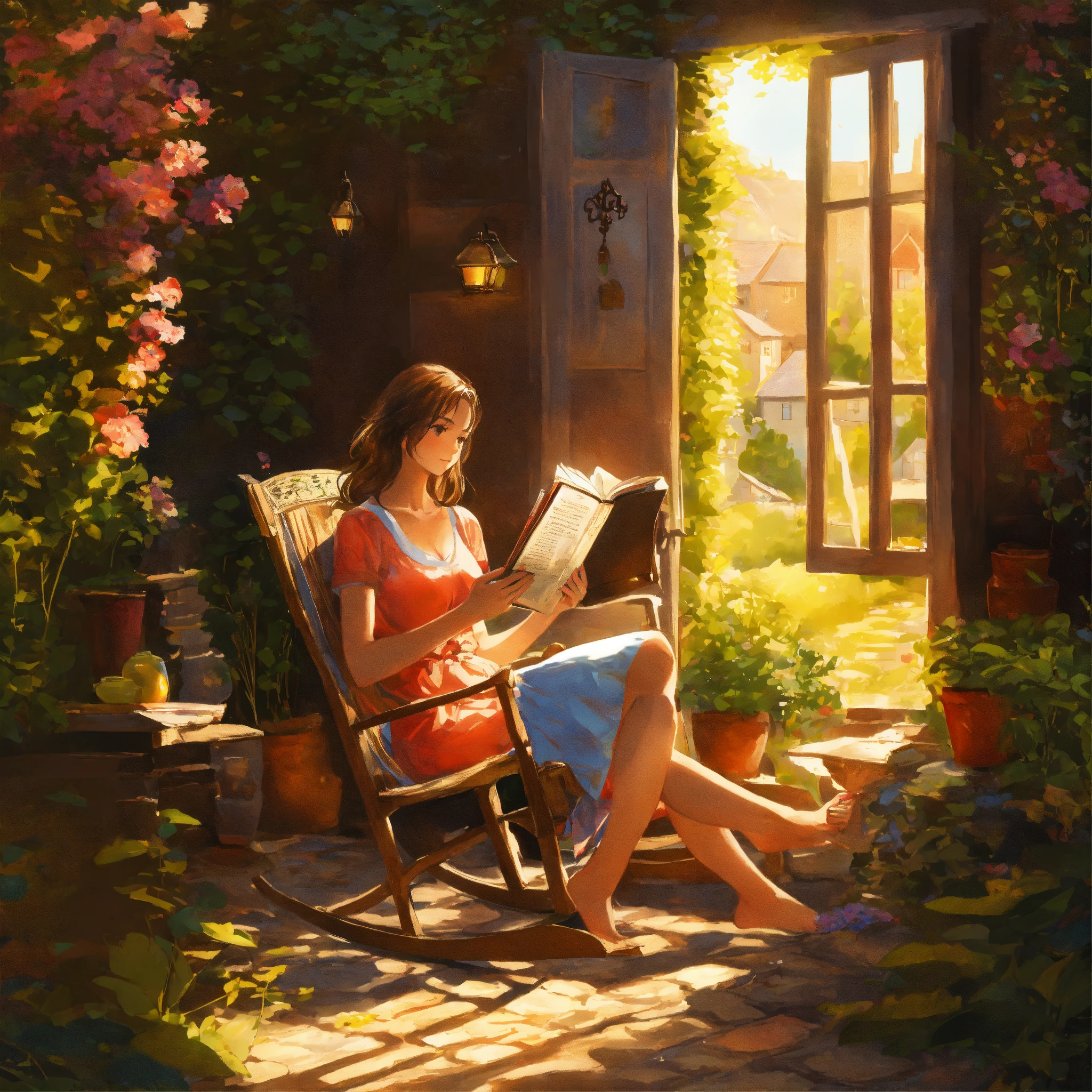 Tales from the novel of a lifetime, in the morning, it's sunny, a young woman holds an open book, sitting in a rocking chair in front of house in an old lane.