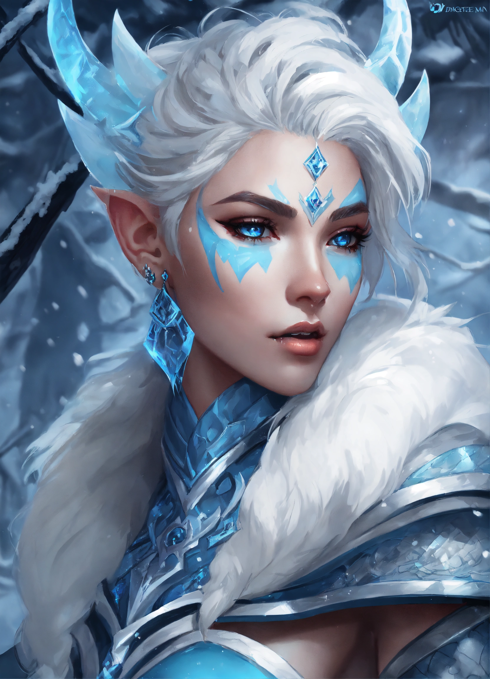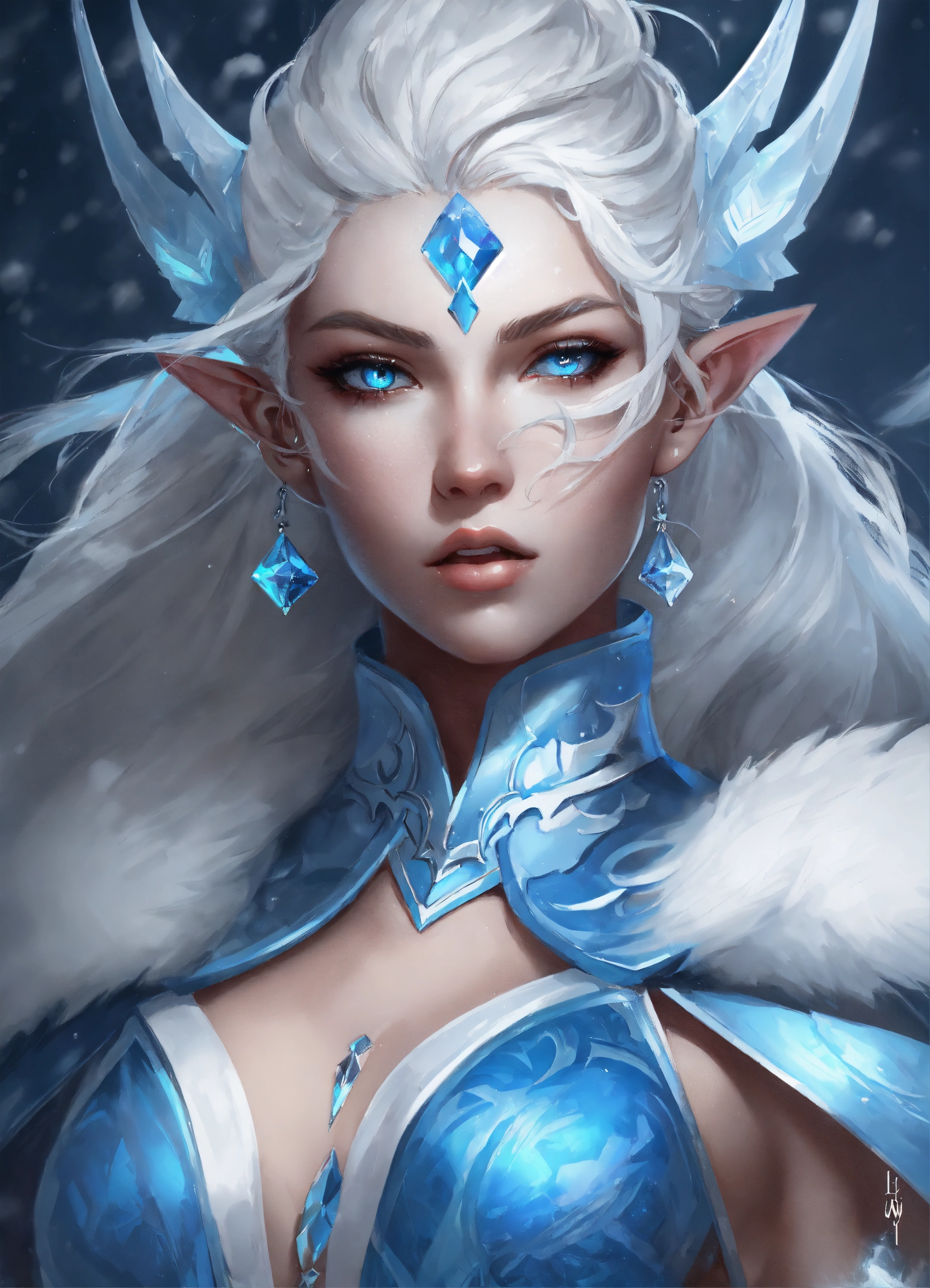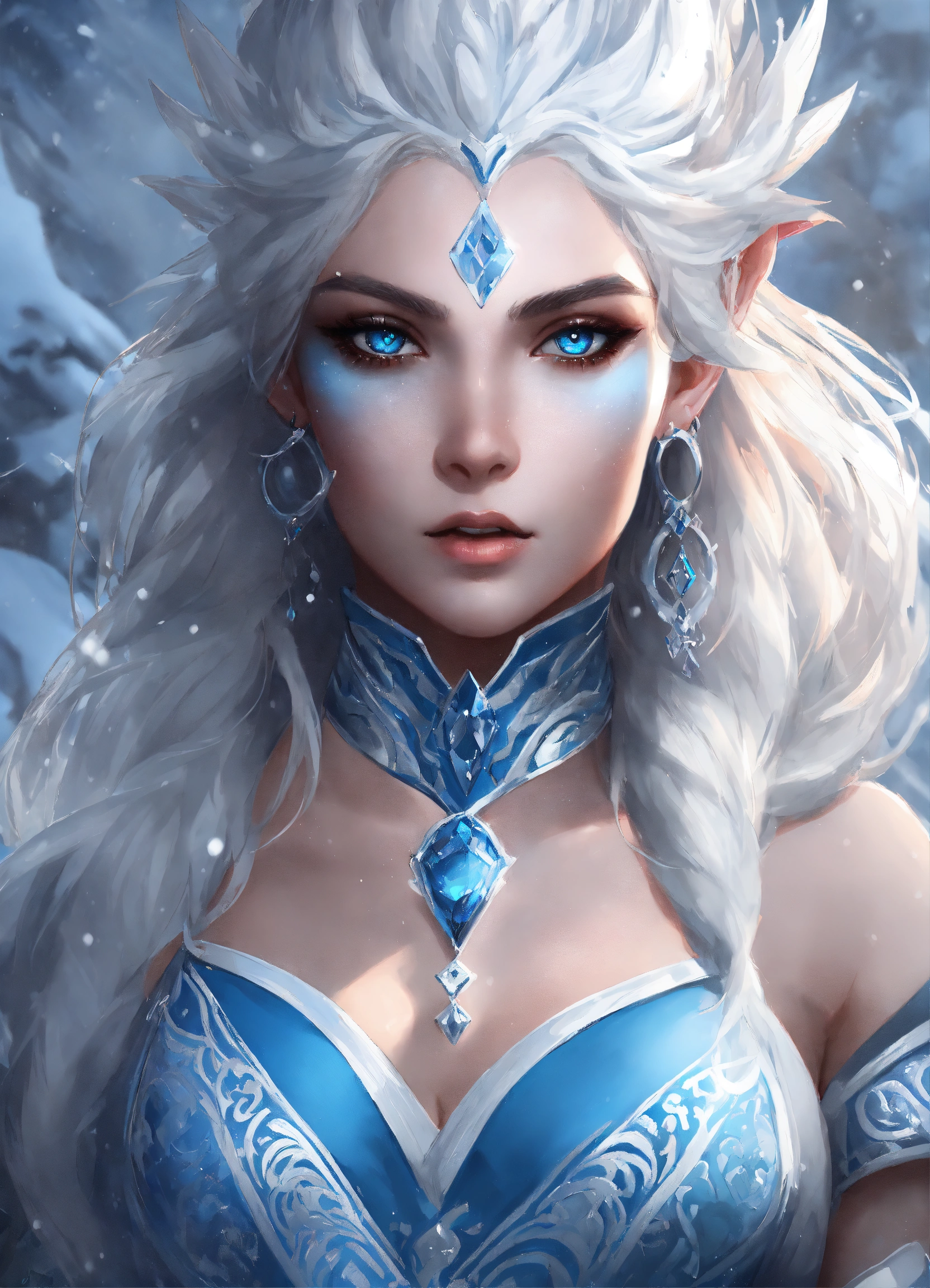 Stunning artwork of an ice genasi with blue skin from dungeons & dragons, fantasy, young woman, blue skin, fierce expression, piercing eyes, blue skin, commanding presence, winter, frost, white hair, intricate, elegant, detailed, digital painting, artstation, concept art, sharp focus, art by artgerm and wlop