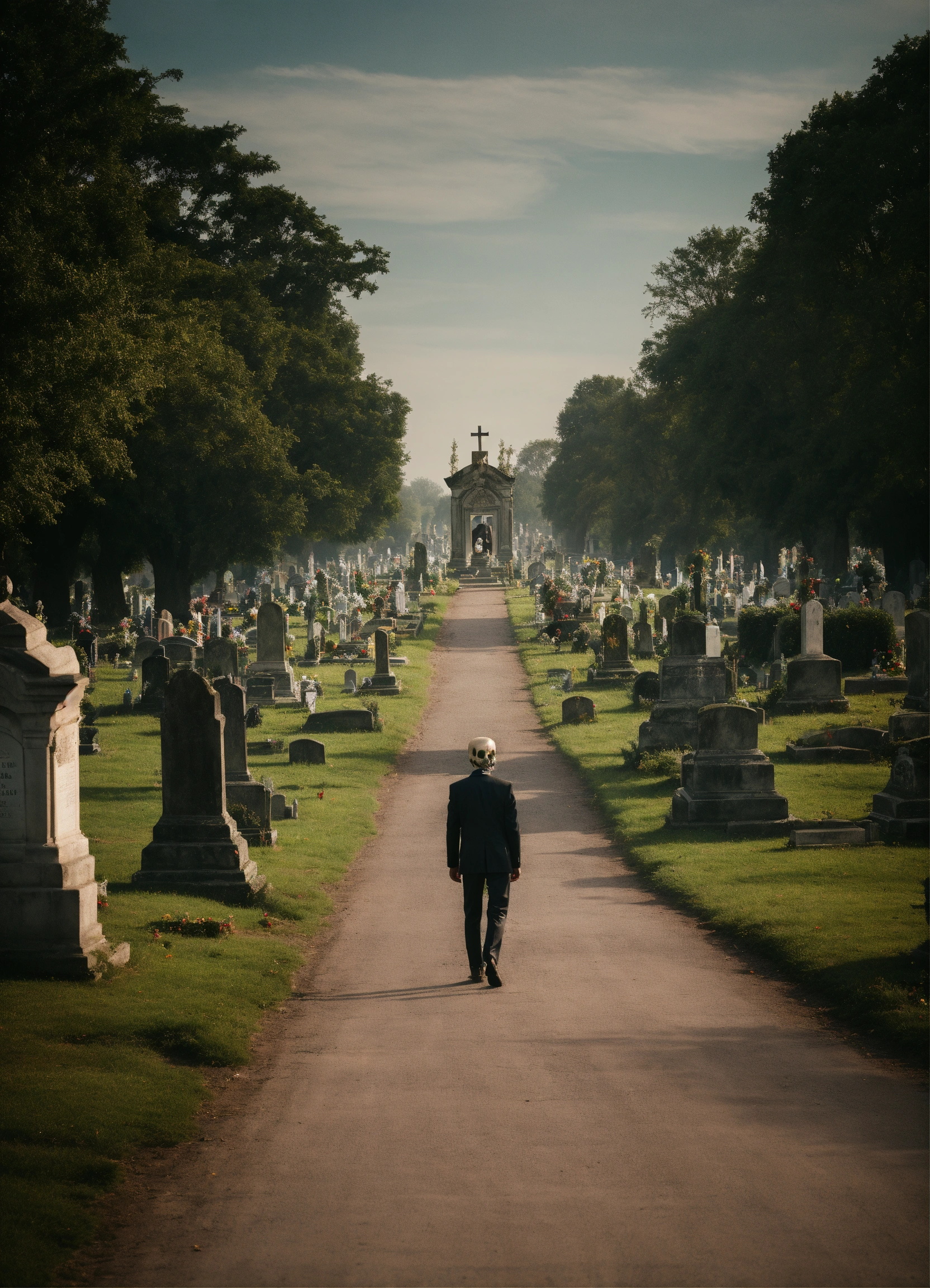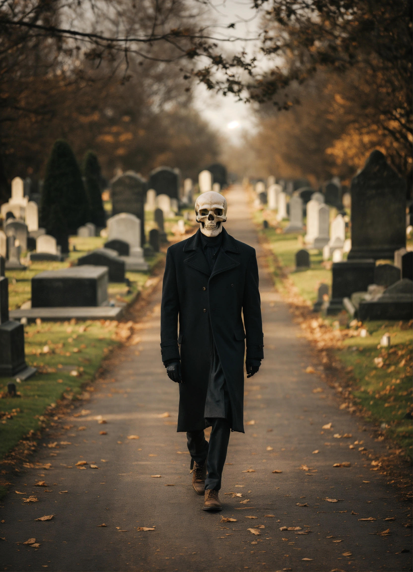A skull man walking on a road in the cemetery