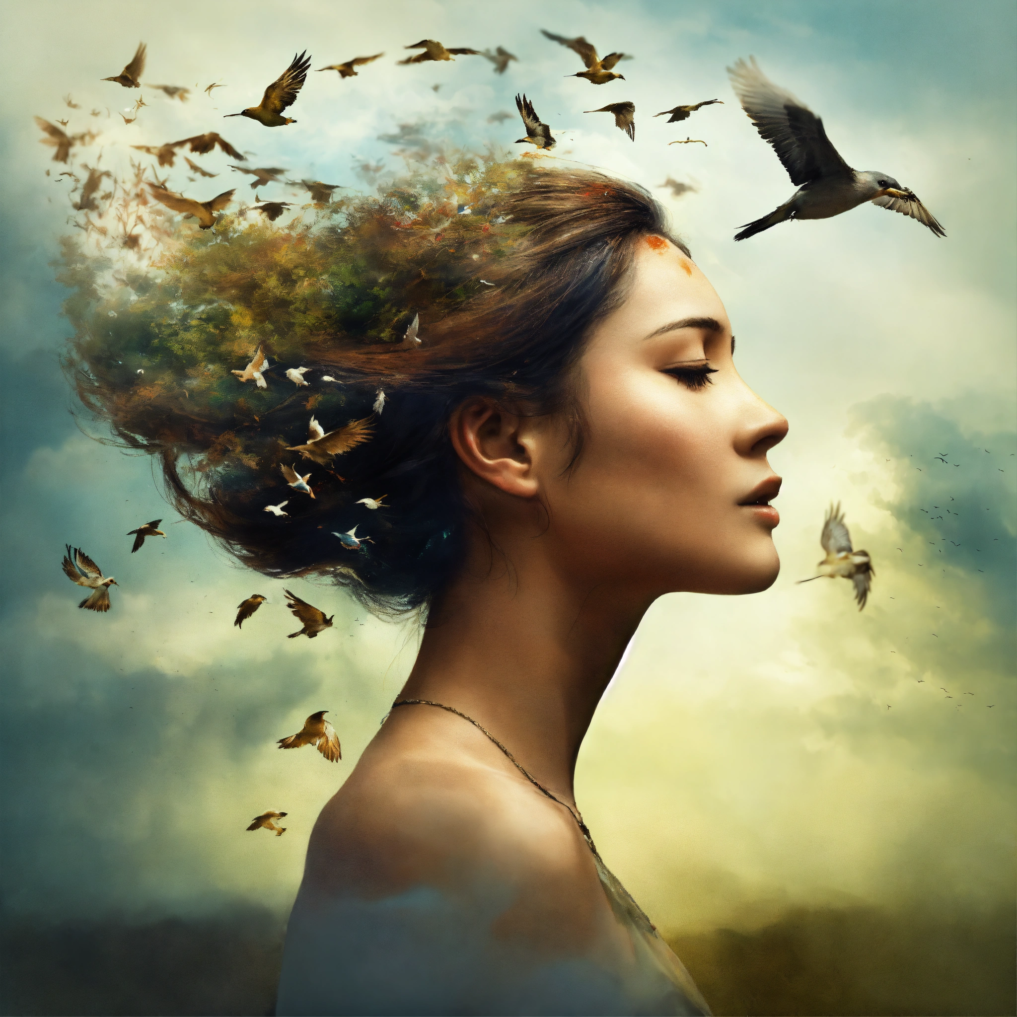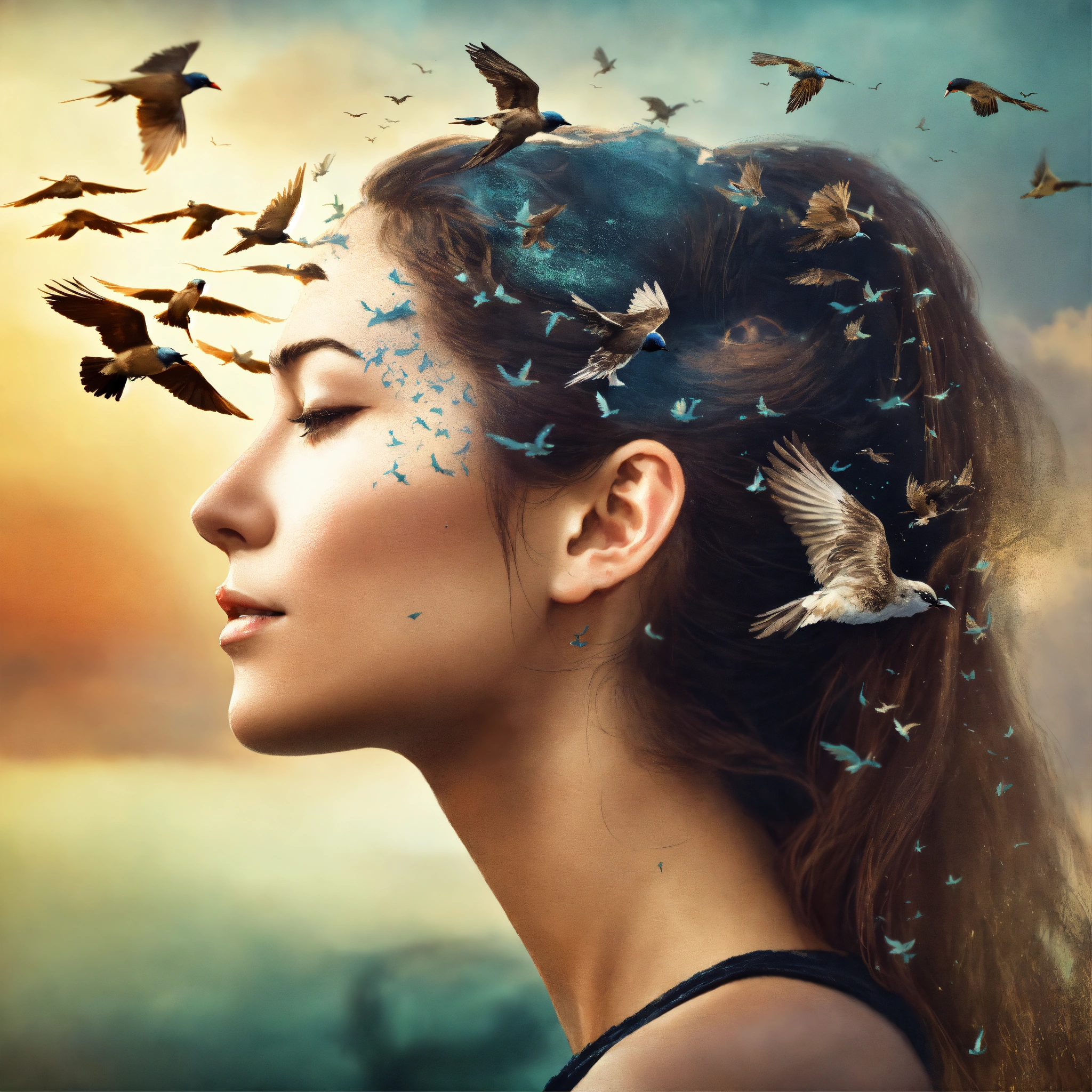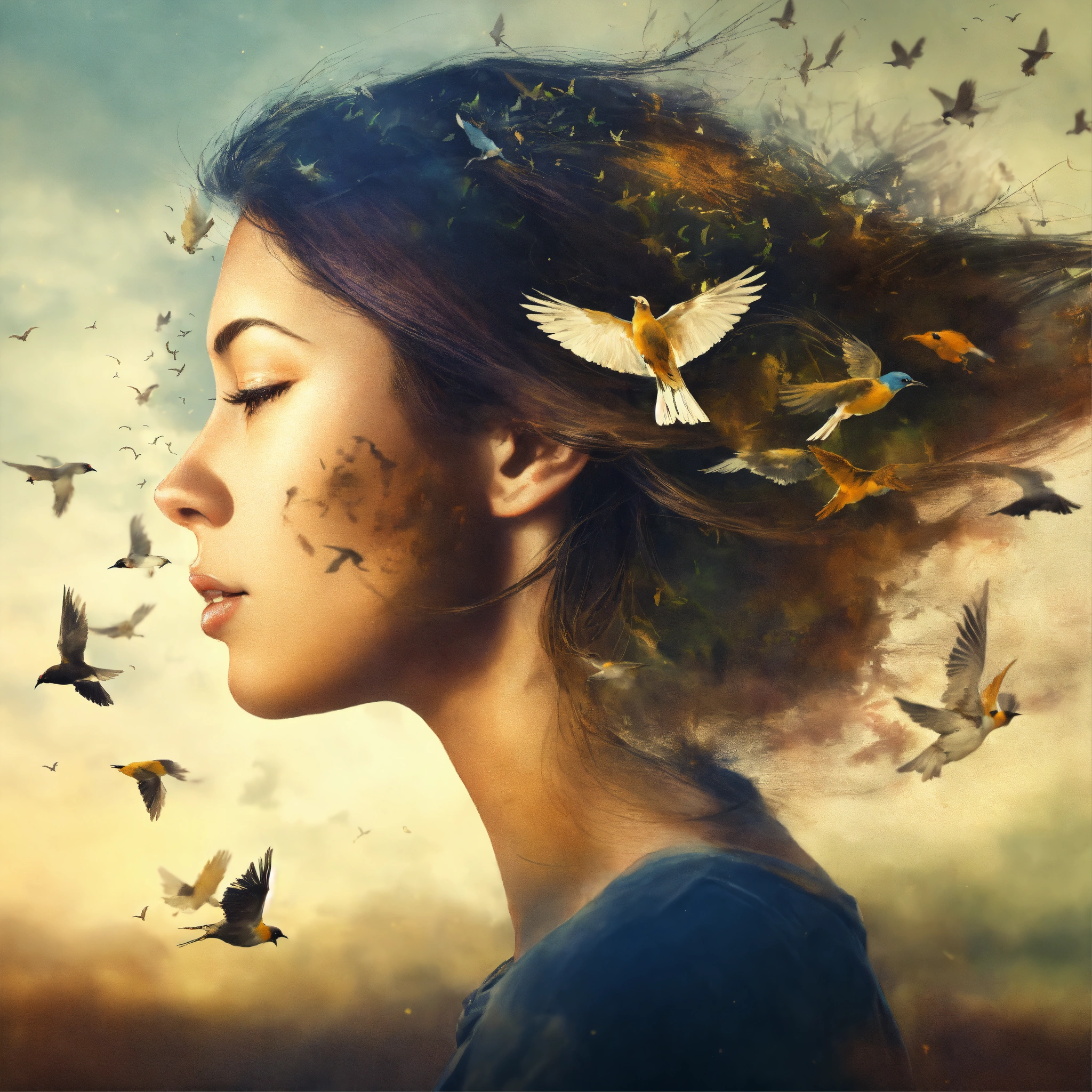 Double exposure, woman's face in profile and birds flying out of her hair as a decay effect, high detail