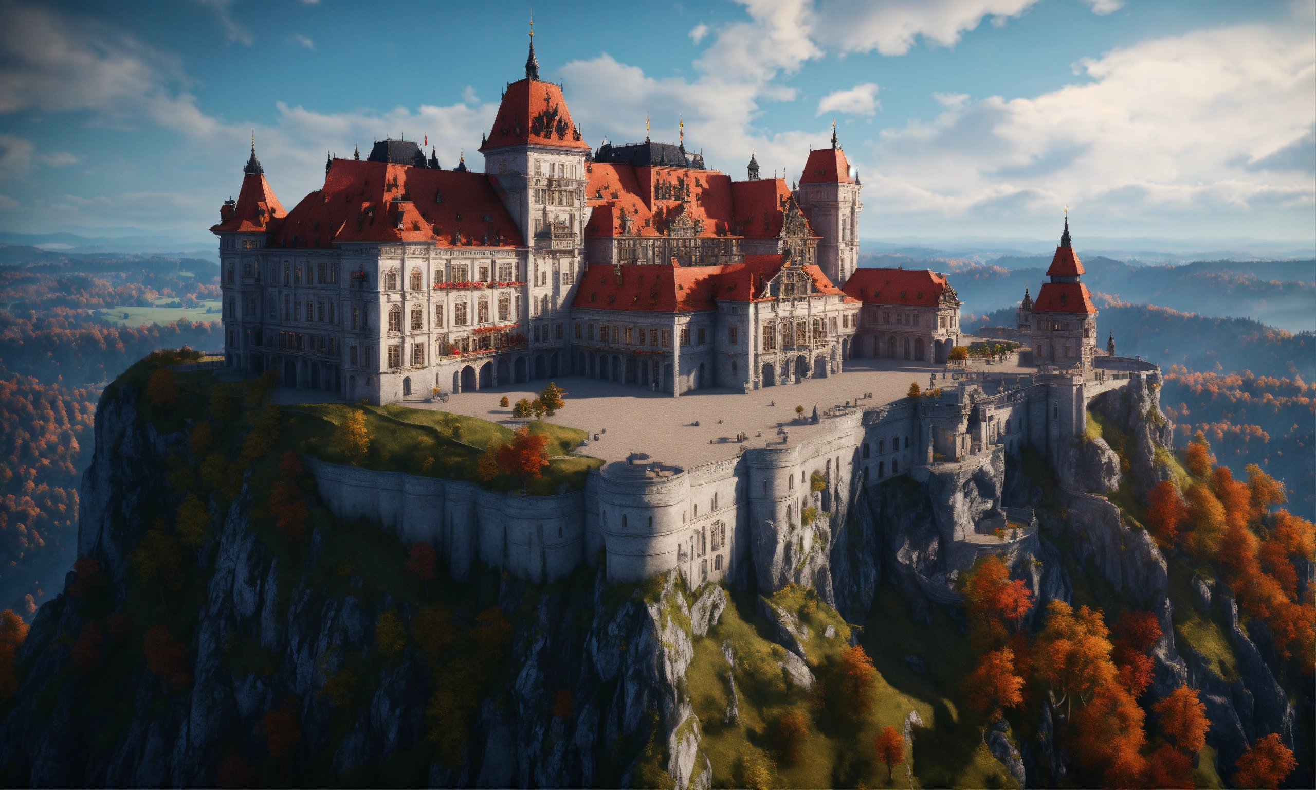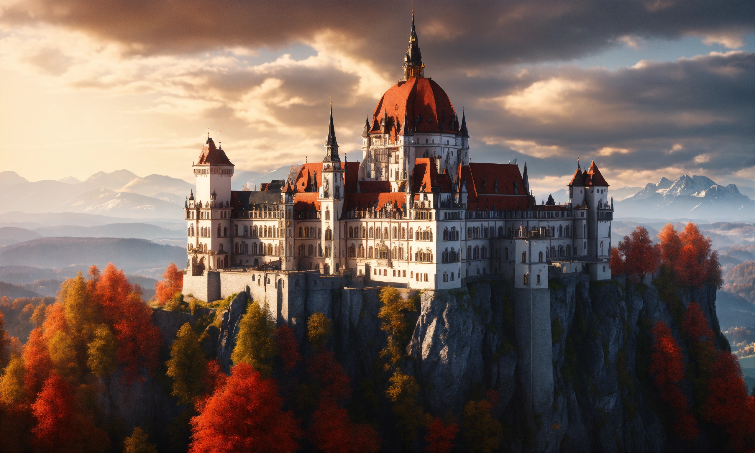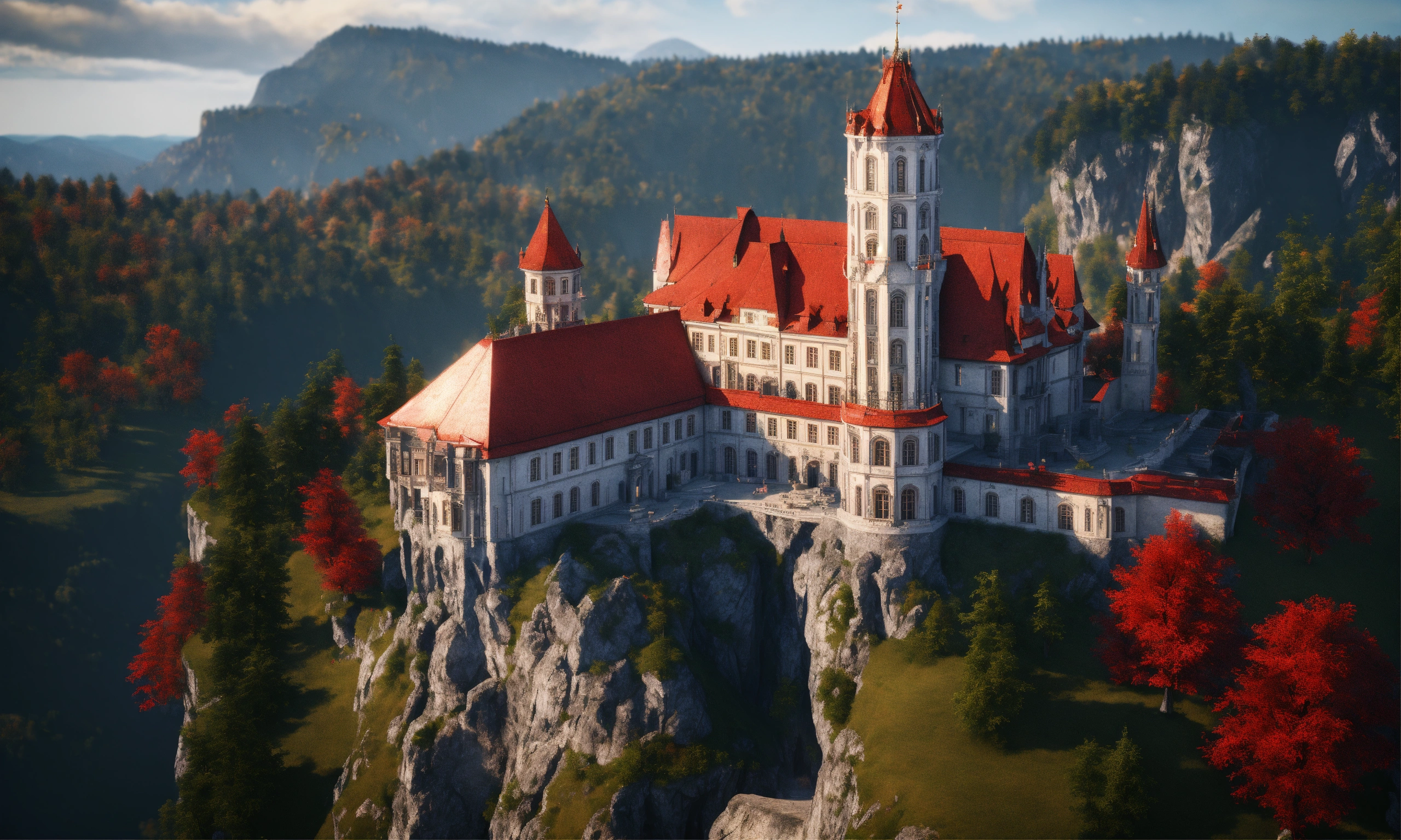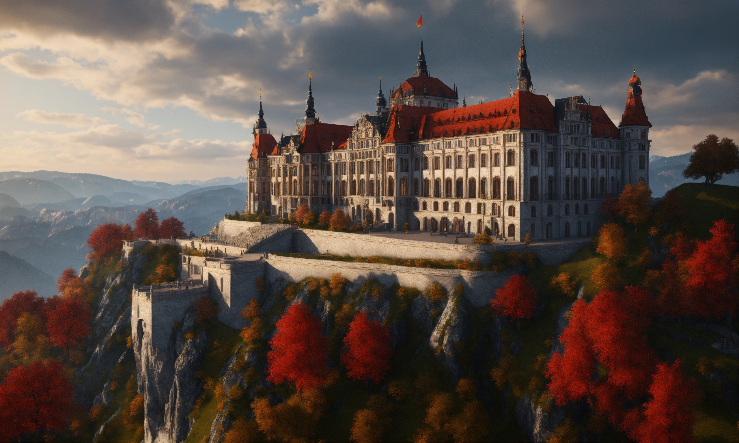 Full image of a massive silver and black royal palace with a red roof on a cliff overlooking bavaria, german architecture, highly detailed, unreal engine, 8d