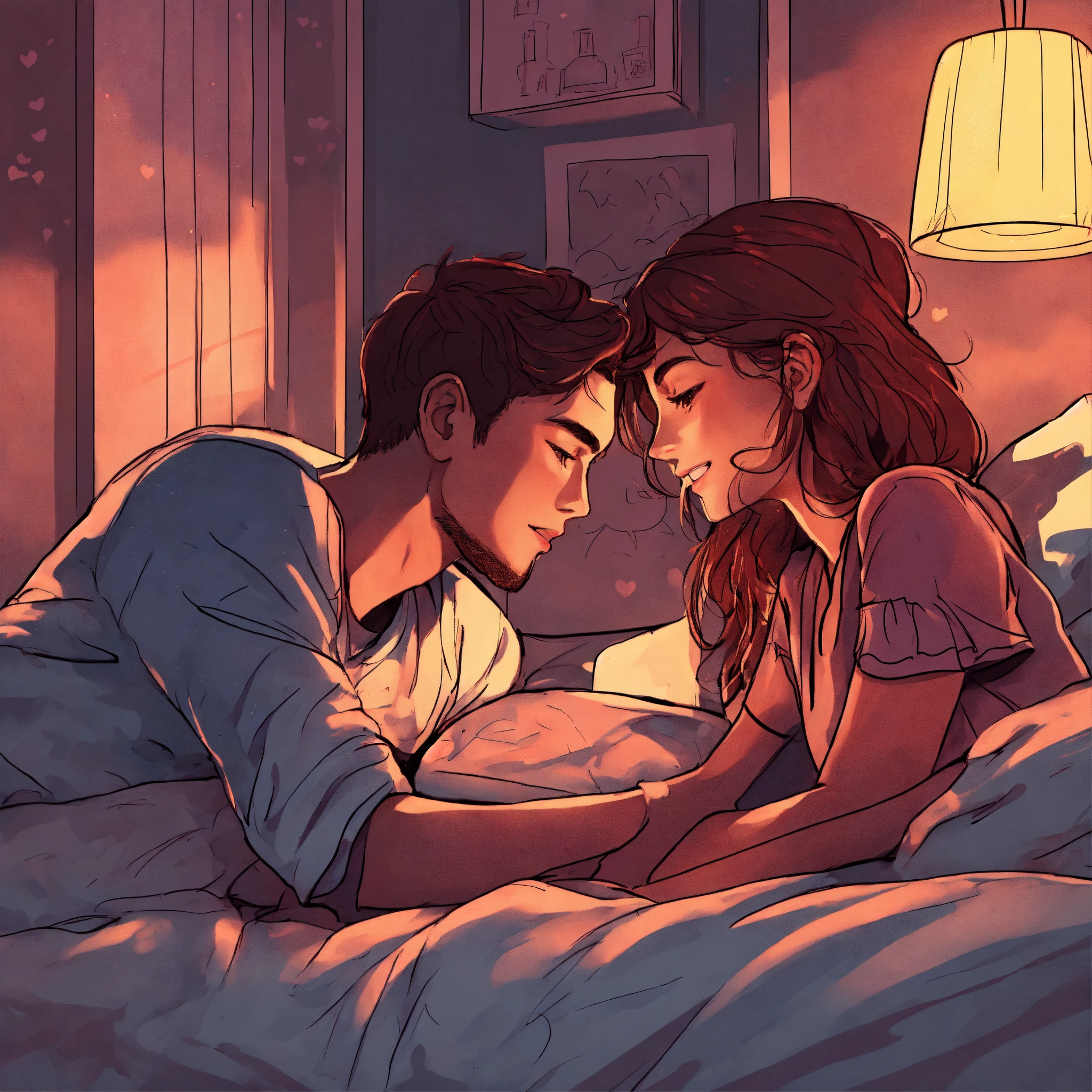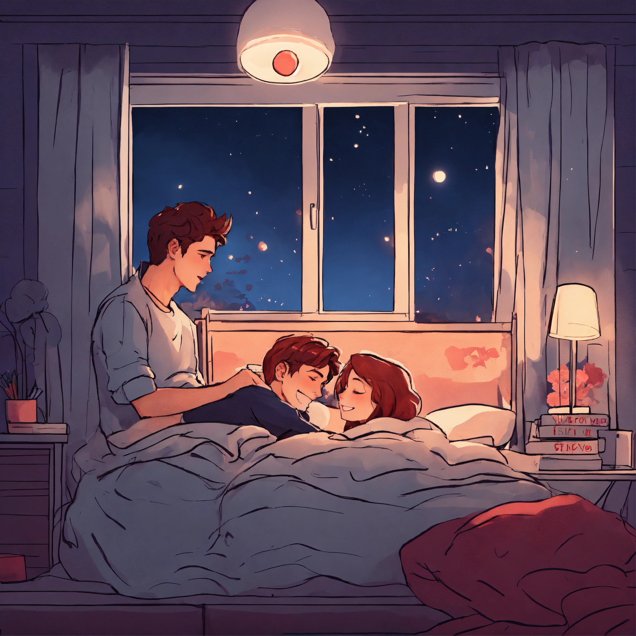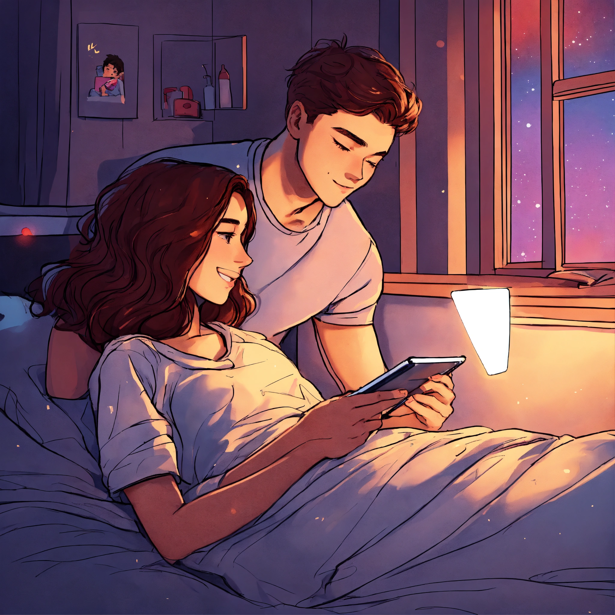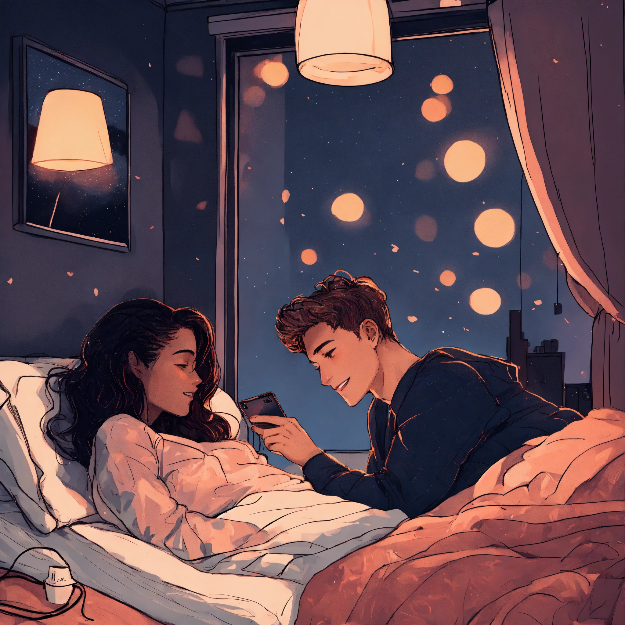 Drawing of a young man chatting in instagram with the girl he likes in love lying in his bed in the dark