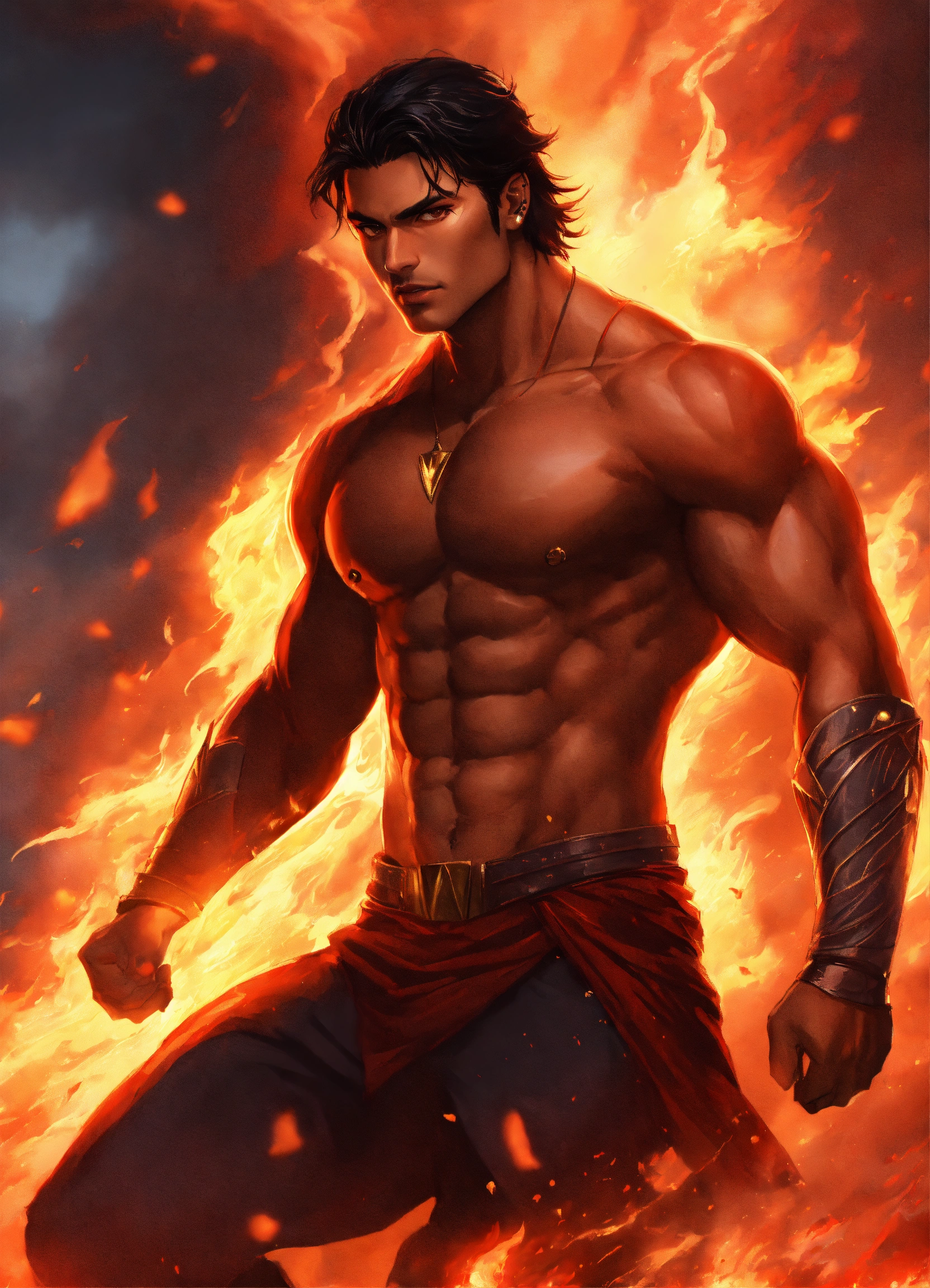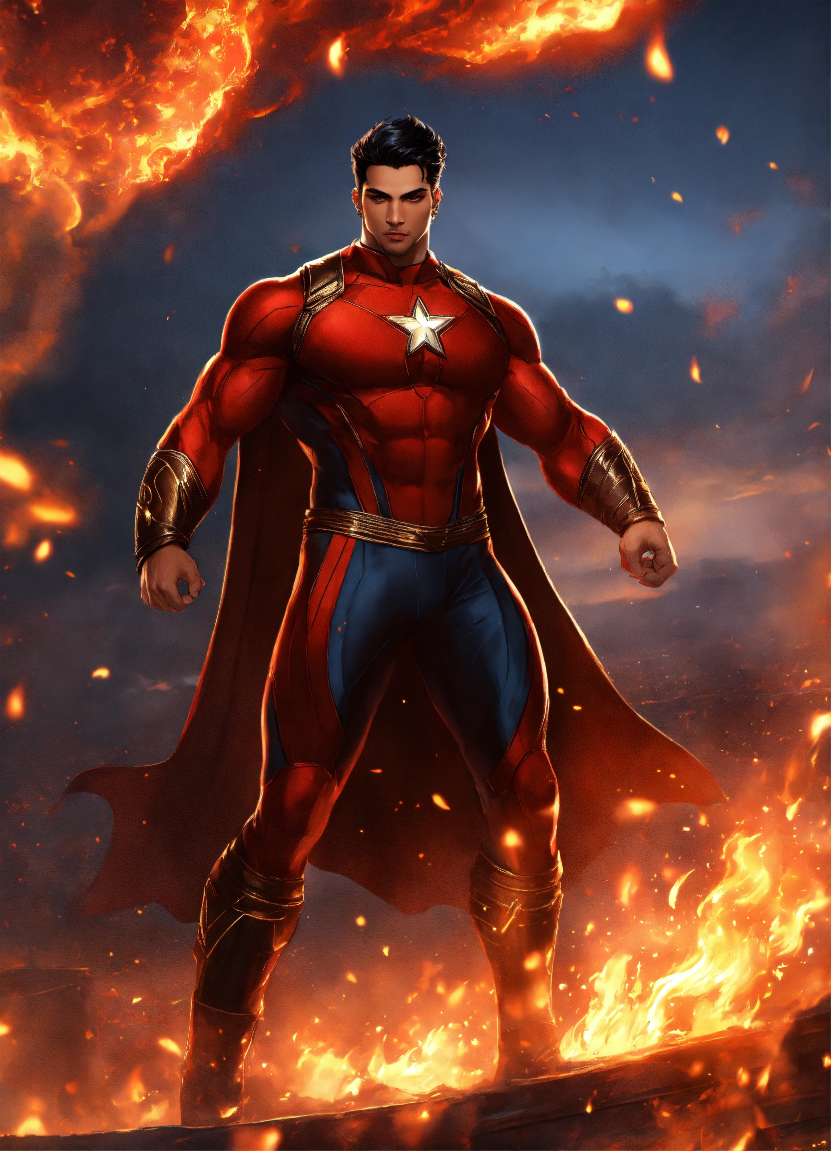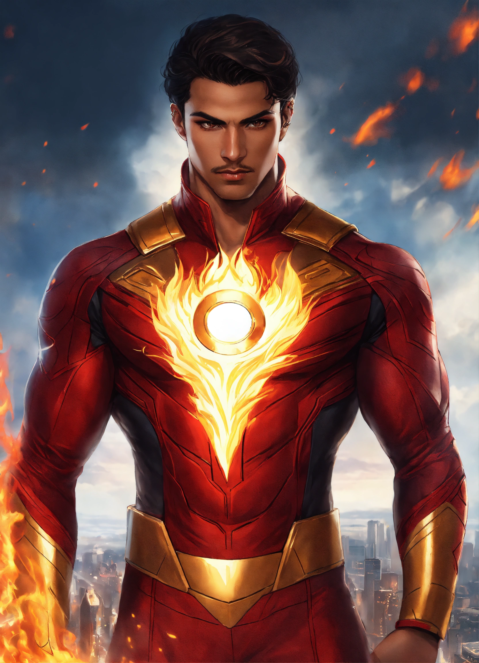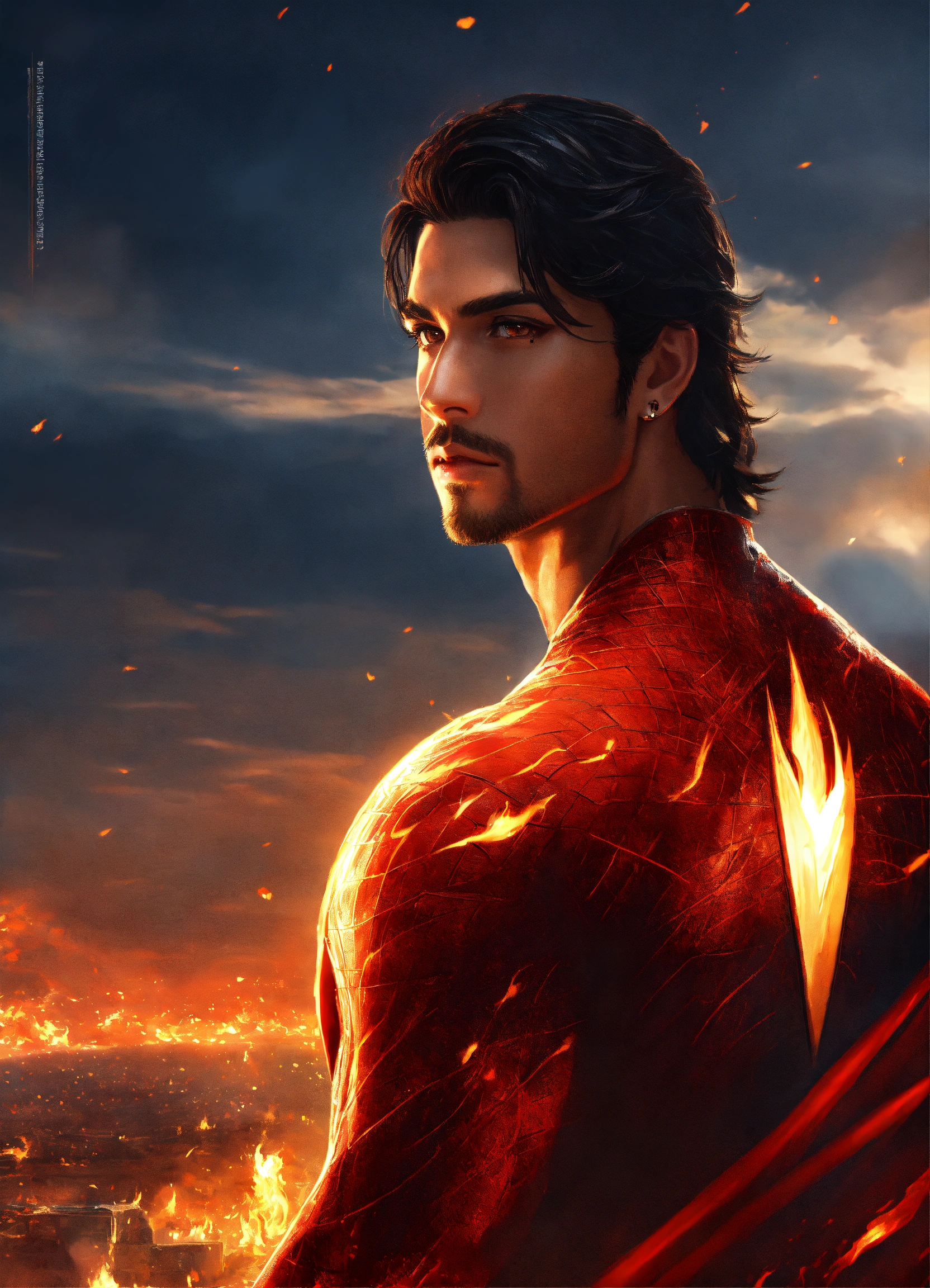 Piercing brown eyes, marvel, highly detailed, red sleek costume, full body, smooth, no cape, muscular caucasian mixed with indian male, black hair, in the sky, flames surrounding, realistic